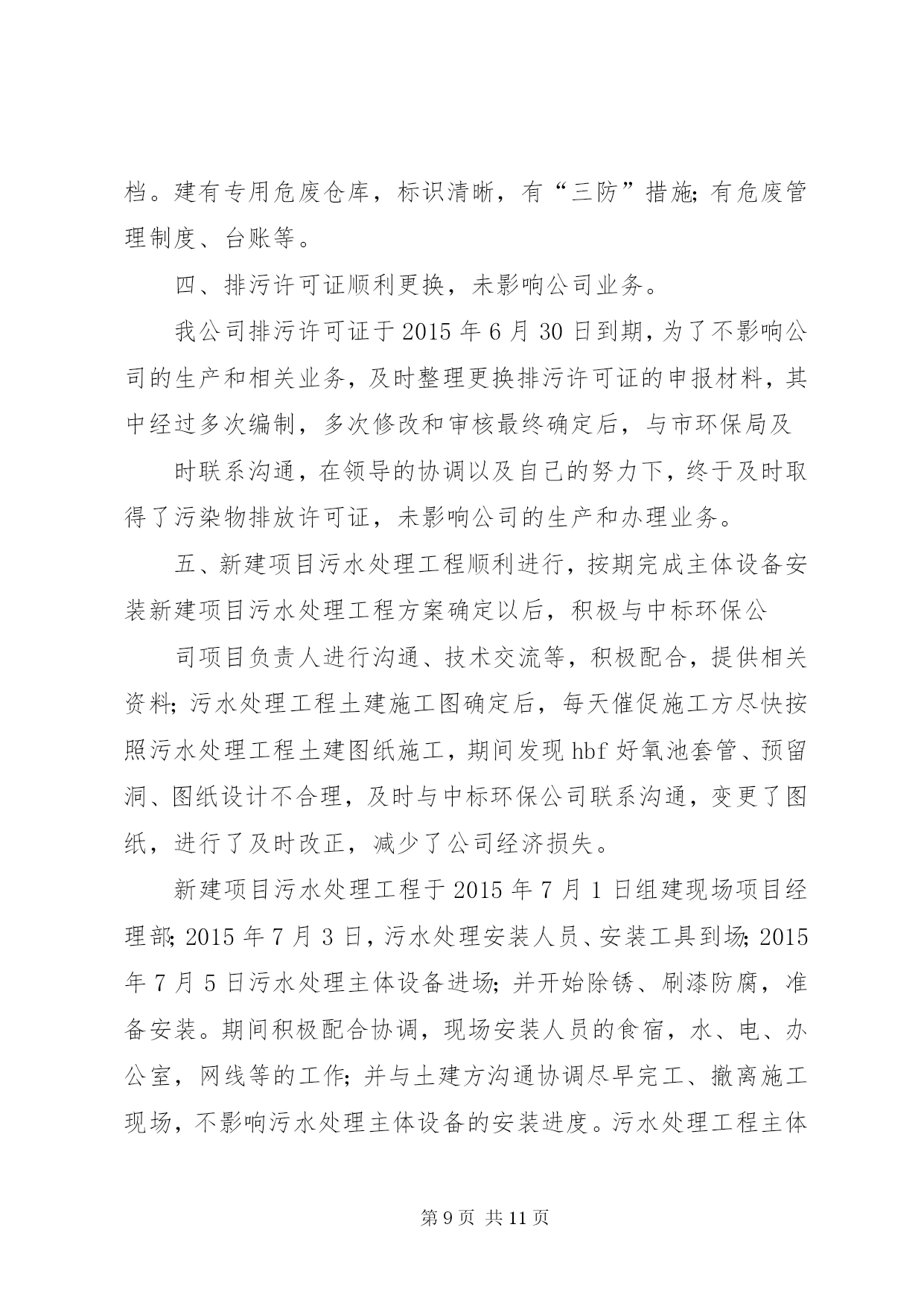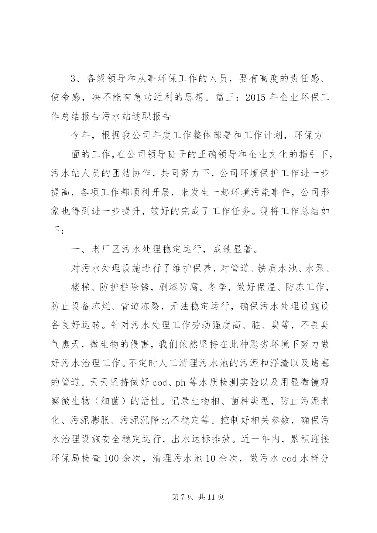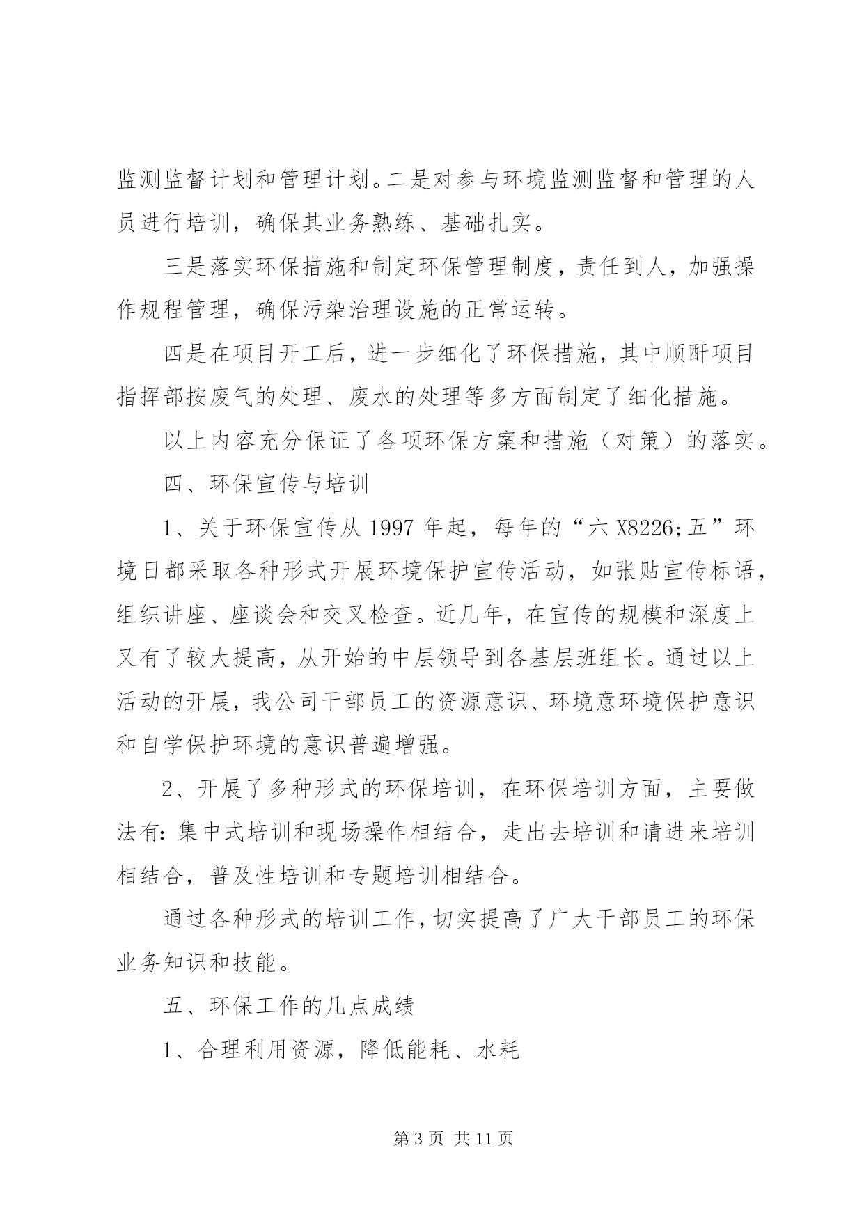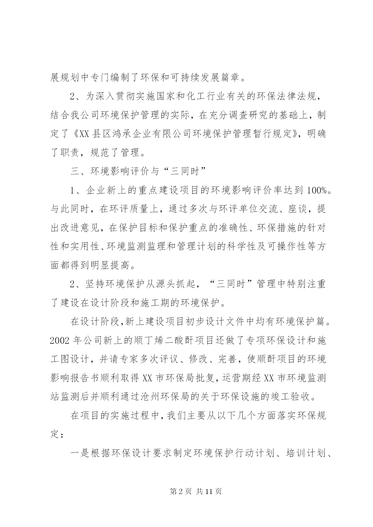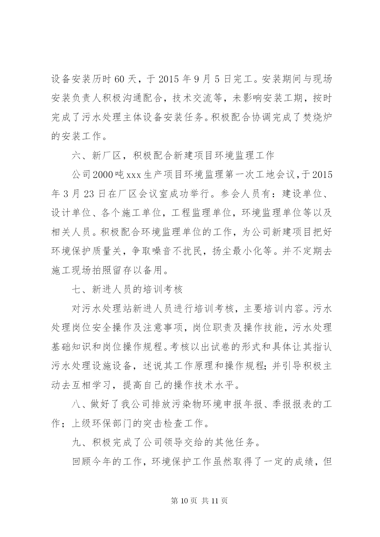 第PAGE\*Arabic\*MERGEFORMAT11页共NUMPAGES\*MERGEFORMAT11页企业年度环保工作总结篇一:公司环境保护工作总结公司环境保护工作总结严格遵守国家法律法规切实做好环境保护工作我们公司于1999年10月成立,其前身为XX县区司家河煤矿,主要生产原煤,生产规模45万吨/年,我们在狠抓经济建设的同时,更时刻没忘狠抓环保工作,下面把我们的环保工作做一总结汇报如下:一、组织机构我公司自1999年以来,就十分重视环保工作,当时虽没有成立正式的环保管理组织机构,但也明确了由主抓后勤工作的副厂长分管环保工作。随着企业的发展,于2011年1月正式司家河煤业有限公司环保领导小组,由公司办公室主任任组长,成员由各科室(队)等部门负责人以及技术员组成,并确定了相关职责。公司领导班子每季度组织召开一次环保工作调度会,听取环保工作汇报研究环保工作,并做出相应部署,使我们的环保工作能够有序进行。二、环保规划与规章制度1、在对公司的污染源进行调查明确的基础上,2011年由公司环保领导小组组织编制了司家河煤业有限公司环保2010年环保规划。各部门和有的制定了实施公司环保规划的行动计划,有的制定了本部门、本车间的中长期环保规划,有的在部门工作发展规划中专门编制了环保和可持续发展篇章。2、为深入贯彻实施国家和化工行业有关的环保法律法规,结合我公司环境保护管理的实际,在充分调查研究的基础上,制定了《XX县区鸿承企业有限公司环境保护管理暂行规定》,明确了职责,规范了管理。三、环境影响评价与“三同时”1、企业新上的重点建设项目的环境影响评价率达到100%。与此同时,在环评质量上,通过多次与环评单位交流、座谈,提出改进意见,在保护目标和保护重点的准确性、环保措施的针对性和实用性、环境监测监理和管理计划的科学性及可操作性等方面都得到明显提高。2、坚持环境保护从源头抓起,“三同时”管理中特别注重了建设在设计阶段和施工期的环境保护。在设计阶段,新上建设项目初步设计文件中均有环境保护篇。2002年公司新上的顺丁烯二酸酐项目还做了专项环保设计和施工图设计,并请专家多次评议、修改、完善,使顺酐项目的环境影响报告书顺利取得XX市环保局批复,运营期经XX市环境监测站监测后并顺利通过沧州环保局的关于环保设施的竣工验收。在项目的实施过程中,我们主要从以下几个方面落实环保规定:一是根据环保设计要求制定环境保护行动计划、培训计划、监测监督计划和管理计划。二是对参与环境监测监督和管理的人员进行培训,确保其业务熟练、基础扎实。三是落实环保措施和制定环保管理制度,责任到人,加强操作规程管理,确保污染治理设施的正常运转。四是在项目开工后,进一步细化了环保措施,其中顺酐项目指挥部按废气的处理、废水的处理等多方面制定了细化措施。以上内容充分保证了各项环保方案和措施(对策)的落实。四、环保宣传与培训1、关于环保宣传从1997年起,每年的“六X8226;五”环境日都采取各种形式开展环境保护宣传活动,如张贴宣传标语,组织讲座、座谈会和交叉检查。近几年,在宣传的规模和深度上又有了较大提高,从开始的中层领导到各基层班组长。通过以上活动的开展,我公司干部员工的资源意识、环境意环境保护意识和自学保护环境的意识普遍增强。2、开展了多种形式的环保培训,在环保培训方面,主要做法有:集中式培训和现场操作相结合,走出去培训和请进来培训相结合,普及性培训和专题培训相结合。通过各种形式的培训工作,切实提高了广大干部员工的环保业务知识和技能。五、环保工作的几点成绩1、合理利用资源,降低能耗、水耗公司2002年新上的顺丁烯二酸酐项目,其工艺本身能够产生大量蒸汽:每小时约15吨,压力2.0mpa,完全能满足农药化工方面的用气和取暖用,所以公司的蒸汽锅炉和取暖锅炉都不再使用。这样,既减少了污染源也节约了煤资源。另外,工艺产生的废水由2台5000升搪瓷釜进行蒸馏、净化,净化后的水又回到工艺重复使用,不做外排。这样,既无污染又节约了水资源。同时,我们的农药化工的生产和化工机械的生产,其工艺所需冷却水都做到了循环使用,最大限度地降低了水耗,充分体现了持续健康发展的思路。2、绿化厂区,美化企业环境公司领导十分重视企业的绿化工作,多年来始终坚持植树工作,企业的厂房周围早已是绿树成荫。今年,我公司又投资10万元,修建了30个总面积共2000多平方米的花池,使我公司的绿化率达到了43%。3、严格执行国家标准,实现达标排放公司的产品其生产工艺严格执行国家标准和规程,科学、合理、环保、节能,污水、废气、噪声的排放经环保部门监测都能做到达标排放。我公司从无环境污染事故和环境违法行为的发生,也从无拖欠排污费现象。六、今后打算1、要有机构、人员、工作目标、工作经费和赋予相应的管理职能。2、统一领导,至