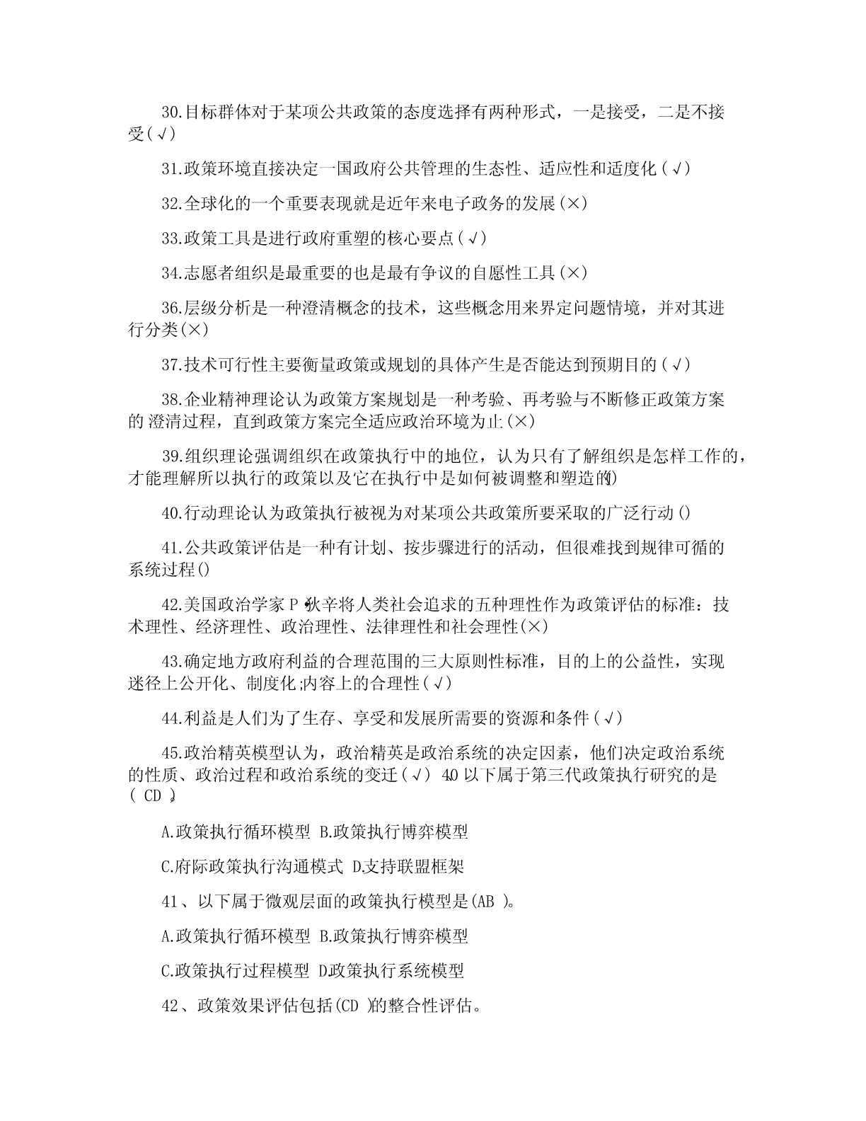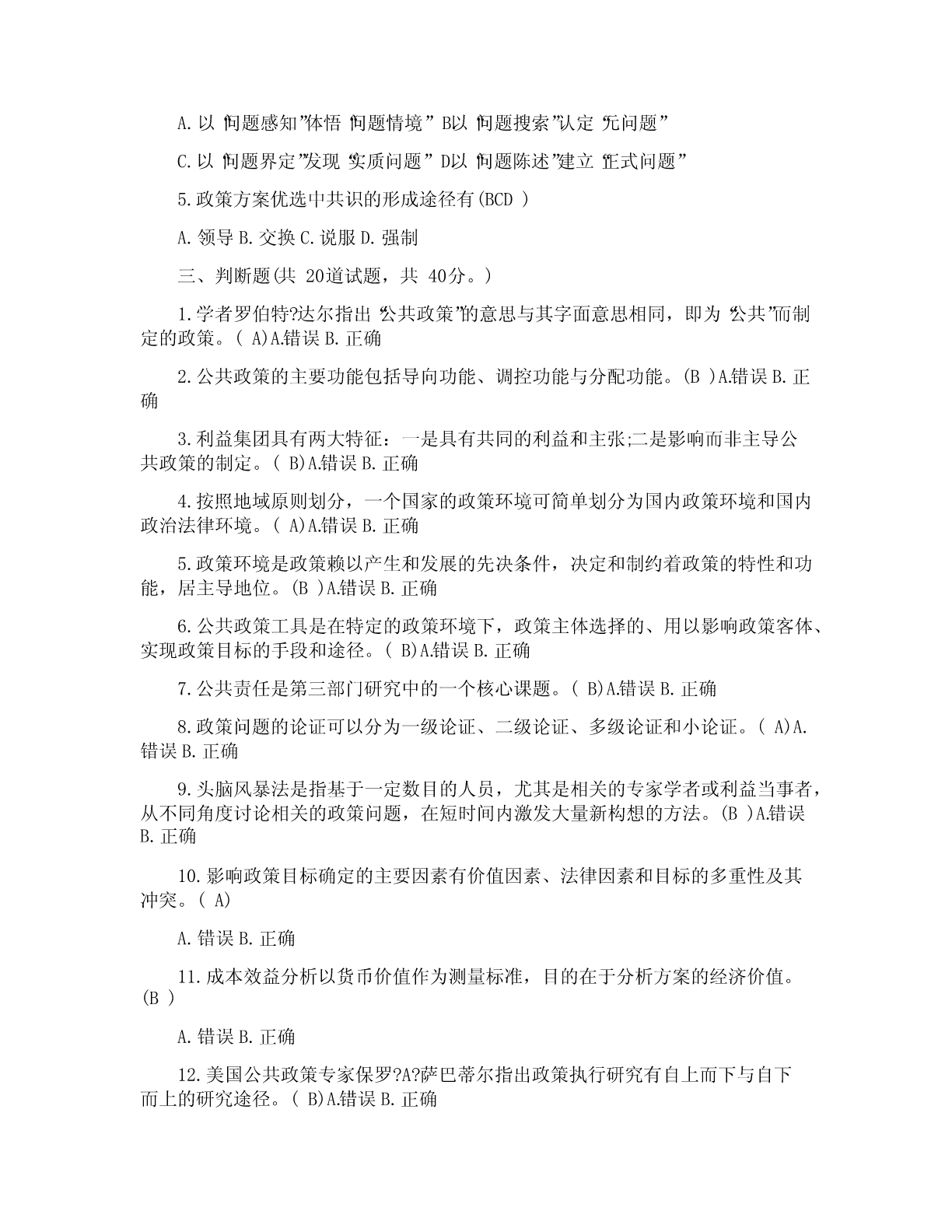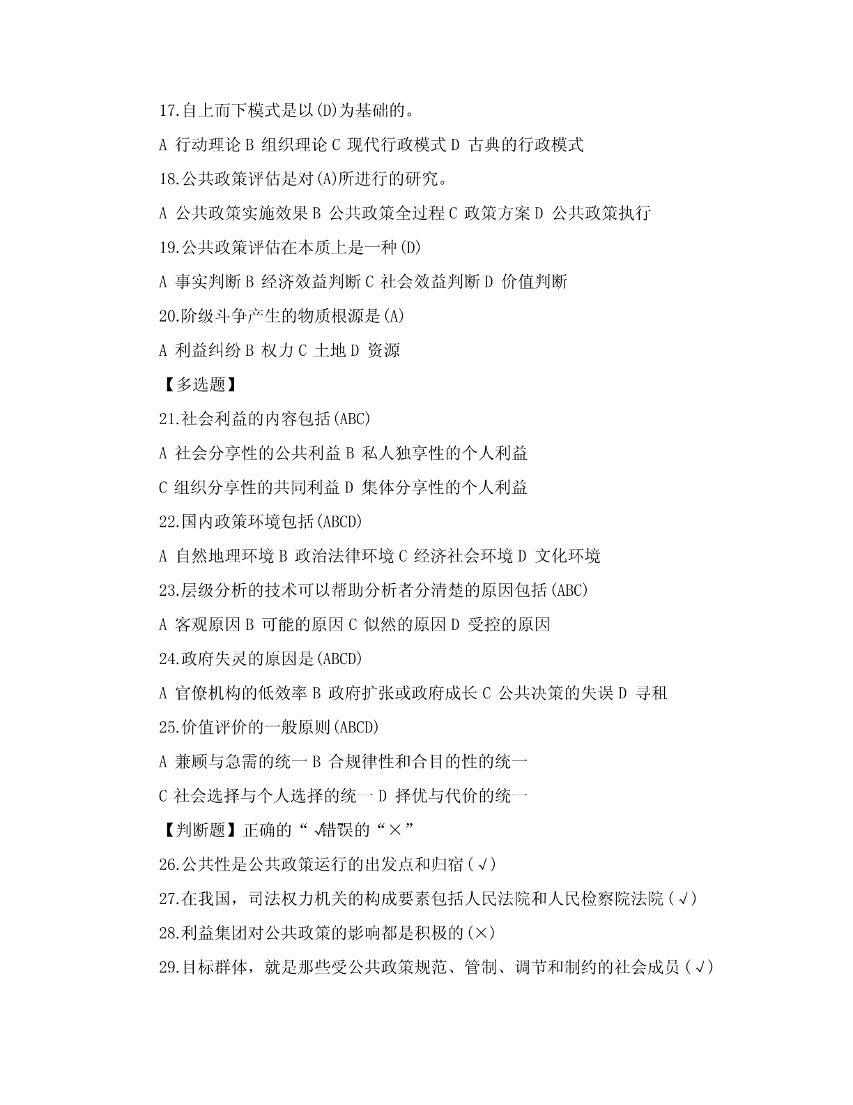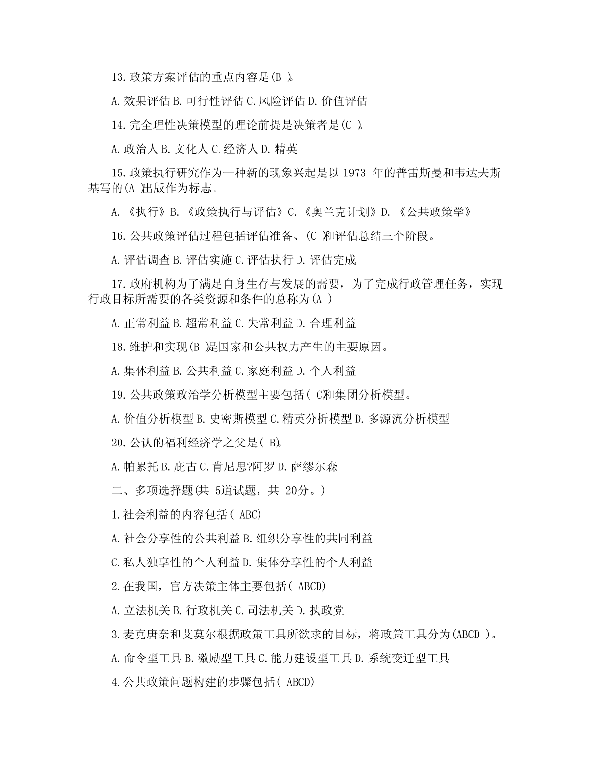 一、单项选择题(共20道试题,共40分。)1.公共政策是(A)依据特定时期的目标,通过对社会中各种利益进行选择与整合,在追求有效增进与公平分配社会利益中所制定的行为准则。A.政府2.公共政策的核心要素是(A)A.利益3.直接或间接地参与公共政策过程的各个环节,对公共政策制定、执行、评估和监控等活动有影响或试图施加影响的个人、团体或组织是指(A)A.公共政策主体4.在西方,与立法权、行政权和司法权并列的“第四种权力”是指(D)A.公民B.非政府组织C.利益集团D.大众传媒5.那些受公共政策规范、管制、调节和制约的社会成员被称为(B)A.公共政策客体B.目标群体C.思想库D.政策目标6.(A构成政策)系统运行的外部条件,影响和制约着公共政策过程。A.公共政策环境B.全球化C.国际化D.信息化7.国内政策环境中的文化环境不包括(C)A.传统习俗文化B.政治文化C.精英文化D.普通文化水平8.荷兰经济学家(D)是最早试图对政策工具加以分类的学者。A.萨拉蒙B.罗威C.林布隆D.科臣9.(C)是指政府通过一系列行政管理过程(通常由特别指定的管制机构来执行),要求或者禁止个人和机构的A.管理B.强制C.管制D.限制10.卡尔.帕顿和大卫.沙维奇在(A)一书中提出了确定问题边界的便捷计算方法。A.《公共政策分析和规划的初步方法》B.《公共政策分析导论》C.《理解公共政策》D.《政策分析中的问题界定》11.(B的)建立是社会问题转化为政策问题的关键一步。A.政策问题B.政策议程C.政策目标D.政策对象12.政策方案制定在整个政策过程中居于(D)地位。A.权威B.重要C.次要D.枢纽13.政策方案评估的重点内容是(B)。A.效果评估B.可行性评估C.风险评估D.价值评估14.完全理性决策模型的理论前提是决策者是(C)。A.政治人B.文化人C.经济人D.精英15.政策执行研究作为一种新的现象兴起是以1973年的普雷斯曼和韦达夫斯基写的(A)出版作为标志。A.《执行》B.《政策执行与评估》C.《奥兰克计划》D.《公共政策学》16.公共政策评估过程包括评估准备、(C)和评估总结三个阶段。A.评估调查B.评估实施C.评估执行D.评估完成17.政府机构为了满足自身生存与发展的需要,为了完成行政管理任务,实现行政目标所需要的各类资源和条件的总称为(A)A.正常利益B.超常利益C.失常利益D.合理利益18.维护和实现(B)是国家和公共权力产生的主要原因。A.集体利益B.公共利益C.家庭利益D.个人利益19.公共政策政治学分析模型主要包括(C)和集团分析模型。A.价值分析模型B.史密斯模型C.精英分析模型D.多源流分析模型20.公认的福利经济学之父是(B)。A.帕累托B.庇古C.肯尼思?阿罗D.萨缪尔森二、多项选择题(共5道试题,共20分。)1.社会利益的内容包括(ABC)A.社会分享性的公共利益B.组织分享性的共同利益C.私人独享性的个人利益D.集体分享性的个人利益2.在我国,官方决策主体主要包括(ABCD)A.立法机关B.行政机关C.司法机关D.执政党3.麦克唐奈和艾莫尔根据政策工具所欲求的目标,将政策工具分为(ABCD)。A.命令型工具B.激励型工具C.能力建设型工具D.系统变迁型工具4.公共政策问题构建的步骤包括(ABCD)A.以“问题感知”体悟“问题情境”B.以“问题搜索”认定“元问题”C.以“问题界定”发现“实质问题”D.以“问题陈述”建立“正式问题”5.政策方案优选中共识的形成途径有(BCD)A.领导B.交换C.说服D.强制三、判断题(共20道试题,共40分。)1.学者罗伯特?达尔指出“公共政策”的意思与其字面意思相同,即为“公共”而制定的政策。(A)A.错误B.正确2.公共政策的主要功能包括导向功能、调控功能与分配功能。(B)A.错误B.正确3.利益集团具有两大特征:一是具有共同的利益和主张;二是影响而非主导公共政策的制定。(B)A.错误B.正确4.按照地域原则划分,一个国家的政策环境可简单划分为国内政策环境和国内政治法律环境。(A)A.错误B.正确5.政策环境是政策赖以产生和发展的先决条件,决定和制约着政策的特性和功能,居主导地位。(B)A.错误B.正确6.公共政策工具是在特定的政策环境下,政策主体选择的、用以影响政策客体、实现政策目标的手段和途径。(B)A.错误B.正确7.公共责任是第三部门研究中的一个核心课题。(B)A.错误B.正确8.政策问题的论证可以分为一级论证、二级论证、多