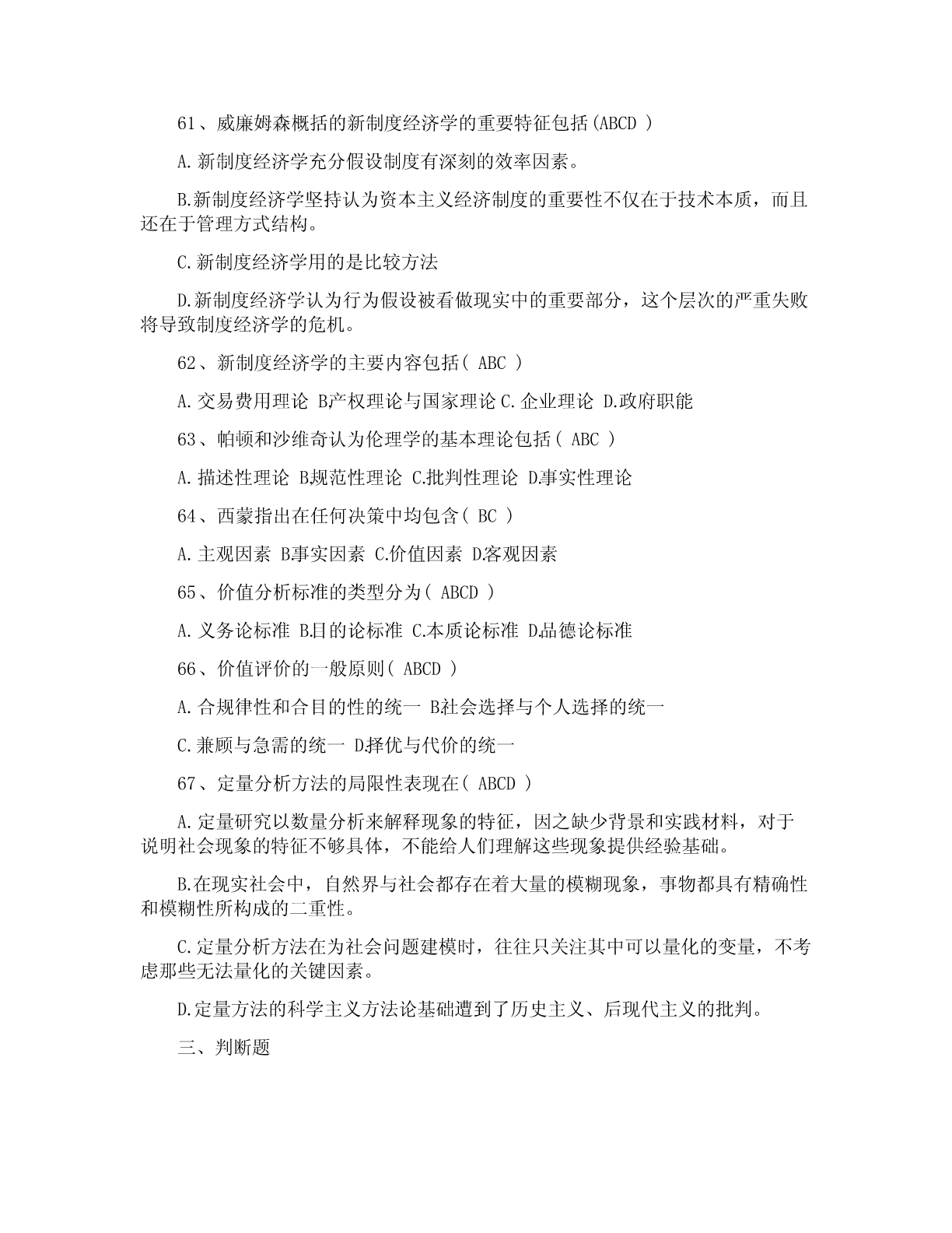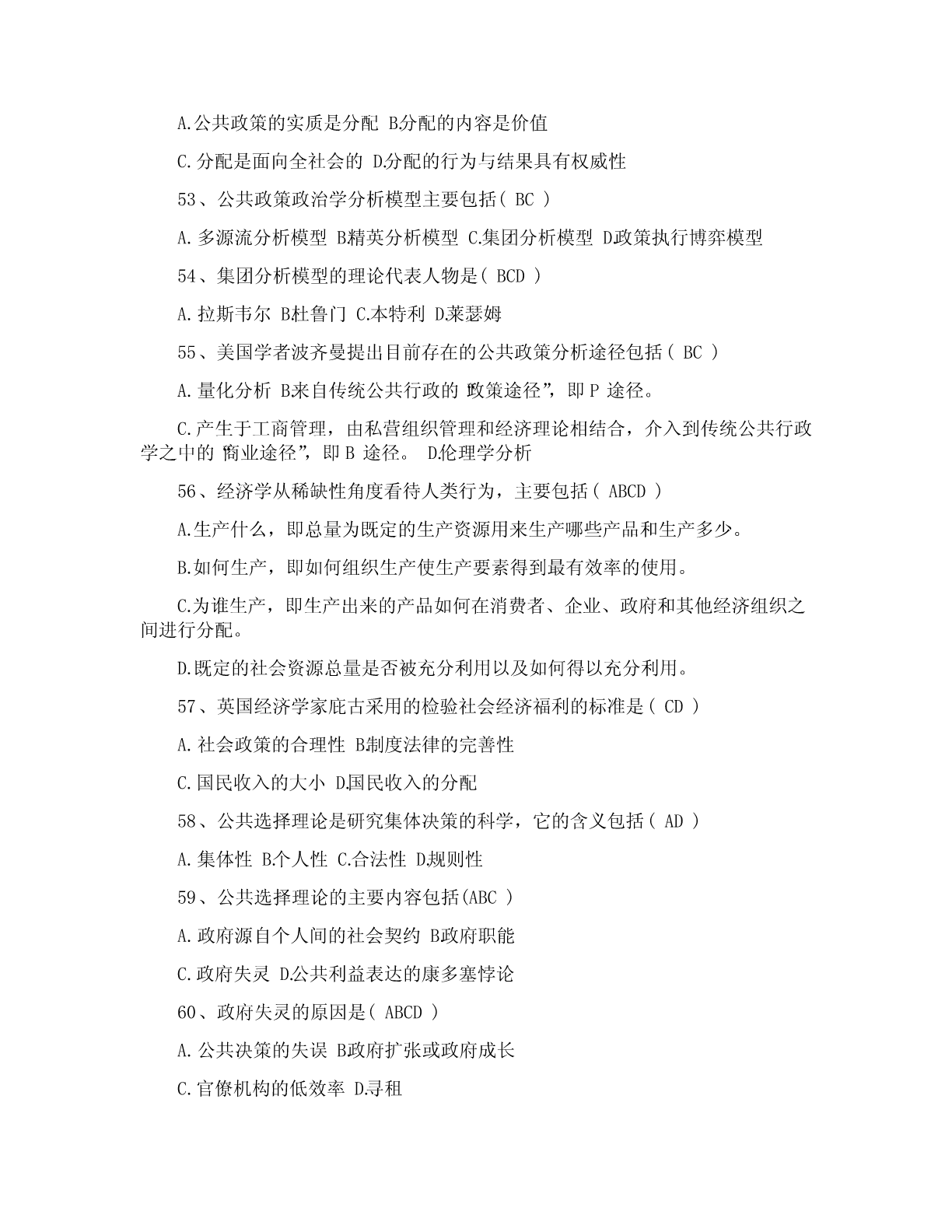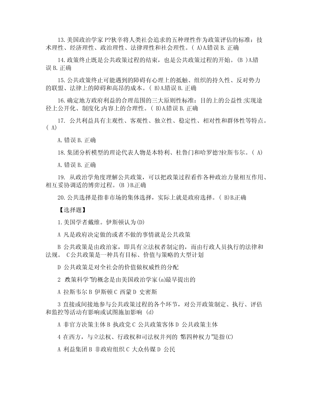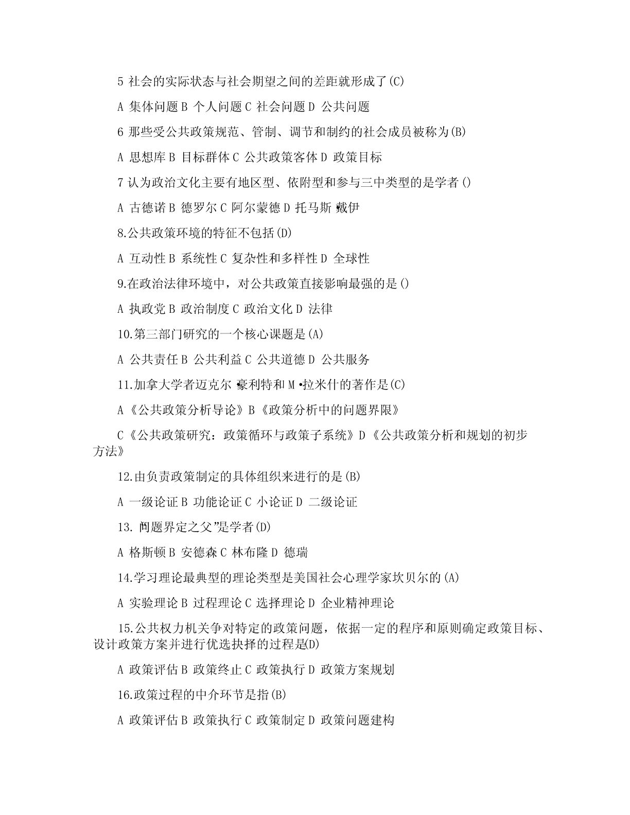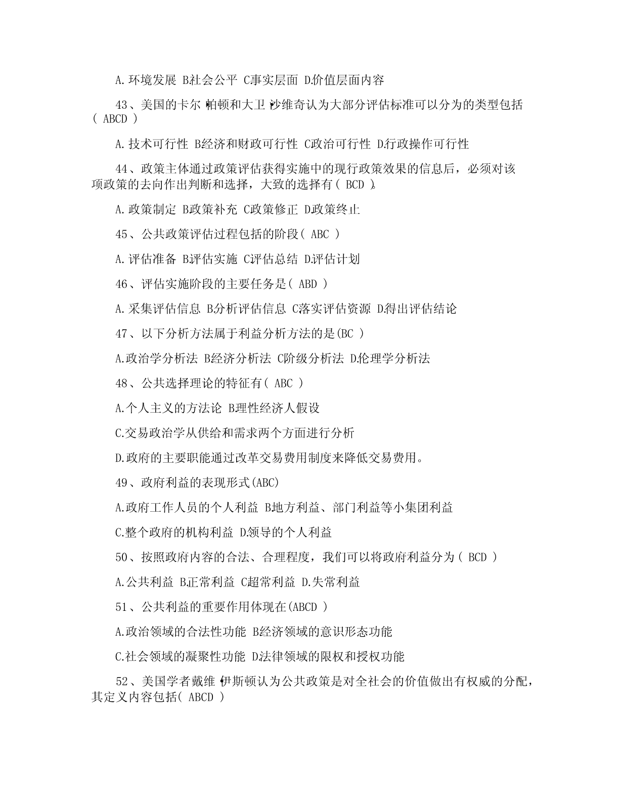 一、单项选择题(共20道试题,共40分。)1.公共政策是(A)依据特定时期的目标,通过对社会中各种利益进行选择与整合,在追求有效增进与公平分配社会利益中所制定的行为准则。A.政府2.公共政策的核心要素是(A)A.利益3.直接或间接地参与公共政策过程的各个环节,对公共政策制定、执行、评估和监控等活动有影响或试图施加影响的个人、团体或组织是指(A)A.公共政策主体4.在西方,与立法权、行政权和司法权并列的“第四种权力”是指(D)A.公民B.非政府组织C.利益集团D.大众传媒5.那些受公共政策规范、管制、调节和制约的社会成员被称为(B)A.公共政策客体B.目标群体C.思想库D.政策目标6.(A构成政策)系统运行的外部条件,影响和制约着公共政策过程。A.公共政策环境B.全球化C.国际化D.信息化7.国内政策环境中的文化环境不包括(C)A.传统习俗文化B.政治文化C.精英文化D.普通文化水平8.荷兰经济学家(D)是最早试图对政策工具加以分类的学者。A.萨拉蒙B.罗威C.林布隆D.科臣9.(C)是指政府通过一系列行政管理过程(通常由特别指定的管制机构来执行),要求或者禁止个人和机构的A.管理B.强制C.管制D.限制10.卡尔.帕顿和大卫.沙维奇在(A)一书中提出了确定问题边界的便捷计算方法。A.《公共政策分析和规划的初步方法》B.《公共政策分析导论》C.《理解公共政策》D.《政策分析中的问题界定》11.(B的)建立是社会问题转化为政策问题的关键一步。A.政策问题B.政策议程C.政策目标D.政策对象12.政策方案制定在整个政策过程中居于(D)地位。A.权威B.重要C.次要D.枢纽13.政策方案评估的重点内容是(B)。A.效果评估B.可行性评估C.风险评估D.价值评估14.完全理性决策模型的理论前提是决策者是(C)。A.政治人B.文化人C.经济人D.精英15.政策执行研究作为一种新的现象兴起是以1973年的普雷斯曼和韦达夫斯基写的(A)出版作为标志。A.《执行》B.《政策执行与评估》C.《奥兰克计划》D.《公共政策学》16.公共政策评估过程包括评估准备、(C)和评估总结三个阶段。A.评估调查B.评估实施C.评估执行D.评估完成17.政府机构为了满足自身生存与发展的需要,为了完成行政管理任务,实现行政目标所需要的各类资源和条件的总称为(A)A.正常利益B.超常利益C.失常利益D.合理利益18.维护和实现(B)是国家和公共权力产生的主要原因。A.集体利益B.公共利益C.家庭利益D.个人利益19.公共政策政治学分析模型主要包括(C)和集团分析模型。A.价值分析模型B.史密斯模型C.精英分析模型D.多源流分析模型20.公认的福利经济学之父是(B)。A.帕累托B.庇古C.肯尼思?阿罗D.萨缪尔森二、多项选择题(共5道试题,共20分。)1.社会利益的内容包括(ABC)A.社会分享性的公共利益B.组织分享性的共同利益C.私人独享性的个人利益D.集体分享性的个人利益2.在我国,官方决策主体主要包括(ABCD)A.立法机关B.行政机关C.司法机关D.执政党3.麦克唐奈和艾莫尔根据政策工具所欲求的目标,将政策工具分为(ABCD)。A.命令型工具B.激励型工具C.能力建设型工具D.系统变迁型工具4.公共政策问题构建的步骤包括(ABCD)A.以“问题感知”体悟“问题情境”B.以“问题搜索”认定“元问题”C.以“问题界定”发现“实质问题”D.以“问题陈述”建立“正式问题”5.政策方案优选中共识的形成途径有(BCD)A.领导B.交换C.说服D.强制三、判断题(共20道试题,共40分。)1.学者罗伯特?达尔指出“公共政策”的意思与其字面意思相同,即为“公共”而制定的政策。(A)A.错误B.正确2.公共政策的主要功能包括导向功能、调控功能与分配功能。(B)A.错误B.正确3.利益集团具有两大特征:一是具有共同的利益和主张;二是影响而非主导公共政策的制定。(B)A.错误B.正确4.按照地域原则划分,一个国家的政策环境可简单划分为国内政策环境和国内政治法律环境。(A)A.错误B.正确5.政策环境是政策赖以产生和发展的先决条件,决定和制约着政策的特性和功能,居主导地位。(B)A.错误B.正确6.公共政策工具是在特定的政策环境下,政策主体选择的、用以影响政策客体、实现政策目标的手段和途径。(B)A.错误B.正确7.公共责任是第三部门研究中的一个核心课题。(B)A.错误B.正确8.政策问题的论证可以分为一级论证、二级论证、多