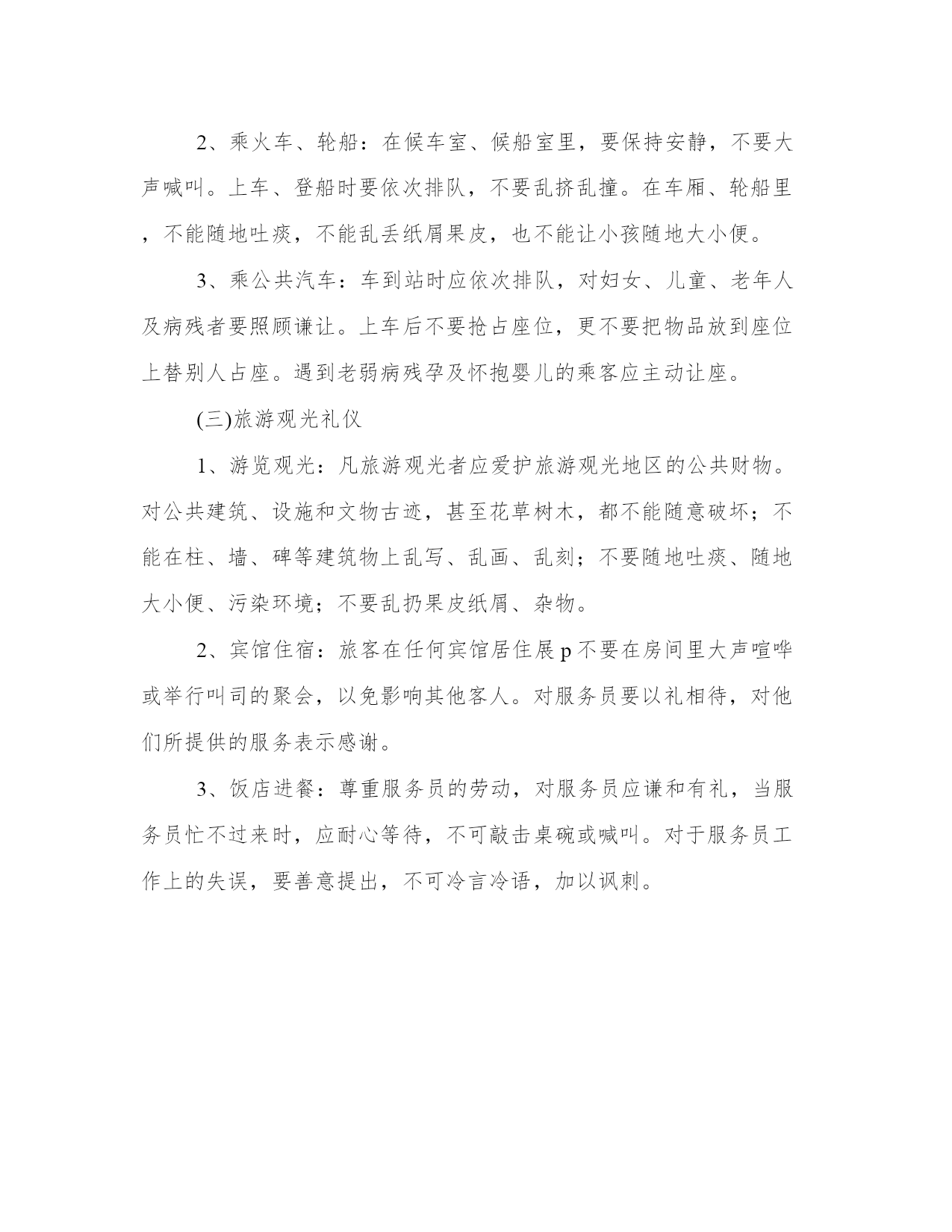 公共场合中应注意的个人礼仪1影剧院:观众应尽早入座。如果自己的座位在中间应当有礼貌的向已就座者示意,合其让自己通过。通过让座者时要与之正面想对,切勿让自己的臀部正对着人家的脸,这是很失礼的。应注意衣着整洁,即使天气炎热,袒胸露腹,也是不雅观的。在影剧院万不可大呼小叫,笑语喧哗,也铁把影院当成小吃店大吃大喝。演出结束后观众应有秩序地离开,不要推搡。2、图书馆、阅览室:图书馆、阅览室是公共的学习场所。①要注意整洁,遵守规则。不能穿汗衫和拖拉鞋入内。就座甲,不要为别人预占位置,查阅目录卡片时,不可把卡片翻乱或撕环,或用笔在卡片上涂抹划线。②要保持安静和卫生。走动时脚步要轻,不要高声谈话,不要吃有声或带有果壳的食物,这些都是有悖于文明礼貌的。③对图书馆、阅览室的图书桌椅板凳等等属于公共财产,也应该注意爱护,不要随意刻画,破坏。(二)乘车礼仪1、骑白行车:要严格遵守交通规则。不闯红灯,骑车时不撑雨伞,不互相追逐或曲折竞驶,不骑车带人。遇到老弱病残者动作迟缓,要给予谅解,主动礼让。2、乘火车、轮船:在候车室、候船室里,要保持安静,不要大声喊叫。上车、登船时要依次排队,不要乱挤乱撞。在车厢、轮船里,不能随地吐痰,不能乱丢纸屑果皮,也不能让小孩随地大小便。3、乘公共汽车:车到站时应依次排队,对妇女、儿童、老年人及病残者要照顾谦让。上车后不要抢占座位,更不要把物品放到座位上替别人占座。遇到老弱病残孕及怀抱婴儿的乘客应主动让座。(三)旅游观光礼仪1、游览观光:凡旅游观光者应爱护旅游观光地区的公共财物。对公共建筑、设施和文物古迹,甚至花草树木,都不能随意破坏;不能在柱、墙、碑等建筑物上乱写、乱画、乱刻;不要随地吐痰、随地大小便、污染环境;不要乱扔果皮纸屑、杂物。2、宾馆住宿:旅客在任何宾馆居住展p不要在房间里大声喧哗或举行叫司的聚会,以免影响其他客人。对服务员要以礼相待,对他们所提供的服务表示感谢。3、饭店进餐:尊重服务员的劳动,对服务员应谦和有礼,当服务员忙不过来时,应耐心等待,不可敲击桌碗或喊叫。对于服务员工作上的失误,要善意提出,不可冷言冷语,加以讽刺。