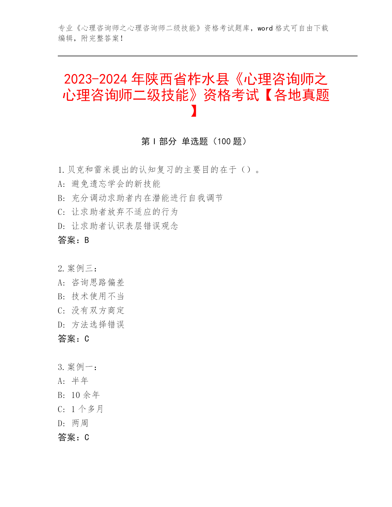 2023-2024年陕西省柞水县《心理咨询师之心理咨询师二级技能》资格考试【各地真题】
