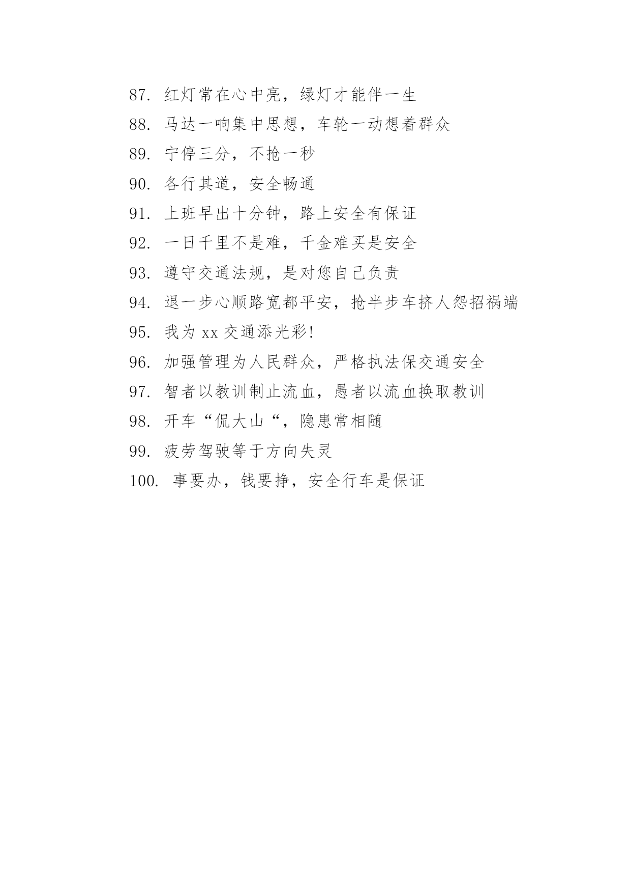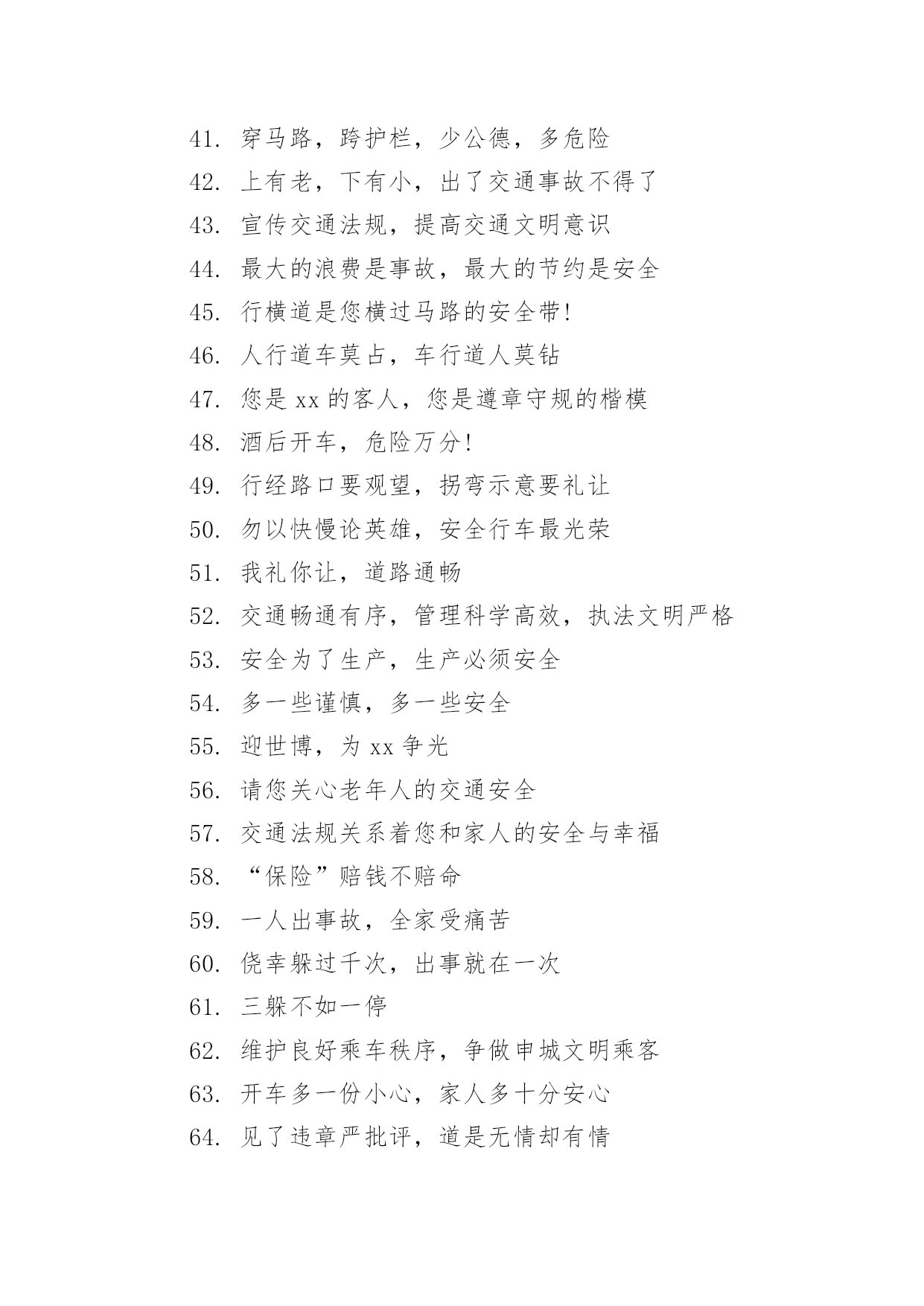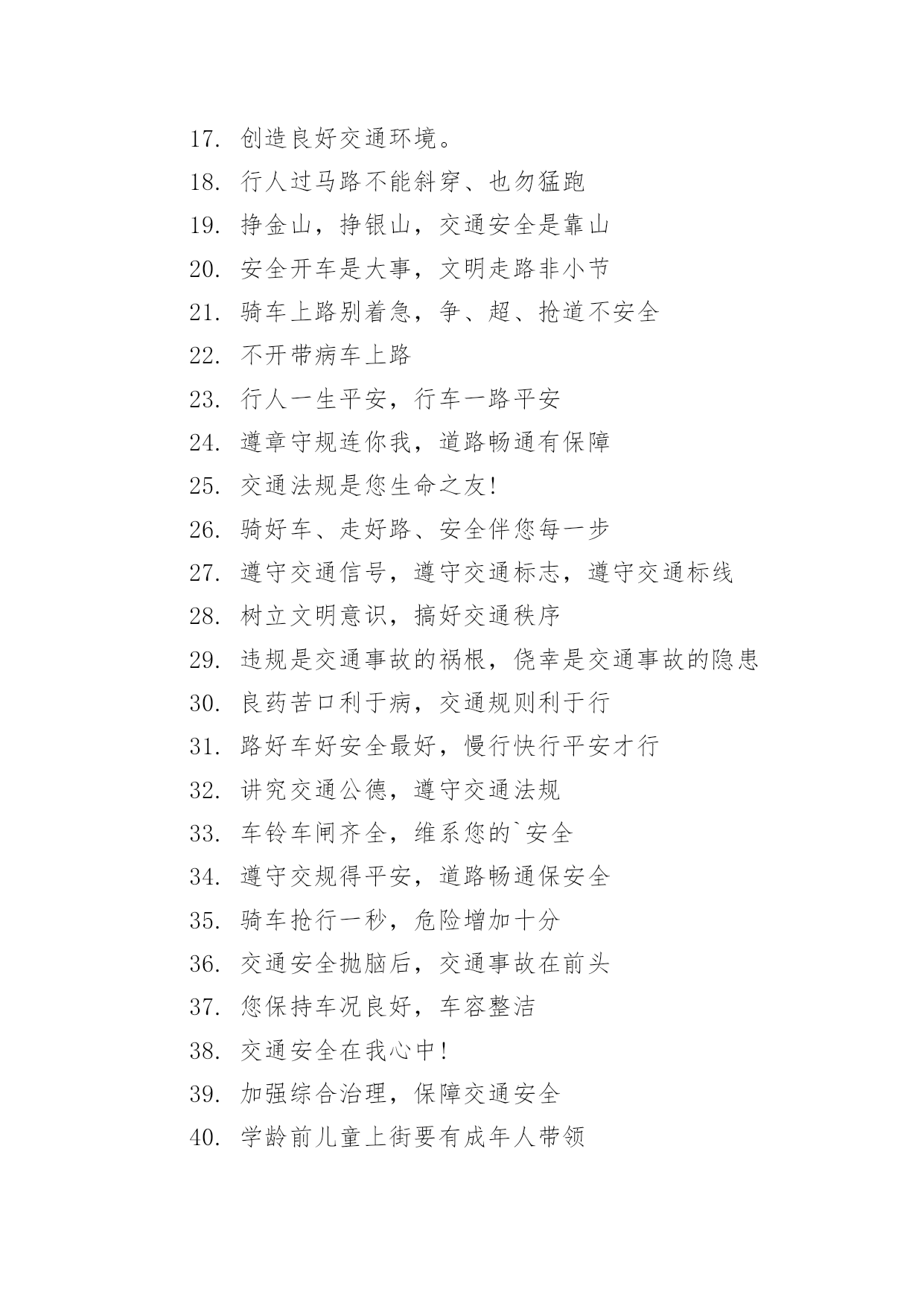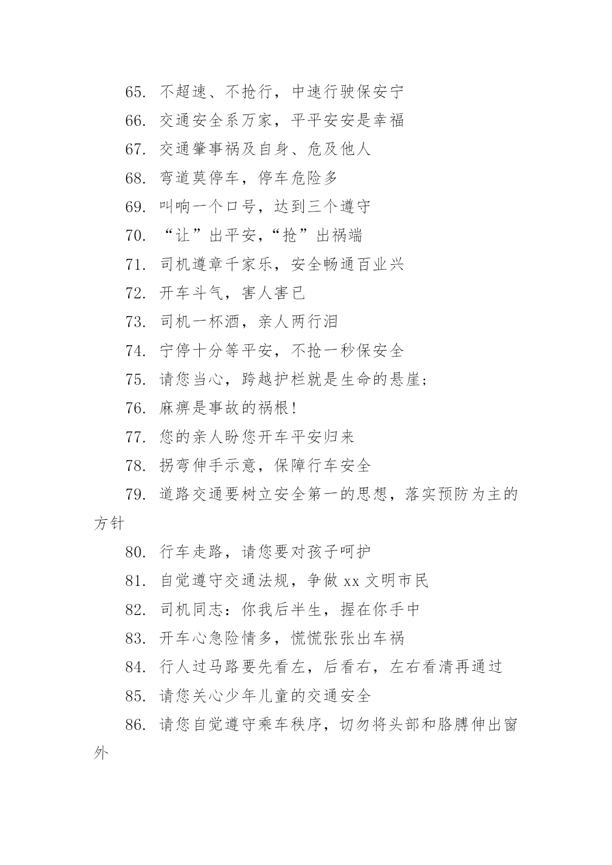 交通安全的宣传标语在平凡的学习、工作、生活中,大家都听说过或者使用过一些比较经典的标语吧,标语是用简短文字写出的有宣传鼓动作用的口号,对文化起到一定的宣传作用。你知道什么样的标语才能算得上是好的标语吗?以下是小编为大家收集的2021有关交通安全的宣传标语,希望能够帮助到大家。1.行车慎为本,开车礼当先2.铁路道口险情多,停车、了望再通过!3.让一让道路通畅,让一让安全有保障,让一让心情更舒畅4.进一步将受到谴责,退一步将得到尊重5.交通法规在心中,交通安全在手中6.人行横道车让人,各种车道人让车7.祝您一路平安!8.要遵守交规,不要乱行乱停9.恪守交规,法律为您生命护航10.要做英雄人,不开“英雄”车11.珍爱生命不要翻越护栏12.谨慎驾驶,保证安全13.多拉快跑,凶多吉少14.交通事故不长眼,你凶他就险15.出行时,切记系上交通法规这条安全带16.各行其道,安全可靠17.创造良好交通环境。18.行人过马路不能斜穿、也勿猛跑19.挣金山,挣银山,交通安全是靠山20.安全开车是大事,文明走路非小节21.骑车上路别着急,争、超、抢道不安全22.不开带病车上路23.行人一生平安,行车一路平安24.遵章守规连你我,道路畅通有保障25.交通法规是您生命之友!26.骑好车、走好路、安全伴您每一步27.遵守交通信号,遵守交通标志,遵守交通标线28.树立文明意识,搞好交通秩序29.违规是交通事故的祸根,侥幸是交通事故的隐患30.良药苦口利于病,交通规则利于行31.路好车好安全最好,慢行快行平安才行32.讲究交通公德,遵守交通法规33.车铃车闸齐全,维系您的`安全34.遵守交规得平安,道路畅通保安全35.骑车抢行一秒,危险增加十分36.交通安全抛脑后,交通事故在前头37.您保持车况良好,车容整洁38.交通安全在我心中!39.加强综合治理,保障交通安全40.学龄前儿童上街要有成年人带领41.穿马路,跨护栏,少公德,多危险42.上有老,下有小,出了交通事故不得了43.宣传交通法规,提高交通文明意识44.最大的浪费是事故,最大的节约是安全45.行横道是您横过马路的安全带!46.人行道车莫占,车行道人莫钻47.您是xx的客人,您是遵章守规的楷模48.酒后开车,危险万分!49.行经路口要观望,拐弯示意要礼让50.勿以快慢论英雄,安全行车最光荣51.我礼你让,道路通畅52.交通畅通有序,管理科学高效,执法文明严格53.安全为了生产,生产必须安全54.多一些谨慎,多一些安全55.迎世博,为xx争光56.请您关心老年人的交通安全57.交通法规关系着您和家人的安全与幸福58.“保险”赔钱不赔命59.一人出事故,全家受痛苦60.侥幸躲过千次,出事就在一次61.三躲不如一停62.维护良好乘车秩序,争做申城文明乘客63.开车多一份小心,家人多十分安心64.见了违章严批评,道是无情却有情65.不超速、不抢行,中速行驶保安宁66.交通安全系万家,平平安安是幸福67.交通肇事祸及自身、危及他人68.弯道莫停车,停车危险多69.叫响一个口号,达到三个遵守70.“让”出平安,“抢”出祸端71.司机遵章千家乐,安全畅通百业兴72.开车斗气,害人害已73.司机一杯酒,亲人两行泪74.宁停十分等平安,不抢一秒保安全75.请您当心,跨越护栏就是生命的悬崖;76.麻痹是事故的祸根!77.您的亲人盼您开车平安归来78.拐弯伸手示意,保障行车安全79.道路交通要树立安全第一的思想,落实预防为主的方针80.行车走路,请您要对孩子呵护81.自觉遵守交通法规,争做xx文明市民82.司机同志:你我后半生,握在你手中83.开车心急险情多,慌慌张张出车祸84.行人过马路要先看左,后看右,左右看清再通过85.请您关心少年儿童的交通安全86.请您自觉遵守乘车秩序,切勿将头部和胳膊伸出窗外87.红灯常在心中亮,绿灯才能伴一生88.马达一响集中思想,车轮一动想着群众89.宁停三分,不抢一秒90.各行其道,安全畅通91.上班早出十分钟,路上安全有保证92.一日千里不是难,千金难买是安全93.遵守交通法规,是对您自己负责94.退一步心顺路宽都平安,抢半步车挤人怨招祸端95.我为xx交通添光彩!96.加强管理为人民群众,严格执法保交通安全97.智者以教训制止流血,愚者以流血换取教训98.开车“侃大山“,隐患常相随99.疲劳驾驶等于方向失灵100.事要办,钱要挣,安全行车是保证
