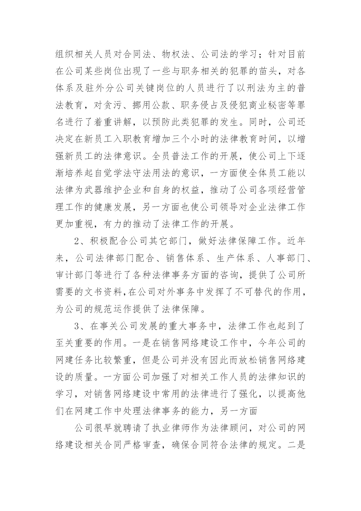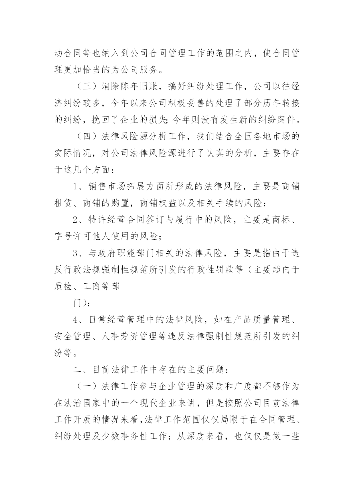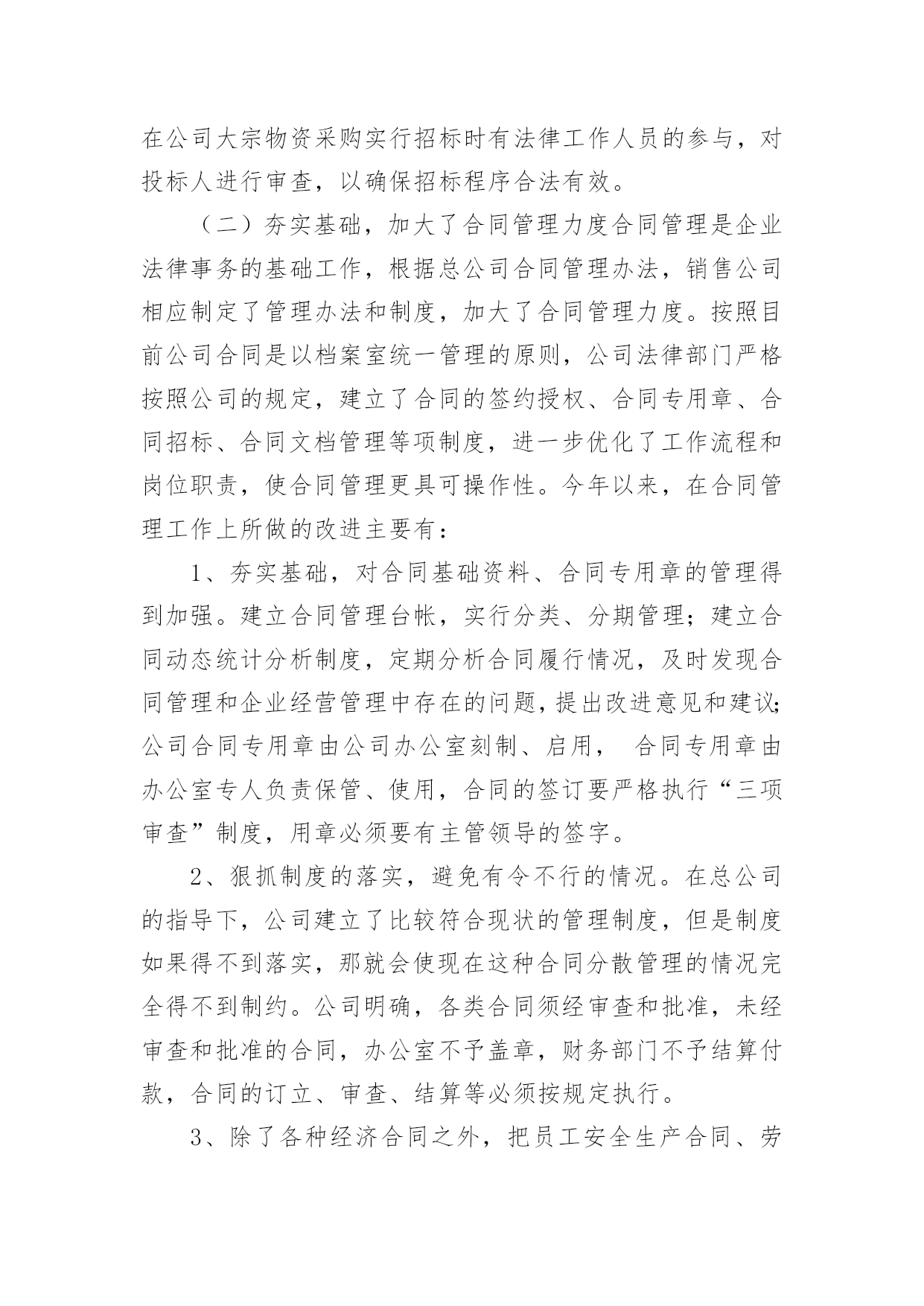 公司法务工作总结总结是在某一时期、某一项目或某些工作告一段落或者全部完成后进行回顾检查、分析评价,从而得出教训和一些规律性认识的一种书面材料,它能使我们及时找出错误并改正,为此我们要做好回顾,写好总结。总结怎么写才不会千篇一律呢?以下是小编为大家收集的公司法务工作总结,供大家参考借鉴,希望可以帮助到有需要的朋友。公司法务工作总结1近年来,公司法律事务工作在领导的关心和支持下,从企业依法治理、合同管理、纠纷处理、法律风险源分析预防等方面做了一定的工作,现将有关情况总结如下:一、近年来的主要工作:(一)积极调动各种资源,深入开展依法治理工作,结合公司的实际情况,公司深入开展了依法治理工作,充分调动企业内外各种资源,力求使企业在法治范围内做到规范运作,努力达到依法治企的目的。1、分层次做好全员普法工作,加强领导干部、经营管理人员及基层员工法律知识的学习,提高运用法律管理的意识和能力。对于领导干部着重做好法律意识的加强以及法律风险的防范与控制工作,而对于具体岗位人员则偏重于专业法律知识的辅导,以法律理论知识结合公司以往典型案例评析、纠纷案件分析等资料及时组织学习,如对投资计划管理组织相关人员对合同法、物权法、公司法的学习;针对目前在公司某些岗位出现了一些与职务相关的犯罪的苗头,对各体系及驻外分公司关键岗位的人员进行了以刑法为主的普法教育,对贪污、挪用公款、职务侵占及侵犯商业秘密等罪名进行了着重讲解,以预防此类犯罪的发生。同时,公司还决定在新员工入职教育增加三个小时的法律教育时间,以增强新员工的法律意识。全员普法工作的开展,使公司上下逐渐培养起自觉学法守法用法的意识,一方面使全体员工能以法律为武器维护企业和自身的权益,推动了公司各项经营管理工作的健康发展,另一方面也使公司领导对企业法律工作更加重视,有力的推动了法律工作的开展。2、积极配合公司其它部门,做好法律保障工作。近年来,公司法律部门配合、销售体系、生产体系、人事部门、审计部门等进行了各种法律事务方面的咨询,提供了公司所需要的文书资料,在公司对外事务中发挥了不可替代的作用,为公司的规范运作提供了法律保障。3、在事关公司发展的重大事务中,法律工作也起到了至关重要的作用。一是在销售网络建设工作中,今年公司的网建任务比较繁重,但是公司并没有因此而放松销售网络建设的质量。一方面公司加强了对相关工作人员的法律知识的学习,对销售网络建设中常用的法律进行了强化,以提高他们在网建工作中处理法律事务的能力,另一方面公司很早就聘请了执业律师作为法律顾问,对公司的网络建设相关合同严格审查,确保合同符合法律的规定。二是在公司大宗物资采购实行招标时有法律工作人员的参与,对投标人进行审查,以确保招标程序合法有效。(二)夯实基础,加大了合同管理力度合同管理是企业法律事务的基础工作,根据总公司合同管理办法,销售公司相应制定了管理办法和制度,加大了合同管理力度。按照目前公司合同是以档案室统一管理的原则,公司法律部门严格按照公司的规定,建立了合同的签约授权、合同专用章、合同招标、合同文档管理等项制度,进一步优化了工作流程和岗位职责,使合同管理更具可操作性。今年以来,在合同管理工作上所做的改进主要有:1、夯实基础,对合同基础资料、合同专用章的管理得到加强。建立合同管理台帐,实行分类、分期管理;建立合同动态统计分析制度,定期分析合同履行情况,及时发现合同管理和企业经营管理中存在的问题,提出改进意见和建议;公司合同专用章由公司办公室刻制、启用,合同专用章由办公室专人负责保管、使用,合同的签订要严格执行“三项审查”制度,用章必须要有主管领导的签字。2、狠抓制度的落实,避免有令不行的情况。在总公司的指导下,公司建立了比较符合现状的管理制度,但是制度如果得不到落实,那就会使现在这种合同分散管理的情况完全得不到制约。公司明确,各类合同须经审查和批准,未经审查和批准的合同,办公室不予盖章,财务部门不予结算付款,合同的订立、审查、结算等必须按规定执行。3、除了各种经济合同之外,把员工安全生产合同、劳动合同等也纳入到公司合同管理工作的范围之内,使合同管理更加恰当的为公司服务。(三)消除陈年旧账,搞好纠纷处理工作,公司以往经济纠纷较多,今年以来公司积极妥善的处理了部分历年转接的纠纷,挽回了企业的损失;今年则没有发生新的纠纷案件。(四)法律风险源分析工作,我们结合全国各地市场的实际情况,对公司法律风险源进行了认真的分析,主要存在于这几个方面:1、销售市场拓展方面所形成的法律风险,主要是商铺租赁、商铺的购置,商铺权益以及相关手续的风险;2、特许经营合同签订与履行中的风险,主要是商标、字号许可他人使用的风险;3、与政府职能部门相关的法律风险,主要是指由于违反行政法规强制性规范所引发的行政性罚款等(主要趋向于质检、工商等部门);4、日常经营管
