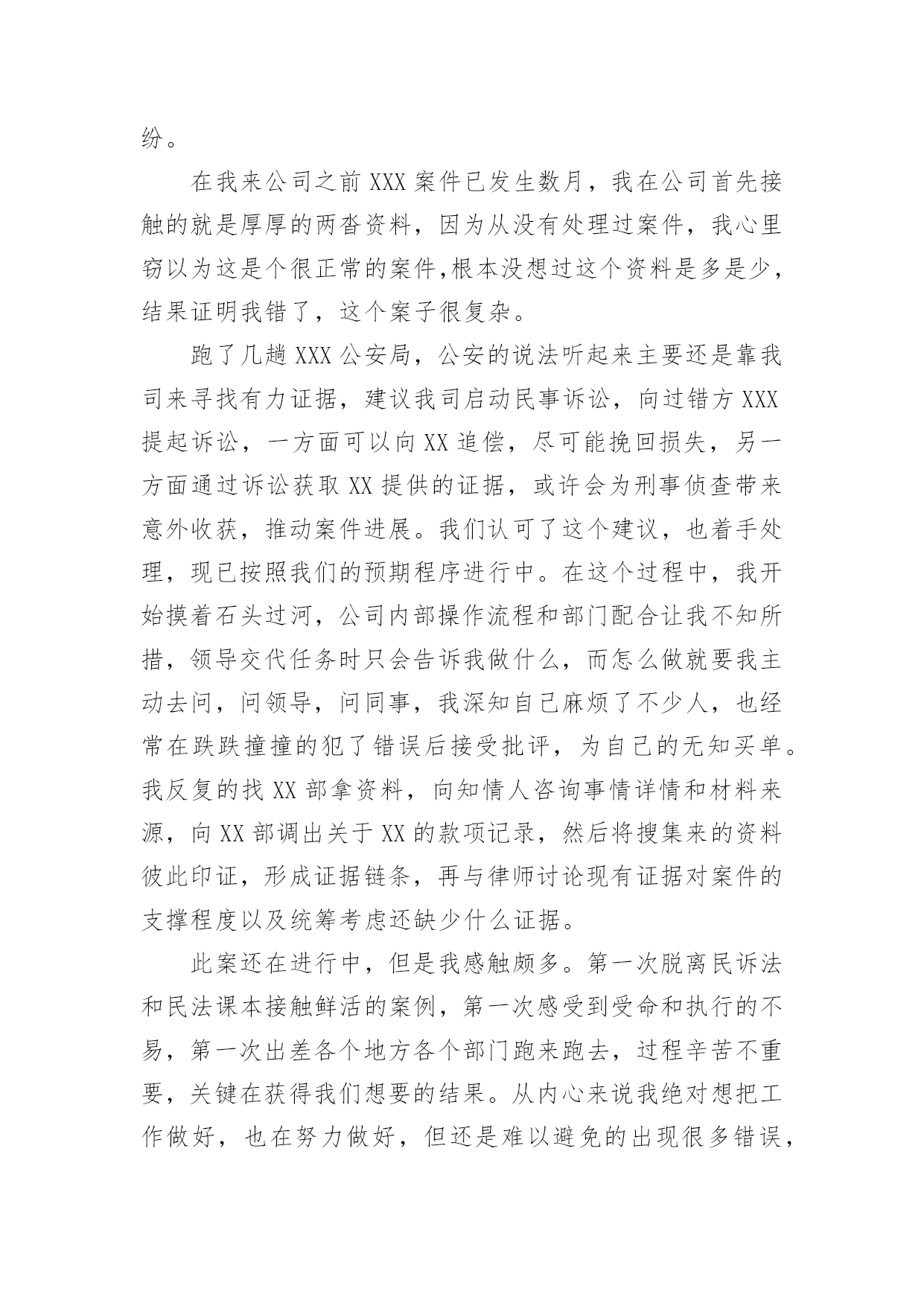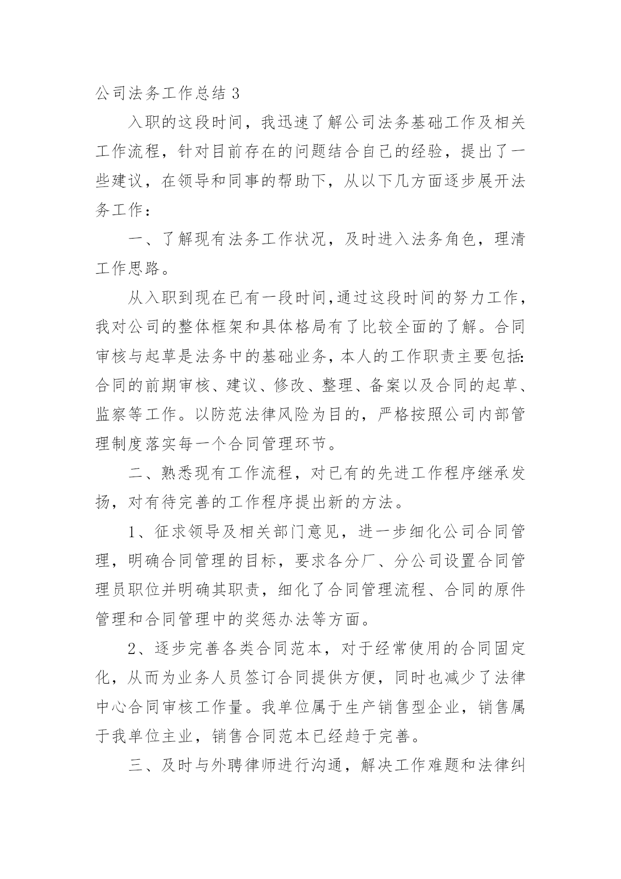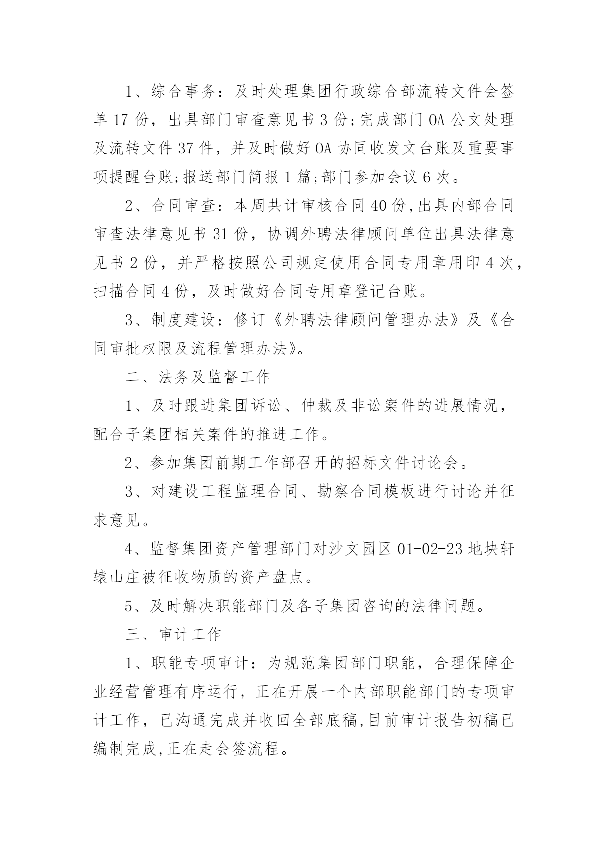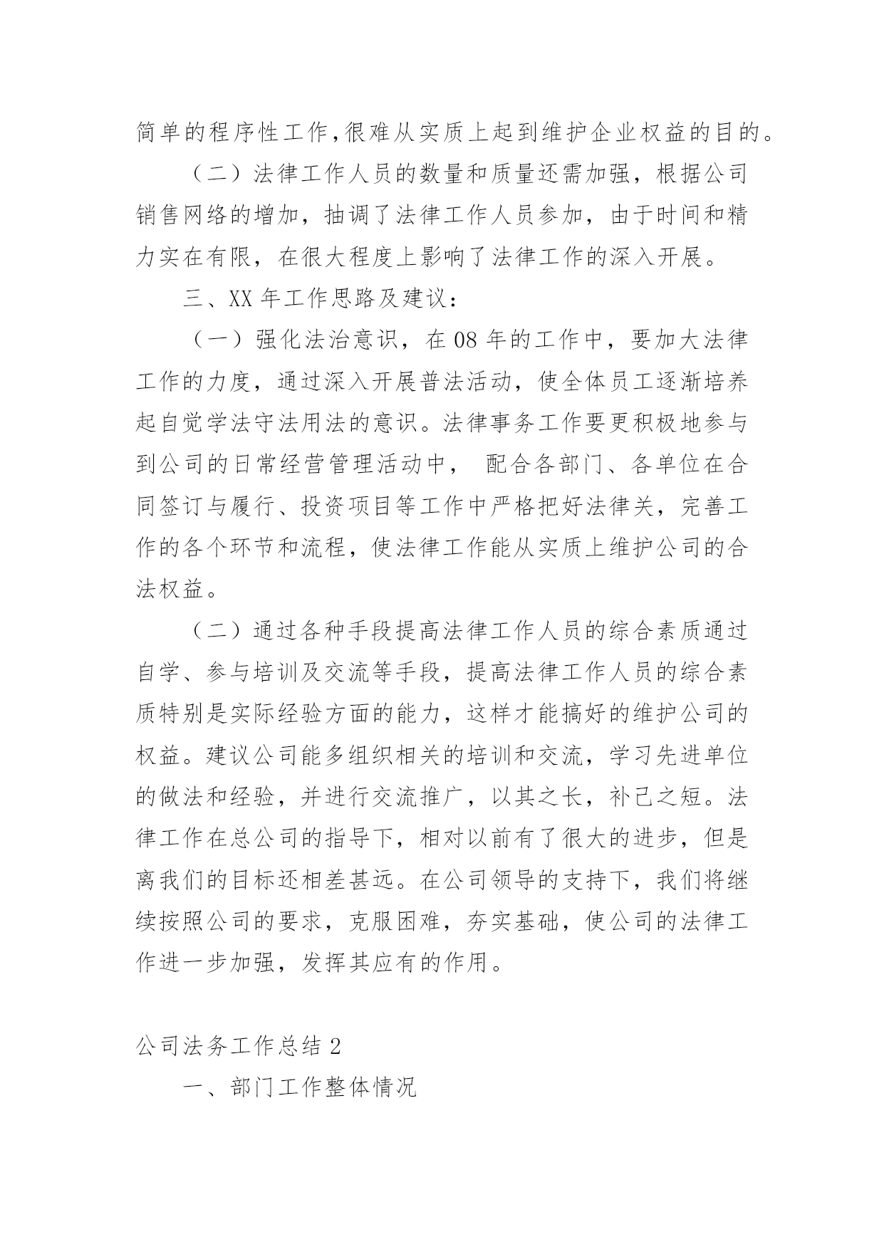 公司法务工作总结总结是在某一时期、某一项目或某些工作告一段落或者全部完成后进行回顾检查、分析评价,从而得出教训和一些规律性认识的一种书面材料,它能使我们及时找出错误并改正,为此我们要做好回顾,写好总结。总结怎么写才不会千篇一律呢?以下是小编为大家收集的公司法务工作总结,供大家参考借鉴,希望可以帮助到有需要的朋友。公司法务工作总结1近年来,公司法律事务工作在领导的关心和支持下,从企业依法治理、合同管理、纠纷处理、法律风险源分析预防等方面做了一定的工作,现将有关情况总结如下:一、近年来的主要工作:(一)积极调动各种资源,深入开展依法治理工作,结合公司的实际情况,公司深入开展了依法治理工作,充分调动企业内外各种资源,力求使企业在法治范围内做到规范运作,努力达到依法治企的目的。1、分层次做好全员普法工作,加强领导干部、经营管理人员及基层员工法律知识的学习,提高运用法律管理的意识和能力。对于领导干部着重做好法律意识的加强以及法律风险的防范与控制工作,而对于具体岗位人员则偏重于专业法律知识的辅导,以法律理论知识结合公司以往典型案例评析、纠纷案件分析等资料及时组织学习,如对投资计划管理组织相关人员对合同法、物权法、公司法的学习;针对目前在公司某些岗位出现了一些与职务相关的犯罪的苗头,对各体系及驻外分公司关键岗位的人员进行了以刑法为主的普法教育,对贪污、挪用公款、职务侵占及侵犯商业秘密等罪名进行了着重讲解,以预防此类犯罪的发生。同时,公司还决定在新员工入职教育增加三个小时的法律教育时间,以增强新员工的法律意识。全员普法工作的开展,使公司上下逐渐培养起自觉学法守法用法的意识,一方面使全体员工能以法律为武器维护企业和自身的权益,推动了公司各项经营管理工作的健康发展,另一方面也使公司领导对企业法律工作更加重视,有力的推动了法律工作的开展。2、积极配合公司其它部门,做好法律保障工作。近年来,公司法律部门配合、销售体系、生产体系、人事部门、审计部门等进行了各种法律事务方面的咨询,提供了公司所需要的文书资料,在公司对外事务中发挥了不可替代的作用,为公司的规范运作提供了法律保障。3、在事关公司发展的重大事务中,法律工作也起到了至关重要的作用。一是在销售网络建设工作中,今年公司的网建任务比较繁重,但是公司并没有因此而放松销售网络建设的质量。一方面公司加强了对相关工作人员的法律知识的学习,对销售网络建设中常用的法律进行了强化,以提高他们在网建工作中处理法律事务的能力,另一方面公司很早就聘请了执业律师作为法律顾问,对公司的网络建设相关合同严格审查,确保合同符合法律的规定。二是在公司大宗物资采购实行招标时有法律工作人员的参与,对投标人进行审查,以确保招标程序合法有效。(二)夯实基础,加大了合同管理力度合同管理是企业法律事务的基础工作,根据总公司合同管理办法,销售公司相应制定了管理办法和制度,加大了合同管理力度。按照目前公司合同是以档案室统一管理的原则,公司法律部门严格按照公司的规定,建立了合同的签约授权、合同专用章、合同招标、合同文档管理等项制度,进一步优化了工作流程和岗位职责,使合同管理更具可操作性。今年以来,在合同管理工作上所做的改进主要有:1、夯实基础,对合同基础资料、合同专用章的管理得到加强。建立合同管理台帐,实行分类、分期管理;建立合同动态统计分析制度,定期分析合同履行情况,及时发现合同管理和企业经营管理中存在的问题,提出改进意见和建议;公司合同专用章由公司办公室刻制、启用,合同专用章由办公室专人负责保管、使用,合同的签订要严格执行“三项审查”制度,用章必须要有主管领导的签字。2、狠抓制度的落实,避免有令不行的情况。在总公司的指导下,公司建立了比较符合现状的管理制度,但是制度如果得不到落实,那就会使现在这种合同分散管理的情况完全得不到制约。公司明确,各类合同须经审查和批准,未经审查和批准的合同,办公室不予盖章,财务部门不予结算付款,合同的订立、审查、结算等必须按规定执行。3、除了各种经济合同之外,把员工安全生产合同、劳动合同等也纳入到公司合同管理工作的范围之内,使合同管理更加恰当的为公司服务。(三)消除陈年旧账,搞好纠纷处理工作,公司以往经济纠纷较多,今年以来公司积极妥善的处理了部分历年转接的纠纷,挽回了企业的损失;今年则没有发生新的纠纷案件。(四)法律风险源分析工作,我们结合全国各地市场的实际情况,对公司法律风险源进行了认真的分析,主要存在于这几个方面:1、销售市场拓展方面所形成的法律风险,主要是商铺租赁、商铺的购置,商铺权益以及相关手续的风险;2、特许经营合同签订与履行中的风险,主要是商标、字号许可他人使用的风险;3、与政府职能部门相关的法律风险,主要是指由于违反行政法规强制性规范所引发的行政性罚款等(主要趋向于质检、工商等部门);4、日常经营管