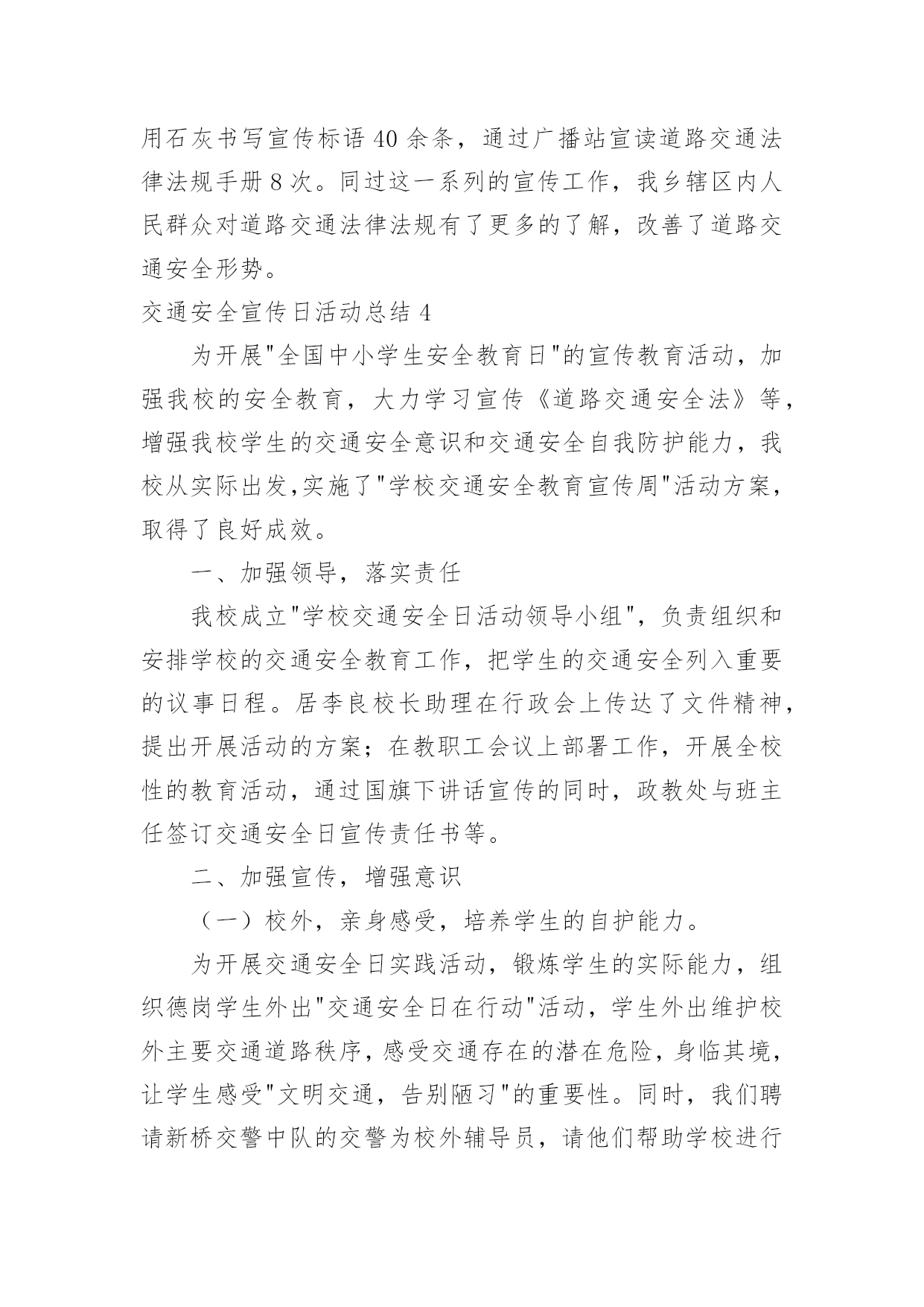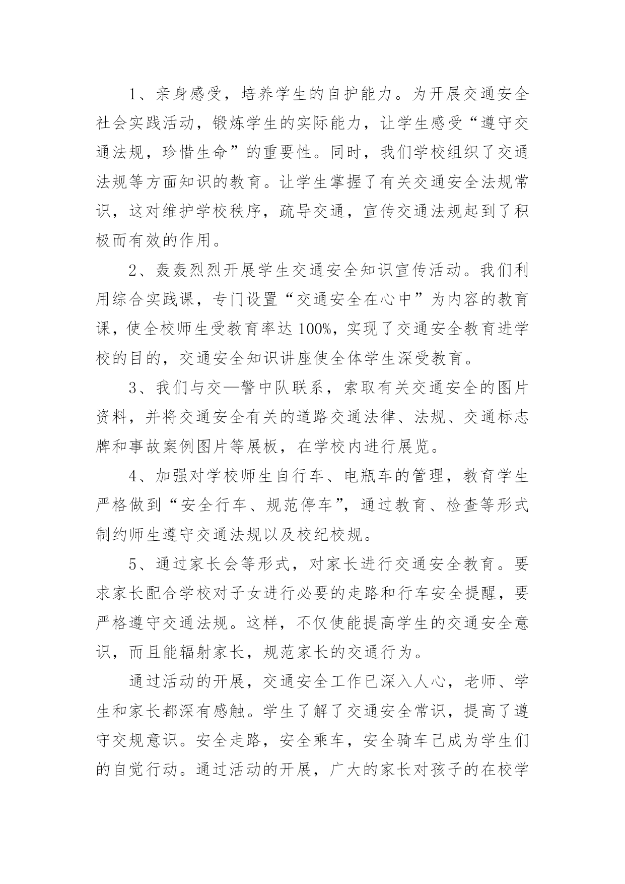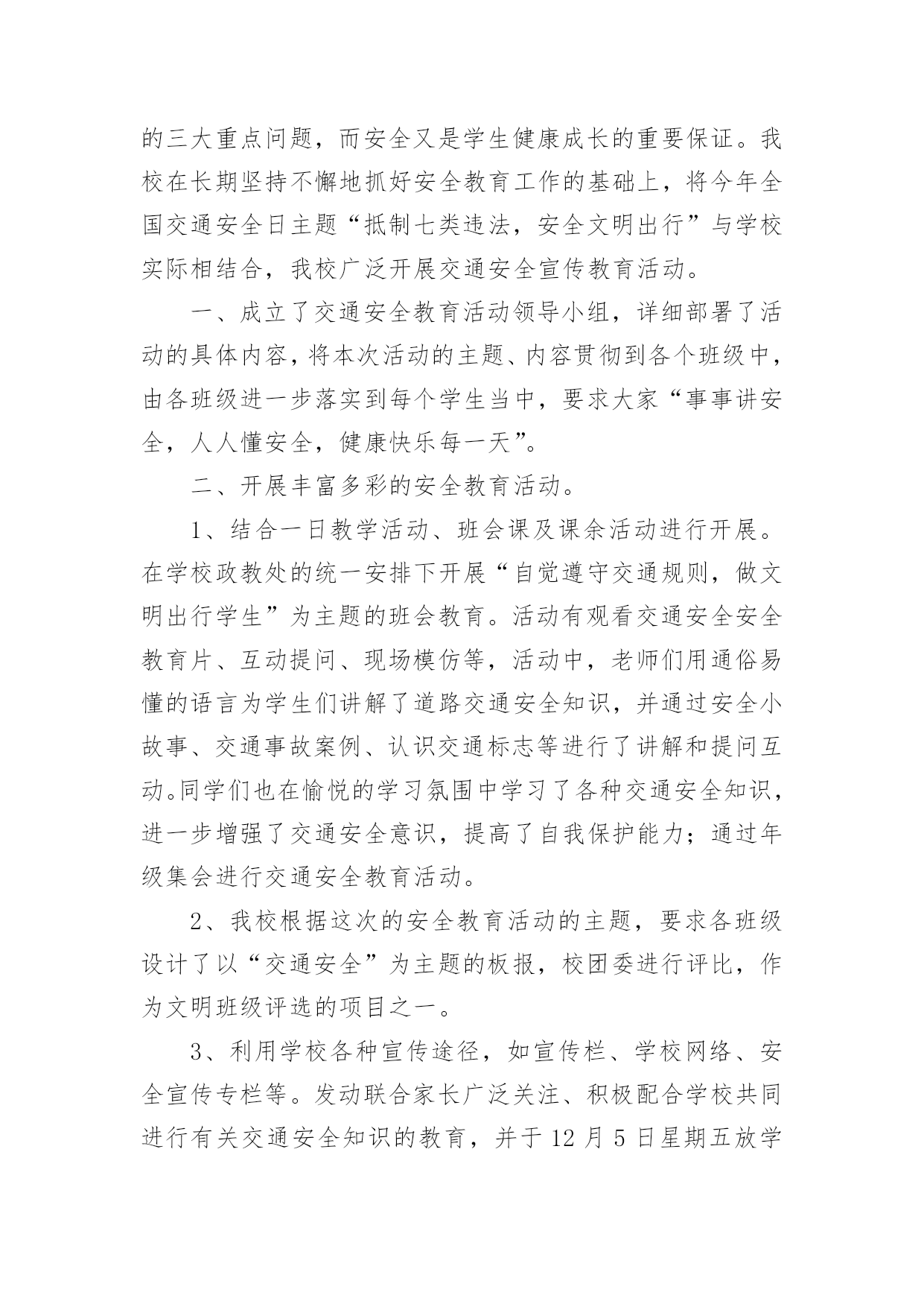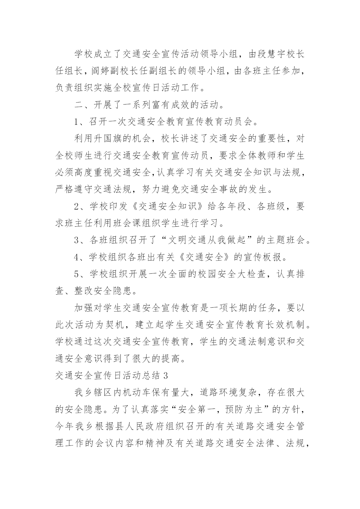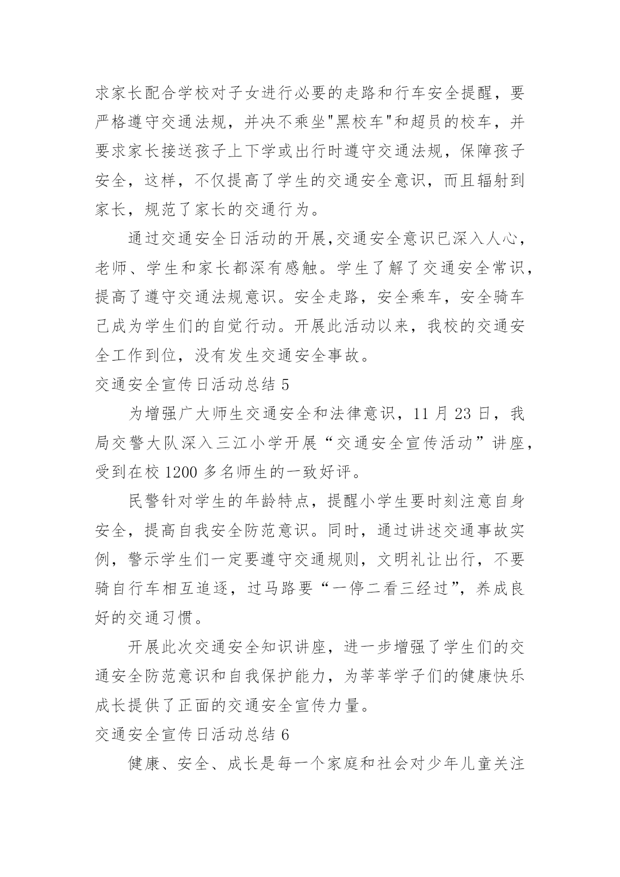 交通安全宣传日活动总结交通安全宣传日活动总结总结是对取得的成绩、存在的问题及得到的经验和教训等方面情况进行评价与描述的一种书面材料,它能使我们及时找出错误并改正,快快来写一份总结吧。那么我们该怎么去写总结呢?以下是小编精心整理的交通安全宣传日活动总结,希望能够帮助到大家。交通安全宣传日活动总结1根据上级要求,我校把交通安全教育活动作为校安的重要工作来抓,切实加强对学生交通法规教育,增强学生交通安全意识,确保学生交通安全。通过开展了丰富多彩的宣传教育活动,为提高师生的交通安全知识、增强道路交通安全意识提供了保障,取得了较好的效果。一、加强领导,落实责任。为保证活动长期有序地开展,我校成立了“学校交通安全教育领导小组”,负责组织和安排学校的交通安全教育工作,把学生的交通安全教育列入重要的议事日程。有关负责人多次召集召开专题会,商讨学生交通安全工作落实情况,确保学生的交通安全。二、加强宣传,增强意识。精心组织开展交通安全知识的宣传教育活动。1、亲身感受,培养学生的自护能力。为开展交通安全社会实践活动,锻炼学生的实际能力,让学生感受“遵守交通法规,珍惜生命”的重要性。同时,我们学校组织了交通法规等方面知识的教育。让学生掌握了有关交通安全法规常识,这对维护学校秩序,疏导交通,宣传交通法规起到了积极而有效的作用。2、轰轰烈烈开展学生交通安全知识宣传活动。我们利用综合实践课,专门设置“交通安全在心中”为内容的教育课,使全校师生受教育率达100%,实现了交通安全教育进学校的目的,交通安全知识讲座使全体学生深受教育。3、我们与交—警中队联系,索取有关交通安全的图片资料,并将交通安全有关的道路交通法律、法规、交通标志牌和事故案例图片等展板,在学校内进行展览。4、加强对学校师生自行车、电瓶车的管理,教育学生严格做到“安全行车、规范停车”,通过教育、检查等形式制约师生遵守交通法规以及校纪校规。5、通过家长会等形式,对家长进行交通安全教育。要求家长配合学校对子女进行必要的走路和行车安全提醒,要严格遵守交通法规。这样,不仅使能提高学生的交通安全意识,而且能辐射家长,规范家长的交通行为。通过活动的开展,交通安全工作已深入人心,老师、学生和家长都深有感触。学生了解了交通安全常识,提高了遵守交规意识。安全走路,安全乘车,安全骑车己成为学生们的自觉行动。通过活动的开展,广大的家长对孩子的在校学习感到放心,同时,社会对学校的满意程度有了较大提高。三、建立机制,巩固成果。提高学生交通安全法制意识是一项长期的任务,应当坚持集中教育与日常教育教学工作及各项社会实践活动有效结合,在长效机制建设上下功夫,以本次活动的成果,促进日常交通安全教育工作,为预防和减少道路交通事故发挥积极的作用。通过开展本次活动,使得全校学生参与本次活动活受教育率达到100%;学生交通安全法制常识知晓率达到95%以上;学生交通安全法制意识和自我防护能力明显提高;交通安全法律法规遵守率达到95%以上。我校交通安全教育始终贯彻“以人为本、安全第一”的方针,以“安全乘车、安全骑车、安全走路”养成教育为主要内容,以促进交通安全宣传“进学校”工作,集中开展多种形式和内容的小学生交通安全教育活动,营造全社会关注小学生交通安全的良好氛围,进一步提高了我校学生交通安全法制意识和自我防护能力,维护了学校正常教育教学秩序,保障和促进了青少年的健康成长。交通安全宣传日活动总结2为开展“全国中小学生安全教育日”的宣传教育活动,加强我校的安全教育,大力学习宣传《道路交通安全法》等,增强我校学生的交通安全意识和交通安全自我防护能力,我校从实际出发,开展了“学校交通安全教育宣传日”活动,取得了良好成效。一、成立了领导小组。学校成立了交通安全宣传活动领导小组,由段慧宇校长任组长,阎婷副校长任副组长的领导小组,由各班主任参加,负责组织实施全校宣传日活动工作。二、开展了一系列富有成效的活动。1、召开一次交通安全教育宣传教育动员会。利用升国旗的机会,校长讲述了交通安全的重要性,对全校师生进行交通安全教育宣传动员,要求全体教师和学生必须高度重视交通安全,认真学习有关交通安全知识与法规,严格遵守交通法规,努力避免交通安全事故的发生。2、学校印发《交通安全知识》给各年段、各班级,要求班主任利用班会课组织学生进行学习。3、各班组织召开了“文明交通从我做起”的主题班会。4、学校组织各班出有关《交通安全》的宣传板报。5、学校组织开展一次全面的校园安全大检查,认真排查、整改安全隐患。加强对学生交通安全宣传教育是一项长期的任务,要以此次活动为契机,建立起学生交通安全宣传教育长效机制。学校通过这次交通安全宣传教育,学生的交通法制意识和交通安全意识得到了很大的提高。交通安全宣传日活动总结3我乡辖区内机动车保有量大,道路环境复杂,存在很大的安全隐患。为了
