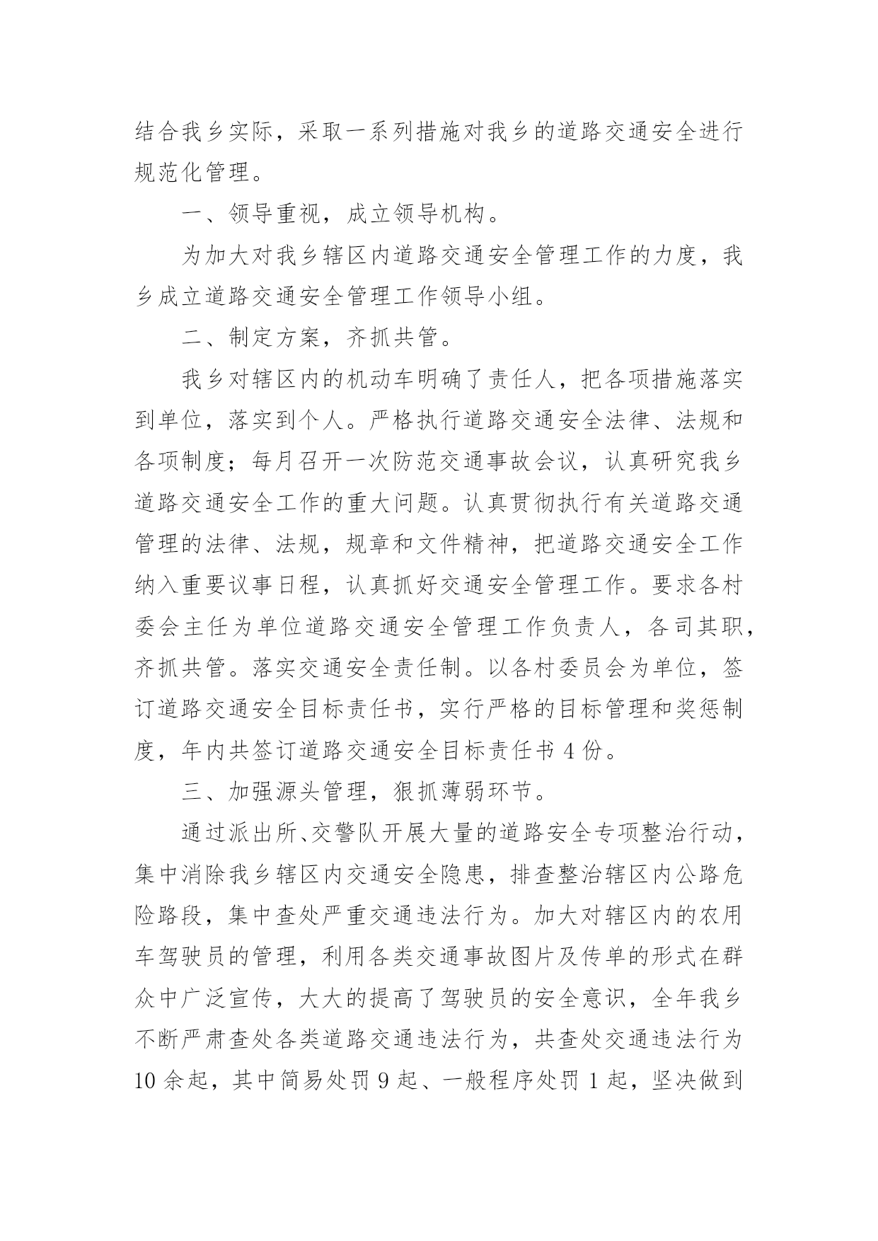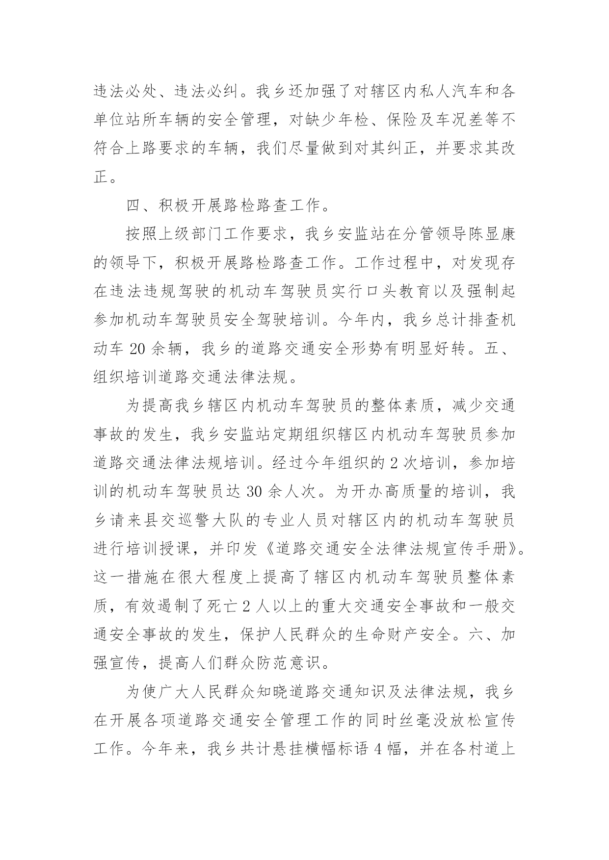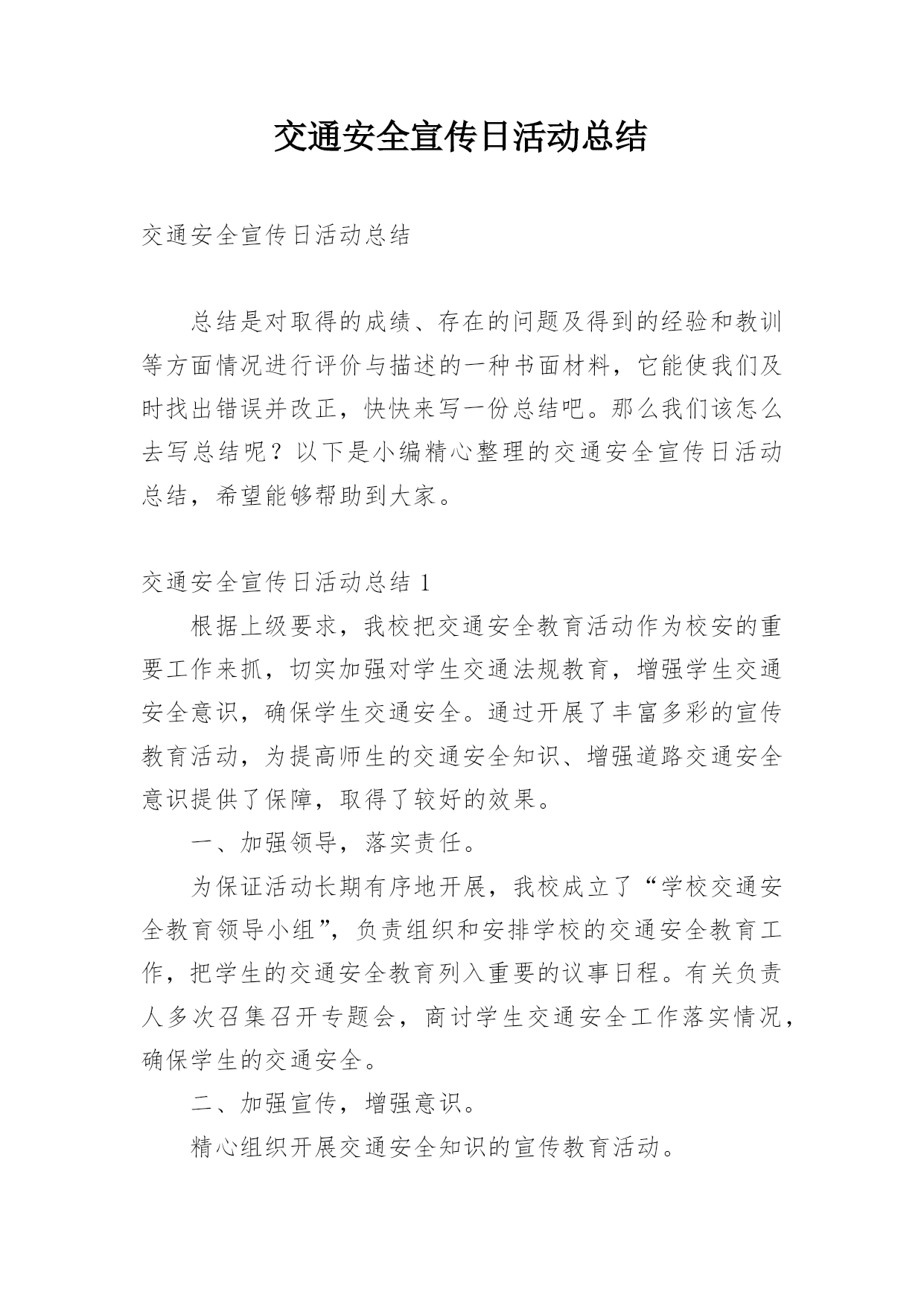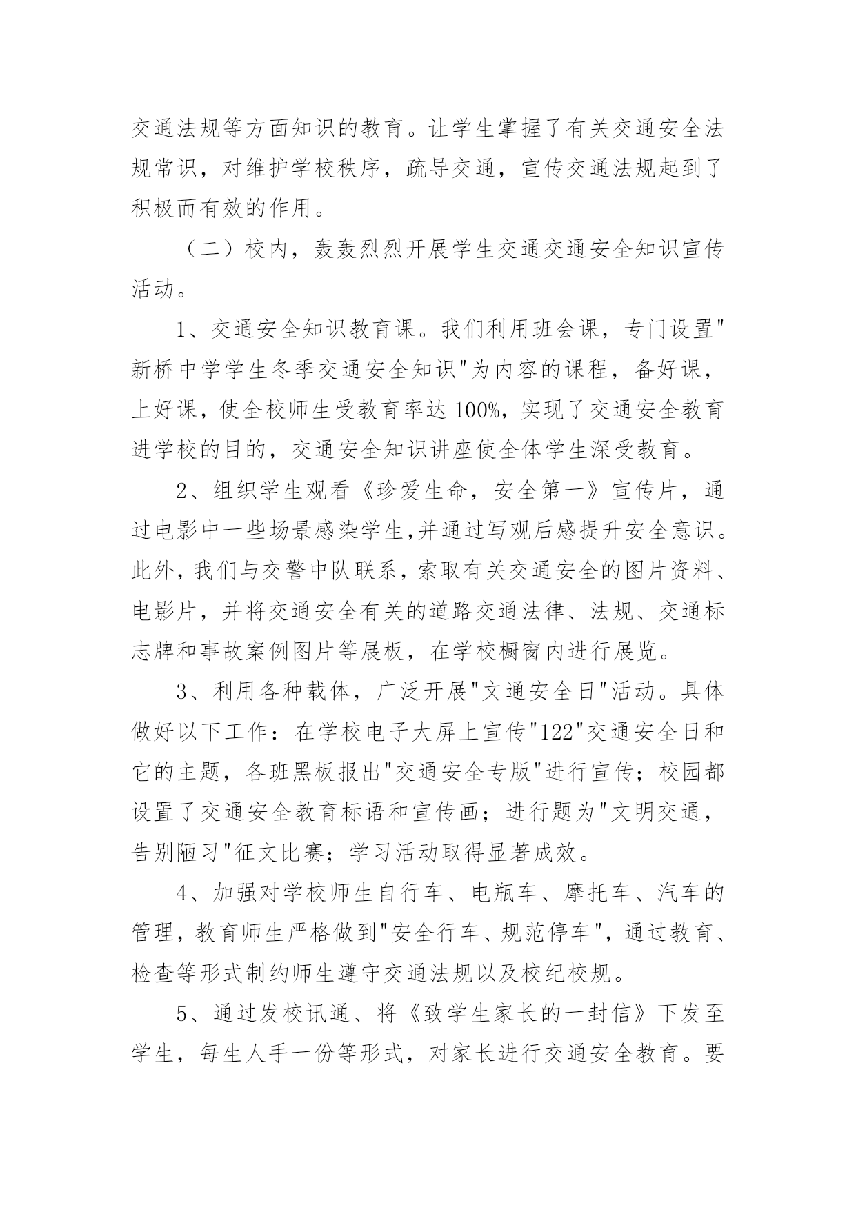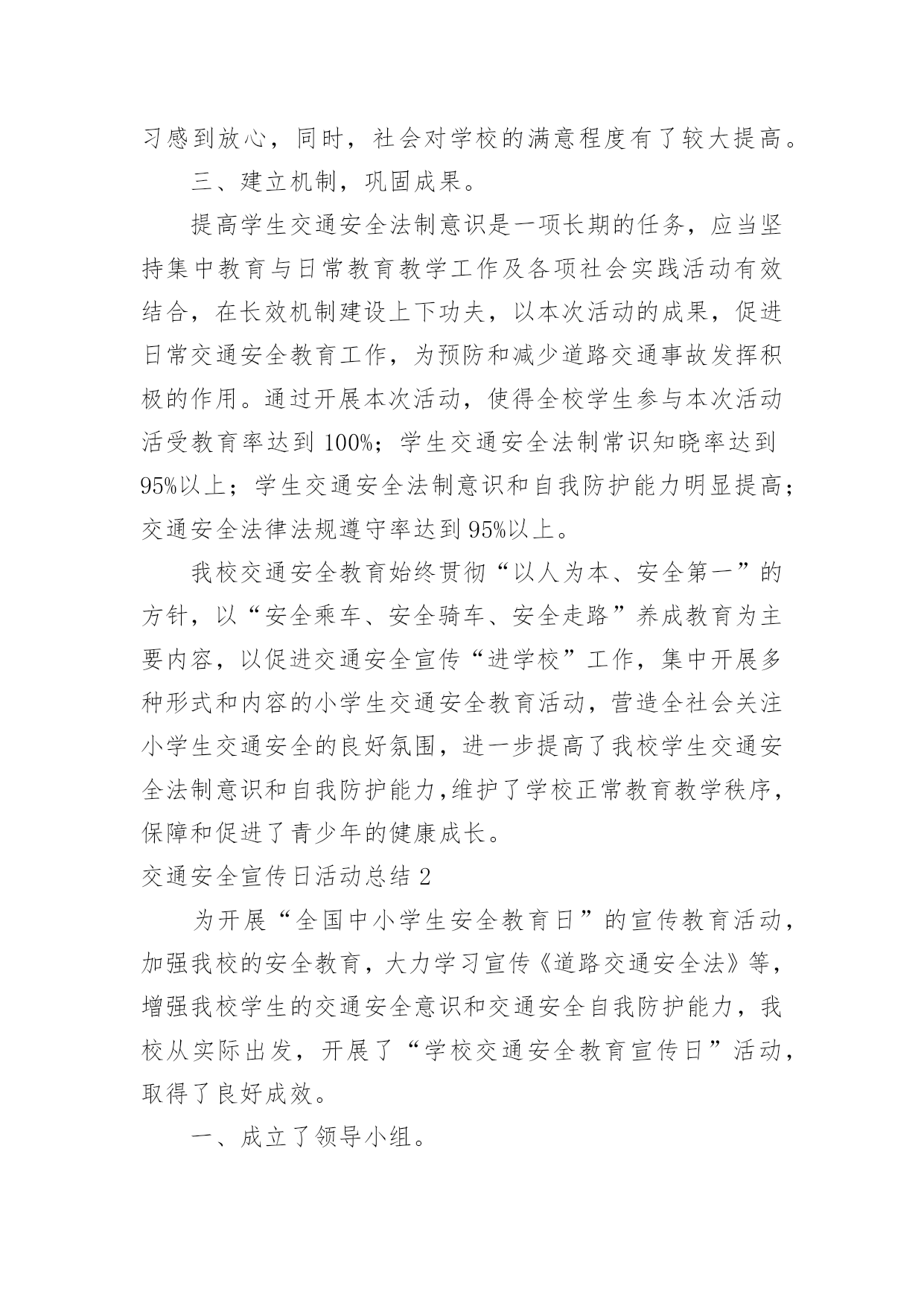 交通安全宣传日活动总结交通安全宣传日活动总结总结是对取得的成绩、存在的问题及得到的经验和教训等方面情况进行评价与描述的一种书面材料,它能使我们及时找出错误并改正,快快来写一份总结吧。那么我们该怎么去写总结呢?以下是小编精心整理的交通安全宣传日活动总结,希望能够帮助到大家。交通安全宣传日活动总结1根据上级要求,我校把交通安全教育活动作为校安的重要工作来抓,切实加强对学生交通法规教育,增强学生交通安全意识,确保学生交通安全。通过开展了丰富多彩的宣传教育活动,为提高师生的交通安全知识、增强道路交通安全意识提供了保障,取得了较好的效果。一、加强领导,落实责任。为保证活动长期有序地开展,我校成立了“学校交通安全教育领导小组”,负责组织和安排学校的交通安全教育工作,把学生的交通安全教育列入重要的议事日程。有关负责人多次召集召开专题会,商讨学生交通安全工作落实情况,确保学生的交通安全。二、加强宣传,增强意识。精心组织开展交通安全知识的宣传教育活动。1、亲身感受,培养学生的自护能力。为开展交通安全社会实践活动,锻炼学生的实际能力,让学生感受“遵守交通法规,珍惜生命”的重要性。同时,我们学校组织了交通法规等方面知识的教育。让学生掌握了有关交通安全法规常识,这对维护学校秩序,疏导交通,宣传交通法规起到了积极而有效的作用。2、轰轰烈烈开展学生交通安全知识宣传活动。我们利用综合实践课,专门设置“交通安全在心中”为内容的教育课,使全校师生受教育率达100%,实现了交通安全教育进学校的目的,交通安全知识讲座使全体学生深受教育。3、我们与交—警中队联系,索取有关交通安全的图片资料,并将交通安全有关的道路交通法律、法规、交通标志牌和事故案例图片等展板,在学校内进行展览。4、加强对学校师生自行车、电瓶车的管理,教育学生严格做到“安全行车、规范停车”,通过教育、检查等形式制约师生遵守交通法规以及校纪校规。5、通过家长会等形式,对家长进行交通安全教育。要求家长配合学校对子女进行必要的走路和行车安全提醒,要严格遵守交通法规。这样,不仅使能提高学生的交通安全意识,而且能辐射家长,规范家长的交通行为。通过活动的开展,交通安全工作已深入人心,老师、学生和家长都深有感触。学生了解了交通安全常识,提高了遵守交规意识。安全走路,安全乘车,安全骑车己成为学生们的自觉行动。通过活动的开展,广大的家长对孩子的在校学习感到放心,同时,社会对学校的满意程度有了较大提高。三、建立机制,巩固成果。提高学生交通安全法制意识是一项长期的任务,应当坚持集中教育与日常教育教学工作及各项社会实践活动有效结合,在长效机制建设上下功夫,以本次活动的成果,促进日常交通安全教育工作,为预防和减少道路交通事故发挥积极的作用。通过开展本次活动,使得全校学生参与本次活动活受教育率达到100%;学生交通安全法制常识知晓率达到95%以上;学生交通安全法制意识和自我防护能力明显提高;交通安全法律法规遵守率达到95%以上。我校交通安全教育始终贯彻“以人为本、安全第一”的方针,以“安全乘车、安全骑车、安全走路”养成教育为主要内容,以促进交通安全宣传“进学校”工作,集中开展多种形式和内容的小学生交通安全教育活动,营造全社会关注小学生交通安全的良好氛围,进一步提高了我校学生交通安全法制意识和自我防护能力,维护了学校正常教育教学秩序,保障和促进了青少年的健康成长。交通安全宣传日活动总结2为开展“全国中小学生安全教育日”的宣传教育活动,加强我校的安全教育,大力学习宣传《道路交通安全法》等,增强我校学生的交通安全意识和交通安全自我防护能力,我校从实际出发,开展了“学校交通安全教育宣传日”活动,取得了良好成效。一、成立了领导小组。学校成立了交通安全宣传活动领导小组,由段慧宇校长任组长,阎婷副校长任副组长的领导小组,由各班主任参加,负责组织实施全校宣传日活动工作。二、开展了一系列富有成效的活动。1、召开一次交通安全教育宣传教育动员会。利用升国旗的机会,校长讲述了交通安全的重要性,对全校师生进行交通安全教育宣传动员,要求全体教师和学生必须高度重视交通安全,认真学习有关交通安全知识与法规,严格遵守交通法规,努力避免交通安全事故的发生。2、学校印发《交通安全知识》给各年段、各班级,要求班主任利用班会课组织学生进行学习。3、各班组织召开了“文明交通从我做起”的主题班会。4、学校组织各班出有关《交通安全》的宣传板报。5、学校组织开展一次全面的校园安全大检查,认真排查、整改安全隐患。加强对学生交通安全宣传教育是一项长期的任务,要以此次活动为契机,建立起学生交通安全宣传教育长效机制。学校通过这次交通安全宣传教育,学生的交通法制意识和交通安全意识得到了很大的提高。交通安全宣传日活动总结3我乡辖区内机动车保有量大,道路环境复杂,存在很大的安全隐患。为了