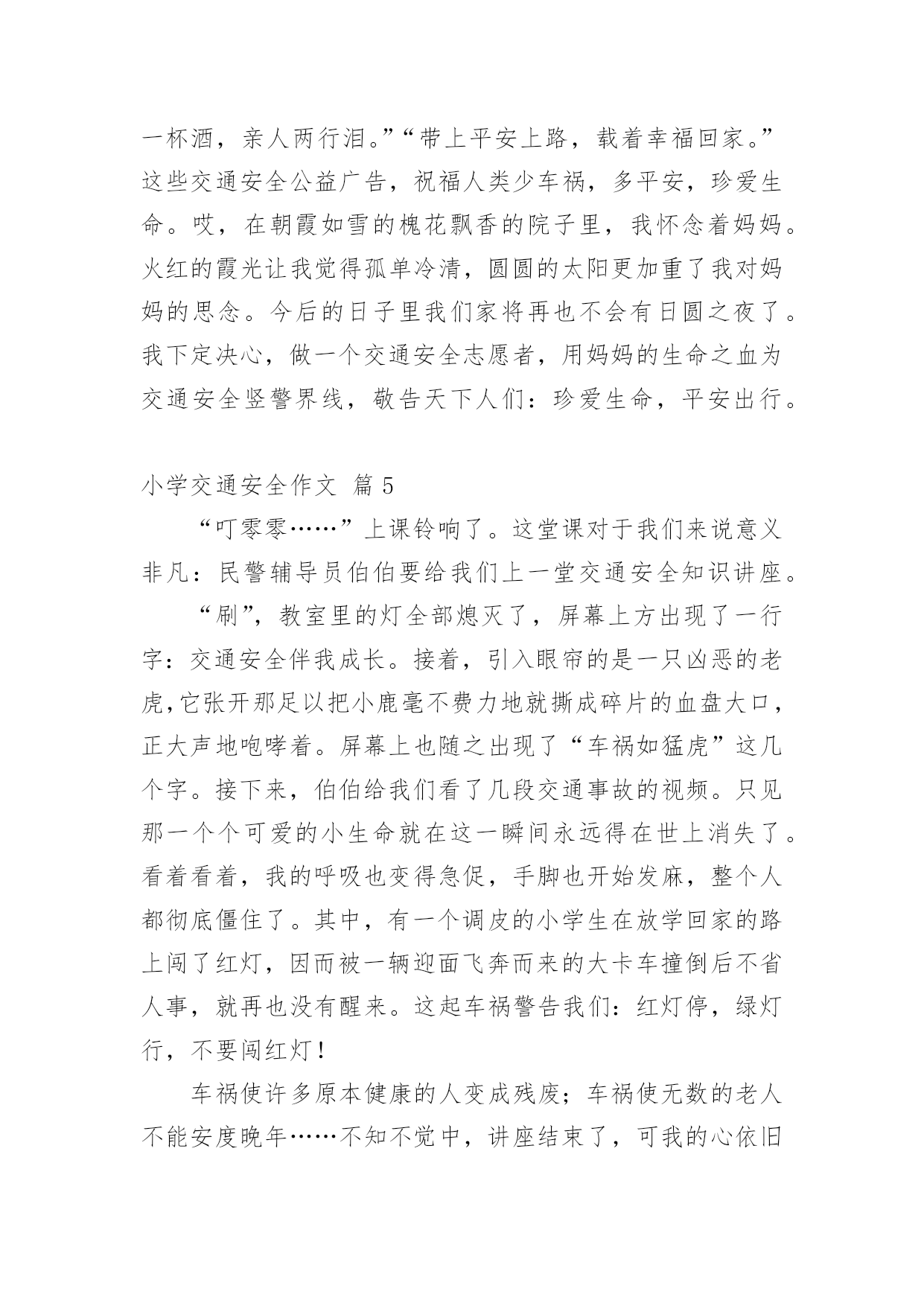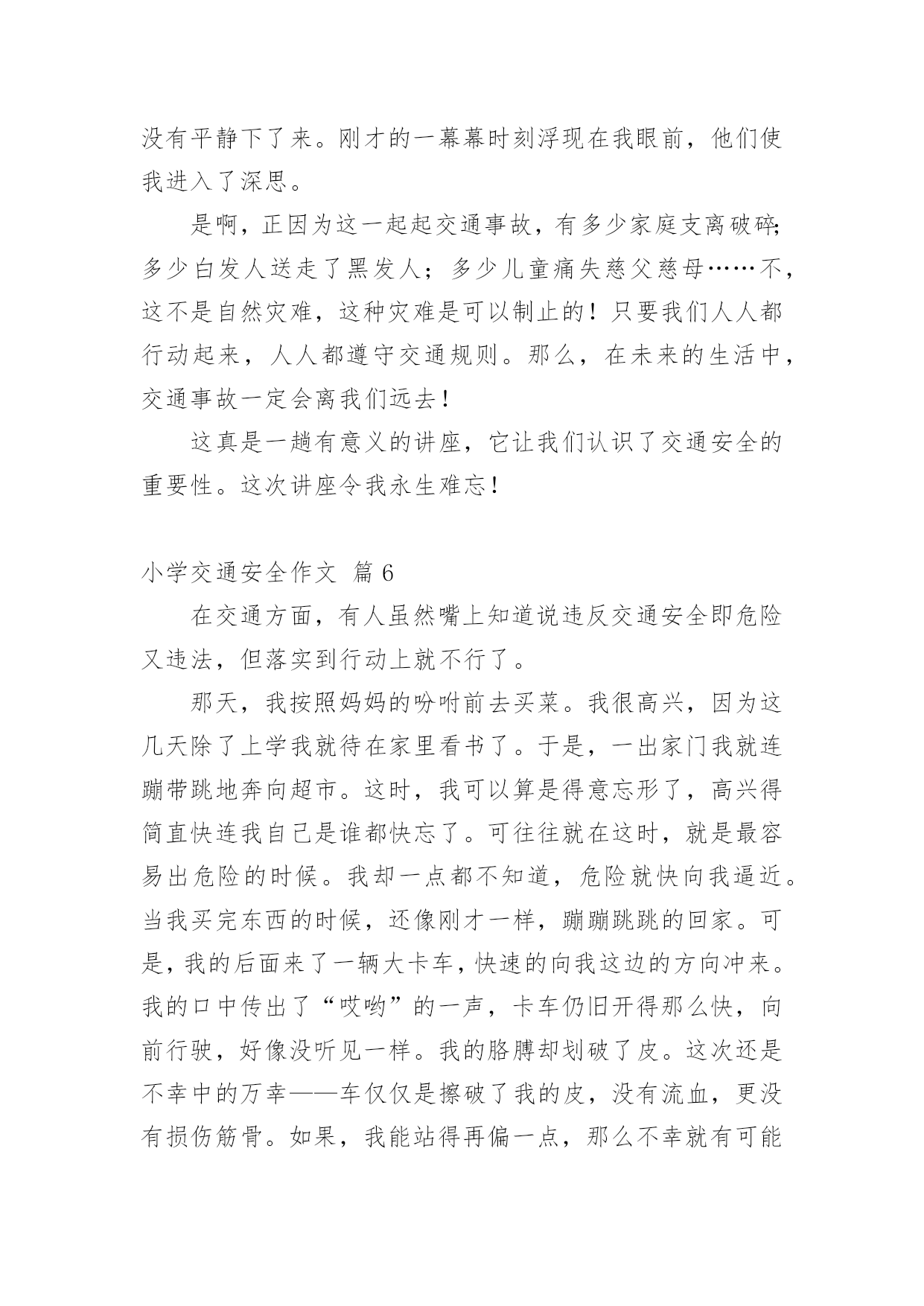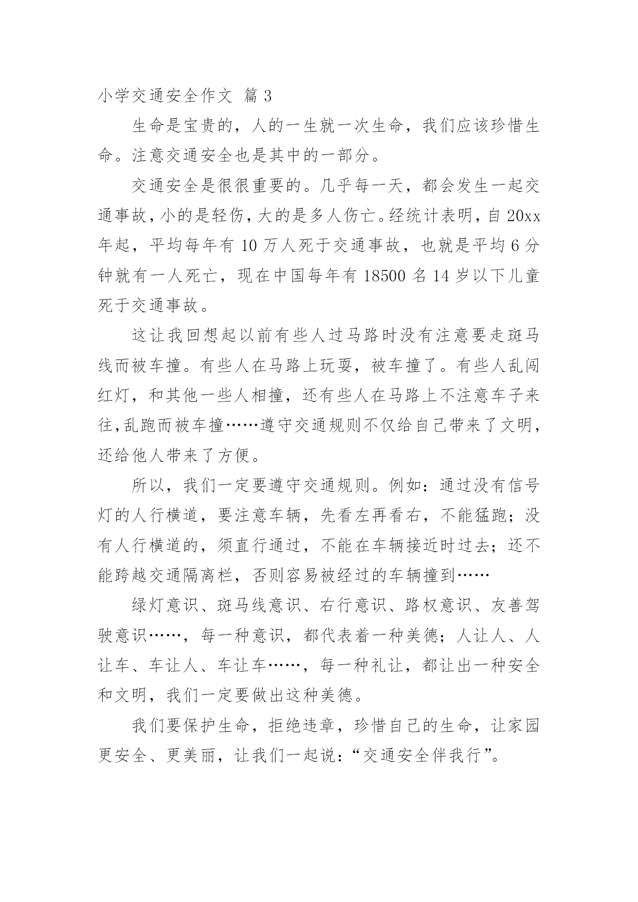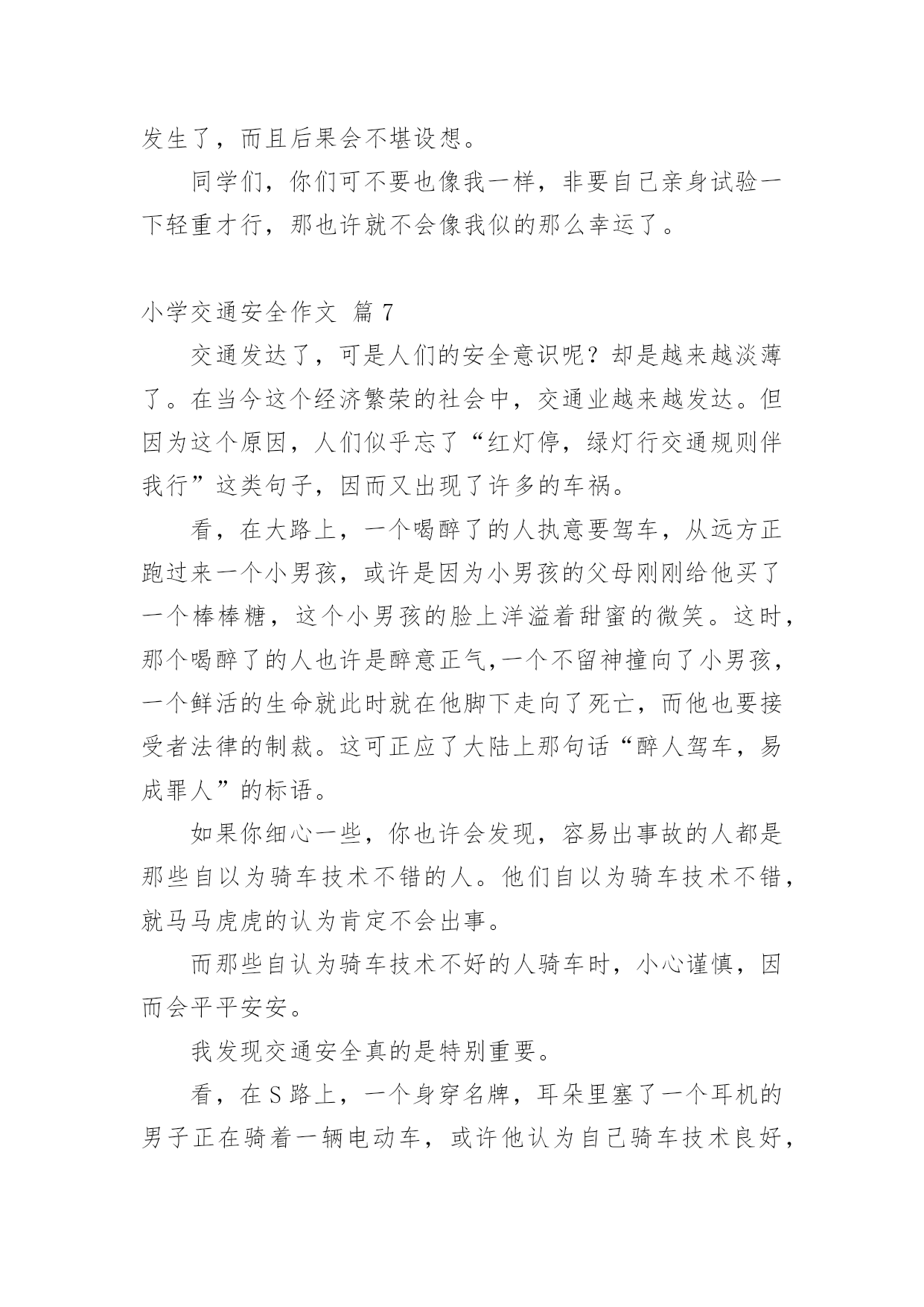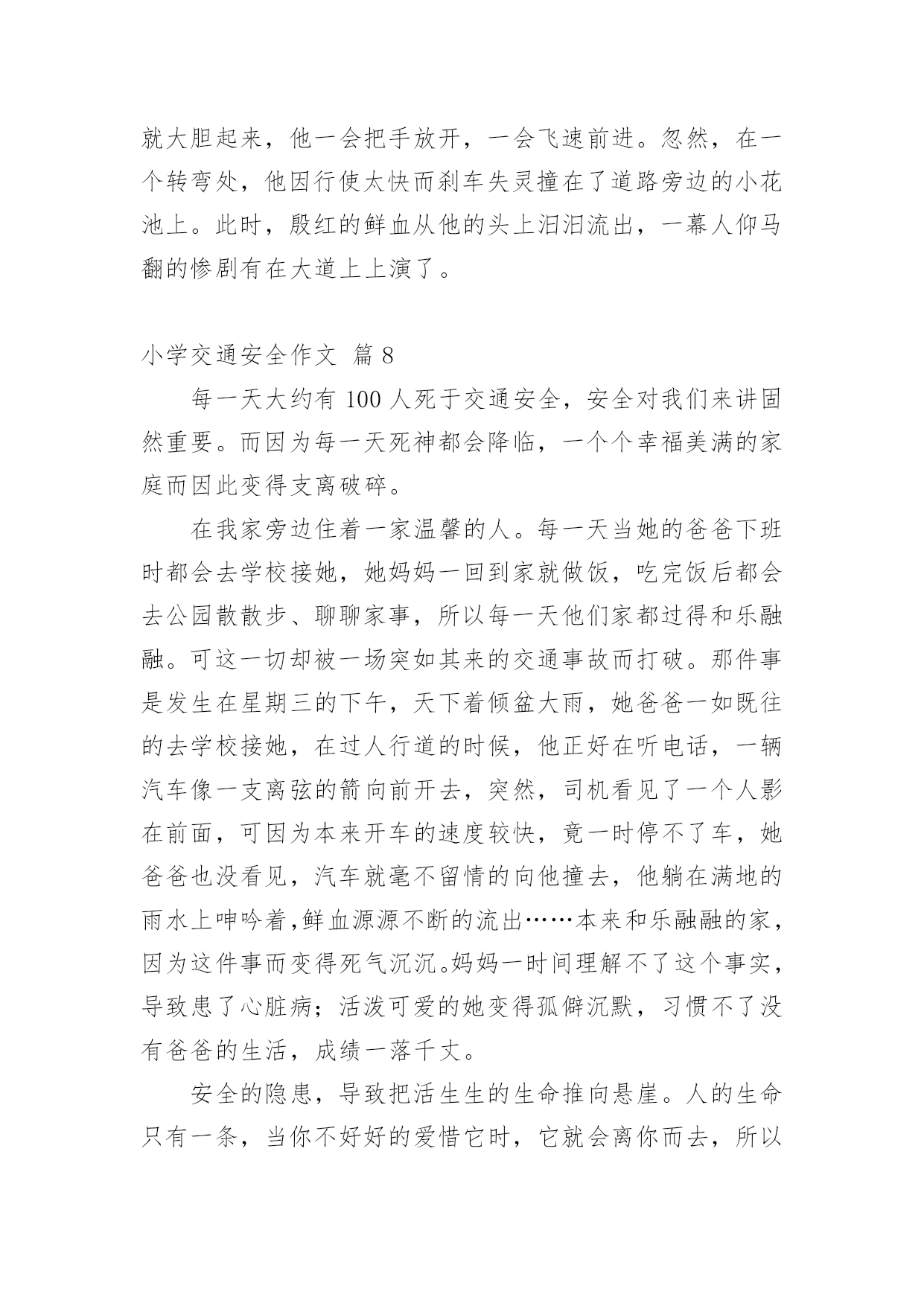 小学交通安全作文【必备】小学交通安全作文汇总八篇在生活、工作和学习中,大家都写过作文,肯定对各类作文都很熟悉吧,根据写作命题的特点,作文可以分为命题作文和非命题作文。怎么写作文才能避免踩雷呢?下面是小编精心整理的小学交通安全作文8篇,仅供参考,希望能够帮助到大家。小学交通安全作文篇1游戏结束了,可以重来;花谢了,可以再开;那生命呢?每天有多少条生命丧生在车轮之下呀!他们还能复活吗?不,生命只有一次,我们若不好好珍惜,一旦失去了,就永远不能复得了。可是,尽管生命是这样的珍贵,每天都依然有一幕幕交通事故的悲剧在上演着。有时是因为一时疏忽,有时是因为不遵守交通规则……但不论是什么原因,最后都是造成有人非死则伤,铸成了不可挽回、后悔终生的大错。俗话说的好:“一失足成千古恨”呀!现在,交通事故日益增加,日益严重,这多半是由于人们不遵守交通规则而引起的。就拿我们斗门来说吧,一起起重大交通事故的发生让人触目惊心!许多幸存的人都十分后悔,可是许多事都已经不能挽回了,毕竟世上没有后悔药可吃啊!其实,只要大家每时每刻都提起十二分精神来,就能避免许多悲剧的发生了。然而,有了这么多血一般的教训后,依然有人不遵守交通规则,让悲剧再次发生。更让人痛心的是,有时就因为某些人的“疏忽”或“不遵守交通规则”,就让一些遵守交通规则的人无辜地送上一条生命了,这是多么的可惜呀!不遵守交通规则,是要付出惨痛的代价的。我最怕听到救护车、警车驶过的声音,因为我知道,这种声音响起一次,就意味着有人发生事故。而且照现在人们对交通安全的重视程度来看,发生交通事故的可能性较大。让我们敲响警钟吧!不要再让这种害人害己的事儿发生了。只有这样,斗门才会更安全,我们的祖国才会更美好,社会才会真正的和平、幸福。小学交通安全作文篇2交通事故时时刻刻都会发生,它就像颗威力十足的炸药,一时大意,这颗埋伏在我们生活中的炸弹就会爆炸,炸的家庭破碎,炸得人心悲苦。安全,随时随地保护这我们。最近,“中国式过马路”传的沸沸扬扬,因“中国式过马路”引起的交通事故也不计其数。所谓的“中国式过马路”就是凑一撮人就可以走,与红绿灯无关。我原认为在诏安不会有这种事发生,大家都遵守交通规则。然而,就在昨天下午放学时,触目惊心的一幕发生了:我放学时间是这时也是下班的高峰期。我正要过十字街口的时候,我发现绿灯还没亮,就站在指示灯下面等。这时,我发现许多人没等绿灯亮,只是看看左右没来车,凑一撮人急匆匆地走了。我心想:我原认为诏安不会有人用“中国式过马路”的。一看,有这么多人,真是没素质。突然,“砰”的一声巨响,眼前的一幕把我惊呆了:这撮中笑着一个跟我一样大的小学生,他一边过马路,还一边玩着悠悠球。突然,一辆大卡车疾驰而来,旁的人快速的躲闪,躲闪过后还一直拍着自己的胸前,好想在说:想这样过马路,也需要很大的勇气哪!当大卡车驶到那个小学生面前时,他只顾着玩悠悠球,没注意到,大卡车的司机来不及刹车,重重地地把那个小学生撞倒在地。很多人纷纷围了过去。人们的惊呼声,喊叫声,悲叹声,响成一片,我看着躺在地上那个血肉模糊的身躯,吓得灵魂出壳了。周围的打人赶紧打了110和120。直到救护车赶到,围观的人才慢慢散去,我却呆若木鸡地站在那儿,看着地上的一滩红色。那红色是那么抢眼,那红色好像在诉说着一个悲剧,诉说着一个血的教训……据统计,仅仅在我们诏安每月因“中国式过马路”引起的交通事故就高达十起。有多少个生命受到伤害。由此可见,交通事故随时随地都可能发生,交通安全隐患时刻跟随着我们。作为学生,我们更应该遵守交通法规,拒绝“中国式过马路”,为了自己以及他人的安全。车让人,让出一份文明;人让车,让出一份安全;车让车,让出一份秩序;人让人,让出一份和谐。让我们一起自觉遵守交通规则,分享交通文明的快乐吧!小学交通安全作文篇3生命是宝贵的,人的一生就一次生命,我们应该珍惜生命。注意交通安全也是其中的一部分。交通安全是很很重要的。几乎每一天,都会发生一起交通事故,小的是轻伤,大的是多人伤亡。经统计表明,自20xx年起,平均每年有10万人死于交通事故,也就是平均6分钟就有一人死亡,现在中国每年有18500名14岁以下儿童死于交通事故。这让我回想起以前有些人过马路时没有注意要走斑马线而被车撞。有些人在马路上玩耍,被车撞了。有些人乱闯红灯,和其他一些人相撞,还有些人在马路上不注意车子来往,乱跑而被车撞……遵守交通规则不仅给自己带来了文明,还给他人带来了方便。所以,我们一定要遵守交通规则。例如:通过没有信号灯的人行横道,要注意车辆,先看左再看右,不能猛跑;没有人行横道的,须直行通过,不能在车辆接近时过去;还不能跨越交通隔离栏,否则容易被经过的车辆撞到……绿灯意识、斑马线意识、右行意识、路权意识、友善驾驶意识……,每一种意识,都代表着一种美德;人让人、人让车、