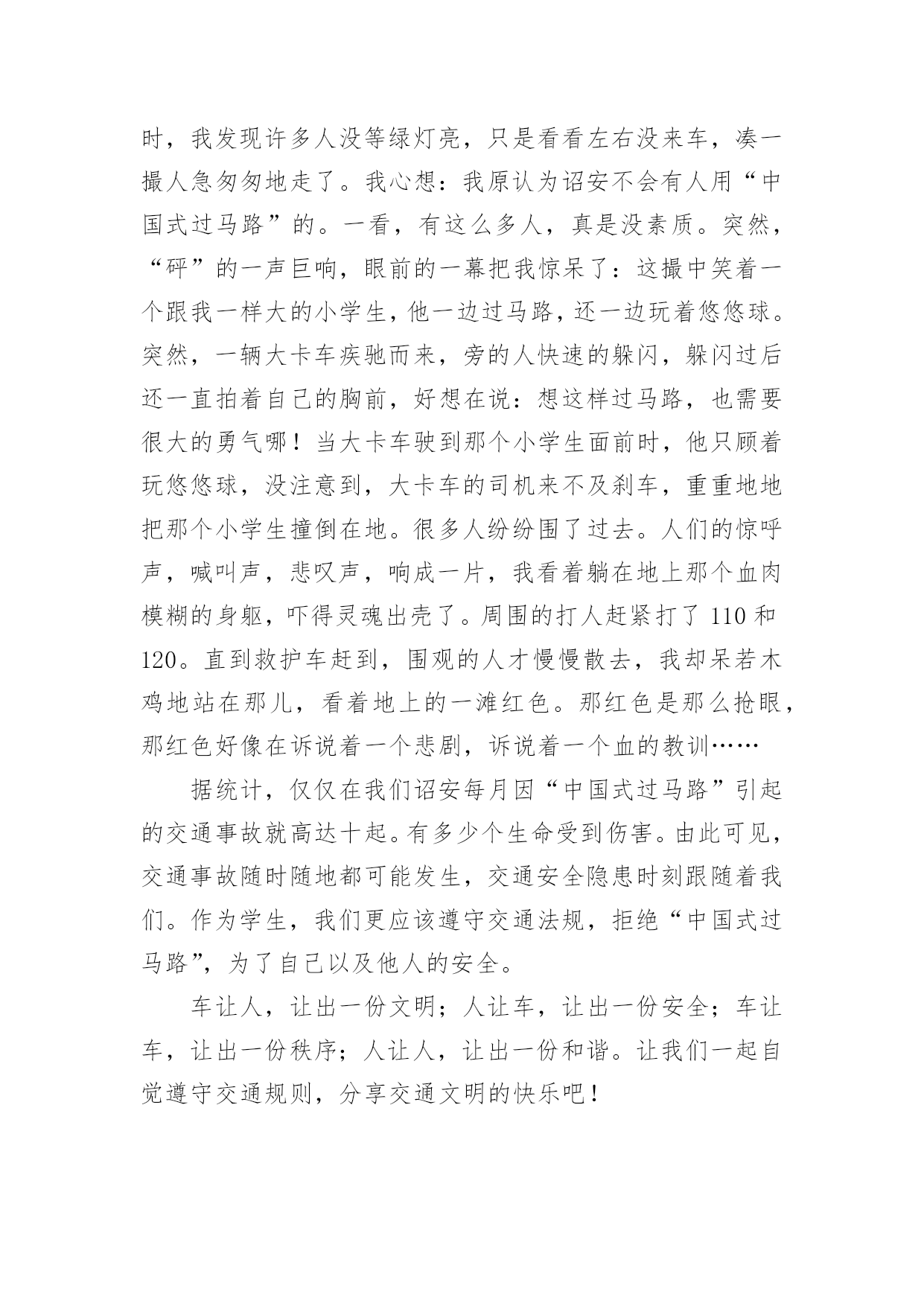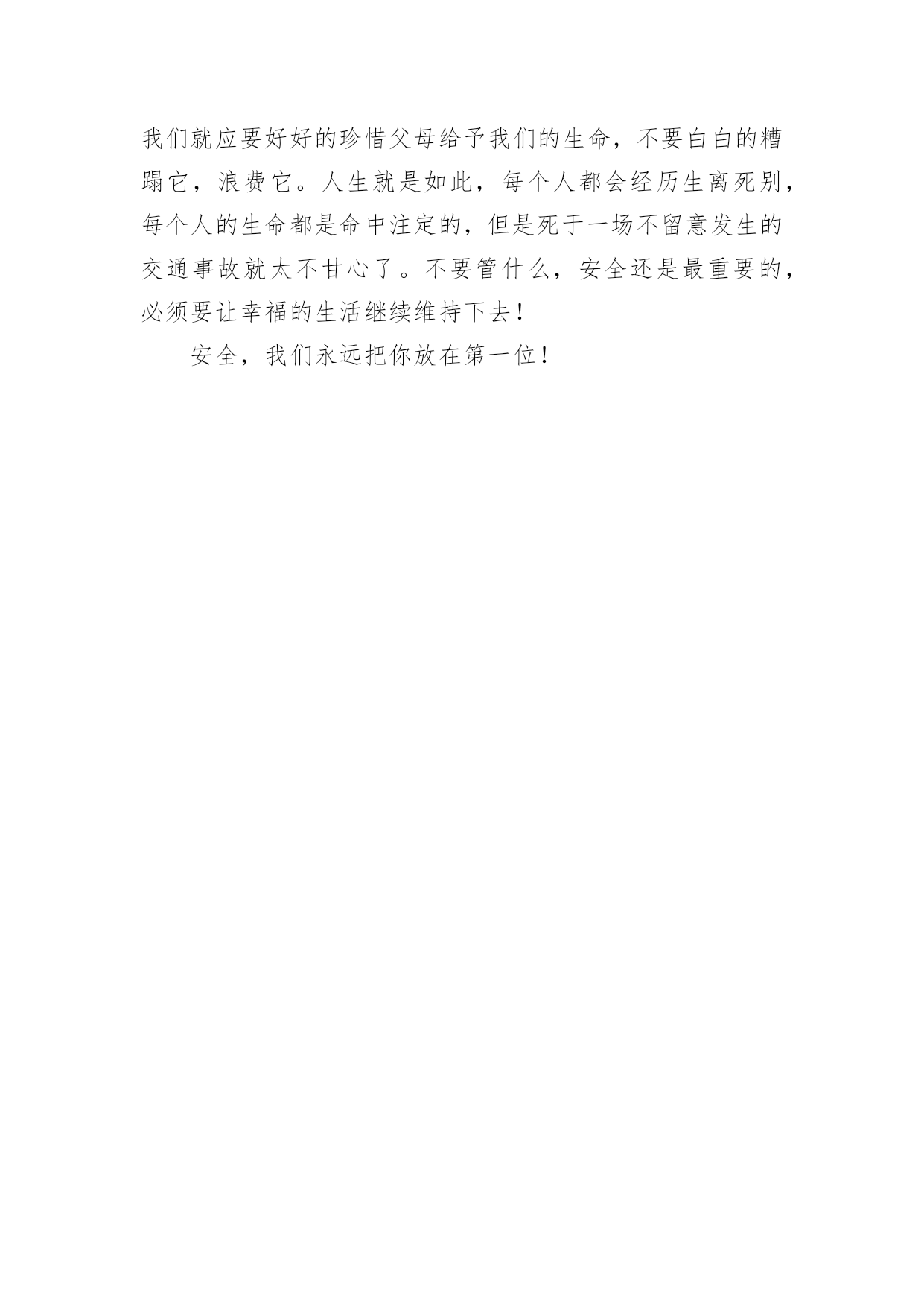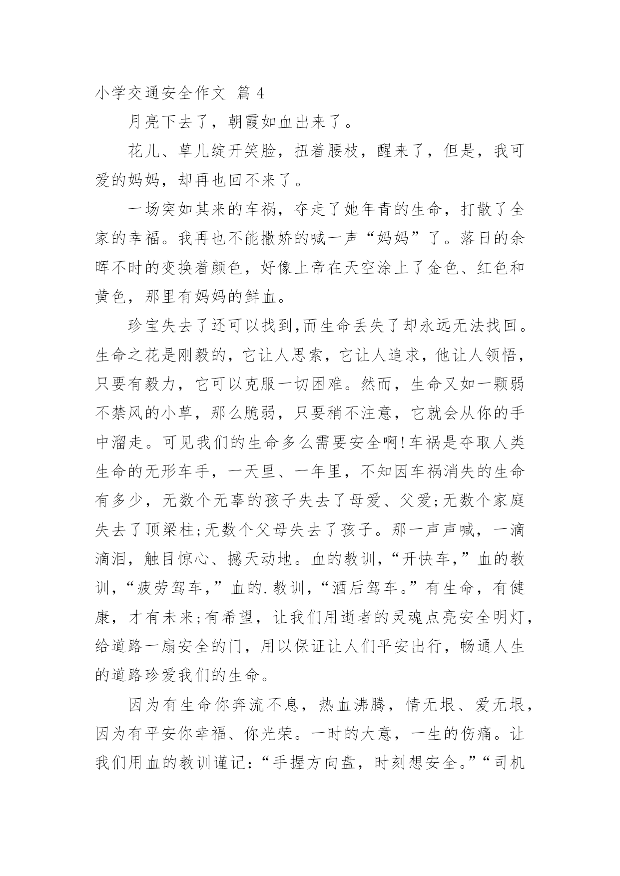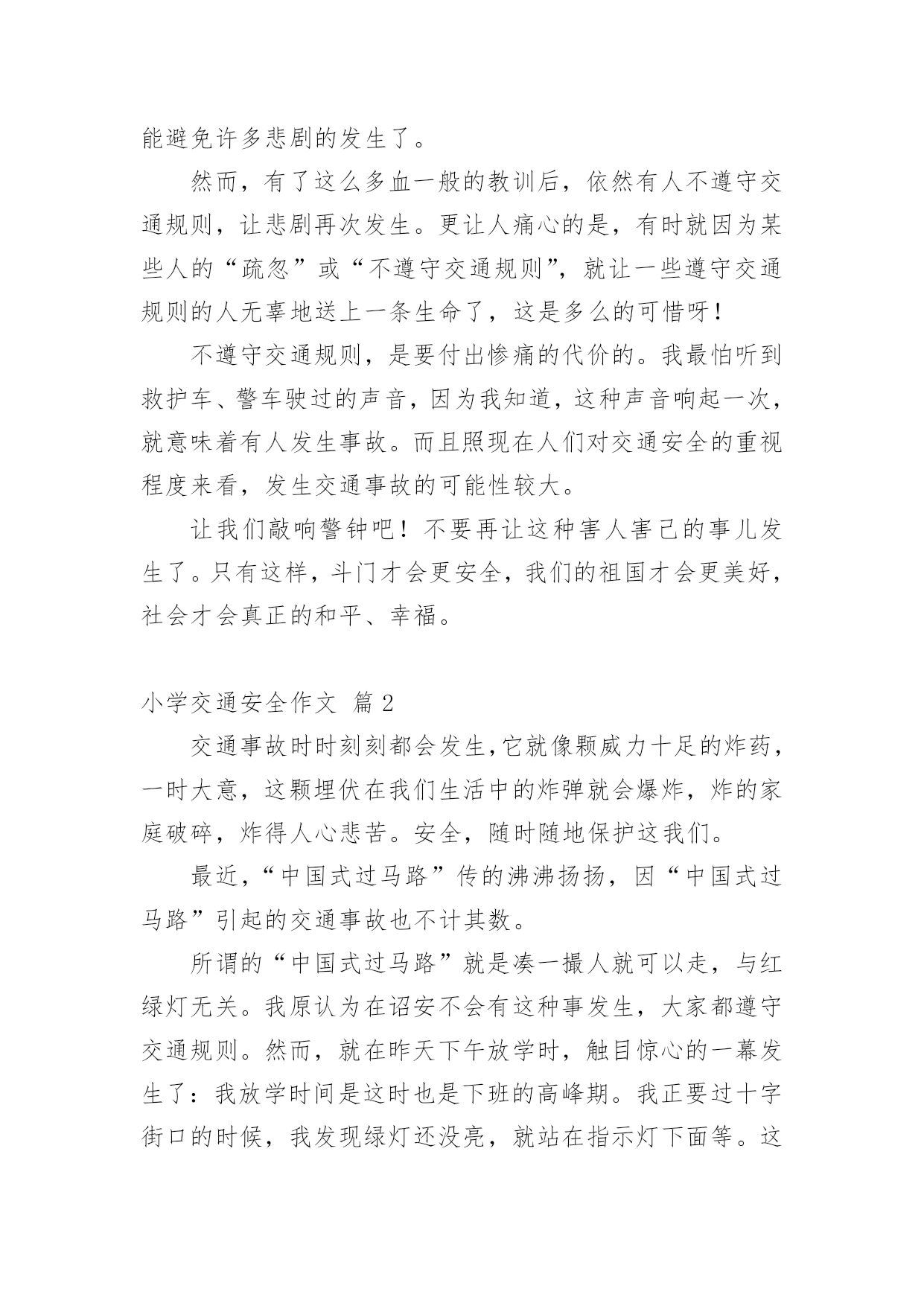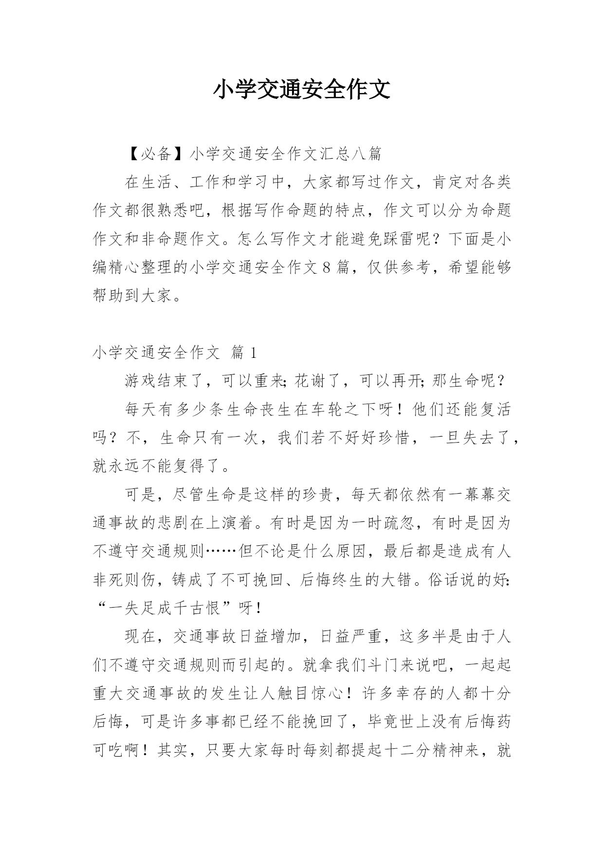 小学交通安全作文【必备】小学交通安全作文汇总八篇在生活、工作和学习中,大家都写过作文,肯定对各类作文都很熟悉吧,根据写作命题的特点,作文可以分为命题作文和非命题作文。怎么写作文才能避免踩雷呢?下面是小编精心整理的小学交通安全作文8篇,仅供参考,希望能够帮助到大家。小学交通安全作文篇1游戏结束了,可以重来;花谢了,可以再开;那生命呢?每天有多少条生命丧生在车轮之下呀!他们还能复活吗?不,生命只有一次,我们若不好好珍惜,一旦失去了,就永远不能复得了。可是,尽管生命是这样的珍贵,每天都依然有一幕幕交通事故的悲剧在上演着。有时是因为一时疏忽,有时是因为不遵守交通规则……但不论是什么原因,最后都是造成有人非死则伤,铸成了不可挽回、后悔终生的大错。俗话说的好:“一失足成千古恨”呀!现在,交通事故日益增加,日益严重,这多半是由于人们不遵守交通规则而引起的。就拿我们斗门来说吧,一起起重大交通事故的发生让人触目惊心!许多幸存的人都十分后悔,可是许多事都已经不能挽回了,毕竟世上没有后悔药可吃啊!其实,只要大家每时每刻都提起十二分精神来,就能避免许多悲剧的发生了。然而,有了这么多血一般的教训后,依然有人不遵守交通规则,让悲剧再次发生。更让人痛心的是,有时就因为某些人的“疏忽”或“不遵守交通规则”,就让一些遵守交通规则的人无辜地送上一条生命了,这是多么的可惜呀!不遵守交通规则,是要付出惨痛的代价的。我最怕听到救护车、警车驶过的声音,因为我知道,这种声音响起一次,就意味着有人发生事故。而且照现在人们对交通安全的重视程度来看,发生交通事故的可能性较大。让我们敲响警钟吧!不要再让这种害人害己的事儿发生了。只有这样,斗门才会更安全,我们的祖国才会更美好,社会才会真正的和平、幸福。小学交通安全作文篇2交通事故时时刻刻都会发生,它就像颗威力十足的炸药,一时大意,这颗埋伏在我们生活中的炸弹就会爆炸,炸的家庭破碎,炸得人心悲苦。安全,随时随地保护这我们。最近,“中国式过马路”传的沸沸扬扬,因“中国式过马路”引起的交通事故也不计其数。所谓的“中国式过马路”就是凑一撮人就可以走,与红绿灯无关。我原认为在诏安不会有这种事发生,大家都遵守交通规则。然而,就在昨天下午放学时,触目惊心的一幕发生了:我放学时间是这时也是下班的高峰期。我正要过十字街口的时候,我发现绿灯还没亮,就站在指示灯下面等。这时,我发现许多人没等绿灯亮,只是看看左右没来车,凑一撮人急匆匆地走了。我心想:我原认为诏安不会有人用“中国式过马路”的。一看,有这么多人,真是没素质。突然,“砰”的一声巨响,眼前的一幕把我惊呆了:这撮中笑着一个跟我一样大的小学生,他一边过马路,还一边玩着悠悠球。突然,一辆大卡车疾驰而来,旁的人快速的躲闪,躲闪过后还一直拍着自己的胸前,好想在说:想这样过马路,也需要很大的勇气哪!当大卡车驶到那个小学生面前时,他只顾着玩悠悠球,没注意到,大卡车的司机来不及刹车,重重地地把那个小学生撞倒在地。很多人纷纷围了过去。人们的惊呼声,喊叫声,悲叹声,响成一片,我看着躺在地上那个血肉模糊的身躯,吓得灵魂出壳了。周围的打人赶紧打了110和120。直到救护车赶到,围观的人才慢慢散去,我却呆若木鸡地站在那儿,看着地上的一滩红色。那红色是那么抢眼,那红色好像在诉说着一个悲剧,诉说着一个血的教训……据统计,仅仅在我们诏安每月因“中国式过马路”引起的交通事故就高达十起。有多少个生命受到伤害。由此可见,交通事故随时随地都可能发生,交通安全隐患时刻跟随着我们。作为学生,我们更应该遵守交通法规,拒绝“中国式过马路”,为了自己以及他人的安全。车让人,让出一份文明;人让车,让出一份安全;车让车,让出一份秩序;人让人,让出一份和谐。让我们一起自觉遵守交通规则,分享交通文明的快乐吧!小学交通安全作文篇3生命是宝贵的,人的一生就一次生命,我们应该珍惜生命。注意交通安全也是其中的一部分。交通安全是很很重要的。几乎每一天,都会发生一起交通事故,小的是轻伤,大的是多人伤亡。经统计表明,自20xx年起,平均每年有10万人死于交通事故,也就是平均6分钟就有一人死亡,现在中国每年有18500名14岁以下儿童死于交通事故。这让我回想起以前有些人过马路时没有注意要走斑马线而被车撞。有些人在马路上玩耍,被车撞了。有些人乱闯红灯,和其他一些人相撞,还有些人在马路上不注意车子来往,乱跑而被车撞……遵守交通规则不仅给自己带来了文明,还给他人带来了方便。所以,我们一定要遵守交通规则。例如:通过没有信号灯的人行横道,要注意车辆,先看左再看右,不能猛跑;没有人行横道的,须直行通过,不能在车辆接近时过去;还不能跨越交通隔离栏,否则容易被经过的车辆撞到……绿灯意识、斑马线意识、右行意识、路权意识、友善驾驶意识……,每一种意识,都代表着一种美德;人让人、人让车、