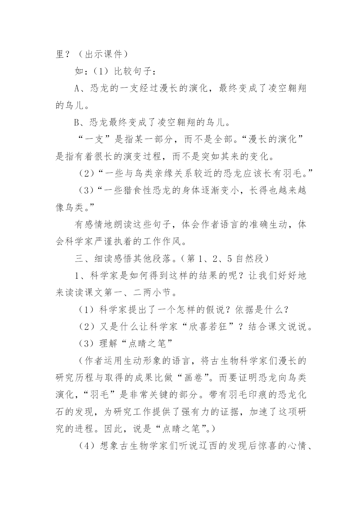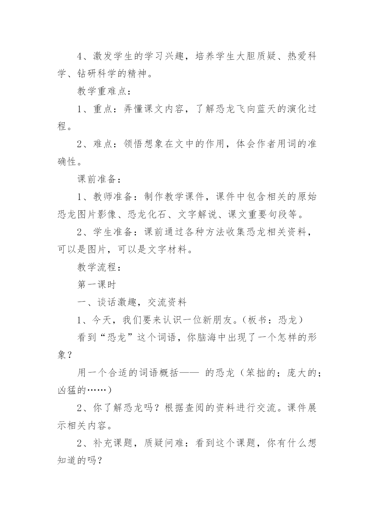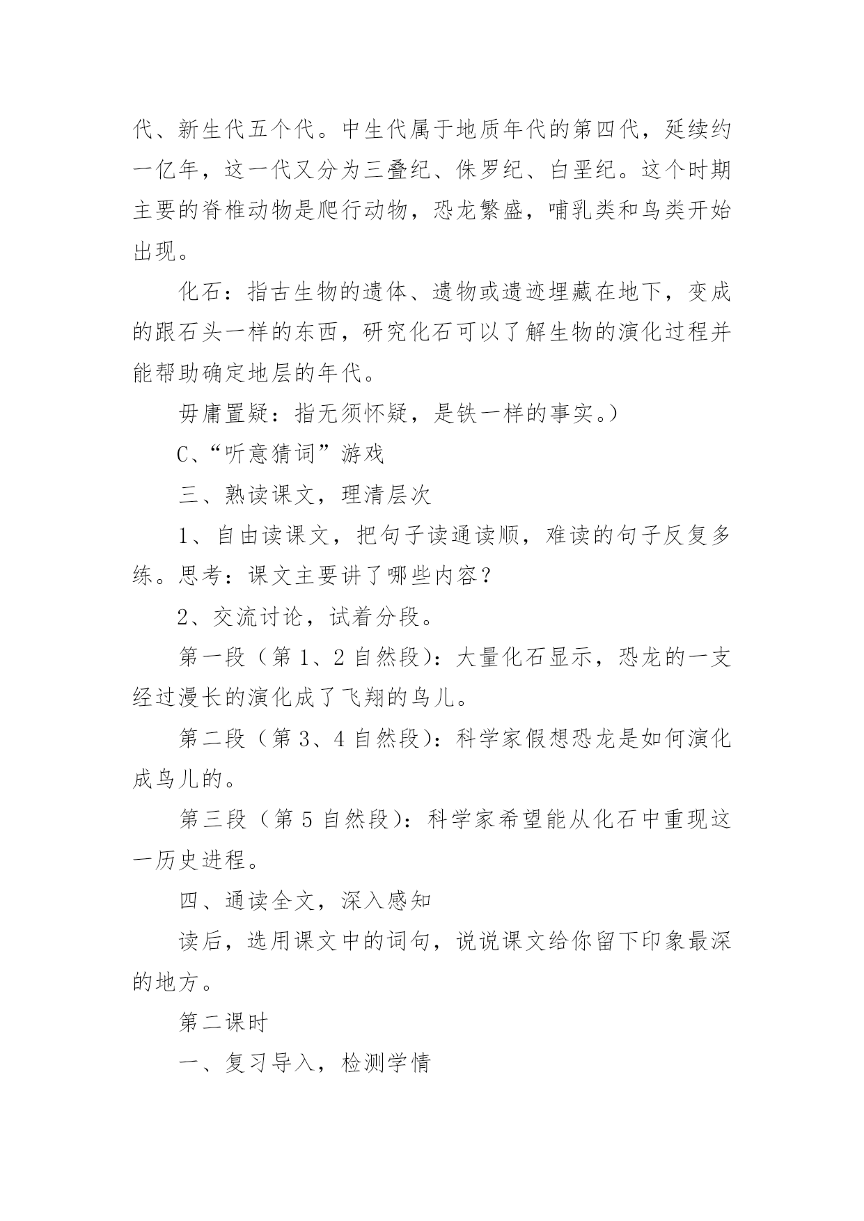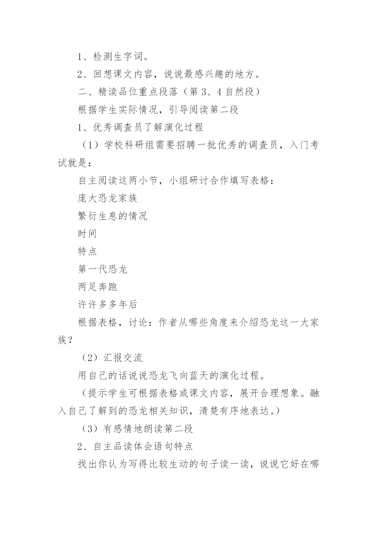 《恐龙》教学设计《恐龙》教学设计作为一名人民教师,常常需要准备教学设计,借助教学设计可以更好地组织教学活动。教学设计要怎么写呢?下面是小编整理的《恐龙》教学设计,希望能够帮助到大家。《恐龙》教学设计1设计意图:课堂以学生为主体,而“恐龙”是学生非常感兴趣的话题,文章从题目到内容都吸引着学生好奇心。因此,在设计中,我抓住这一学习契机,引导学生通过多渠道收集资料,以自主学习唤起学生浓厚学习兴趣,培养学生发现问题、解决问题的能力。阅读教学始终坚持“以读为本”。在设计中,我指导学生自主阅读、反复诵读,在语言实践中体会说明文中用词的正确生动,并在这过程中感悟积累语言、培养语感。教学目标:1、会认7个生字,会写13个生字。正确读写“恐龙、描绘、敏捷、欣喜若狂、形态各异”等词语。2、能体会准确生动的语言特点,正确、流利、有感情地朗读课文,背诵自己感兴趣的语段。3、练习有条理地复述恐龙飞向蓝天的演化过程,提高口头表达能力。4、激发学生的学习兴趣,培养学生大胆质疑、热爱科学、钻研科学的精神。教学重难点:1、重点:弄懂课文内容,了解恐龙飞向蓝天的演化过程。2、难点:领悟想象在文中的作用,体会作者用词的准确性。课前准备:1、教师准备:制作教学课件,课件中包含相关的原始恐龙图片影像、恐龙化石、文字解说、课文重要句段等。2、学生准备:课前通过各种方法收集恐龙相关资料,可以是图片,可以是文字材料。教学流程:第一课时一、谈话激趣,交流资料1、今天,我们要来认识一位新朋友。(板书:恐龙)看到“恐龙”这个词语,你脑海中出现了一个怎样的形象?用一个合适的词语概括——的恐龙(笨拙的;庞大的;凶猛的……)2、你了解恐龙吗?根据查阅的资料进行交流。课件展示相关内容。2、补充课题,质疑问难:看到这个课题,你有什么想知道的吗?(笨重恐龙怎么可能飞向蓝天的?恐龙和飞向蓝天的恐龙是一样的吗?他们之间有联系吗?……)二、初读课文,自学字词1、自由朗读课文,要求读正确,读通顺,读不好的地方多读几遍。2、再读课文,自学生字新词飞向蓝天的恐龙课文简说(1)借助拼音或工具书把生字词读准确,运用已学方法识字。教师巡视了解情况。(2)反馈交流,教师相机指导。出示词语:中生代化石演化凌空翱翔迟钝描绘毋庸置疑敏捷崭新脑颅骨骼鸟翼A、正音——崭翘舌音;“凌、恐、盈”后鼻音。注意字形,尤其是笔顺——捷;辨析“顿—吨”第四组:都指身体的.某个部位。B、有什么不理解的词语吗?预设:(中生代:大家都知道地球已经有46亿年的历史,按地层的年龄将地球的年龄划分成一些单位,人们习惯于以生物的情况来划分,这样就把整个46亿年划成两个大的单元,那些看不到或者很难见到生物的时代被称做隐生宙,而将可看到一定量生命以后的时代称做是显生宙。宙下被划分为一些代。通常的分法大致有:太古代、元古代、古生代、中生代、新生代五个代。中生代属于地质年代的第四代,延续约一亿年,这一代又分为三叠纪、侏罗纪、白垩纪。这个时期主要的脊椎动物是爬行动物,恐龙繁盛,哺乳类和鸟类开始出现。化石:指古生物的遗体、遗物或遗迹埋藏在地下,变成的跟石头一样的东西,研究化石可以了解生物的演化过程并能帮助确定地层的年代。毋庸置疑:指无须怀疑,是铁一样的事实。)C、“听意猜词”游戏三、熟读课文,理清层次1、自由读课文,把句子读通读顺,难读的句子反复多练。思考:课文主要讲了哪些内容?2、交流讨论,试着分段。第一段(第1、2自然段):大量化石显示,恐龙的一支经过漫长的演化成了飞翔的鸟儿。第二段(第3、4自然段):科学家假想恐龙是如何演化成鸟儿的。第三段(第5自然段):科学家希望能从化石中重现这一历史进程。四、通读全文,深入感知读后,选用课文中的词句,说说课文给你留下印象最深的地方。第二课时一、复习导入,检测学情1、检测生字词。2、回想课文内容,说说最感兴趣的地方。二、精读品位重点段落(第3、4自然段)根据学生实际情况,引导阅读第二段1、优秀调查员了解演化过程(1)学校科研组需要招聘一批优秀的调查员,入门考试就是:自主阅读这两小节,小组研讨合作填写表格:庞大恐龙家族繁衍生息的情况时间特点第一代恐龙两足奔跑许许多多年后根据表格,讨论:作者从哪些角度来介绍恐龙这一大家族?(2)汇报交流用自己的话说说恐龙飞向蓝天的演化过程。(提示学生可根据表格或课文内容,展开合理想象。融入自己了解到的恐龙相关知识,清楚有序地表达。)(3)有感情地朗读第二段2、自主品读体会语句特点找出你认为写得比较生动的句子读一读,说说它好在哪里?(出示课件)如:(1)比较句子:A、恐龙的一支经过漫长的演化,最终变成了凌空翱翔的鸟儿。B、恐龙最终变成了凌空翱翔的鸟儿。“一支”是指某一部分,而不是全部。“漫长的演化”是指有着很长的演变过程,而不是突如其来的变化。(2)“一些与鸟类亲缘关系较近的恐龙应该长