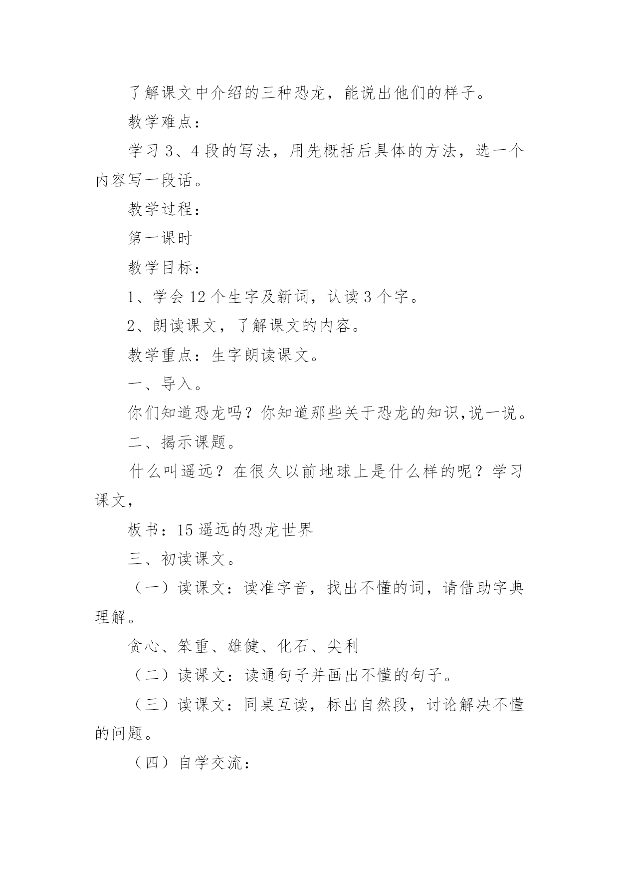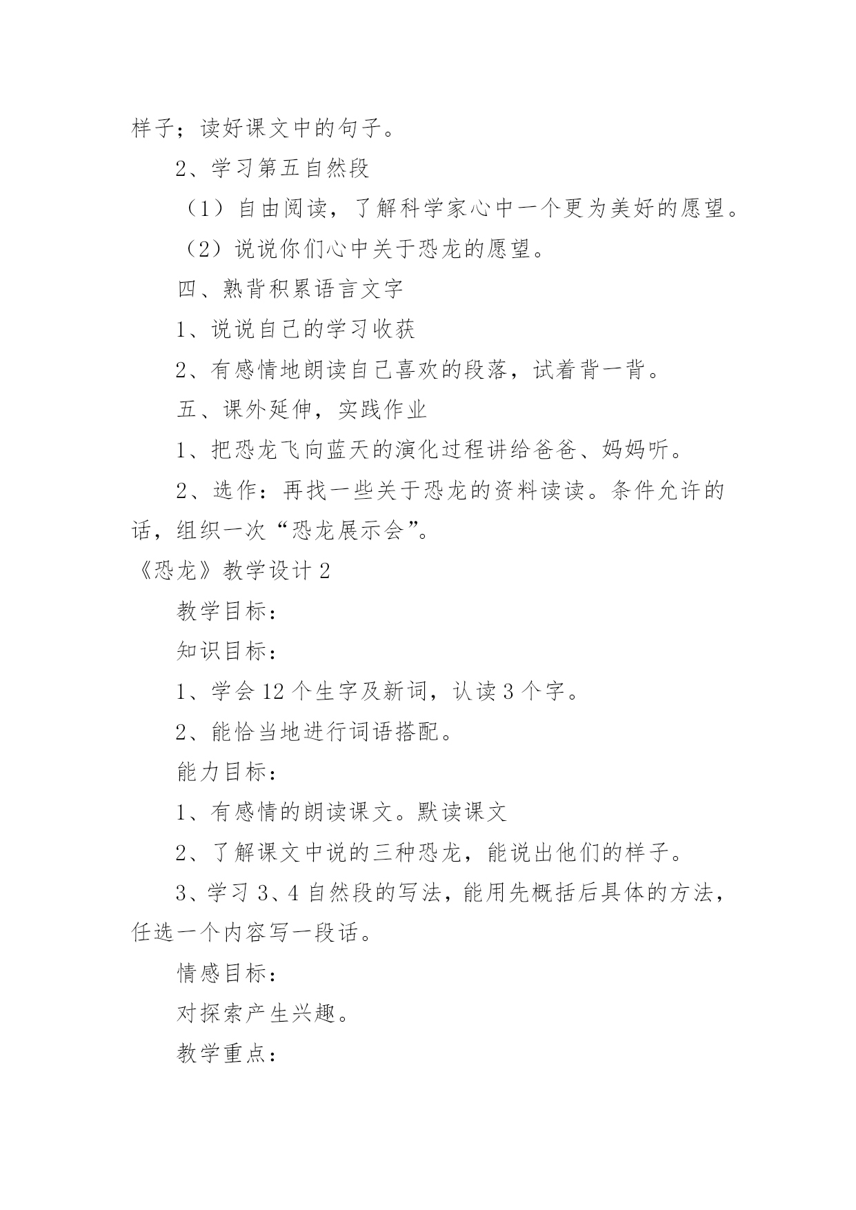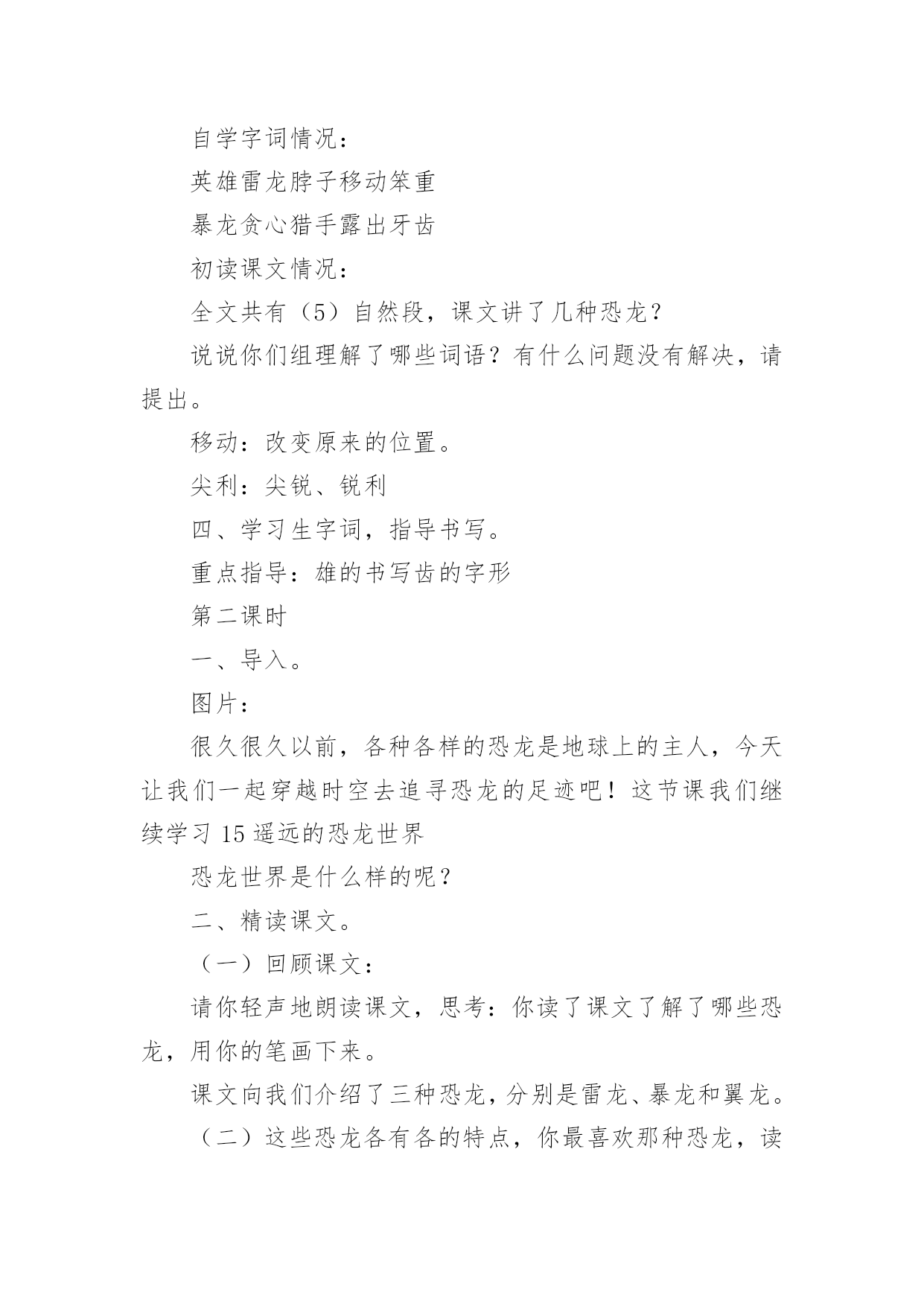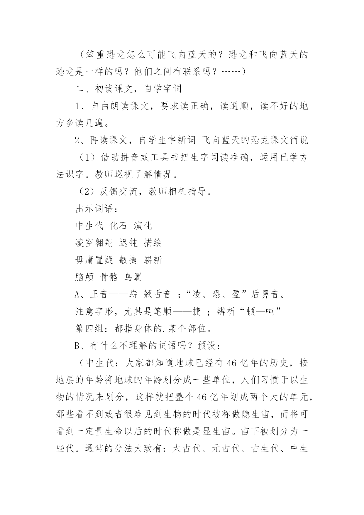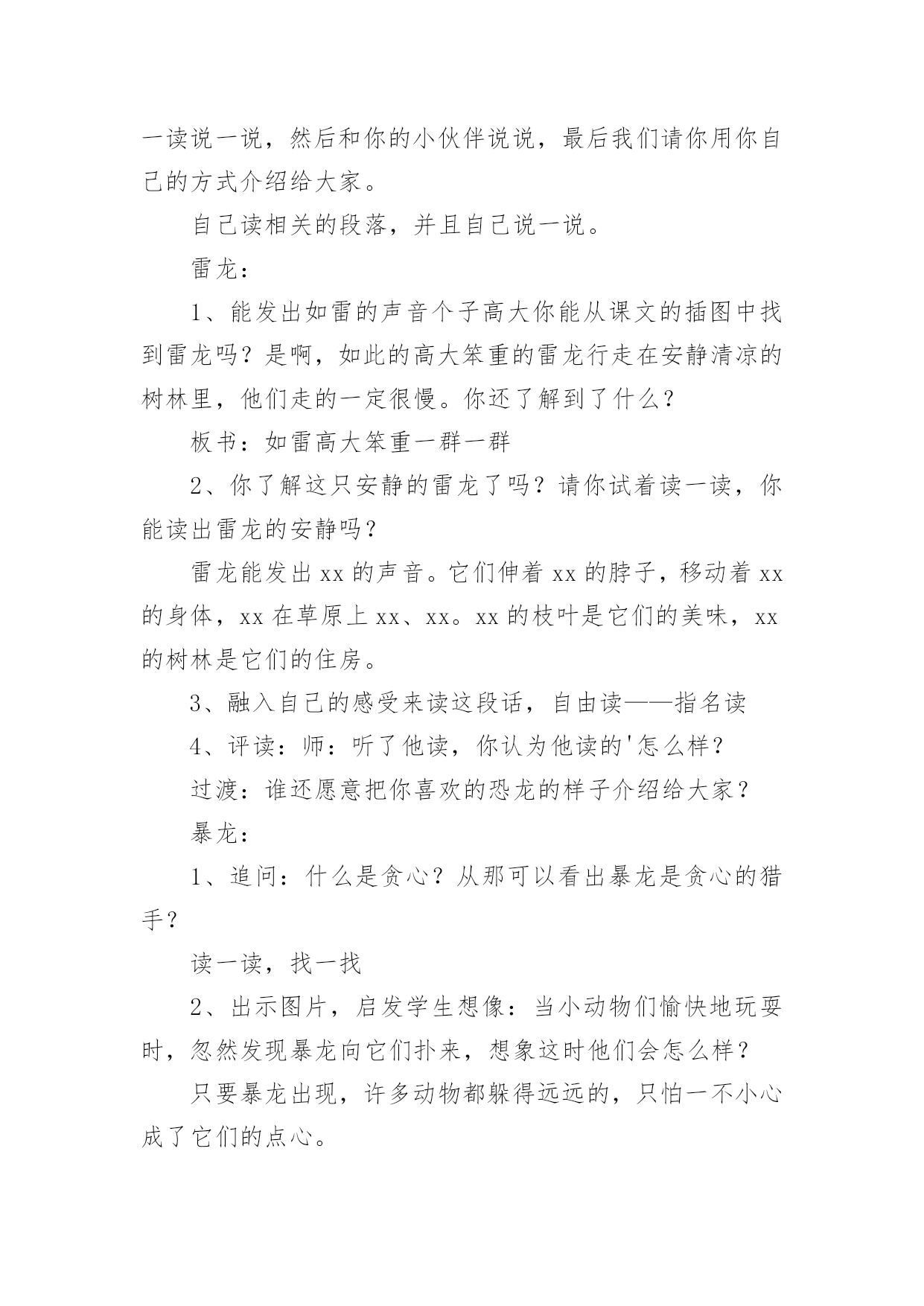 《恐龙》教学设计《恐龙》教学设计作为一名人民教师,常常需要准备教学设计,借助教学设计可以更好地组织教学活动。教学设计要怎么写呢?下面是小编整理的《恐龙》教学设计,希望能够帮助到大家。《恐龙》教学设计1设计意图:课堂以学生为主体,而“恐龙”是学生非常感兴趣的话题,文章从题目到内容都吸引着学生好奇心。因此,在设计中,我抓住这一学习契机,引导学生通过多渠道收集资料,以自主学习唤起学生浓厚学习兴趣,培养学生发现问题、解决问题的能力。阅读教学始终坚持“以读为本”。在设计中,我指导学生自主阅读、反复诵读,在语言实践中体会说明文中用词的正确生动,并在这过程中感悟积累语言、培养语感。教学目标:1、会认7个生字,会写13个生字。正确读写“恐龙、描绘、敏捷、欣喜若狂、形态各异”等词语。2、能体会准确生动的语言特点,正确、流利、有感情地朗读课文,背诵自己感兴趣的语段。3、练习有条理地复述恐龙飞向蓝天的演化过程,提高口头表达能力。4、激发学生的学习兴趣,培养学生大胆质疑、热爱科学、钻研科学的精神。教学重难点:1、重点:弄懂课文内容,了解恐龙飞向蓝天的演化过程。2、难点:领悟想象在文中的作用,体会作者用词的准确性。课前准备:1、教师准备:制作教学课件,课件中包含相关的原始恐龙图片影像、恐龙化石、文字解说、课文重要句段等。2、学生准备:课前通过各种方法收集恐龙相关资料,可以是图片,可以是文字材料。教学流程:第一课时一、谈话激趣,交流资料1、今天,我们要来认识一位新朋友。(板书:恐龙)看到“恐龙”这个词语,你脑海中出现了一个怎样的形象?用一个合适的词语概括——的恐龙(笨拙的;庞大的;凶猛的……)2、你了解恐龙吗?根据查阅的资料进行交流。课件展示相关内容。2、补充课题,质疑问难:看到这个课题,你有什么想知道的吗?(笨重恐龙怎么可能飞向蓝天的?恐龙和飞向蓝天的恐龙是一样的吗?他们之间有联系吗?……)二、初读课文,自学字词1、自由朗读课文,要求读正确,读通顺,读不好的地方多读几遍。2、再读课文,自学生字新词飞向蓝天的恐龙课文简说(1)借助拼音或工具书把生字词读准确,运用已学方法识字。教师巡视了解情况。(2)反馈交流,教师相机指导。出示词语:中生代化石演化凌空翱翔迟钝描绘毋庸置疑敏捷崭新脑颅骨骼鸟翼A、正音——崭翘舌音;“凌、恐、盈”后鼻音。注意字形,尤其是笔顺——捷;辨析“顿—吨”第四组:都指身体的.某个部位。B、有什么不理解的词语吗?预设:(中生代:大家都知道地球已经有46亿年的历史,按地层的年龄将地球的年龄划分成一些单位,人们习惯于以生物的情况来划分,这样就把整个46亿年划成两个大的单元,那些看不到或者很难见到生物的时代被称做隐生宙,而将可看到一定量生命以后的时代称做是显生宙。宙下被划分为一些代。通常的分法大致有:太古代、元古代、古生代、中生代、新生代五个代。中生代属于地质年代的第四代,延续约一亿年,这一代又分为三叠纪、侏罗纪、白垩纪。这个时期主要的脊椎动物是爬行动物,恐龙繁盛,哺乳类和鸟类开始出现。化石:指古生物的遗体、遗物或遗迹埋藏在地下,变成的跟石头一样的东西,研究化石可以了解生物的演化过程并能帮助确定地层的年代。毋庸置疑:指无须怀疑,是铁一样的事实。)C、“听意猜词”游戏三、熟读课文,理清层次1、自由读课文,把句子读通读顺,难读的句子反复多练。思考:课文主要讲了哪些内容?2、交流讨论,试着分段。第一段(第1、2自然段):大量化石显示,恐龙的一支经过漫长的演化成了飞翔的鸟儿。第二段(第3、4自然段):科学家假想恐龙是如何演化成鸟儿的。第三段(第5自然段):科学家希望能从化石中重现这一历史进程。四、通读全文,深入感知读后,选用课文中的词句,说说课文给你留下印象最深的地方。第二课时一、复习导入,检测学情1、检测生字词。2、回想课文内容,说说最感兴趣的地方。二、精读品位重点段落(第3、4自然段)根据学生实际情况,引导阅读第二段1、优秀调查员了解演化过程(1)学校科研组需要招聘一批优秀的调查员,入门考试就是:自主阅读这两小节,小组研讨合作填写表格:庞大恐龙家族繁衍生息的情况时间特点第一代恐龙两足奔跑许许多多年后根据表格,讨论:作者从哪些角度来介绍恐龙这一大家族?(2)汇报交流用自己的话说说恐龙飞向蓝天的演化过程。(提示学生可根据表格或课文内容,展开合理想象。融入自己了解到的恐龙相关知识,清楚有序地表达。)(3)有感情地朗读第二段2、自主品读体会语句特点找出你认为写得比较生动的句子读一读,说说它好在哪里?(出示课件)如:(1)比较句子:A、恐龙的一支经过漫长的演化,最终变成了凌空翱翔的鸟儿。B、恐龙最终变成了凌空翱翔的鸟儿。“一支”是指某一部分,而不是全部。“漫长的演化”是指有着很长的演变过程,而不是突如其来的变化。(2)“一些与鸟类亲缘关系较近的恐龙应该长