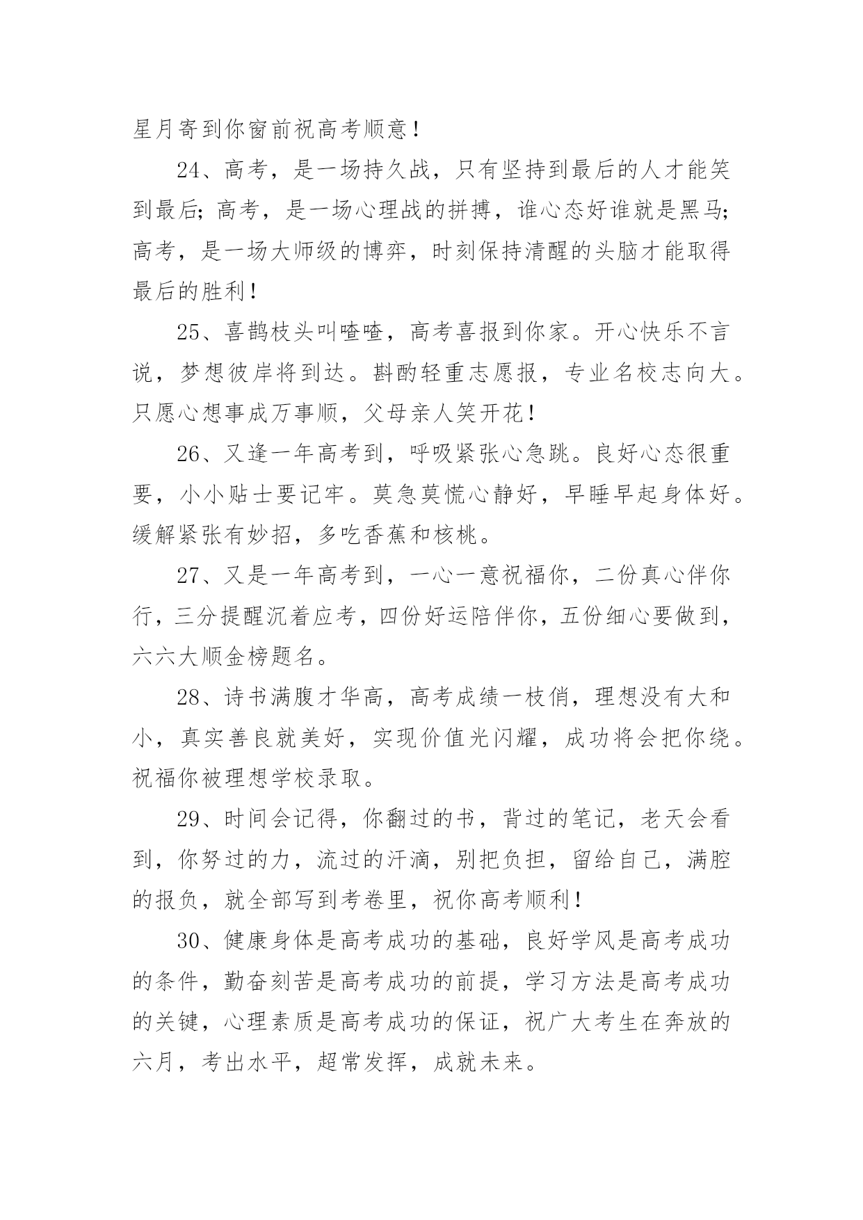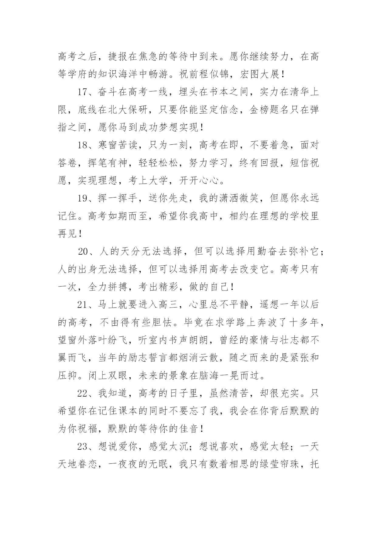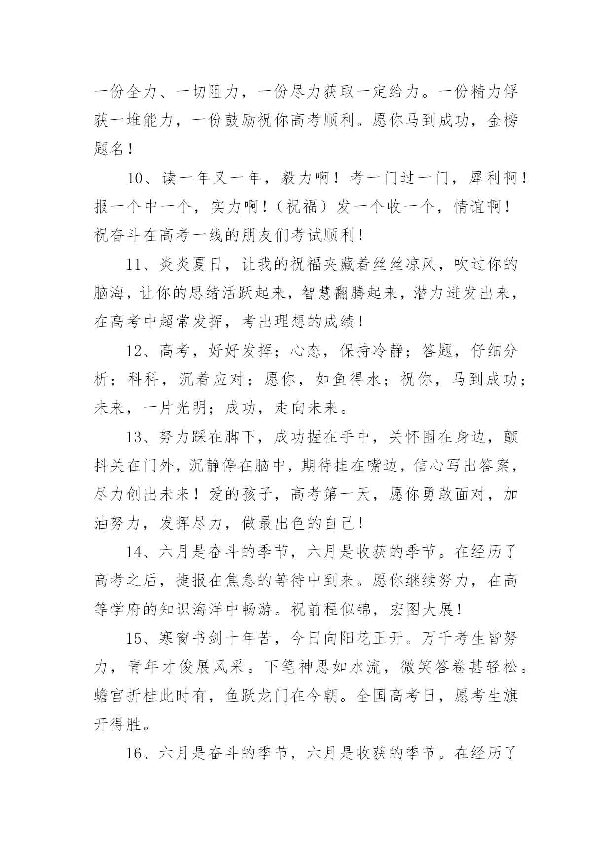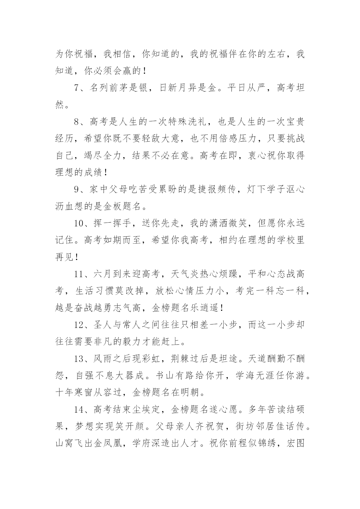 高考祝福语高考祝福语【荐】在日常的学习、工作、生活中,大家都不可避免地会接触到祝福语吧,祝福语有助于促进交流,拉近人与人之间的关系。那什么样的祝福语才是好的祝福语呢?下面是小编为大家整理的高考祝福语,欢迎阅读,希望大家能够喜欢。高考祝福语篇11、祝你做题闪展腾挪,柳暗花明又一村,祝你思路四方通畅随心所欲,祝你和考分关系密切一个也不能少!2、爬山的时候,每个人都有一个心理高原期,超出极限就能走向成功。高考就像登山,只有意志顽强的人,才干到达此岸。3、高考结束啦,秋天来啦,收获的时节到啦,金榜也题名啦,新的学习开始啦,以为着新的使命来临啦。愿你发扬以前的刻苦努力学习一刻不放松,创造美好未来,创造绚丽多彩的人生。4、奋斗在高考一线,埋头在书本之间,只要你能坚定信念,金榜题名只在弹指之间,愿你马到成功实现梦想!5、十年寒窗苦读,只为一朝争夕,捷报从天降来,理想从此打开,走进大学校门,梦想前方招手,盼望学业有成,将来报效祖国!6、亲爱的,就要进考场了,我在这大大的北方城市里,为你祝福,我相信,你知道的,我的祝福伴在你的左右,我知道,你必须会赢的!7、名列前茅是银,日新月异是金。平日从严,高考坦然。8、高考是人生的一次特殊洗礼,也是人生的一次宝贵经历,希望你既不要轻敌大意,也不用倍感压力,只要挑战自己,竭尽全力,结果不必在意。高考在即,衷心祝你取得理想的成绩!9、家中父母吃苦受累盼的是捷报频传,灯下学子沤心沥血想的是金板题名。10、挥一挥手,送你先走,我的潇洒微笑,但愿你永远记住。高考如期而至,希望你我高考,相约在理想的学校里再见!11、六月到来迎高考,天气炎热心烦躁,平和心态战高考,生活习惯莫改掉,放松心情压力小,考完一科忘一科,越是奋战越勇志气高,金榜题名乐逍遥!12、圣人与常人之间往往只相差一小步,而这一小步却往往需要非凡的毅力才能赶上。13、风雨之后现彩虹,荆棘过后是坦途。天道酬勤不酬怨,自强不息大器成。书山有路给你开,学海无涯任你游。十年寒窗从容过,金榜题名在明朝。14、高考结束尘埃定,金榜题名遂心愿。多年苦读结硕果,梦想实现笑开颜。父母亲人齐祝贺,街坊邻居佳话传。山窝飞出金凤凰,学府深造出人才。祝你前程似锦绣,宏图大展创未来!15、开启高考成功之门,钥匙有三。其一:勤奋的精神其二:科学的方法其三:良好的心态。16、长风破浪游书海,勤劳掌舵挂云帆。数年磨剑不畏苦,今朝倚剑放光芒。胸中才思汩汩涌,笔下锦绣生光辉。一举高中好花魁,自信奔赴好前程。全国高考日,愿学子胜利而归。17、苦尽甘来,十年寒窗苦读效三皇五帝逐群雄;师生同喜,一朝金榜题名成八斗奇才傲天下。18、决定心里的那片天空是否阴霾甚至是乌云密布的唯一因素是你自己,不能让自己永远有一个阳光灿烂的心情的人本身就是一个失败!19、挥一挥手,送你先走,我的潇洒微笑,但愿你永远记住。高考如期而至,希望你我高中,相约在理想的学校里再见!20、诗书满腹才华高,高考成绩一枝俏,理想没有大和小,真实善良就美好,实现价值光闪耀,成功将会把你绕。祝福你被理想学校录取。高考祝福语篇21、面临大考,心态要好;摆正身心,价值千金;只要努力,总有天地!2、六月艳阳天,高考即在前,十年寒窗苦,朝暮读圣贤;学非单行道,之外路千条,心态摆平稳,从容去应考。榜上有名固可喜,名落孙山亦莫恼!祝高考大捷!3、想说爱你,感觉太沉;想说喜欢,感觉太轻;一每天地眷恋,一夜夜的无眠,我只有数着相思的绿莹帘珠,托星月寄到你窗前。祝考试顺意!4、积一时之跬步,臻千里之遥程。高考第一天,祝福送到手。考前准备要做好,学习用品要带好,上了考场莫紧张,平常心对待莫要忘。相信我能行,相信我最棒,给自己一份鼓励,给自己创造一个良好的考试环境。祝你高考成功!5、愿天下高考人:忧愁是可微的,快乐是可积的,在未来趋于正无穷的日子里,幸福是连续的,对你的祝福是可导的且大于零,祝你每天快乐的复合函数总是最大值。高考祝福语篇3似乎高考时总会有雨伴随,不知明天的你们是否也会有雨相伴,如果有,不要烦恼,就当是老天在为你们庆祝;如果没有,就是太阳在为你们欢笑。因为,一切的一切,在这一天都是美好的,只需你低下头认真地写就好。时光荏苒,又到了高三学子征战沙场的时候。还好,现在高考的时间已经调到六月份,避开了濡湿酷热的七月,加上现在物质条件已经大大改善,高考学子们比以前幸福多了!曾经的“黑色七月”,已经成为陈年往事。我,作为曾经走过那段岁月的普通人,面对着又一次浮起的硝烟,不禁浮想联翩。多年前,我和今天全中国一千万高考学子一样,走进了那个令无数人神往而恐惧的战场。虽已说不上“千军万马过独木桥”(当时高校已经开始扩招),但心底的紧张是挥之不去的,太多的渴盼和期待,太多的承载和担负,都凝聚在不到三天的考试中。三载辛劳,一番拼杀,梦想在那一刻发出璀璨的光芒。考场外