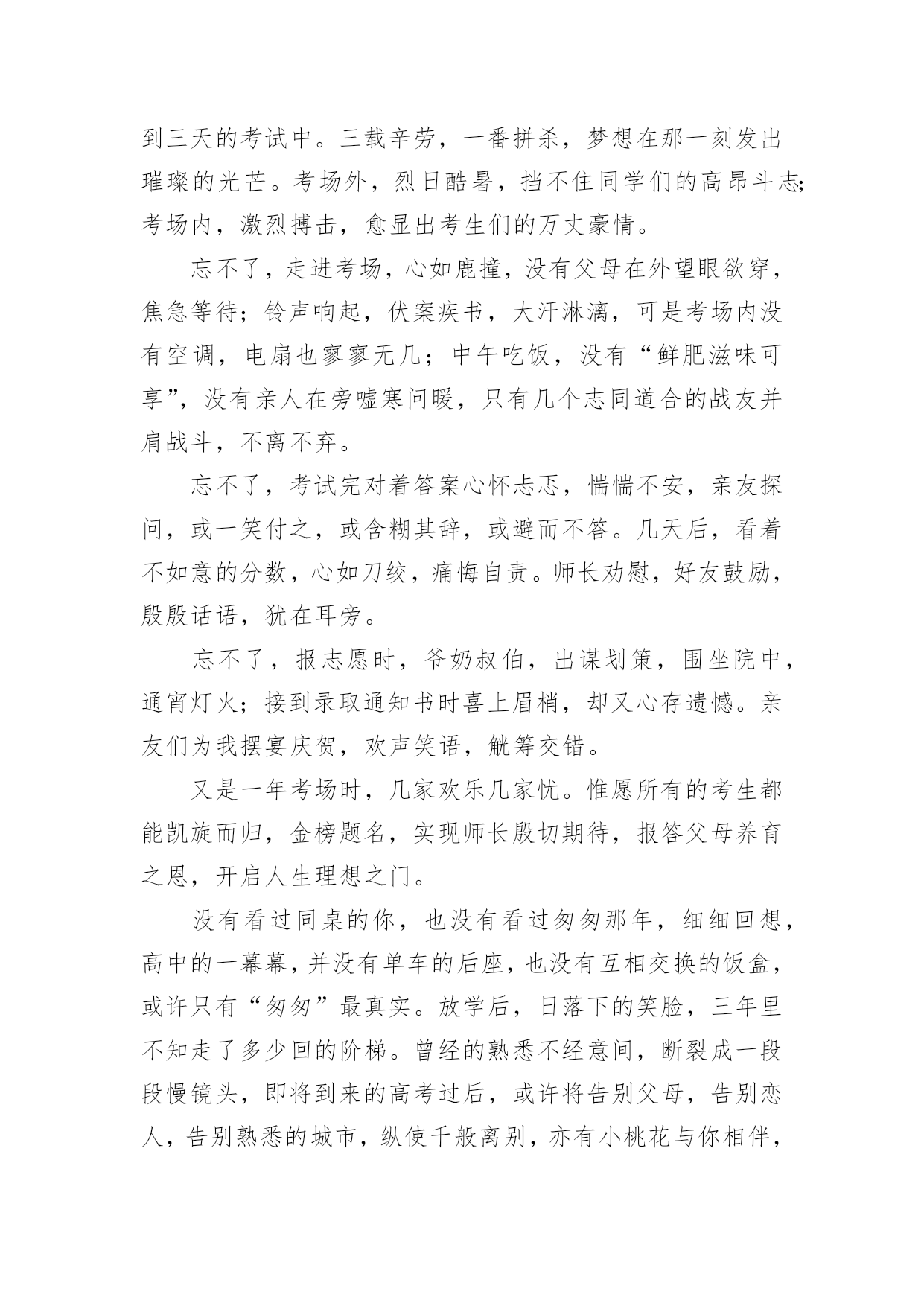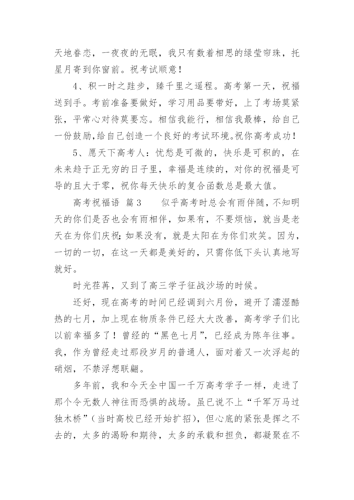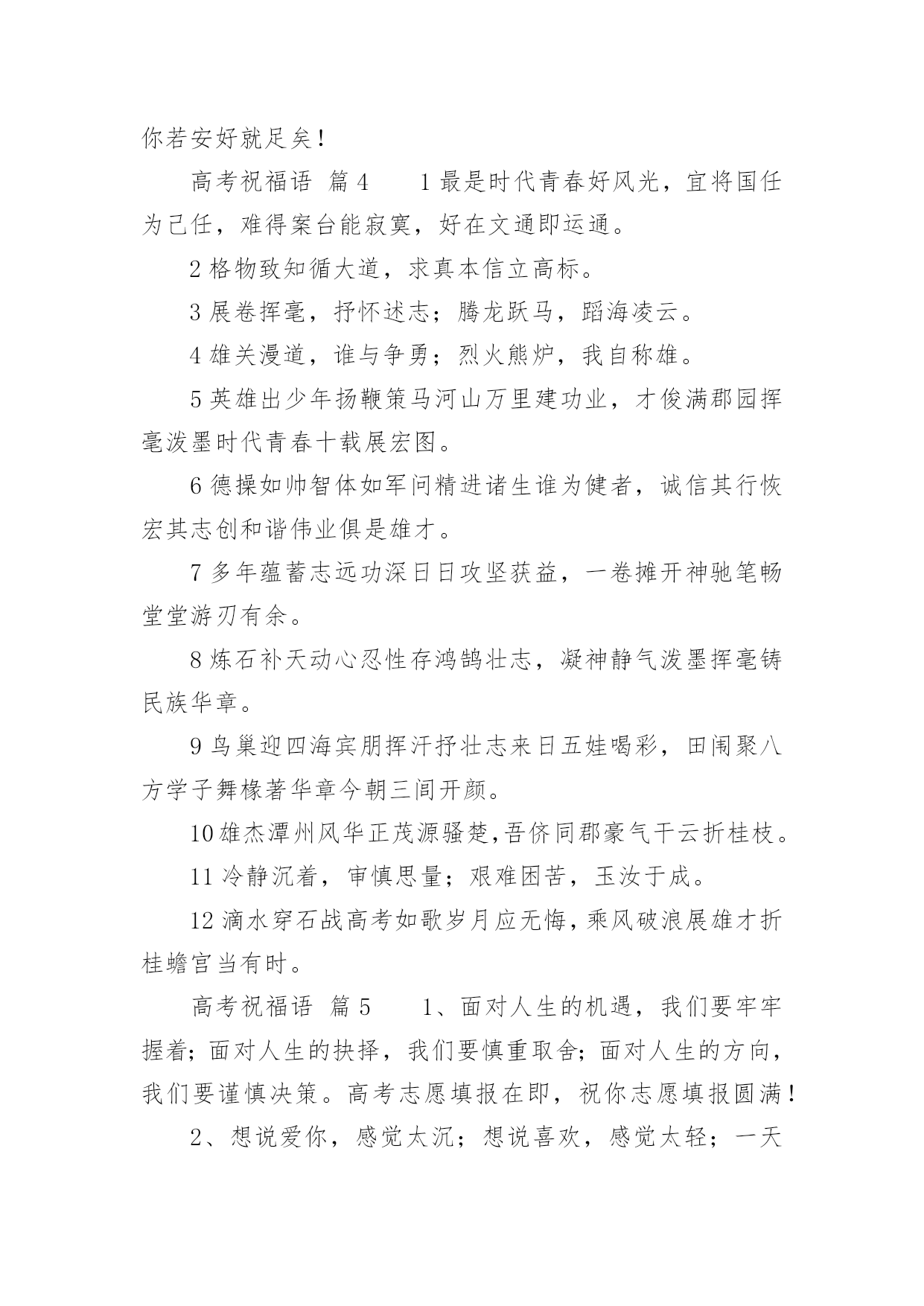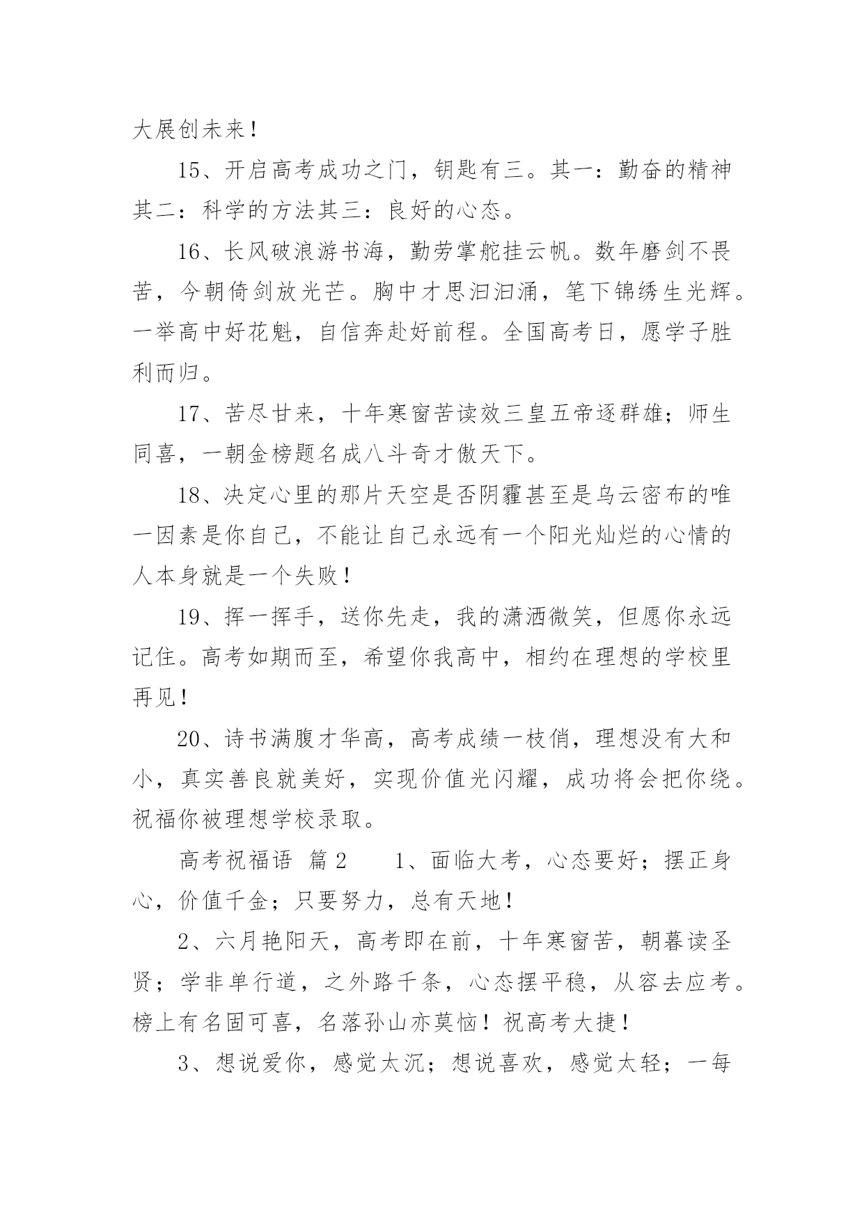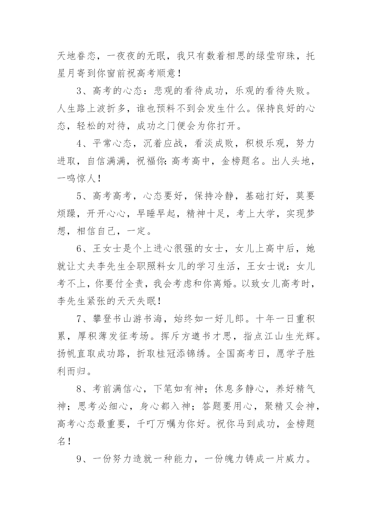 高考祝福语高考祝福语【荐】在日常的学习、工作、生活中,大家都不可避免地会接触到祝福语吧,祝福语有助于促进交流,拉近人与人之间的关系。那什么样的祝福语才是好的祝福语呢?下面是小编为大家整理的高考祝福语,欢迎阅读,希望大家能够喜欢。高考祝福语篇11、祝你做题闪展腾挪,柳暗花明又一村,祝你思路四方通畅随心所欲,祝你和考分关系密切一个也不能少!2、爬山的时候,每个人都有一个心理高原期,超出极限就能走向成功。高考就像登山,只有意志顽强的人,才干到达此岸。3、高考结束啦,秋天来啦,收获的时节到啦,金榜也题名啦,新的学习开始啦,以为着新的使命来临啦。愿你发扬以前的刻苦努力学习一刻不放松,创造美好未来,创造绚丽多彩的人生。4、奋斗在高考一线,埋头在书本之间,只要你能坚定信念,金榜题名只在弹指之间,愿你马到成功实现梦想!5、十年寒窗苦读,只为一朝争夕,捷报从天降来,理想从此打开,走进大学校门,梦想前方招手,盼望学业有成,将来报效祖国!6、亲爱的,就要进考场了,我在这大大的北方城市里,为你祝福,我相信,你知道的,我的祝福伴在你的左右,我知道,你必须会赢的!7、名列前茅是银,日新月异是金。平日从严,高考坦然。8、高考是人生的一次特殊洗礼,也是人生的一次宝贵经历,希望你既不要轻敌大意,也不用倍感压力,只要挑战自己,竭尽全力,结果不必在意。高考在即,衷心祝你取得理想的成绩!9、家中父母吃苦受累盼的是捷报频传,灯下学子沤心沥血想的是金板题名。10、挥一挥手,送你先走,我的潇洒微笑,但愿你永远记住。高考如期而至,希望你我高考,相约在理想的学校里再见!11、六月到来迎高考,天气炎热心烦躁,平和心态战高考,生活习惯莫改掉,放松心情压力小,考完一科忘一科,越是奋战越勇志气高,金榜题名乐逍遥!12、圣人与常人之间往往只相差一小步,而这一小步却往往需要非凡的毅力才能赶上。13、风雨之后现彩虹,荆棘过后是坦途。天道酬勤不酬怨,自强不息大器成。书山有路给你开,学海无涯任你游。十年寒窗从容过,金榜题名在明朝。14、高考结束尘埃定,金榜题名遂心愿。多年苦读结硕果,梦想实现笑开颜。父母亲人齐祝贺,街坊邻居佳话传。山窝飞出金凤凰,学府深造出人才。祝你前程似锦绣,宏图大展创未来!15、开启高考成功之门,钥匙有三。其一:勤奋的精神其二:科学的方法其三:良好的心态。16、长风破浪游书海,勤劳掌舵挂云帆。数年磨剑不畏苦,今朝倚剑放光芒。胸中才思汩汩涌,笔下锦绣生光辉。一举高中好花魁,自信奔赴好前程。全国高考日,愿学子胜利而归。17、苦尽甘来,十年寒窗苦读效三皇五帝逐群雄;师生同喜,一朝金榜题名成八斗奇才傲天下。18、决定心里的那片天空是否阴霾甚至是乌云密布的唯一因素是你自己,不能让自己永远有一个阳光灿烂的心情的人本身就是一个失败!19、挥一挥手,送你先走,我的潇洒微笑,但愿你永远记住。高考如期而至,希望你我高中,相约在理想的学校里再见!20、诗书满腹才华高,高考成绩一枝俏,理想没有大和小,真实善良就美好,实现价值光闪耀,成功将会把你绕。祝福你被理想学校录取。高考祝福语篇21、面临大考,心态要好;摆正身心,价值千金;只要努力,总有天地!2、六月艳阳天,高考即在前,十年寒窗苦,朝暮读圣贤;学非单行道,之外路千条,心态摆平稳,从容去应考。榜上有名固可喜,名落孙山亦莫恼!祝高考大捷!3、想说爱你,感觉太沉;想说喜欢,感觉太轻;一每天地眷恋,一夜夜的无眠,我只有数着相思的绿莹帘珠,托星月寄到你窗前。祝考试顺意!4、积一时之跬步,臻千里之遥程。高考第一天,祝福送到手。考前准备要做好,学习用品要带好,上了考场莫紧张,平常心对待莫要忘。相信我能行,相信我最棒,给自己一份鼓励,给自己创造一个良好的考试环境。祝你高考成功!5、愿天下高考人:忧愁是可微的,快乐是可积的,在未来趋于正无穷的日子里,幸福是连续的,对你的祝福是可导的且大于零,祝你每天快乐的复合函数总是最大值。高考祝福语篇3似乎高考时总会有雨伴随,不知明天的你们是否也会有雨相伴,如果有,不要烦恼,就当是老天在为你们庆祝;如果没有,就是太阳在为你们欢笑。因为,一切的一切,在这一天都是美好的,只需你低下头认真地写就好。时光荏苒,又到了高三学子征战沙场的时候。还好,现在高考的时间已经调到六月份,避开了濡湿酷热的七月,加上现在物质条件已经大大改善,高考学子们比以前幸福多了!曾经的“黑色七月”,已经成为陈年往事。我,作为曾经走过那段岁月的普通人,面对着又一次浮起的硝烟,不禁浮想联翩。多年前,我和今天全中国一千万高考学子一样,走进了那个令无数人神往而恐惧的战场。虽已说不上“千军万马过独木桥”(当时高校已经开始扩招),但心底的紧张是挥之不去的,太多的渴盼和期待,太多的承载和担负,都凝聚在不到三天的考试中。三载辛劳,一番拼杀,梦想在那一刻发出璀璨的光芒。考场外