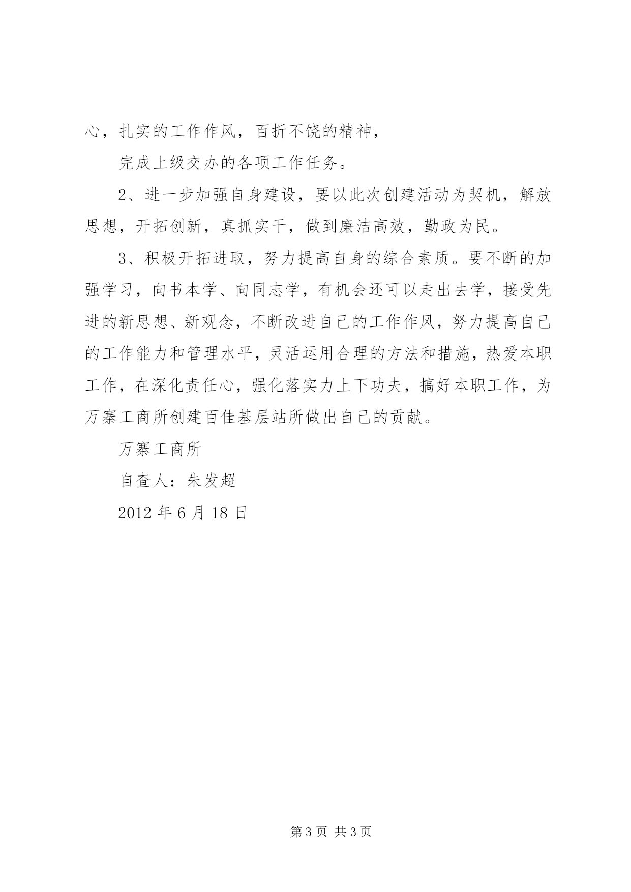 第PAGE\*Arabic\*MERGEFORMAT3页共NUMPAGES\*MERGEFORMAT3页工商所自查自纠报告“百佳基层站所”创建活动个人自查自纠报告在“百佳基层站所”创建活动中,我认真学习了县工商局制定的《XX县区工商系统“百佳基层站所”创建活动工作实施方案》,通过深刻的反思和认真听取别人的意见,我认识到自己在思想、工作、作风纪律等方面存在很多的不足,现就这些问题进行自我剖析,具体如下:一、存在的问题。1、政策理论水平不高,对党的路线方针政策以及上级的许多文件精神的理解只停留在一般水平上,没有进行深刻的研究和掌握。2、自身建设要求不严,个人自由主义、攀比思想经常在头脑中存在,艰苦奋斗和过紧日子的思想退化。3、工作自我要求不严,管理单位、同志不够严格,工作中存在拖拉的现象。二、存在问题的主要原因。以上问题的存在,虽然有一定的客观因素,但主要还是主观因素造成的,在这次创建活动中,对自身存在的主要问题和不足也多次进行认真的反思,深刻剖析产生这些问题的根源与危害,从主观上查找原因,概括起来主要有以下几个方面:1、主观学习不够,政治修养不高,对科学发展观缺乏深刻的学习,特别是对“三个代表”重要思想没有深刻的体会,联系实际不够,没有发挥理论的指导作用,使学习变得形式化、教条化,因而不能准确把握形势。2、法律法规学习不够,业务知识钻研不够,在实际工作中大多是按上级领导的指示以及上级文件精神在打转,因而在工作中缺乏一种开拓创新的精神,而且自己尚未有一整套学习业务知识的计划,所以有时在工作中存在一定的盲目的自信,没有多大的自信。3、工作方法简单,管理干部松散。一般的情况下,只安于表面,认为把自己份内的事做好就可以了,处理事情的方式方法比较简单,对单位的干部职工也没有深入的了解分析,完全相信大家的自觉性,没有一套有力的问责机制和激励机制,从而也不能充分调动干部职工的主观能动性,什么开拓进取精神也就更无从说起,使整个单位缺乏一种活力和动力,变得松松散散,拖拖拉拉啦。三、今后的整改措施。1、进一步坚定政治信念。要通过这一次创建活动,系统的加强政治理论学习,精读有关重点文章,及时学习领会上级文件精神,提交自己政治理论修养,坚定自己的政治信念,增强纪律意识,自觉地加强党性锻炼,遵纪守法,以强烈的责任感和事业心,扎实的工作作风,百折不饶的精神,完成上级交办的各项工作任务。2、进一步加强自身建设,要以此次创建活动为契机,解放思想,开拓创新,真抓实干,做到廉洁高效,勤政为民。3、积极开拓进取,努力提高自身的综合素质。要不断的加强学习,向书本学、向同志学,有机会还可以走出去学,接受先进的新思想、新观念,不断改进自己的工作作风,努力提高自己的工作能力和管理水平,灵活运用合理的方法和措施,热爱本职工作,在深化责任心,强化落实力上下功夫,搞好本职工作,为万寨工商所创建百佳基层站所做出自己的贡献。万寨工商所自查人:朱发超2012年6月18日