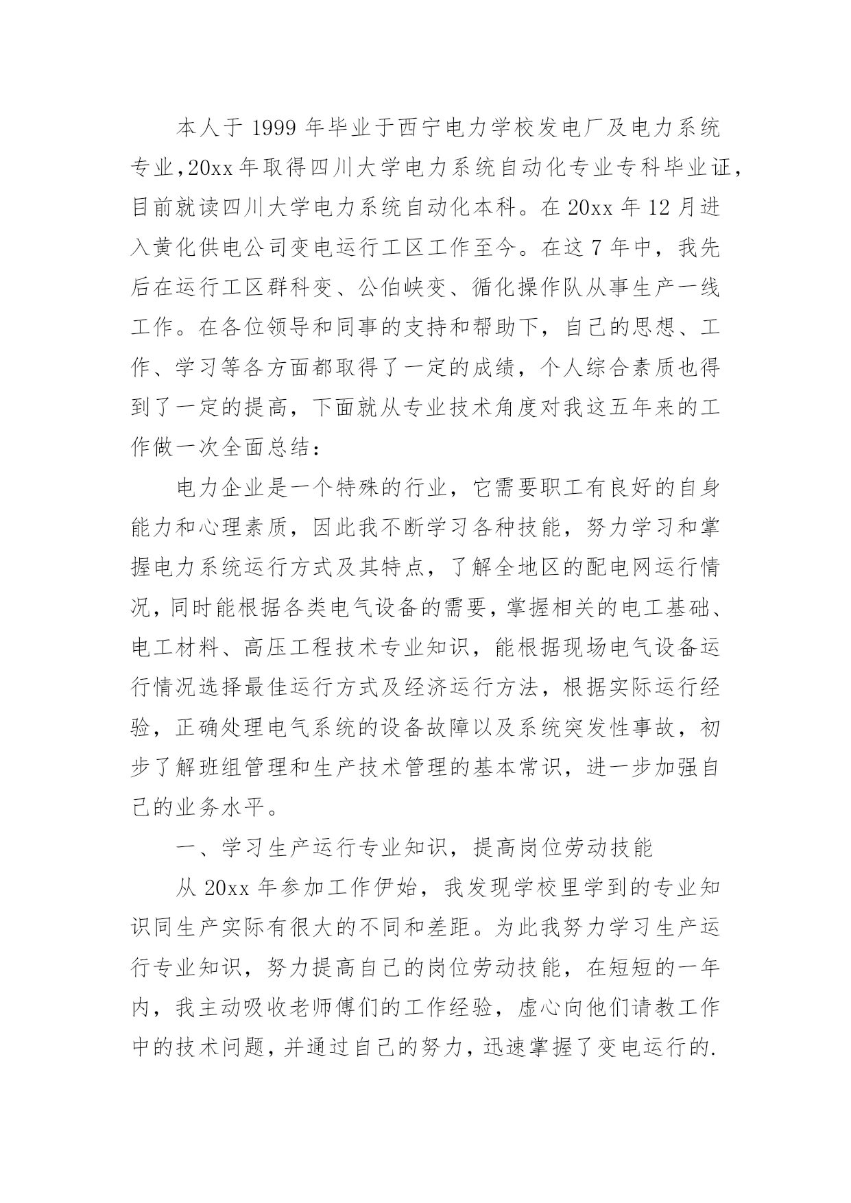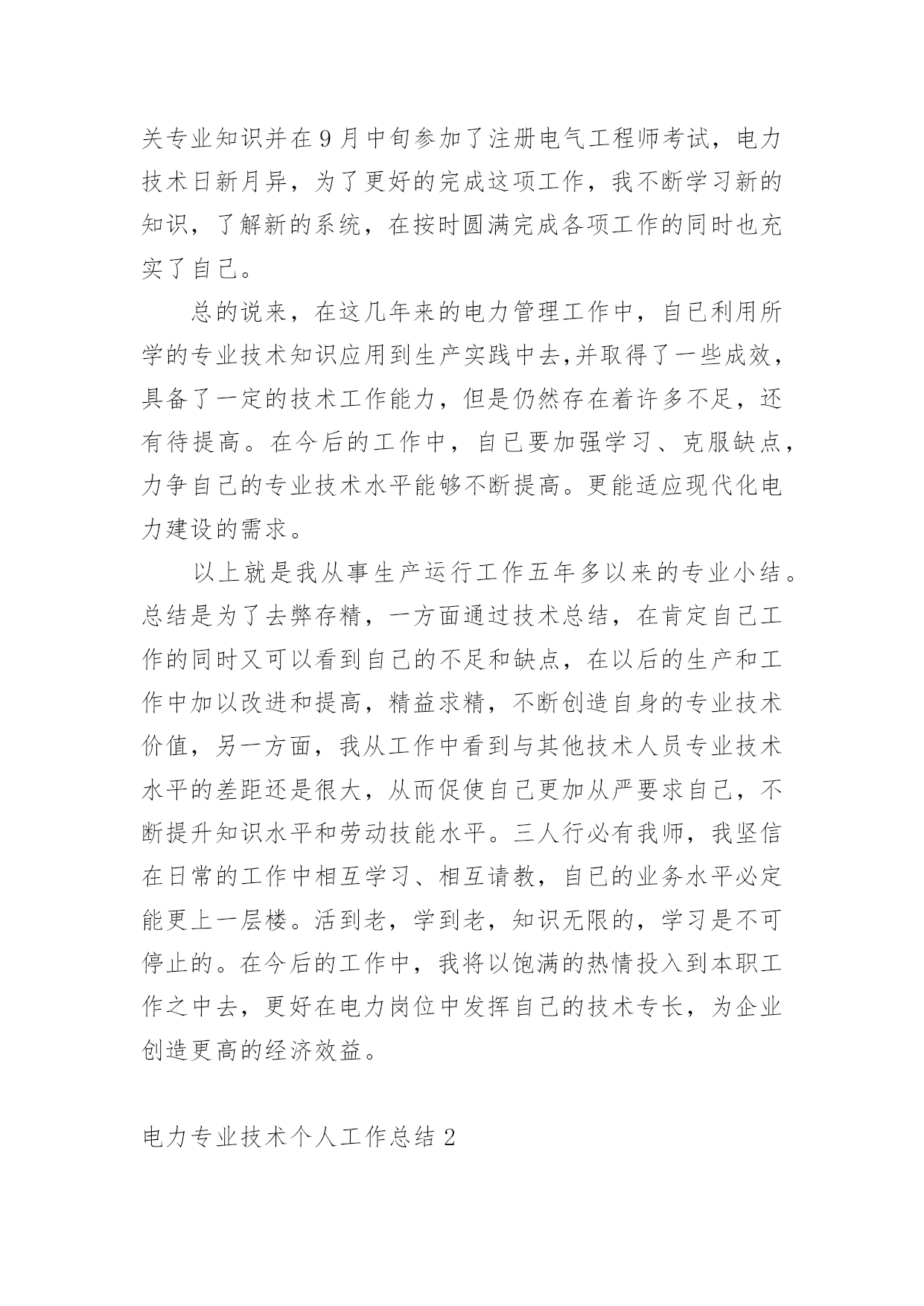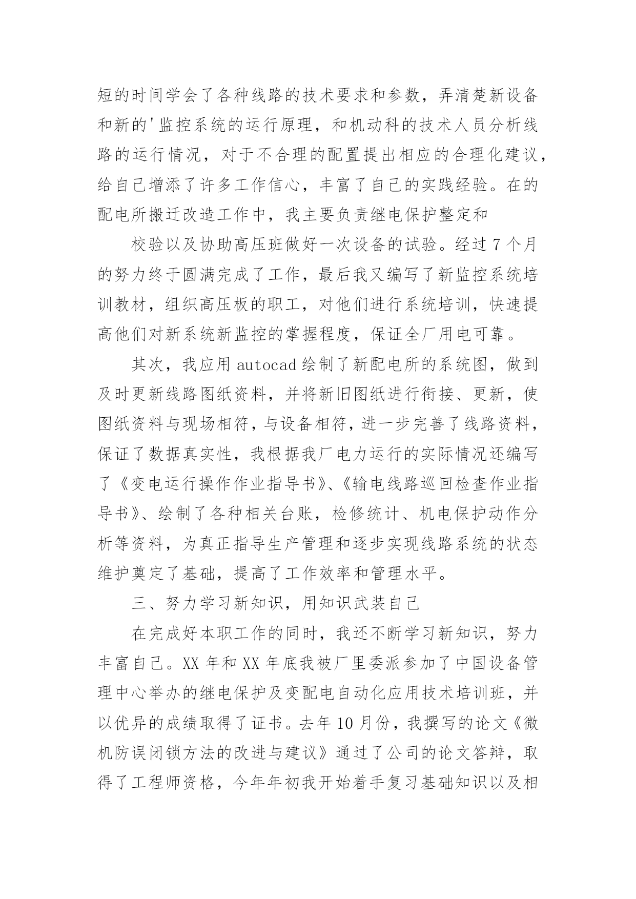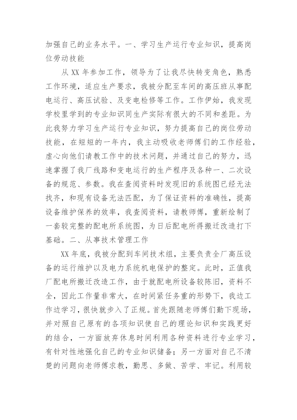 电力专业技术个人工作总结总结在一个时期、一个年度、一个阶段对学习和工作生活等情况加以回顾和分析的一种书面材料,它能使我们及时找出错误并改正,为此要我们写一份总结。我们该怎么写总结呢?以下是小编整理的电力专业技术个人工作总结,希望能够帮助到大家。电力专业技术个人工作总结1本人于XXXX年毕业于XXXX大学,所学专业为XXXXXXXX方向。在XX年X月进入XX公司化机厂机动车间参加工作至今。在这六年中,我先后在XX车间的高压班、电工维修班从事生产一线工作。在各位领导和同事的支持和帮助下,自己的思想、工作、学习等各方面都取得了一定的成绩,个人综合素质也得到了一定的提高,下面就从专业技术角度对我这五年来的专业技术工作做一次全面总结:电力企业是一个特殊的行业,电工是是一个高危的工种,尤其是高压电,它需要职工有良好的自身能力和心理素质,因此我不断学习各种技能,努力学习和掌握电力系统运行方式及其特点,了解全厂的配电运行情况,同时能根据各类电气设备的需要,掌握相关的高压工程技术专业知识,能根据现场电气设备运行情况选择最佳运行方式及经济运行方法,根据实际运行经验,正确处理电气系统的设备故障以及系统突发性事故,独立进行主要设备的继电保护整定工作,不断加强自己的业务水平。一、学习生产运行专业知识,提高岗位劳动技能从XX年参加工作,领导为了让我尽快转变角色,熟悉工作环境,适应生产要求,我被分配至车间的高压班从事配电运行、高压试验、及变电检修等工作。工作伊始,我发现学校里学到的专业知识同生产实际有很大的不同和差距。为此我努力学习生产运行专业知识,努力提高自己的岗位劳动技能,在短短的一年内,我主动吸收老师傅们的工作经验,虚心向他们请教工作中的技术问题,并通过自己的努力,迅速掌握了我厂线路和变电运行的生产程序及各种一、二次设备的规范、参数。我在查阅资料时发现旧的系统图已经无法找齐,和现有设备无法匹配,为了保证资料的准确性,提高设备维护保养的效率,我查阅资料,请教师傅,重新绘制了一套较完整的配电所系统图,为日后配电所得搬迁改造打下基础。二、从事技术管理工作XX年底,我被分配到车间技术组,主要负责全厂高压设备的运行维护以及电力系统机电保护的整定。此时,正值我厂配电所搬迁改造工作,由于就配电所设备较陈旧,资料不全,因此工作量非常大,在时间紧任务重的形势下,我边工作边学习,很快就步入了正规。首先跟随老师傅们勤下现场,并对照自己原有的各项知识使自己的理论知识和实践更好的结合,一方面放弃休息时间利用各种资料进行专业学习,有针对性地强化自己的专业知识储备;另一方面对自己不清楚的问题向老师傅求教,勤思、多做、苦学、牢记。利用较短的时间学会了各种线路的技术要求和参数,弄清楚新设备和新的'监控系统的运行原理,和机动科的技术人员分析线路的运行情况,对于不合理的配置提出相应的合理化建议,给自己增添了许多工作信心,丰富了自己的实践经验。在的配电所搬迁改造工作中,我主要负责继电保护整定和校验以及协助高压班做好一次设备的试验。经过7个月的努力终于圆满完成了工作,最后我又编写了新监控系统培训教材,组织高压板的职工,对他们进行系统培训,快速提高他们对新系统新监控的掌握程度,保证全厂用电可靠。其次,我应用autocad绘制了新配电所的系统图,做到及时更新线路图纸资料,并将新旧图纸进行衔接、更新,使图纸资料与现场相符,与设备相符,进一步完善了线路资料,保证了数据真实性,我根据我厂电力运行的实际情况还编写了《变电运行操作作业指导书》、《输电线路巡回检查作业指导书》、绘制了各种相关台账,检修统计、机电保护动作分析等资料,为真正指导生产管理和逐步实现线路系统的状态维护奠定了基础,提高了工作效率和管理水平。三、努力学习新知识,用知识武装自己在完成好本职工作的同时,我还不断学习新知识,努力丰富自己。XX年和XX年底我被厂里委派参加了中国设备管理中心举办的继电保护及变配电自动化应用技术培训班,并以优异的成绩取得了证书。去年10月份,我撰写的论文《微机防误闭锁方法的改进与建议》通过了公司的论文答辩,取得了工程师资格,今年年初我开始着手复习基础知识以及相关专业知识并在9月中旬参加了注册电气工程师考试,电力技术日新月异,为了更好的完成这项工作,我不断学习新的知识,了解新的系统,在按时圆满完成各项工作的同时也充实了自己。总的说来,在这几年来的电力管理工作中,自已利用所学的专业技术知识应用到生产实践中去,并取得了一些成效,具备了一定的技术工作能力,但是仍然存在着许多不足,还有待提高。在今后的工作中,自已要加强学习、克服缺点,力争自己的专业技术水平能够不断提高。更能适应现代化电力建设的需求。以上就是我从事生产运行工作五年多以来的专业小结。总结是为了去弊存精,一方面通过技术总结,在肯定自己工作的同时又可以看到自己的