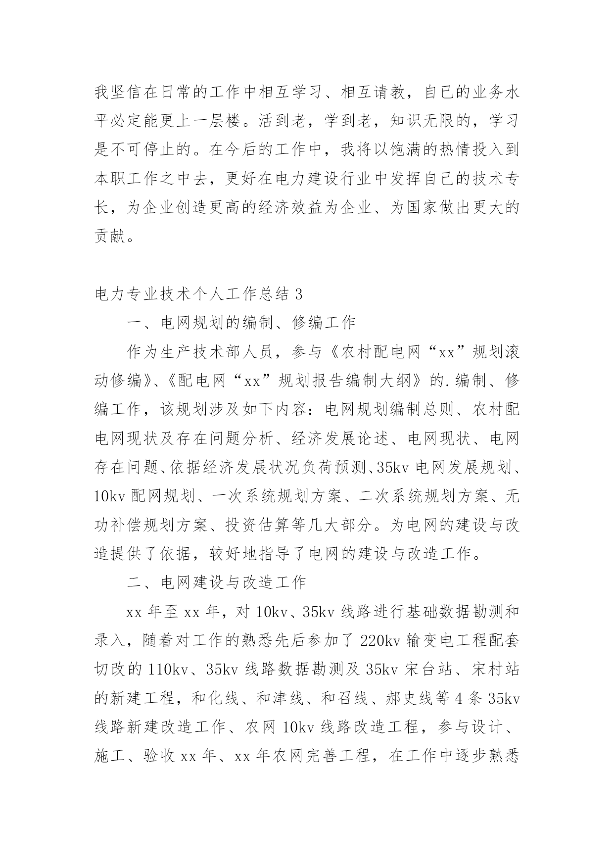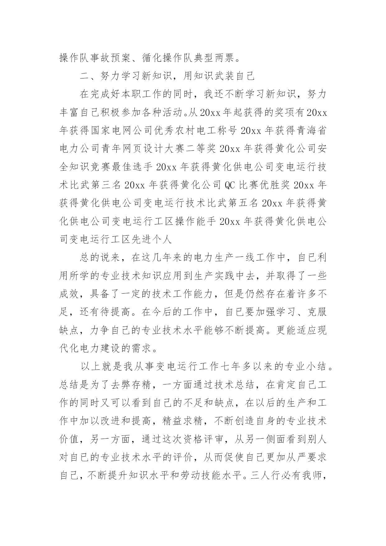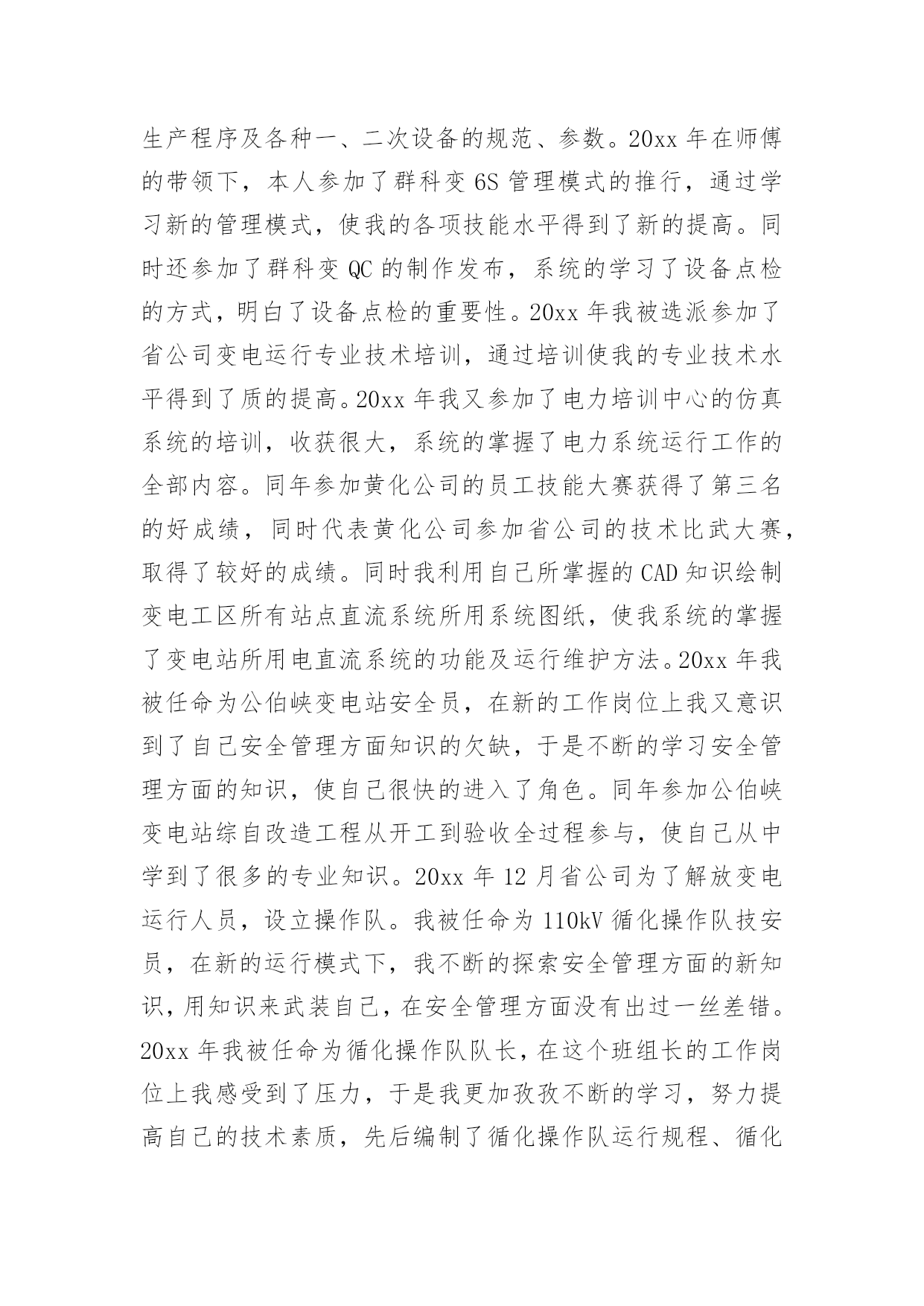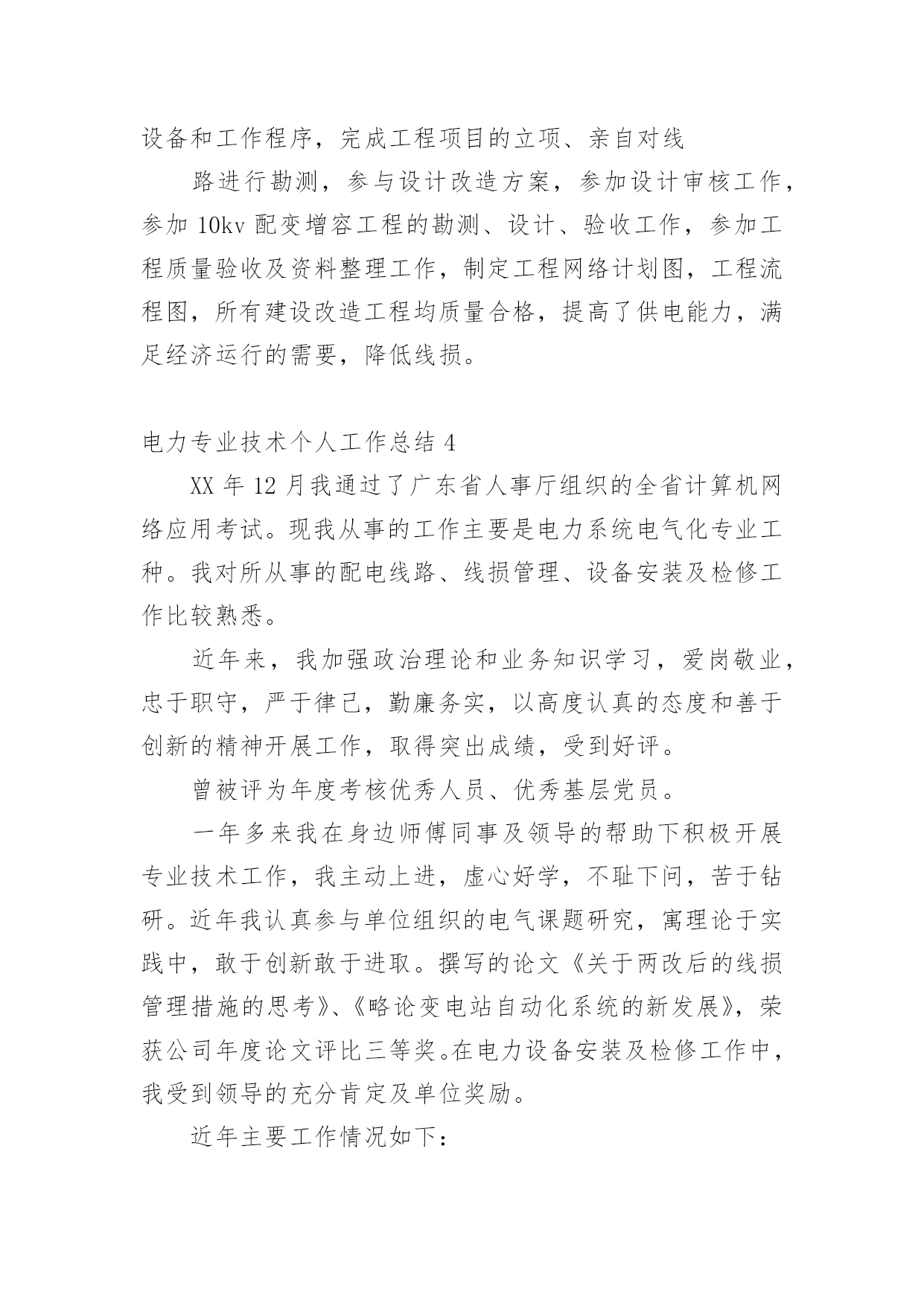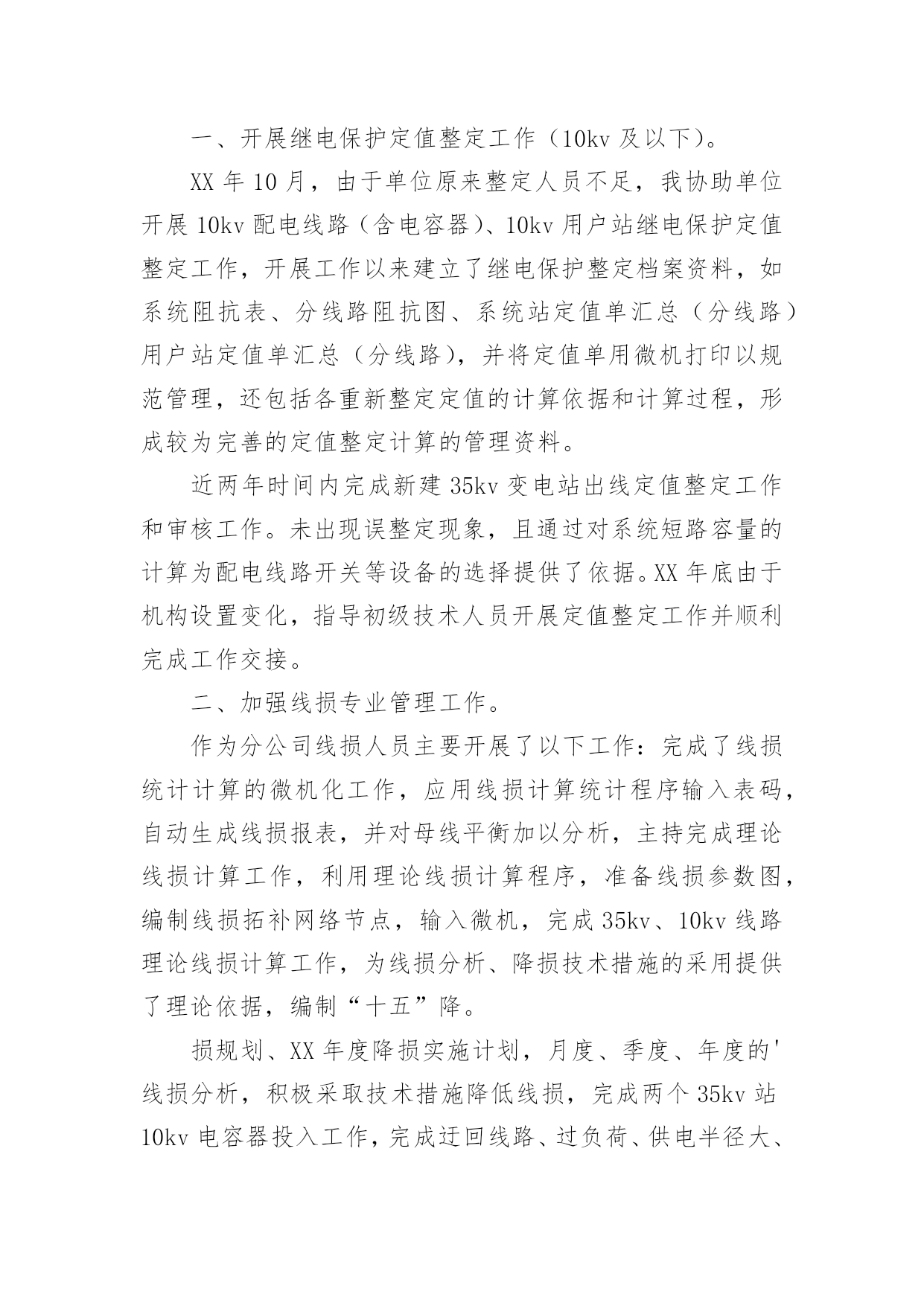 电力专业技术个人工作总结总结在一个时期、一个年度、一个阶段对学习和工作生活等情况加以回顾和分析的一种书面材料,它能使我们及时找出错误并改正,为此要我们写一份总结。我们该怎么写总结呢?以下是小编整理的电力专业技术个人工作总结,希望能够帮助到大家。电力专业技术个人工作总结1本人于XXXX年毕业于XXXX大学,所学专业为XXXXXXXX方向。在XX年X月进入XX公司化机厂机动车间参加工作至今。在这六年中,我先后在XX车间的高压班、电工维修班从事生产一线工作。在各位领导和同事的支持和帮助下,自己的思想、工作、学习等各方面都取得了一定的成绩,个人综合素质也得到了一定的提高,下面就从专业技术角度对我这五年来的专业技术工作做一次全面总结:电力企业是一个特殊的行业,电工是是一个高危的工种,尤其是高压电,它需要职工有良好的自身能力和心理素质,因此我不断学习各种技能,努力学习和掌握电力系统运行方式及其特点,了解全厂的配电运行情况,同时能根据各类电气设备的需要,掌握相关的高压工程技术专业知识,能根据现场电气设备运行情况选择最佳运行方式及经济运行方法,根据实际运行经验,正确处理电气系统的设备故障以及系统突发性事故,独立进行主要设备的继电保护整定工作,不断加强自己的业务水平。一、学习生产运行专业知识,提高岗位劳动技能从XX年参加工作,领导为了让我尽快转变角色,熟悉工作环境,适应生产要求,我被分配至车间的高压班从事配电运行、高压试验、及变电检修等工作。工作伊始,我发现学校里学到的专业知识同生产实际有很大的不同和差距。为此我努力学习生产运行专业知识,努力提高自己的岗位劳动技能,在短短的一年内,我主动吸收老师傅们的工作经验,虚心向他们请教工作中的技术问题,并通过自己的努力,迅速掌握了我厂线路和变电运行的生产程序及各种一、二次设备的规范、参数。我在查阅资料时发现旧的系统图已经无法找齐,和现有设备无法匹配,为了保证资料的准确性,提高设备维护保养的效率,我查阅资料,请教师傅,重新绘制了一套较完整的配电所系统图,为日后配电所得搬迁改造打下基础。二、从事技术管理工作XX年底,我被分配到车间技术组,主要负责全厂高压设备的运行维护以及电力系统机电保护的整定。此时,正值我厂配电所搬迁改造工作,由于就配电所设备较陈旧,资料不全,因此工作量非常大,在时间紧任务重的形势下,我边工作边学习,很快就步入了正规。首先跟随老师傅们勤下现场,并对照自己原有的各项知识使自己的理论知识和实践更好的结合,一方面放弃休息时间利用各种资料进行专业学习,有针对性地强化自己的专业知识储备;另一方面对自己不清楚的问题向老师傅求教,勤思、多做、苦学、牢记。利用较短的时间学会了各种线路的技术要求和参数,弄清楚新设备和新的'监控系统的运行原理,和机动科的技术人员分析线路的运行情况,对于不合理的配置提出相应的合理化建议,给自己增添了许多工作信心,丰富了自己的实践经验。在的配电所搬迁改造工作中,我主要负责继电保护整定和校验以及协助高压班做好一次设备的试验。经过7个月的努力终于圆满完成了工作,最后我又编写了新监控系统培训教材,组织高压板的职工,对他们进行系统培训,快速提高他们对新系统新监控的掌握程度,保证全厂用电可靠。其次,我应用autocad绘制了新配电所的系统图,做到及时更新线路图纸资料,并将新旧图纸进行衔接、更新,使图纸资料与现场相符,与设备相符,进一步完善了线路资料,保证了数据真实性,我根据我厂电力运行的实际情况还编写了《变电运行操作作业指导书》、《输电线路巡回检查作业指导书》、绘制了各种相关台账,检修统计、机电保护动作分析等资料,为真正指导生产管理和逐步实现线路系统的状态维护奠定了基础,提高了工作效率和管理水平。三、努力学习新知识,用知识武装自己在完成好本职工作的同时,我还不断学习新知识,努力丰富自己。XX年和XX年底我被厂里委派参加了中国设备管理中心举办的继电保护及变配电自动化应用技术培训班,并以优异的成绩取得了证书。去年10月份,我撰写的论文《微机防误闭锁方法的改进与建议》通过了公司的论文答辩,取得了工程师资格,今年年初我开始着手复习基础知识以及相关专业知识并在9月中旬参加了注册电气工程师考试,电力技术日新月异,为了更好的完成这项工作,我不断学习新的知识,了解新的系统,在按时圆满完成各项工作的同时也充实了自己。总的说来,在这几年来的电力管理工作中,自已利用所学的专业技术知识应用到生产实践中去,并取得了一些成效,具备了一定的技术工作能力,但是仍然存在着许多不足,还有待提高。在今后的工作中,自已要加强学习、克服缺点,力争自己的专业技术水平能够不断提高。更能适应现代化电力建设的需求。以上就是我从事生产运行工作五年多以来的专业小结。总结是为了去弊存精,一方面通过技术总结,在肯定自己工作的同时又可以看到自己的