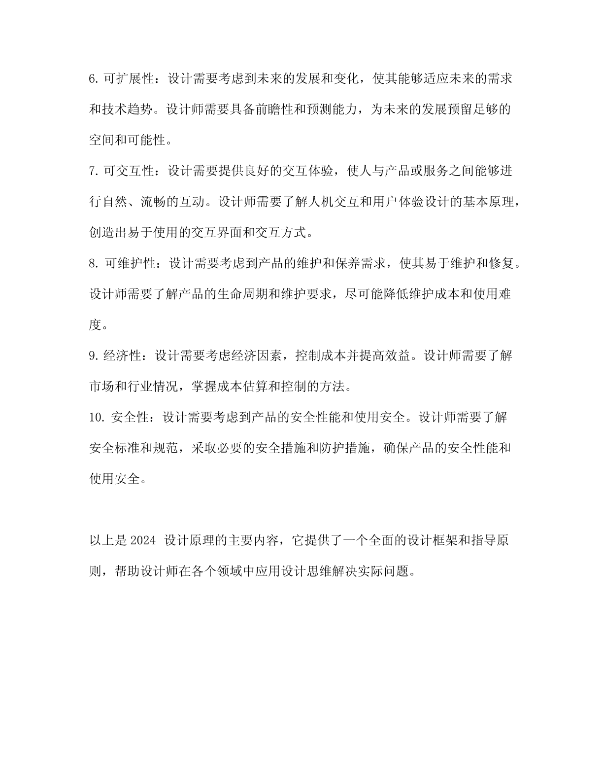 2024设计原理2024设计原理是一个综合性的设计理论体系,它涵盖了多个领域,包括建筑设计、室内设计、工业设计、平面设计等。这个原理强调的是设计的过程和方法,以及如何将设计思维应用到实际问题中。以下是2024设计原理的主要内容:1.以用户为中心:设计始终以用户的需求和体验为出发点,通过深入了解用户的需求和行为,创造出真正满足用户需求的产品或服务。2.创新性:设计需要打破传统思维模式,寻求新的解决方案和创新点。设计师需要具备创新思维和创新能力,不断探索新的设计理念和技术。3.功能性:设计需要满足实际功能需求,确保产品或服务能够在实际使用中发挥应有的作用。设计师需要考虑到产品的结构、材料、工艺等方面的因素,确保产品的功能性得到充分实现。4.美学性:设计需要注重美学表现,创造出令人愉悦的视觉效果和情感体验。设计师需要具备审美能力和艺术修养,掌握色彩、形态、质感等方面的美学要素。5.可持续性:设计需要考虑到环境和社会的影响,采用可持续发展的理念和方法。设计师需要了解环保材料和技术,尽可能减少对环境的负面影响。6.可扩展性:设计需要考虑到未来的发展和变化,使其能够适应未来的需求和技术趋势。设计师需要具备前瞻性和预测能力,为未来的发展预留足够的空间和可能性。7.可交互性:设计需要提供良好的交互体验,使人与产品或服务之间能够进行自然、流畅的互动。设计师需要了解人机交互和用户体验设计的基本原理,创造出易于使用的交互界面和交互方式。8.可维护性:设计需要考虑到产品的维护和保养需求,使其易于维护和修复。设计师需要了解产品的生命周期和维护要求,尽可能降低维护成本和使用难度。9.经济性:设计需要考虑经济因素,控制成本并提高效益。设计师需要了解市场和行业情况,掌握成本估算和控制的方法。10.安全性:设计需要考虑到产品的安全性能和使用安全。设计师需要了解安全标准和规范,采取必要的安全措施和防护措施,确保产品的安全性能和使用安全。以上是2024设计原理的主要内容,它提供了一个全面的设计框架和指导原则,帮助设计师在各个领域中应用设计思维解决实际问题。