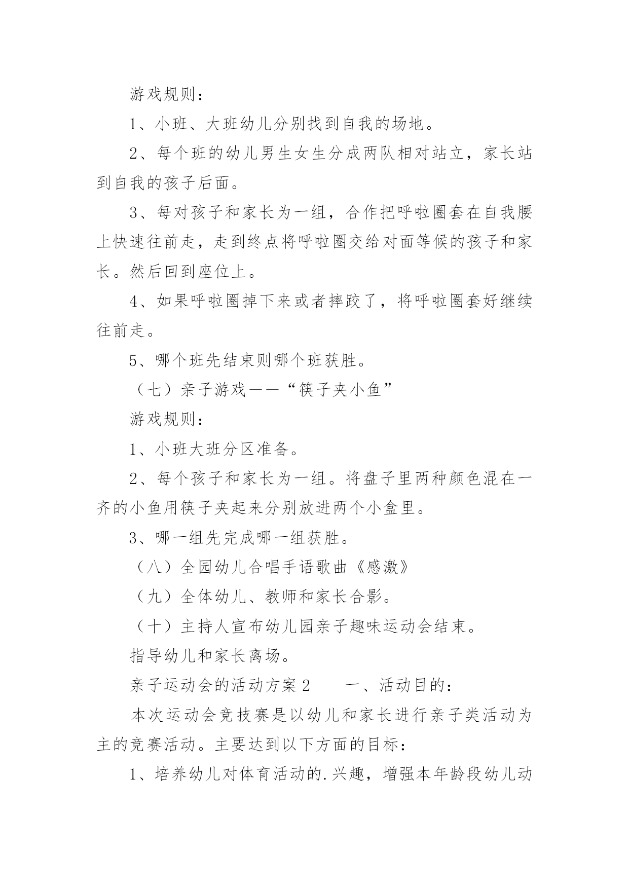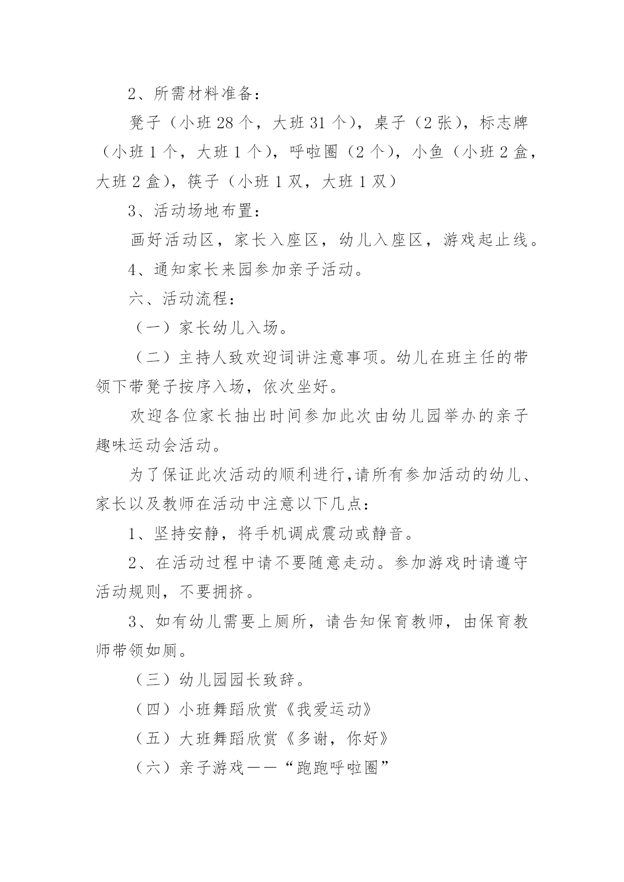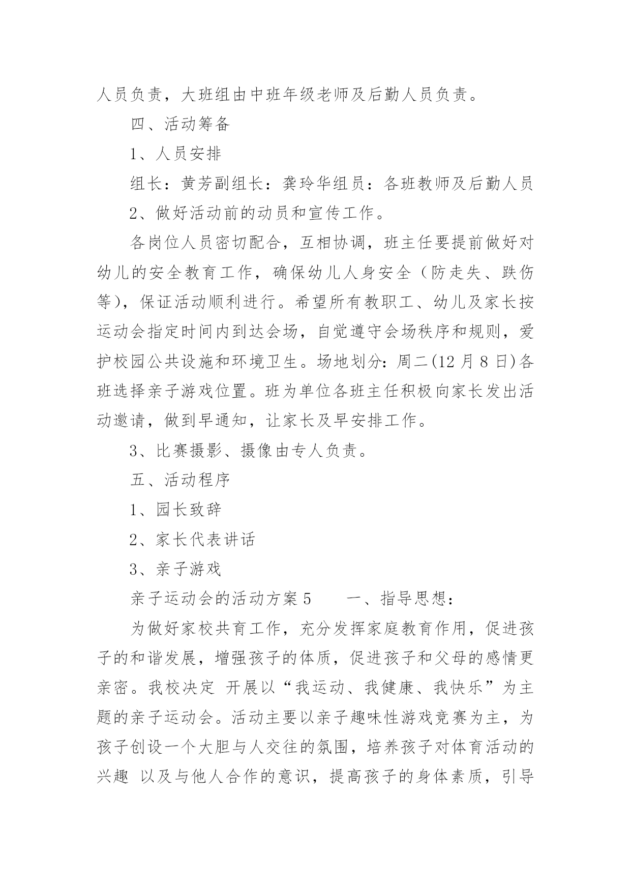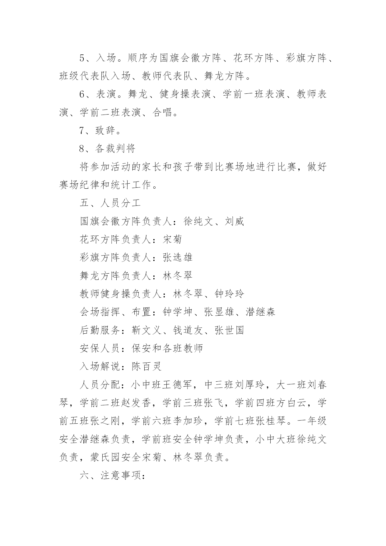 亲子运动会的活动方案亲子运动会的活动方案(通用6篇)为有力保证活动开展的质量水平,我们需要提前开始活动方案制定工作,活动方案是综合考量活动相关的因素后所制定的书面计划。活动方案应该怎么制定才好呢?以下是小编帮大家整理的亲子运动会的活动方案(通用6篇),希望能够帮助到大家。亲子运动会的活动方案1一、活动背景:幼儿园这一学期开园已有,为了让家长对幼儿在园情景有一个更全面的了解,也为了增进亲子之间的感情。我园准备举办这次冬季亲子趣味运动会。经过好玩的亲子游戏,体验活动所带来的乐趣,增进幼儿与家人之间的.情感。同时增进家长和教师之间的沟通,促进家园合作,共同呵护幼儿成长。二、活动时间:20xx年12月18日三、活动地点:四、活动目标:经过幼儿歌舞表演,展示幼儿在园学习成果。开展亲子游戏,加强家长与子女之间的情感交流。增加教师与家长之间的沟通机会。五、活动准备:1、制定好亲子活动方案。2、所需材料准备:凳子(小班28个,大班31个),桌子(2张),标志牌(小班1个,大班1个),呼啦圈(2个),小鱼(小班2盒,大班2盒),筷子(小班1双,大班1双)3、活动场地布置:画好活动区,家长入座区,幼儿入座区,游戏起止线。4、通知家长来园参加亲子活动。六、活动流程:(一)家长幼儿入场。(二)主持人致欢迎词讲注意事项。幼儿在班主任的带领下带凳子按序入场,依次坐好。欢迎各位家长抽出时间参加此次由幼儿园举办的亲子趣味运动会活动。为了保证此次活动的顺利进行,请所有参加活动的幼儿、家长以及教师在活动中注意以下几点:1、坚持安静,将手机调成震动或静音。2、在活动过程中请不要随意走动。参加游戏时请遵守活动规则,不要拥挤。3、如有幼儿需要上厕所,请告知保育教师,由保育教师带领如厕。(三)幼儿园园长致辞。(四)小班舞蹈欣赏《我爱运动》(五)大班舞蹈欣赏《多谢,你好》(六)亲子游戏――“跑跑呼啦圈”游戏规则:1、小班、大班幼儿分别找到自我的场地。2、每个班的幼儿男生女生分成两队相对站立,家长站到自我的孩子后面。3、每对孩子和家长为一组,合作把呼啦圈套在自我腰上快速往前走,走到终点将呼啦圈交给对面等候的孩子和家长。然后回到座位上。4、如果呼啦圈掉下来或者摔跤了,将呼啦圈套好继续往前走。5、哪个班先结束则哪个班获胜。(七)亲子游戏――“筷子夹小鱼”游戏规则:1、小班大班分区准备。2、每个孩子和家长为一组。将盘子里两种颜色混在一齐的小鱼用筷子夹起来分别放进两个小盒里。3、哪一组先完成哪一组获胜。(八)全园幼儿合唱手语歌曲《感激》(九)全体幼儿、教师和家长合影。(十)主持人宣布幼儿园亲子趣味运动会结束。指导幼儿和家长离场。亲子运动会的活动方案2一、活动目的:本次运动会竞技赛是以幼儿和家长进行亲子类活动为主的竞赛活动。主要达到以下方面的目标:1、培养幼儿对体育活动的.兴趣,增强本年龄段幼儿动作的协调性和灵活性,提高幼儿的身体素质。2、培养幼儿初步的团队意识和竞争意识,帮助幼儿懂得在活动中要合作、谦让、遵守规则,勇于克服困难,体验胜利的愉悦。3、通过幼儿和家长一起进行比赛,增进家长与子女之间的情感交流,增强老师与家长的沟通与了解。二、运动会竞技赛主题:激情冬天,你我同行,全家齐上阵,健康你我他!三、亲子运动会时间:20xx年xx月xx日四、活动流程:(一)早期准备工作1、各班根据幼儿实际选择竞技项目,准备好活动要用到的器材道具。2、加强队列训练,教会幼儿踏步走,会听老师的口令喊口号。3、对本班要采纳的项目提前演练,达到熟练。(二)活动当天安排1、早操。2、晨诵、律动。3、退场。分班组织好幼儿和家长,在指定地方排队等候出场。4、各班整理队伍准备入场,黄璜老师带领各级领导及学生家长参观蒙氏园。5、入场。顺序为国旗会徽方阵、花环方阵、彩旗方阵、班级代表队入场、教师代表队、舞龙方阵。6、表演。舞龙、健身操表演、学前一班表演、教师表演、学前二班表演、合唱。7、致辞。8、各裁判将将参加活动的家长和孩子带到比赛场地进行比赛,做好赛场纪律和统计工作。五、人员分工国旗会徽方阵负责人:徐纯文、刘威花环方阵负责人:宋菊彩旗方阵负责人:张选雄舞龙方阵负责人:林冬翠教师健身操负责人:林冬翠、钟玲玲会场指挥、布置:钟学坤、张显雄、潜继森后勤服务:靳文义、钱道友、张世国安保人员:保安和各班教师入场解说:陈百灵人员分配:小中班王德军,中三班刘厚玲,大一班刘春琴,学前二班赵发香,学前三班张飞,学前四班方白云,学前五班张之刚,学前六班李加珍,学前七班张桂琴。一年级安全潜继森负责,学前班安全钟学坤负责,小中大班徐纯文负责,蒙氏园安全宋菊、林冬翠负责。六、注意事项:1、各班做好安全、纪律、环保教育,活动期间不得乱跑,在指定区候赛,加油、鼓励方法合理。2、各班主任做好队员及家长的组织工作,按时参加比赛,一年级操后进教