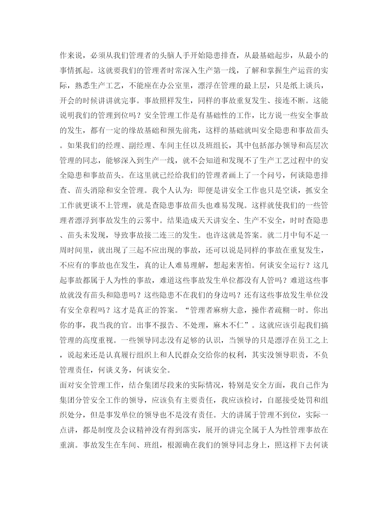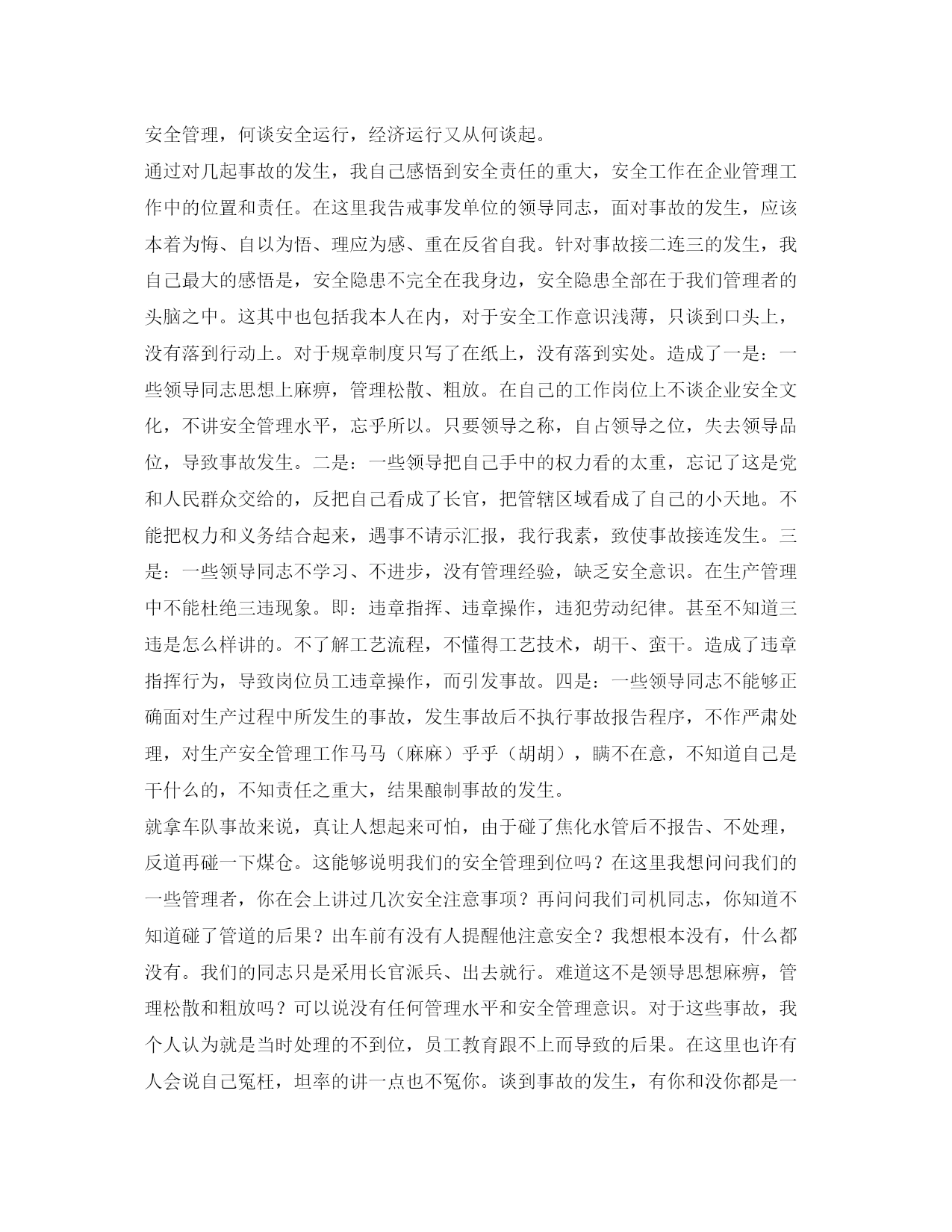 此资料由网络收集而来,如有侵权请告知上传者立即删除。资料共分享,我们负责传递知识。安全事故感悟安全运行是企业运营的主弦,经济运行是企业发展的支柱,科学进步是企业发展的基础,人是企业运行可靠的保证力量。成功的企业家(董事长原贵生)常常提到:“安全运行、经济运行”。为什么把安全运行提到前面,这就是他多少年来总结的成功经验之一。在企业运行中,只有安全运行才能保证企业的平稳发展,只有保证设备和人身安全才是企业运行中各项工作顺利进行的可靠保证。发展中的企业,在安全工作上要看起点位置,再看管理水平。如果起于零点,注重企业安全文化的发展,把先进的企业安全文化渗透到企业管理中,选用一批有文化素养,有企业管理经验和安全管理水平的人,执掌着企业运营方向,制定和完善相关的管理制度。特别是安全管理方面,利用制度及条例规范管理者的行为,把制度落到实处,就不怕没有安全保证。一位著名的企业家讲过:“制度其实很简单,只要有几张纸,有一支笔,有几位领导坐在一起,你三言,他两语,组织成文字,写在纸上,挂在墙上就是制度成立。再是让大家讨论,都来提出合理化意见和建议,这就叫修改和完善”。这些工作都是简单不过的管理工作,在企业管理中关键不是制度,而是落实。我们的董事长在多少次会议上讲过,“开会安排布置只是完成了整个工作的5%,但行动和落实就占到工作总任务的95%”,这充分说明了制度确定和建立的简单性与落实的重要性。反过来讲,制度的落实靠的是人,主要依靠企业管理中的高层、中层和基层领导,当领导的就必须深入生产第一线,了解和掌握生产规律,熟悉和知道生产工艺过程,实实在在的做好生产过程中管理工作,只有这样才能把开会精神及制度落实到实处。安全是一切工作的生命线,企业管理离开安全是没有发展保证的。就安全管理工作来说,必须从我们管理者的头脑人手开始隐患排查,从最基础起步,从最小的事情抓起。这就要我们的管理者时常深入生产第一线,了解和掌握生产运营的实际,熟悉生产工艺,不能座在办公室里,漂浮在管理的最上层,只是纸上谈兵,开会的时候讲讲就完事。事故照样发生,同样的事故重复发生、接连不断。这能说明我们的管理到位吗?安全管理工作是有基础性的工作,比方说一些安全事故的发生,都有一定的缘故基础和预先前兆,这样的基础就叫安全隐患和事故苗头。如果我们的经理、副经理、车间主任以及班组长,其中包括部办领导和高层次管理的同志,能够深入到生产一线,就不会知道和发现不了生产工艺过程中的安全隐患和事故苗头。在这里就已经给我们的管理者画上了一个问号,何谈隐患排查、苗头消除和安全管理。我个人认为:即便是讲安全工作也只是空谈,抓安全工作就更谈不上管理,就是查隐患事故苗头也难易发现。这样就使我们的一些管理者漂浮到事故发生的云雾中。结果造成天天讲安全、生产不安全,时时查隐患、苗头未发现,导致事故接二连三的发生。也许这就是答案。就二月中旬不足一周时间里,就出现了三起不应出现的事故,还可以说是同样的事故在重复发生,不应有的事故也在发生,真的让人难易理解,想起来害怕。何谈安全运行?这几起事故都属于人为性的事故,难道这些事故发生单位都没有人管吗?难道这些事故就没有苗头和隐患吗?这些隐患不在我们的身边吗?还有这些事故发生单位没有安全章程吗?这才是真正的答案。“管理者麻痹大意,操作者疏糊一时。你出你的事,我当我的官。出事不报告、不处理,麻木不仁”。这就应该引起我们搞管理的高度重视。一些领导同志没有足够的认识,当领导的只是漂浮在员工之上,说起来还是认真履行组织上和人民群众交给你的权利,其实没领导职责,不负管理责任,何谈义务,何谈安全。面对安全管理工作,结合集团尽段来的实际情况,特别是安全方面,我自己作为集团分管安全工作的领导,应该负有主要责任,我应该检讨,自愿接受处罚和组织处分,但是事发单位的领导也不是没有责任。大的讲属于管理不到位,实际一点讲,都是制度及会议精神没有得到落实,展开的讲完全属于人为性管理事故在重演。事故发生在车间、班组,根源确在我们的领导同志身上,照这样下去何谈安全管理,何谈安全运行,经济运行又从何谈起。通过对几起事故的发生,我自己感悟到安全责任的重大,安全工作在企业管理工作中的位置和责任。在这里我告戒事发单位的领导同志,面对事故的发生,应该本着为悔、自以为悟、理应为感、重在反省自我。针对事故接二连三的发生,我自己最大的感悟是,安全隐患不完全在我身边,安全隐患全部在于我们管理者的头脑之中。这其中也包括我本人在内,对于安全工作意识浅薄,只谈到口头上,没有落到行动上。对于规章制度只写了在纸上,没有落到实处。造成了一是:一些领导同志思想上麻痹,管理松散、粗放。在自己的工作岗位上不谈企业安全文化,不讲安全管理水平,忘乎所以。只要领导之称,自占领导之位,失去领导品位,导致事故发生。二是:一些领导把自己手中