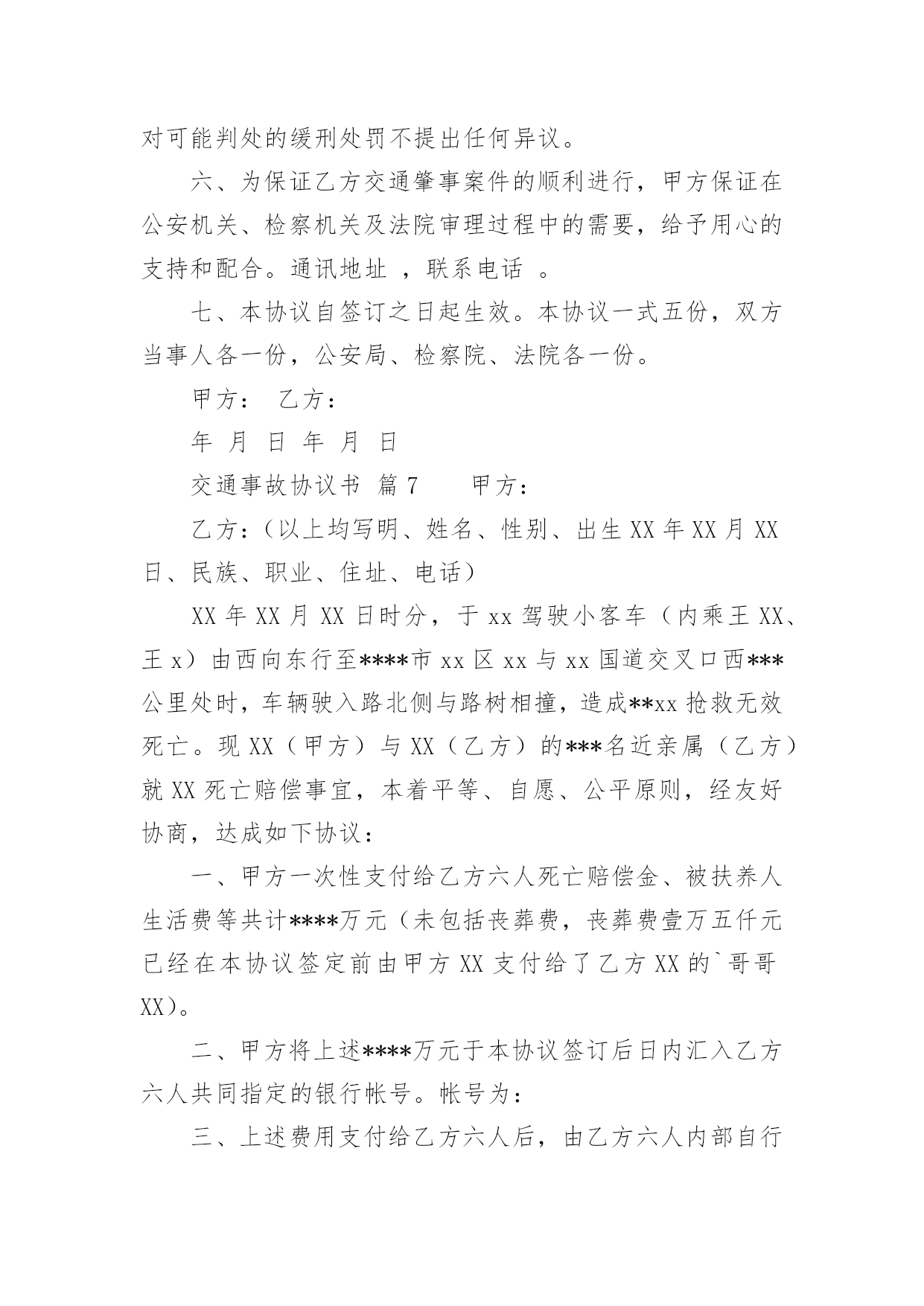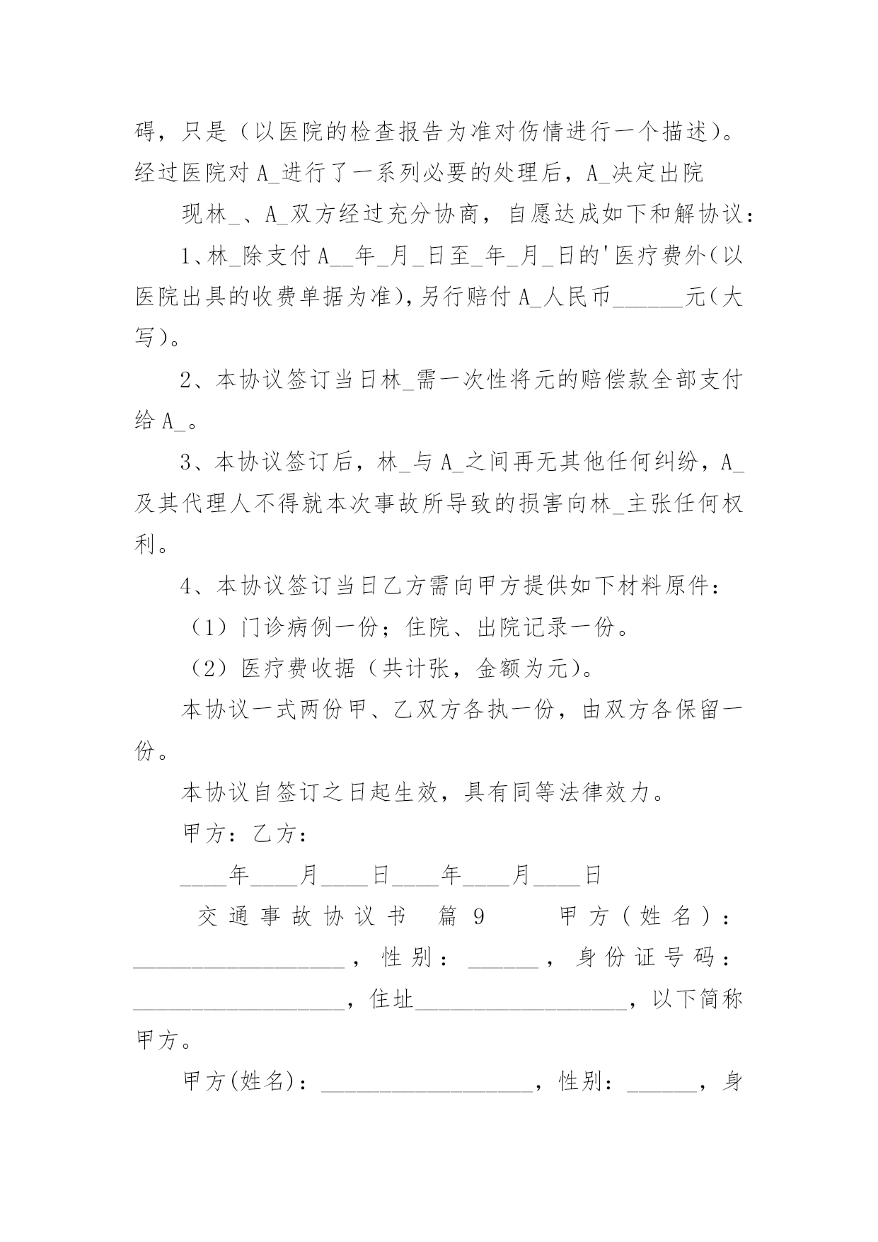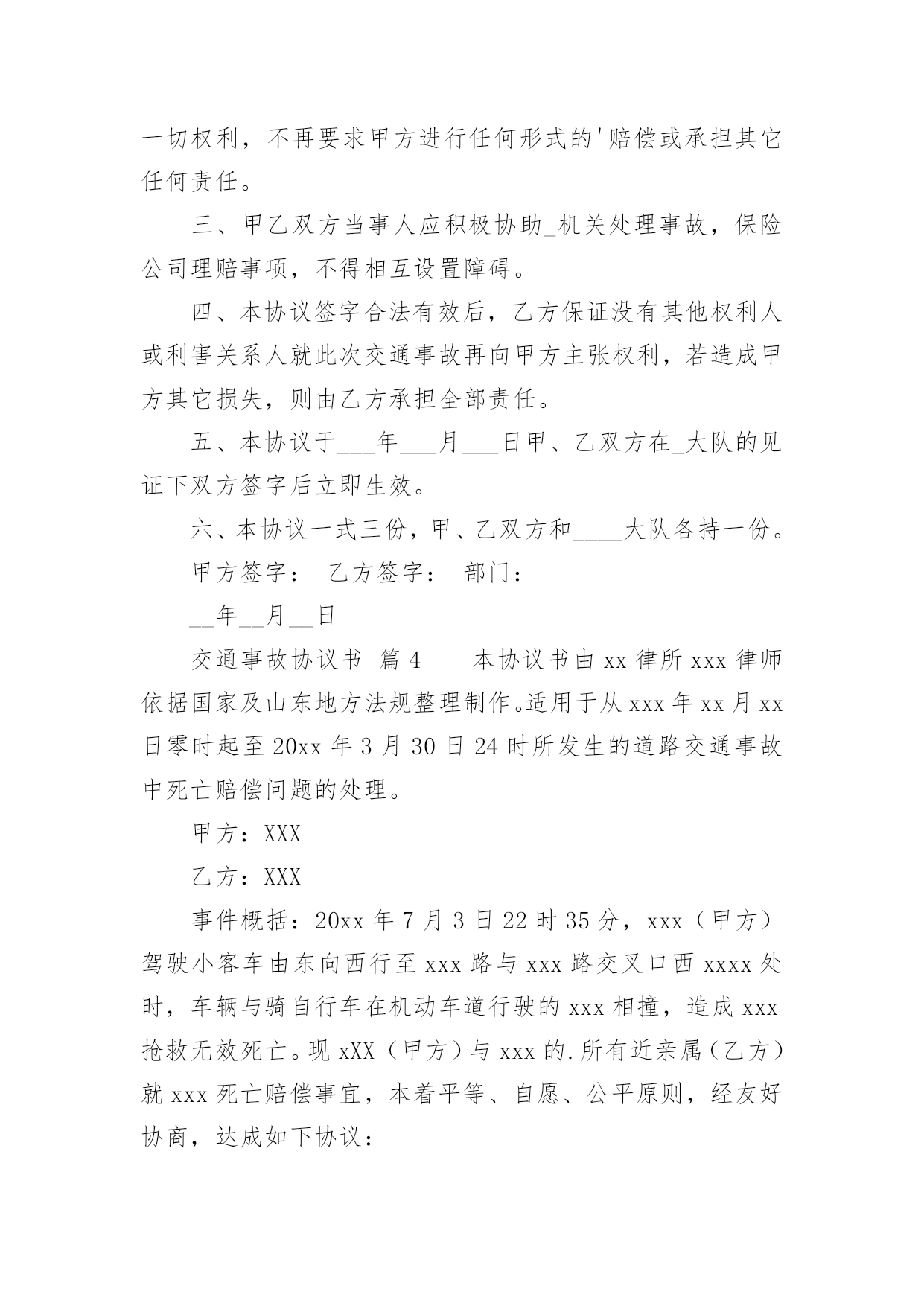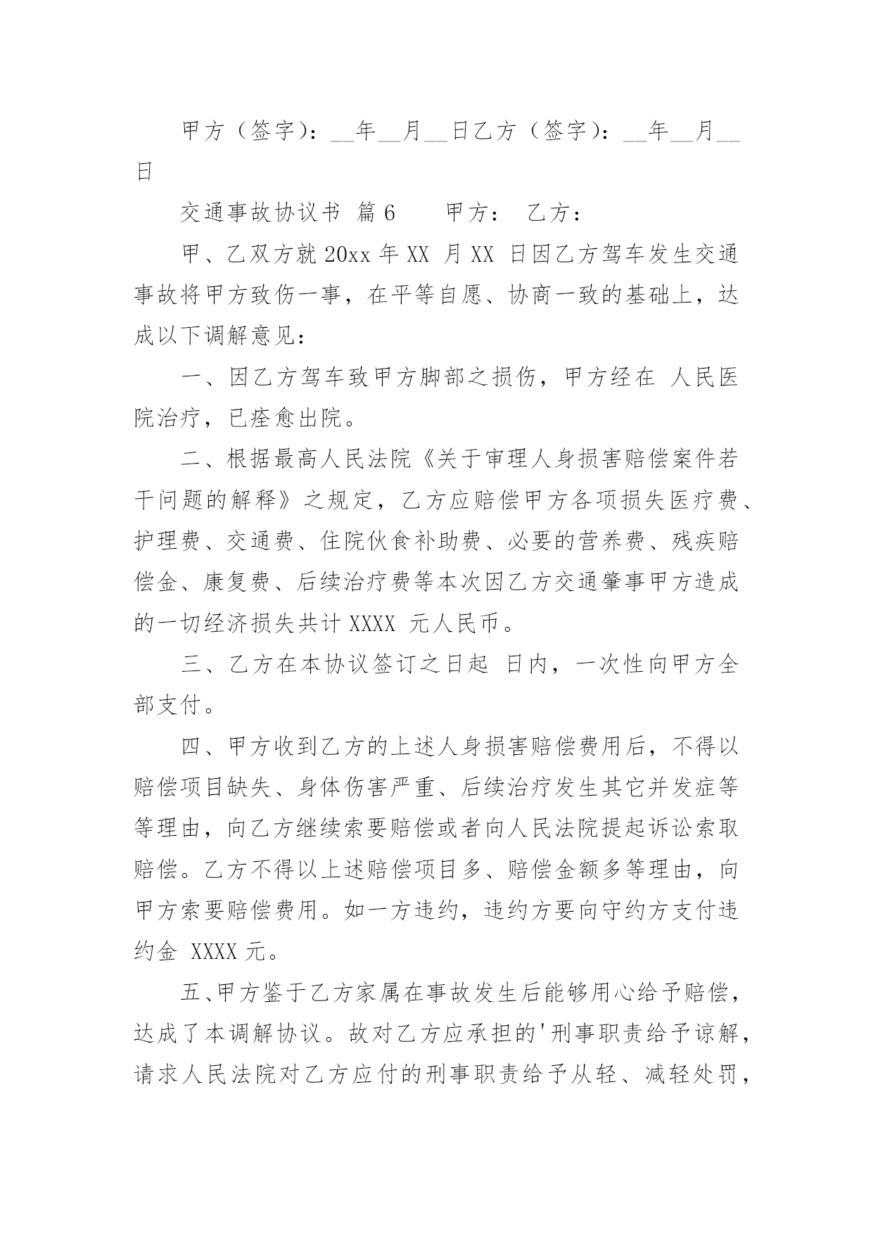 交通事故协议书交通事故协议书(精华)随着社会一步步向前发展,越来越多人会去使用协议,签订协议可解决或预防不必要的纠纷。相信很多朋友都对拟协议感到非常苦恼吧,以下是小编精心整理的交通事故协议书,欢迎大家借鉴与参考,希望对大家有所帮助。交通事故协议书篇1甲方:乙方:依据《侵权责任法》等相关法律规定,甲乙双方就路人甲在交通事故中发生人身损害赔偿事宜达成一次性赔偿协议书,供双方谨守遵行:一、甲方一次性赔偿乙方币156400元。一次性赔偿包含但不限于乙方的`医疗费、误工费、护理费、交通费、住院伙食补助费、营养费、伤残赔偿金和精神抚慰金。一次性赔偿金采用银行转账(金额较大时建议采用银行转账)方式支付给乙方;乙方在协议书上签字时应亲笔书写一份收条。二、乙方承诺:1、赔偿协议书签字且收到上述赔偿金之日起,因该起交通事故引起的民事赔偿事宜终结,双方再无其他任何纠纷。乙方及其亲属不得再以诉讼、非诉讼方式向甲方主张任何权利。2、乙方需向甲方提供身份证复印件、门诊病历、处方、住院病案、费用明细清单、诊断证明书、医疗费收据等保险理赔资料。乙方保证提供的全部资料具有真实性、合法性、完整性。乙方需提供其名下的银行账户:因乙方过错提供银行账户引起的纠纷由乙方自行解决且甲方无需再次支付赔偿金(银行转账用)。三、本协议书自签字之日起生效。协议书一式三份,甲方执两份、乙方执一份,每份具有同等法律效力。甲方:乙方:日期:交通事故协议书篇2甲方:___________,性别:____,年龄:____,___________村人。乙方:___________,性别:____,年龄:____,___________学校,学员(原籍___________乡___________村)。交通事故基本事实及双方责任:_____年_____月_____日18时30分,甲方___________驾驶___________与乙方___________驾驶的.___________在___________乡___________村___________路段发生相撞导致交通事故,造成乙方___________受伤,摩托车损害。经___________市公安局交通警察支队___________队第2702123号《交通事故认定书》认定:双方负同等责任。经甲、乙双方充分协商一致达成如下协议:一、甲方___________自愿赔偿给乙方___________各项损失共计壹万元人民币(包括已经支付的7000元)。二、第一项的损失赔偿包括车辆损失赔偿。三、本协议签定时,甲方必须支付给乙方所剩余的3000元。四、本协议所涉及的赔偿是一次性终结赔偿。五、本协议自双方当事人签名按印后生效。六、本协议一式二份双方各存一份。协议人:___________甲方:___________乙方:________________年_____月_____日交通事故协议书篇3甲方:___,男,身份证号码:,住址,以下简称甲方。乙方:___,男,身份证号码:,住址,以下简称乙方。甲乙双方在平等、自愿的基础上,本着公平公正,合理合法,以人为本的原则,就___年___月___日在___地段发生的道路交通事故,就交通事故所造成的损害达成赔偿协议如下:一、甲方自愿一次性赔偿乙方各种法定人身损害赔偿项目共计人民币大写:___(小写:___元)。二、乙方同意接受上述赔偿款项,并放弃对甲方的其它一切权利,不再要求甲方进行任何形式的'赔偿或承担其它任何责任。三、甲乙双方当事人应积极协助_机关处理事故,保险公司理赔事项,不得相互设置障碍。四、本协议签字合法有效后,乙方保证没有其他权利人或利害关系人就此次交通事故再向甲方主张权利,若造成甲方其它损失,则由乙方承担全部责任。五、本协议于___年___月___日甲、乙双方在_大队的见证下双方签字后立即生效。六、本协议一式三份,甲、乙双方和____大队各持一份。甲方签字:乙方签字:部门:__年__月__日交通事故协议书篇4本协议书由xx律所xxx律师依据国家及山东地方法规整理制作。适用于从xxx年xx月xx日零时起至20xx年3月30日24时所发生的道路交通事故中死亡赔偿问题的处理。甲方:XXX乙方:XXX事件概括:20xx年7月3日22时35分,xxx(甲方)驾驶小客车由东向西行至xxx路与xxx路交叉口西xxxx处时,车辆与骑自行车在机动车道行驶的xxx相撞,造成xxx抢救无效死亡。现xXX(甲方)与xxx的.所有近亲属(乙方)就xxx死亡赔偿事宜,本着平等、自愿、公平原则,经友好协商,达成如下协议:一、甲方一次性支付给乙方所有近亲属死亡赔偿金、被扶养人生活费、老人赡养费、交通费、误工费、丧葬费、医疗费等共计贰拾贰万元。二、甲方将上述贰拾贰万元于本协议签订后xx日内汇入乙方所有近亲属共同指定的