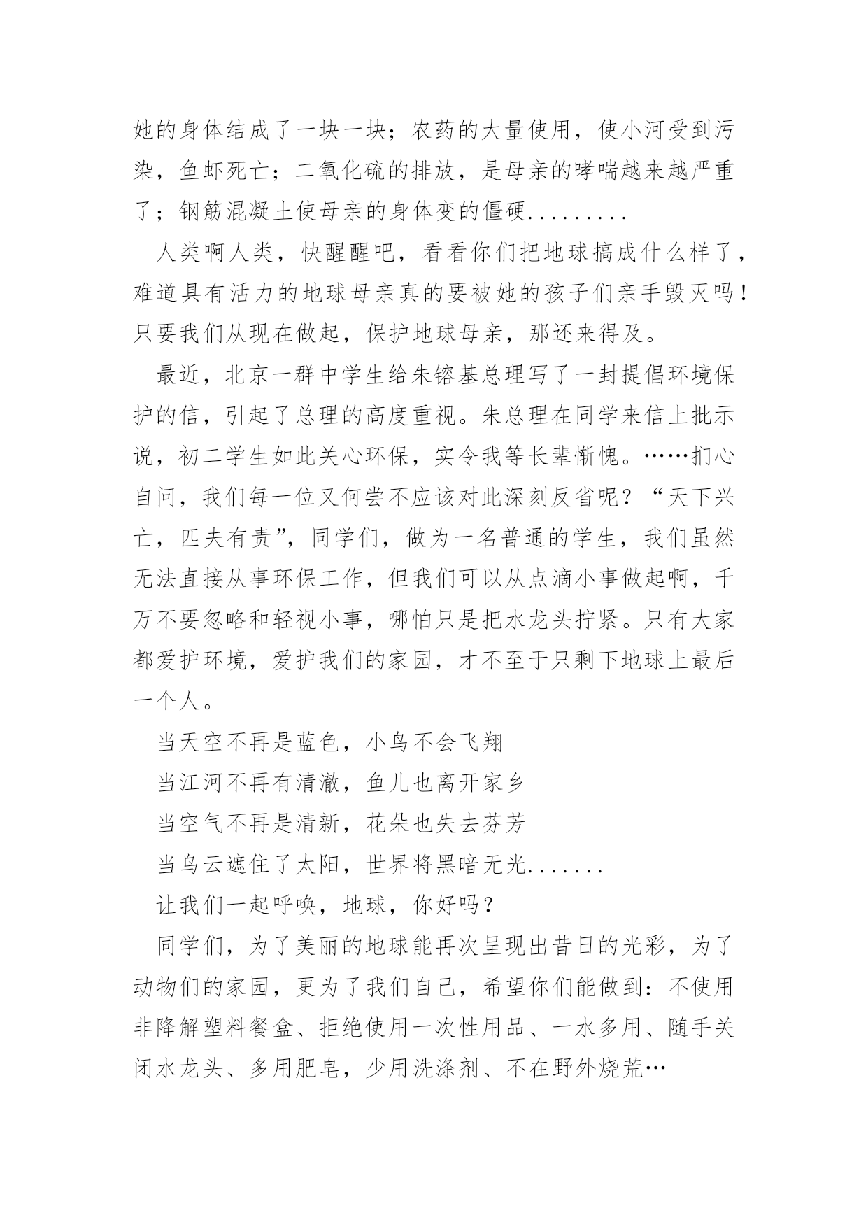 争做环保小卫士争做环保小卫士争作环保小卫士我热爱地球,热爱我们赖以生存的家园。爱她的青山绿水,爱她的碧草蓝天……在四野飘香的花丛中,我和蝶儿一起嬉戏、欢笑;在郁郁葱葱的森林里,我与小鸟一起追逐、歌唱;清晨,我迈着轻盈的步履去原野上踏青,雾霭缭绕着、白纱般的柔柔地漂浮在空中。吮吸着花草的芳香,欣享着阳光的沐浴,我被陶醉在这如痴如醉的梦幻里;夜晚,我在阳台上仰望着璀璨的星空,朦胧的月色照映着世界的每一个角落,使我仿佛置身于一个童话般的天堂.........曾经的地球是一个美丽的蓝色水球,外围弥漫着一层神秘的薄纱,正是因为这样人类才能在这里繁衍生息,安居乐业。可是不知道过了多少年,昔日蓝色的美丽星球就快要变成了一个千疮百孔的灰色星球,毫无生机,这可都要“归功”于人类的建设!与其说建设,不如说是慢性毁灭。人类的滥砍乱伐是土壤沙漠化;人类的大肆捕杀野生动物是稀有物种濒临灭绝;人类使用的含氟冰箱,使臭氧层空洞;人类因为燃料的过度燃烧,使全球气候变暖.........这一切的一切都是人类的杰作!但人类却丝毫没有悔改的意思,继续为了一己私利破坏我们的地球母亲:化工厂排放的废水整天往母亲的嘴里到,使她的身体结成了一块一块;农药的大量使用,使小河受到污染,鱼虾死亡;二氧化硫的排放,是母亲的哮喘越来越严重了;钢筋混凝土使母亲的身体变的僵硬.........人类啊人类,快醒醒吧,看看你们把地球搞成什么样了,难道具有活力的地球母亲真的要被她的孩子们亲手毁灭吗!只要我们从现在做起,保护地球母亲,那还来得及。最近,北京一群中学生给朱镕基总理写了一封提倡环境保护的信,引起了总理的高度重视。朱总理在同学来信上批示说,初二学生如此关心环保,实令我等长辈惭愧。……扪心自问,我们每一位又何尝不应该对此深刻反省呢?“天下兴亡,匹夫有责”,同学们,做为一名普通的学生,我们虽然无法直接从事环保工作,但我们可以从点滴小事做起啊,千万不要忽略和轻视小事,哪怕只是把水龙头拧紧。只有大家都爱护环境,爱护我们的家园,才不至于只剩下地球上最后一个人。当天空不再是蓝色,小鸟不会飞翔当江河不再有清澈,鱼儿也离开家乡当空气不再是清新,花朵也失去芬芳当乌云遮住了太阳,世界将黑暗无光.......让我们一起呼唤,地球,你好吗?同学们,为了美丽的地球能再次呈现出昔日的光彩,为了动物们的家园,更为了我们自己,希望你们能做到:不使用非降解塑料餐盒、拒绝使用一次性用品、一水多用、随手关闭水龙头、多用肥皂,少用洗涤剂、不在野外烧荒…我国素以“礼仪之邦”著称于世,讲“仁爱”、行“友善”、重“人和”的传统美德。我们新一代的中学生应该传承这些传统美德、今天要为构建一个和谐的校园努力,明天我们要为构建一个和谐的社会而付出,这是历史付与给我们的重任!这是时代付与给我们的使命!让我们携手并肩,争做环保小卫士,为我们的地球母亲增添一抹绿色吧!
