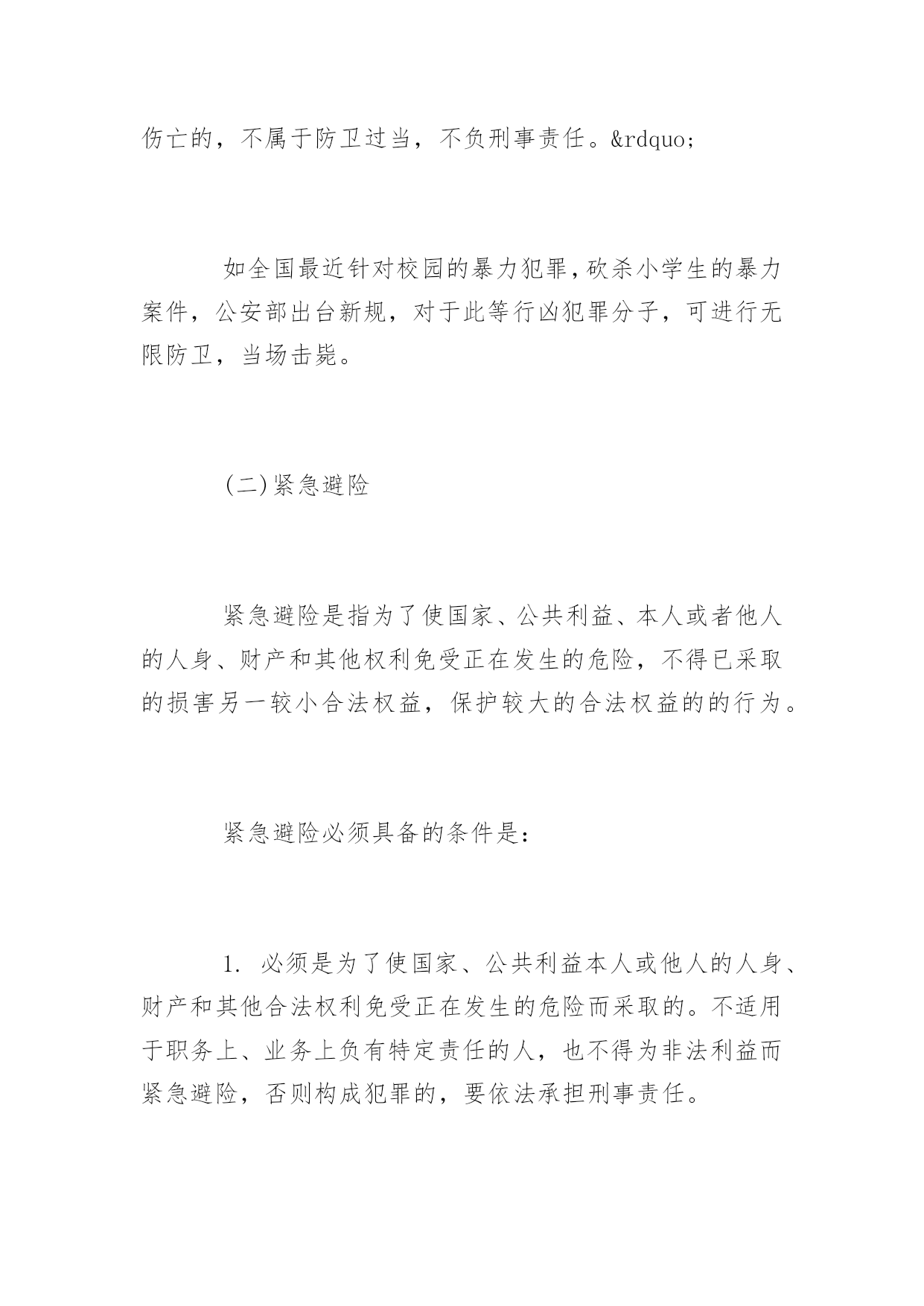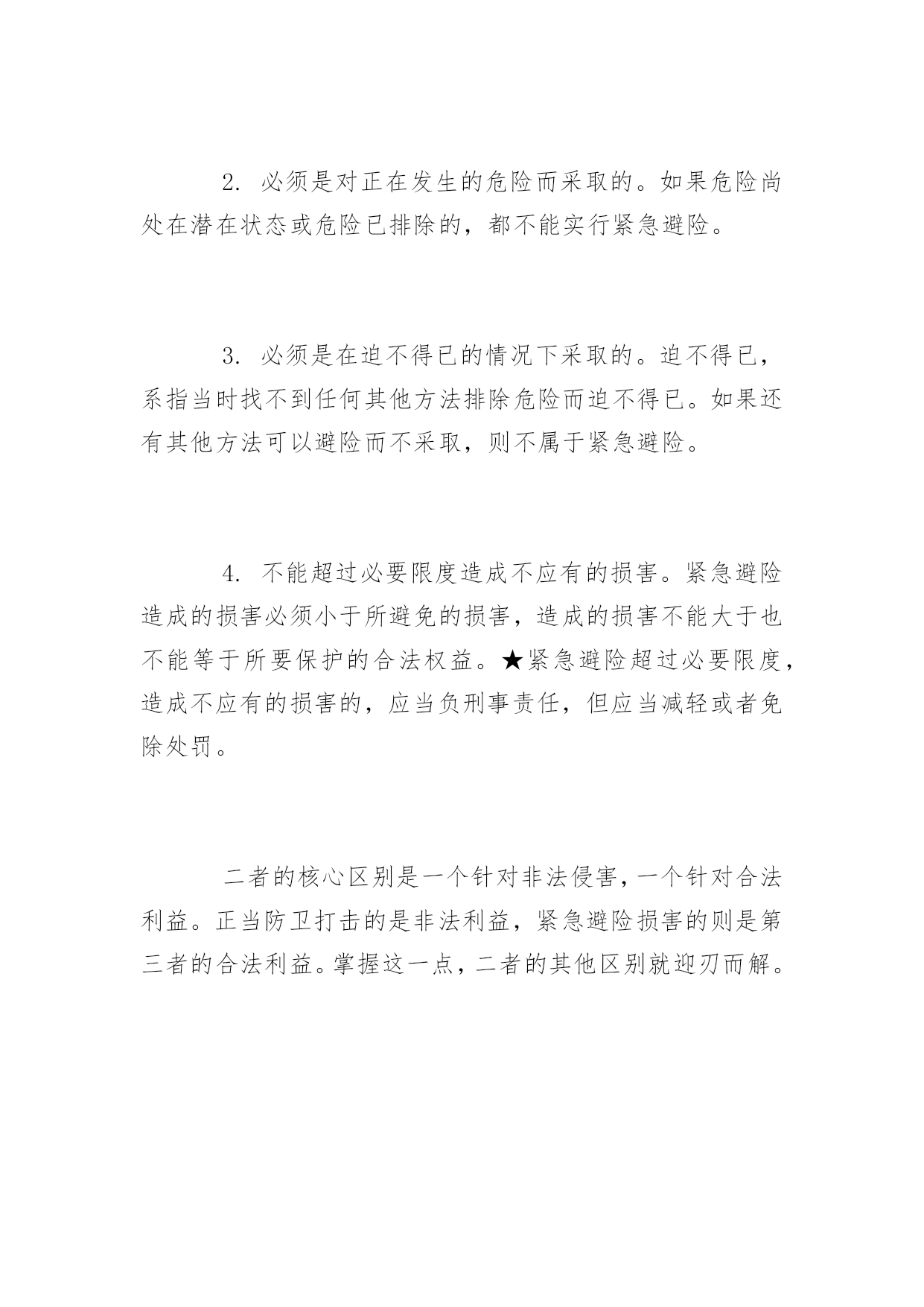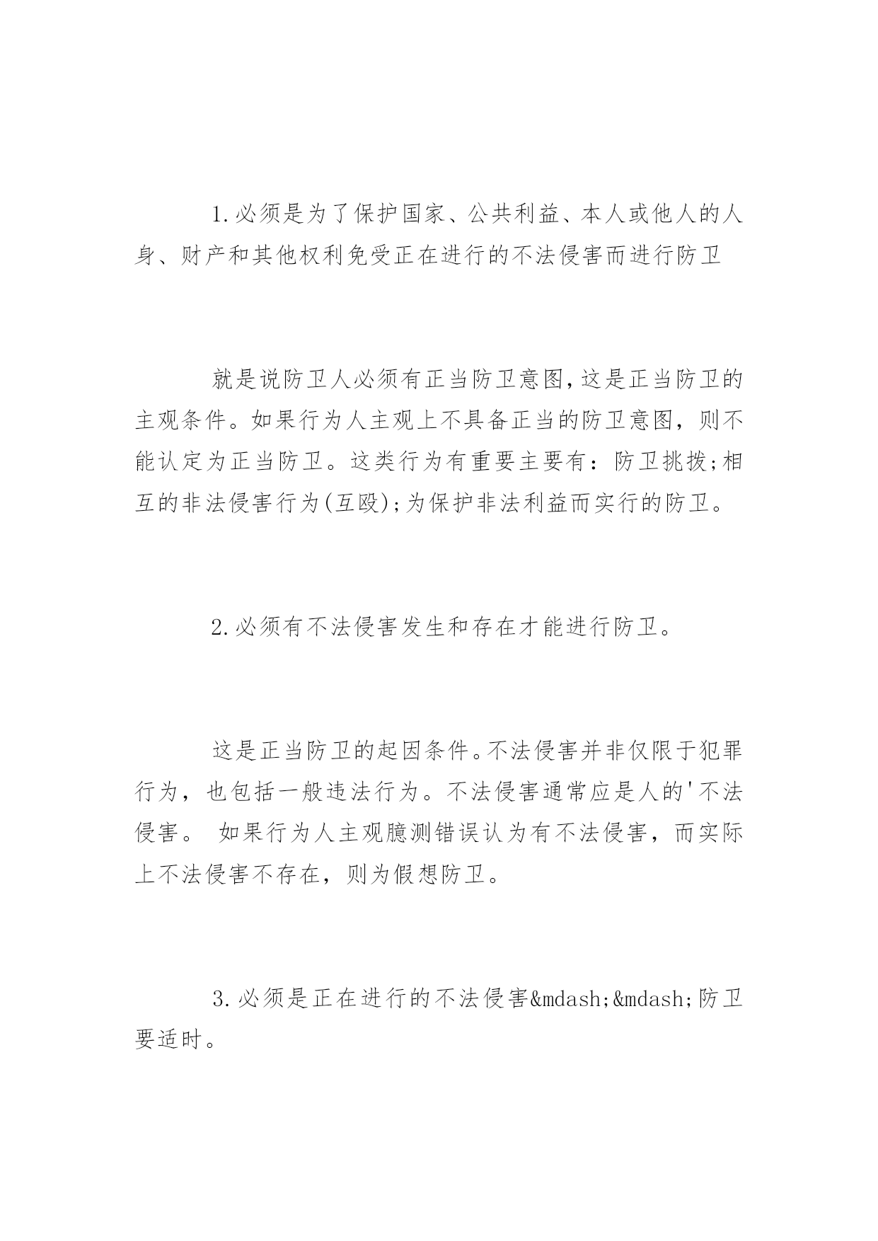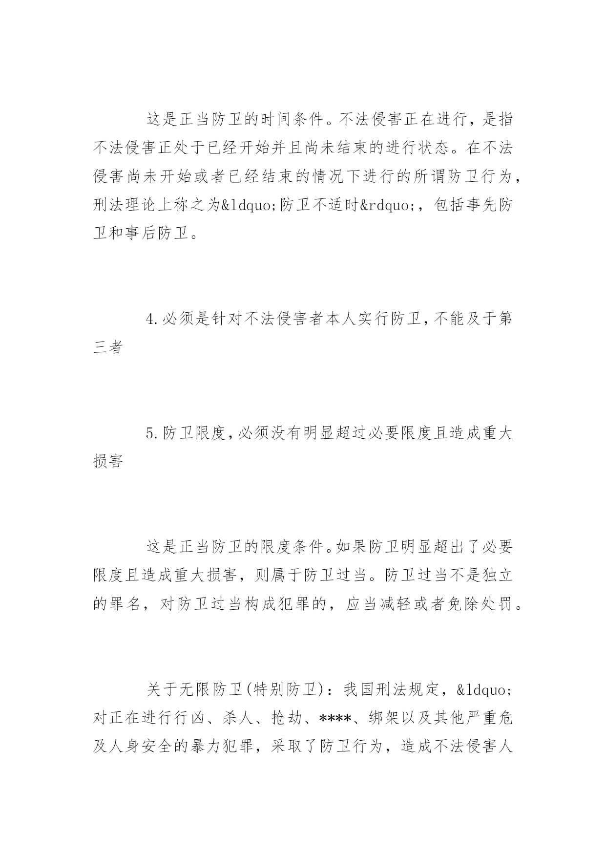 价格鉴证师考点讲义:正当防卫2017年价格鉴证师考点讲义:正当防卫导语:为了使国家、公共利益、本人或者他人的人身、财产和其他权利免受正在进行的不法侵害,而采取的制止不法侵害的行为,对不法侵害人造成损害的,属于正当防卫,不负刑事责任。(一)正当防卫是指为了使国家、公共利益、本人或者他人的人身、财产和其他权利免受正在进行的不法侵害,而对不法侵害者所实施的未明显超过必要限度造成重大损害的防卫行为。在我国,正当防卫既是法律赋予一切公民的一项合法权益,又是法律规定某些特定社会成员应尽的法律义务。正当防卫必须具备的条件:1.必须是为了保护国家、公共利益、本人或他人的人身、财产和其他权利免受正在进行的不法侵害而进行防卫就是说防卫人必须有正当防卫意图,这是正当防卫的主观条件。如果行为人主观上不具备正当的防卫意图,则不能认定为正当防卫。这类行为有重要主要有:防卫挑拨;相互的非法侵害行为(互殴);为保护非法利益而实行的防卫。2.必须有不法侵害发生和存在才能进行防卫。这是正当防卫的起因条件。不法侵害并非仅限于犯罪行为,也包括一般违法行为。不法侵害通常应是人的'不法侵害。如果行为人主观臆测错误认为有不法侵害,而实际上不法侵害不存在,则为假想防卫。3.必须是正在进行的不法侵害——防卫要适时。这是正当防卫的时间条件。不法侵害正在进行,是指不法侵害正处于已经开始并且尚未结束的进行状态。在不法侵害尚未开始或者已经结束的情况下进行的所谓防卫行为,刑法理论上称之为“防卫不适时”,包括事先防卫和事后防卫。4.必须是针对不法侵害者本人实行防卫,不能及于第三者5.防卫限度,必须没有明显超过必要限度且造成重大损害这是正当防卫的限度条件。如果防卫明显超出了必要限度且造成重大损害,则属于防卫过当。防卫过当不是独立的罪名,对防卫过当构成犯罪的,应当减轻或者免除处罚。关于无限防卫(特别防卫):我国刑法规定,“对正在进行行凶、杀人、抢劫、****、绑架以及其他严重危及人身安全的暴力犯罪,采取了防卫行为,造成不法侵害人伤亡的,不属于防卫过当,不负刑事责任。”如全国最近针对校园的暴力犯罪,砍杀小学生的暴力案件,公安部出台新规,对于此等行凶犯罪分子,可进行无限防卫,当场击毙。(二)紧急避险紧急避险是指为了使国家、公共利益、本人或者他人的人身、财产和其他权利免受正在发生的危险,不得已采取的损害另一较小合法权益,保护较大的合法权益的的行为。紧急避险必须具备的条件是:1.必须是为了使国家、公共利益本人或他人的人身、财产和其他合法权利免受正在发生的危险而采取的。不适用于职务上、业务上负有特定责任的人,也不得为非法利益而紧急避险,否则构成犯罪的,要依法承担刑事责任。2.必须是对正在发生的危险而采取的。如果危险尚处在潜在状态或危险已排除的,都不能实行紧急避险。3.必须是在迫不得已的情况下采取的。迫不得已,系指当时找不到任何其他方法排除危险而迫不得已。如果还有其他方法可以避险而不采取,则不属于紧急避险。4.不能超过必要限度造成不应有的损害。紧急避险造成的损害必须小于所避免的损害,造成的损害不能大于也不能等于所要保护的合法权益。★紧急避险超过必要限度,造成不应有的损害的,应当负刑事责任,但应当减轻或者免除处罚。二者的核心区别是一个针对非法侵害,一个针对合法利益。正当防卫打击的是非法利益,紧急避险损害的则是第三者的合法利益。掌握这一点,二者的其他区别就迎刃而解。