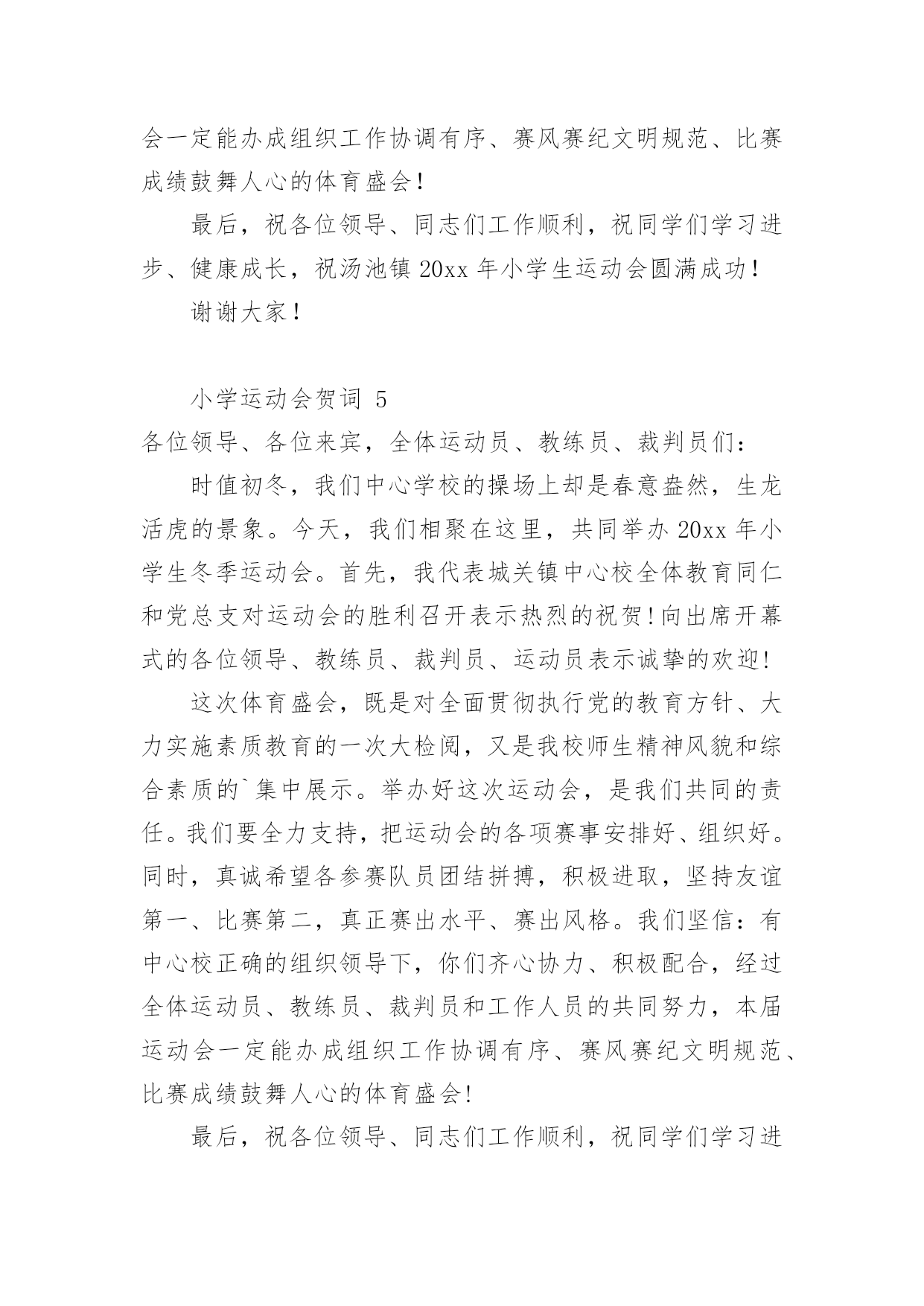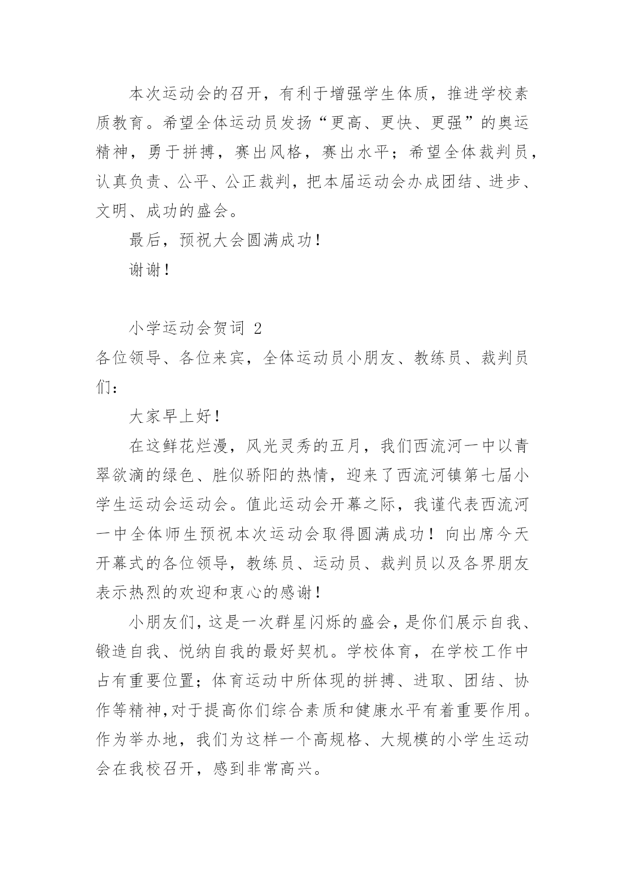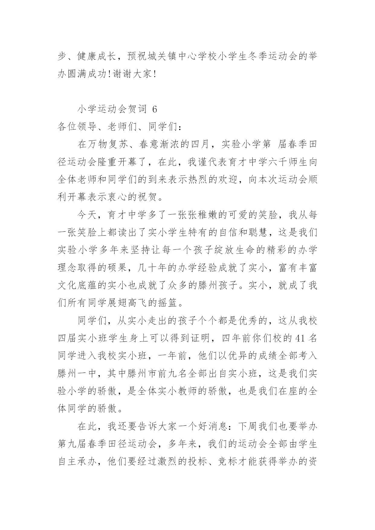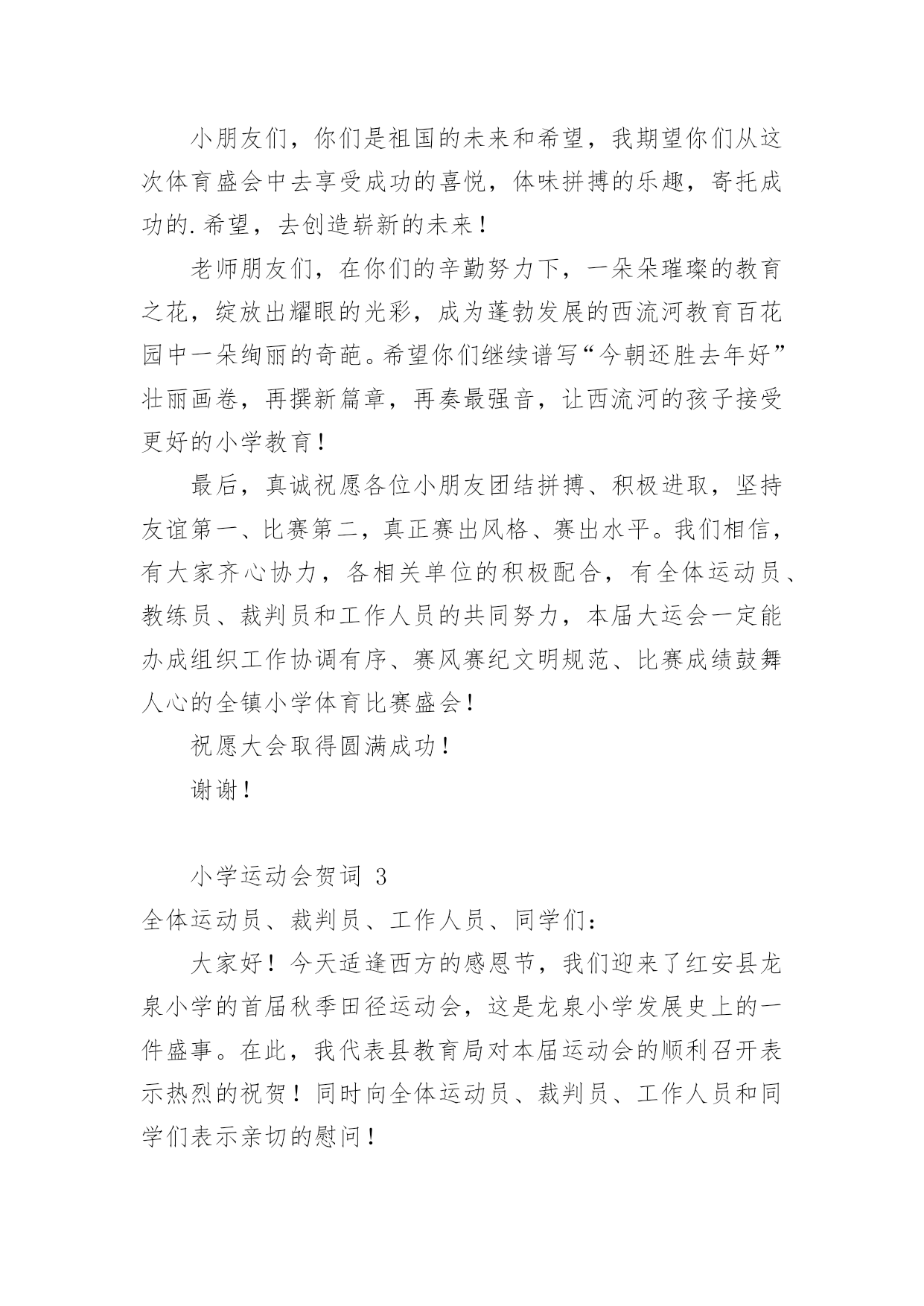 小学运动会贺词小学运动会贺词(精选15篇)在日常生活或是工作学习中,许多人都有过写贺词的经历,对贺词都不陌生吧,借助贺词可以表达对主人的祝贺和感谢之意。什么样的贺词才是走心的呢?下面是小编为大家整理的小学运动会贺词,希望对大家有所帮助。小学运动会贺词1各位领导、各位来宾,老师们、同学们:大家好!在这个萌生着绿色的季节,在这个孕育着希望的四月xx镇镇20xx年中小学生田径运动会贺,今天,晴空万里,清风徐徐,校园里鼓乐喧天,彩旗飘扬,xx镇中小学生田径运动会隆重开幕了。我代表xx镇党委政府向大会表示热烈的祝贺,向全体运动员、裁判员、工作人员、同学们表示亲切的慰问!21世纪是知识的世纪,是技能的世纪,更是竞争的世纪。我们必须拥有良好的心理素质、优秀的人格素质、完善的体能素质。今天,我们在田径场上竞争,明天,我们要在世界舞台上亮相;今天我们在田径场上拼搏,明天,我们将在世界大潮中冲浪。体育的精神体现了人类战胜极限的渴望,激发了人类与时俱进的.潜能。它是我们努力学习的动力,战胜困难的决心,迎接成功的自信和拥抱明天的力量。本次运动会的召开,有利于增强学生体质,推进学校素质教育。希望全体运动员发扬“更高、更快、更强”的奥运精神,勇于拼搏,赛出风格,赛出水平;希望全体裁判员,认真负责、公平、公正裁判,把本届运动会办成团结、进步、文明、成功的盛会。最后,预祝大会圆满成功!谢谢!小学运动会贺词2各位领导、各位来宾,全体运动员小朋友、教练员、裁判员们:大家早上好!在这鲜花烂漫,风光灵秀的五月,我们西流河一中以青翠欲滴的绿色、胜似骄阳的热情,迎来了西流河镇第七届小学生运动会运动会。值此运动会开幕之际,我谨代表西流河一中全体师生预祝本次运动会取得圆满成功!向出席今天开幕式的各位领导,教练员、运动员、裁判员以及各界朋友表示热烈的欢迎和衷心的感谢!小朋友们,这是一次群星闪烁的盛会,是你们展示自我、锻造自我、悦纳自我的最好契机。学校体育,在学校工作中占有重要位置;体育运动中所体现的拼搏、进取、团结、协作等精神,对于提高你们综合素质和健康水平有着重要作用。作为举办地,我们为这样一个高规格、大规模的小学生运动会在我校召开,感到非常高兴。小朋友们,你们是祖国的未来和希望,我期望你们从这次体育盛会中去享受成功的喜悦,体味拼搏的乐趣,寄托成功的.希望,去创造崭新的未来!老师朋友们,在你们的辛勤努力下,一朵朵璀璨的教育之花,绽放出耀眼的光彩,成为蓬勃发展的西流河教育百花园中一朵绚丽的奇葩。希望你们继续谱写“今朝还胜去年好”壮丽画卷,再撰新篇章,再奏最强音,让西流河的孩子接受更好的小学教育!最后,真诚祝愿各位小朋友团结拼搏、积极进取,坚持友谊第一、比赛第二,真正赛出风格、赛出水平。我们相信,有大家齐心协力,各相关单位的积极配合,有全体运动员、教练员、裁判员和工作人员的共同努力,本届大运会一定能办成组织工作协调有序、赛风赛纪文明规范、比赛成绩鼓舞人心的全镇小学体育比赛盛会!祝愿大会取得圆满成功!谢谢!小学运动会贺词3全体运动员、裁判员、工作人员、同学们:大家好!今天适逢西方的感恩节,我们迎来了红安县龙泉小学的首届秋季田径运动会,这是龙泉小学发展史上的一件盛事。在此,我代表县教育局对本届运动会的顺利召开表示热烈的祝贺!同时向全体运动员、裁判员、工作人员和同学们表示亲切的慰问!本届运动会的召开,意义非同一般,它是我们学校自20xx年建校以来所开的第一次运动会。同学们清晰地记得,我们脚下的这片宽敞的塑胶运动场,在几个月前还是一片泥泞的荒地。为了让同学们能有一个良好的学习活动环境,为了大家今天能开心地在标准的田径场上尽情飞奔,党和政府以及社会爱心人士及时向我们伸出了关爱和援助之手。今年夏天,在县委县政府的关心和重视下,在社会各界的支持和帮助下,在爱心人士张先生的无私援助下,我们在短短4个月的时间里,实现了龙泉小学历史性的'跨越发展。今天,发展中的龙泉小学舒展着包容博大的臂膀,任由我们的运动健儿放开脚步,放射激情,放飞梦想!今天,前进中的龙泉师生怀抱着美好崇高的理想,脚踏实地,一路汗水,一路坚持,一路追求!有梦想就有憧憬,有憧憬就有希望;有追求就有奋斗,有奋斗就有成功。希望在本届运动会中,全体运动员赛出水平,赛出风格;全体裁判员认真负责,公正公平;全体工作人员精心组织,团结协作。相信大家能在运动场上超越自我,迎接挑战,夺取精神文明与运动成绩的双丰收。更相信大家能将运动场上的可贵精神带进课堂,带到未来的学习和生活中,不断发展和成就自己,与学校共同成长,共创辉煌。最后,预祝龙泉小学首届田径运动会取得圆满成功!谢谢大家!小学运动会贺词4尊敬的中心校领导、各校校长、同志们、同学们:大家上午好!在过去的峥嵘岁月里,奋进中的汤池镇中取得了令人瞩目的优异成绩:在继20xx年荣获巢湖市中考成绩“