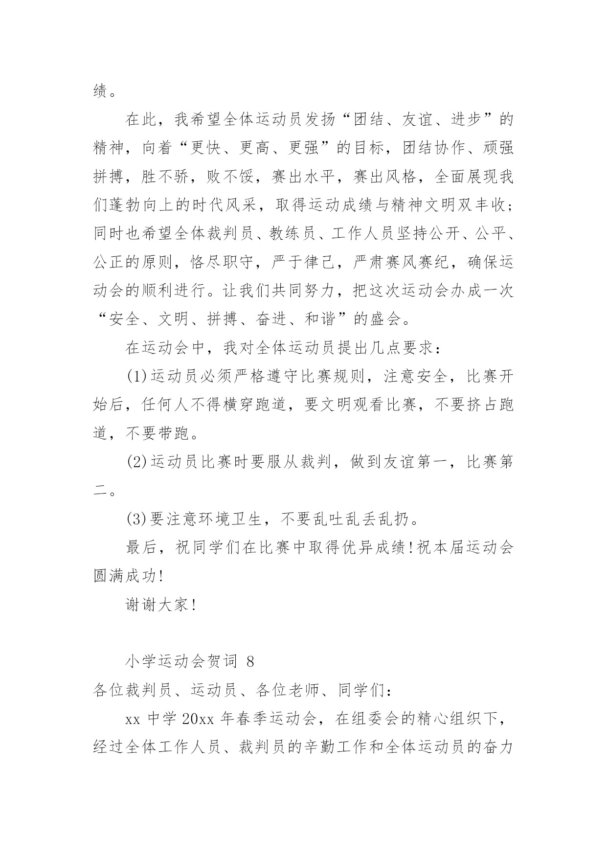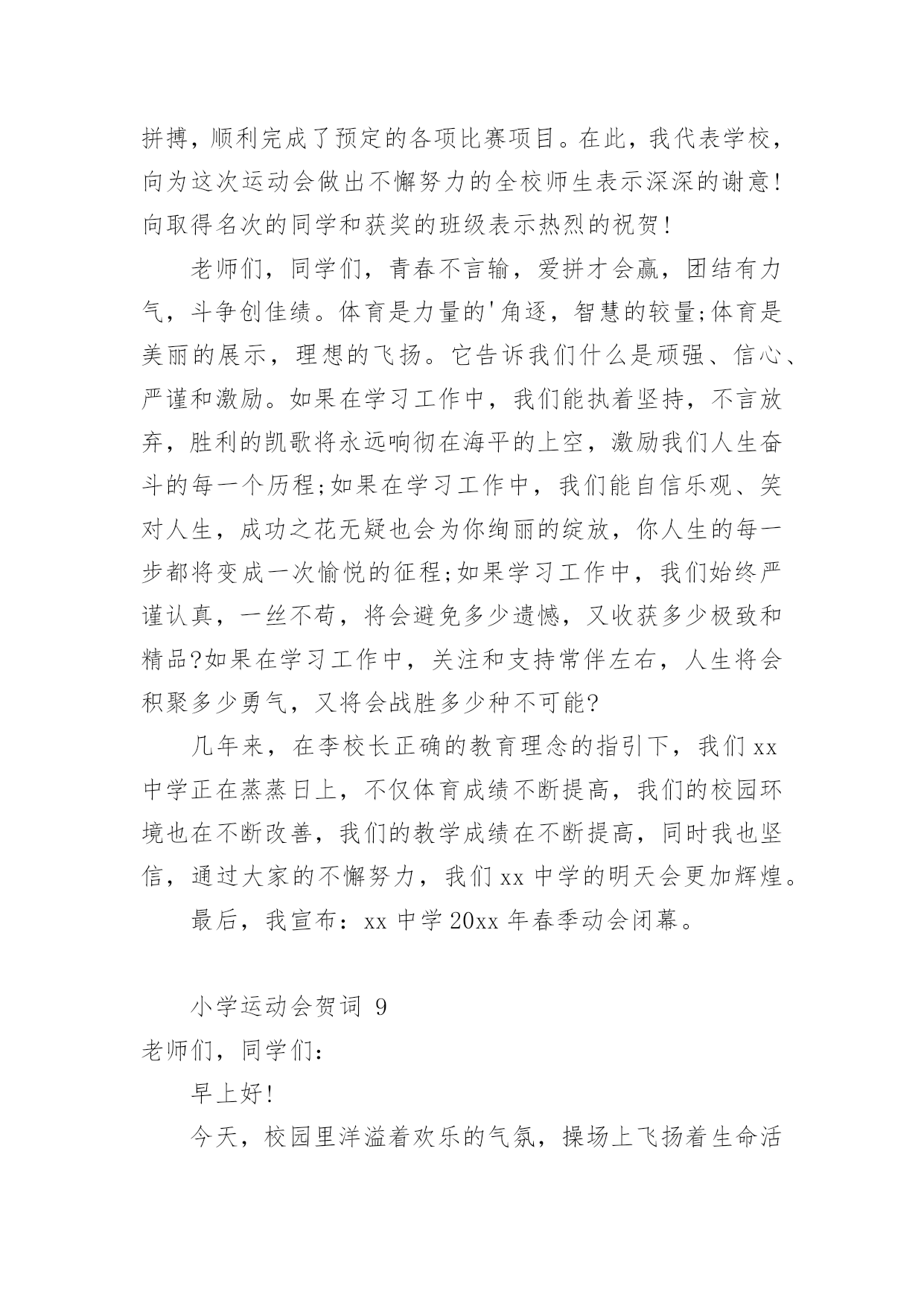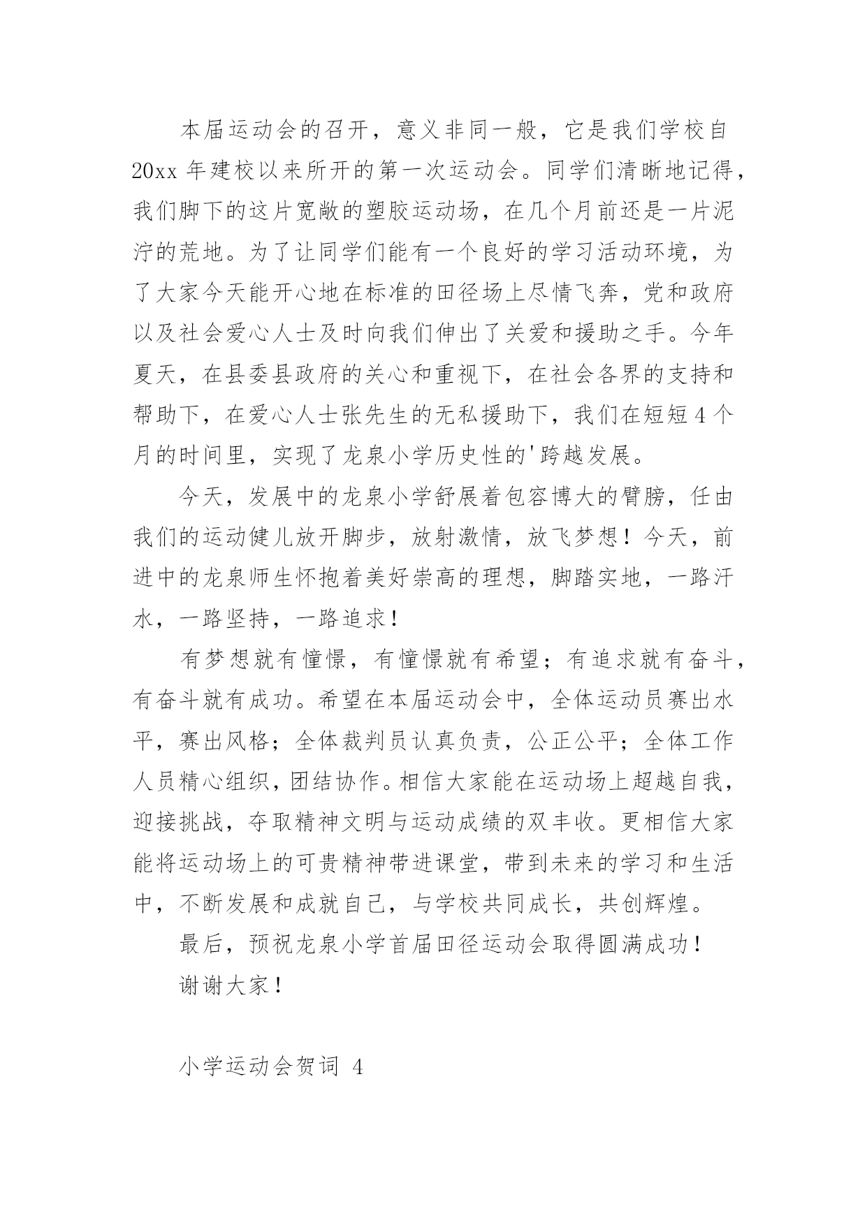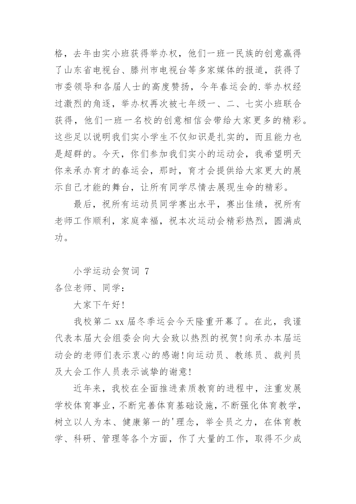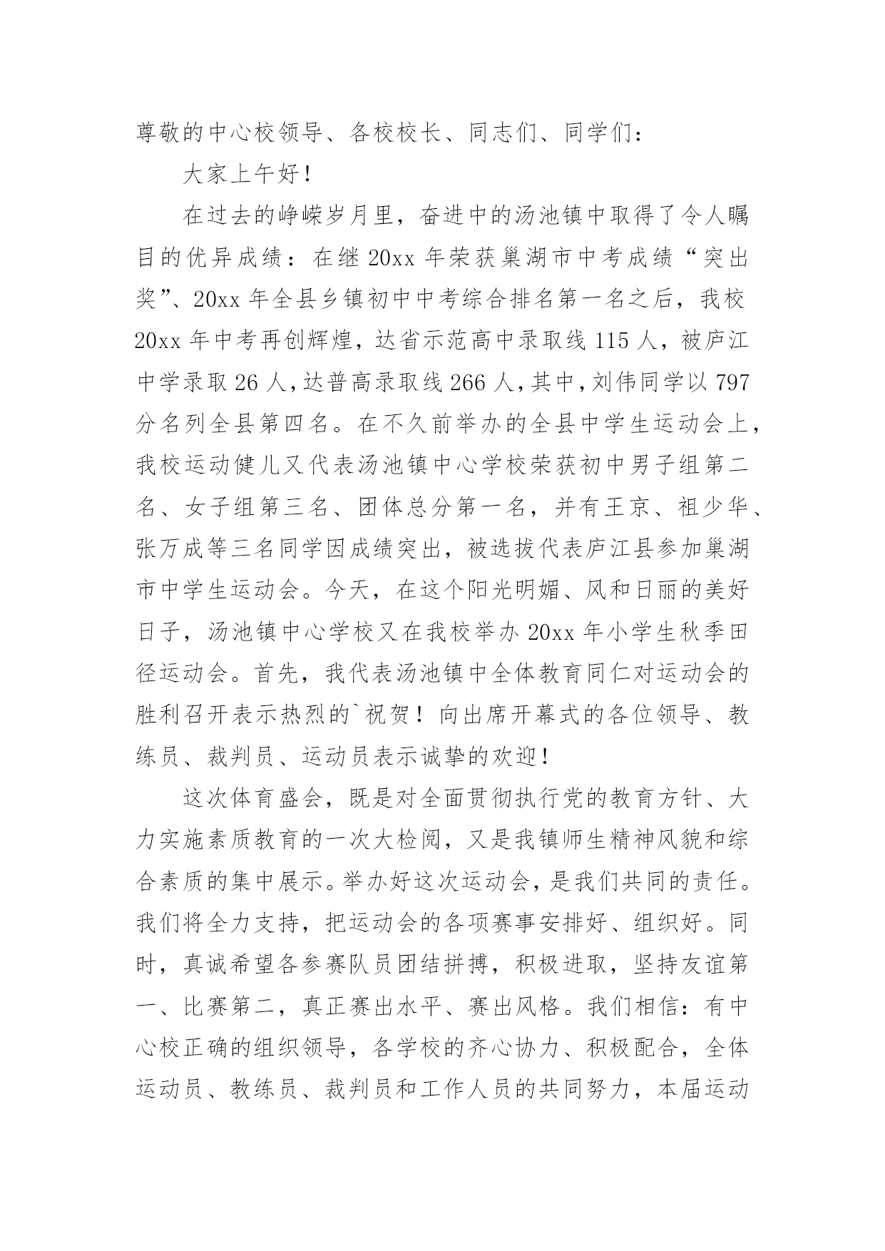 小学运动会贺词小学运动会贺词(精选15篇)在日常生活或是工作学习中,许多人都有过写贺词的经历,对贺词都不陌生吧,借助贺词可以表达对主人的祝贺和感谢之意。什么样的贺词才是走心的呢?下面是小编为大家整理的小学运动会贺词,希望对大家有所帮助。小学运动会贺词1各位领导、各位来宾,老师们、同学们:大家好!在这个萌生着绿色的季节,在这个孕育着希望的四月xx镇镇20xx年中小学生田径运动会贺,今天,晴空万里,清风徐徐,校园里鼓乐喧天,彩旗飘扬,xx镇中小学生田径运动会隆重开幕了。我代表xx镇党委政府向大会表示热烈的祝贺,向全体运动员、裁判员、工作人员、同学们表示亲切的慰问!21世纪是知识的世纪,是技能的世纪,更是竞争的世纪。我们必须拥有良好的心理素质、优秀的人格素质、完善的体能素质。今天,我们在田径场上竞争,明天,我们要在世界舞台上亮相;今天我们在田径场上拼搏,明天,我们将在世界大潮中冲浪。体育的精神体现了人类战胜极限的渴望,激发了人类与时俱进的.潜能。它是我们努力学习的动力,战胜困难的决心,迎接成功的自信和拥抱明天的力量。本次运动会的召开,有利于增强学生体质,推进学校素质教育。希望全体运动员发扬“更高、更快、更强”的奥运精神,勇于拼搏,赛出风格,赛出水平;希望全体裁判员,认真负责、公平、公正裁判,把本届运动会办成团结、进步、文明、成功的盛会。最后,预祝大会圆满成功!谢谢!小学运动会贺词2各位领导、各位来宾,全体运动员小朋友、教练员、裁判员们:大家早上好!在这鲜花烂漫,风光灵秀的五月,我们西流河一中以青翠欲滴的绿色、胜似骄阳的热情,迎来了西流河镇第七届小学生运动会运动会。值此运动会开幕之际,我谨代表西流河一中全体师生预祝本次运动会取得圆满成功!向出席今天开幕式的各位领导,教练员、运动员、裁判员以及各界朋友表示热烈的欢迎和衷心的感谢!小朋友们,这是一次群星闪烁的盛会,是你们展示自我、锻造自我、悦纳自我的最好契机。学校体育,在学校工作中占有重要位置;体育运动中所体现的拼搏、进取、团结、协作等精神,对于提高你们综合素质和健康水平有着重要作用。作为举办地,我们为这样一个高规格、大规模的小学生运动会在我校召开,感到非常高兴。小朋友们,你们是祖国的未来和希望,我期望你们从这次体育盛会中去享受成功的喜悦,体味拼搏的乐趣,寄托成功的.希望,去创造崭新的未来!老师朋友们,在你们的辛勤努力下,一朵朵璀璨的教育之花,绽放出耀眼的光彩,成为蓬勃发展的西流河教育百花园中一朵绚丽的奇葩。希望你们继续谱写“今朝还胜去年好”壮丽画卷,再撰新篇章,再奏最强音,让西流河的孩子接受更好的小学教育!最后,真诚祝愿各位小朋友团结拼搏、积极进取,坚持友谊第一、比赛第二,真正赛出风格、赛出水平。我们相信,有大家齐心协力,各相关单位的积极配合,有全体运动员、教练员、裁判员和工作人员的共同努力,本届大运会一定能办成组织工作协调有序、赛风赛纪文明规范、比赛成绩鼓舞人心的全镇小学体育比赛盛会!祝愿大会取得圆满成功!谢谢!小学运动会贺词3全体运动员、裁判员、工作人员、同学们:大家好!今天适逢西方的感恩节,我们迎来了红安县龙泉小学的首届秋季田径运动会,这是龙泉小学发展史上的一件盛事。在此,我代表县教育局对本届运动会的顺利召开表示热烈的祝贺!同时向全体运动员、裁判员、工作人员和同学们表示亲切的慰问!本届运动会的召开,意义非同一般,它是我们学校自20xx年建校以来所开的第一次运动会。同学们清晰地记得,我们脚下的这片宽敞的塑胶运动场,在几个月前还是一片泥泞的荒地。为了让同学们能有一个良好的学习活动环境,为了大家今天能开心地在标准的田径场上尽情飞奔,党和政府以及社会爱心人士及时向我们伸出了关爱和援助之手。今年夏天,在县委县政府的关心和重视下,在社会各界的支持和帮助下,在爱心人士张先生的无私援助下,我们在短短4个月的时间里,实现了龙泉小学历史性的'跨越发展。今天,发展中的龙泉小学舒展着包容博大的臂膀,任由我们的运动健儿放开脚步,放射激情,放飞梦想!今天,前进中的龙泉师生怀抱着美好崇高的理想,脚踏实地,一路汗水,一路坚持,一路追求!有梦想就有憧憬,有憧憬就有希望;有追求就有奋斗,有奋斗就有成功。希望在本届运动会中,全体运动员赛出水平,赛出风格;全体裁判员认真负责,公正公平;全体工作人员精心组织,团结协作。相信大家能在运动场上超越自我,迎接挑战,夺取精神文明与运动成绩的双丰收。更相信大家能将运动场上的可贵精神带进课堂,带到未来的学习和生活中,不断发展和成就自己,与学校共同成长,共创辉煌。最后,预祝龙泉小学首届田径运动会取得圆满成功!谢谢大家!小学运动会贺词4尊敬的中心校领导、各校校长、同志们、同学们:大家上午好!在过去的峥嵘岁月里,奋进中的汤池镇中取得了令人瞩目的优异成绩:在继20xx年荣获巢湖市中考成绩“