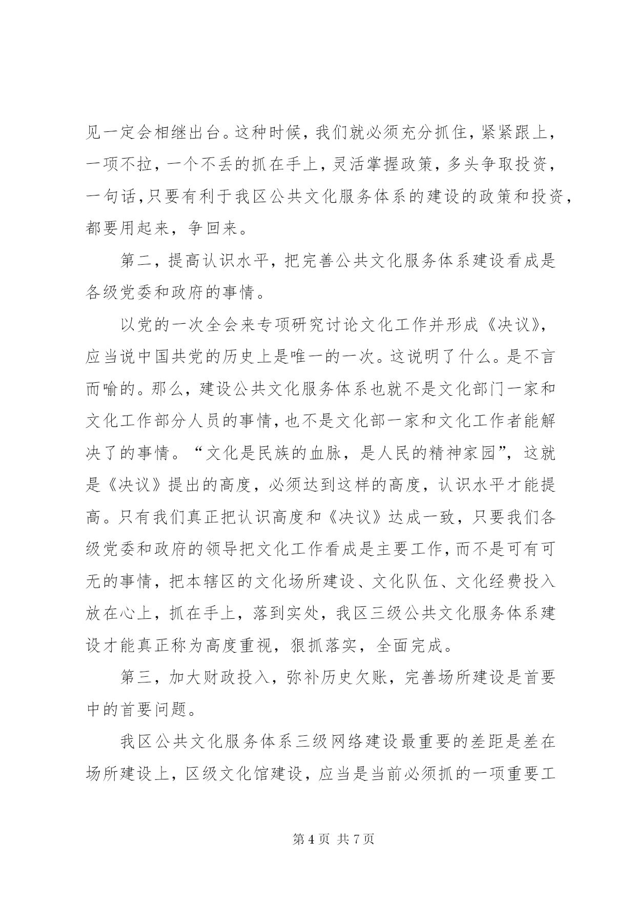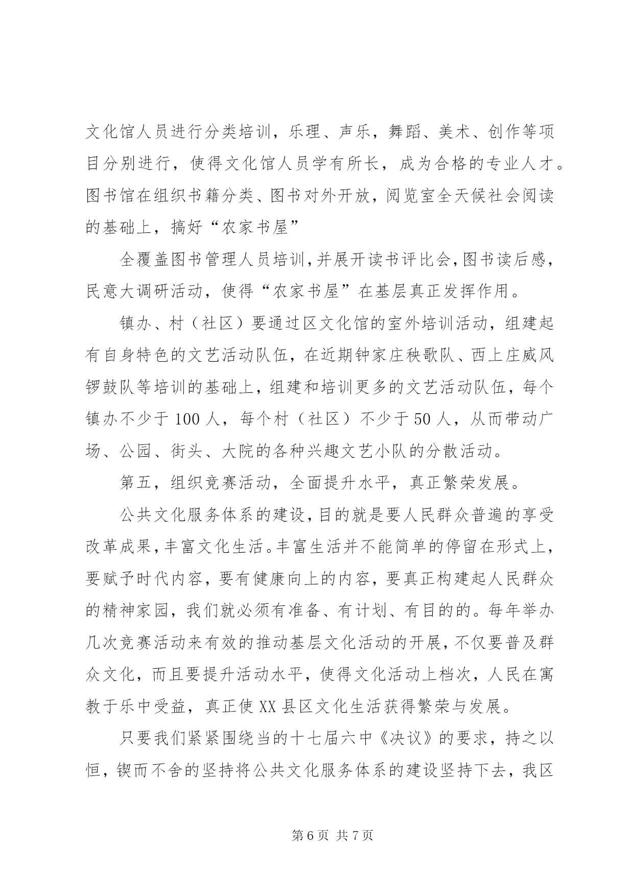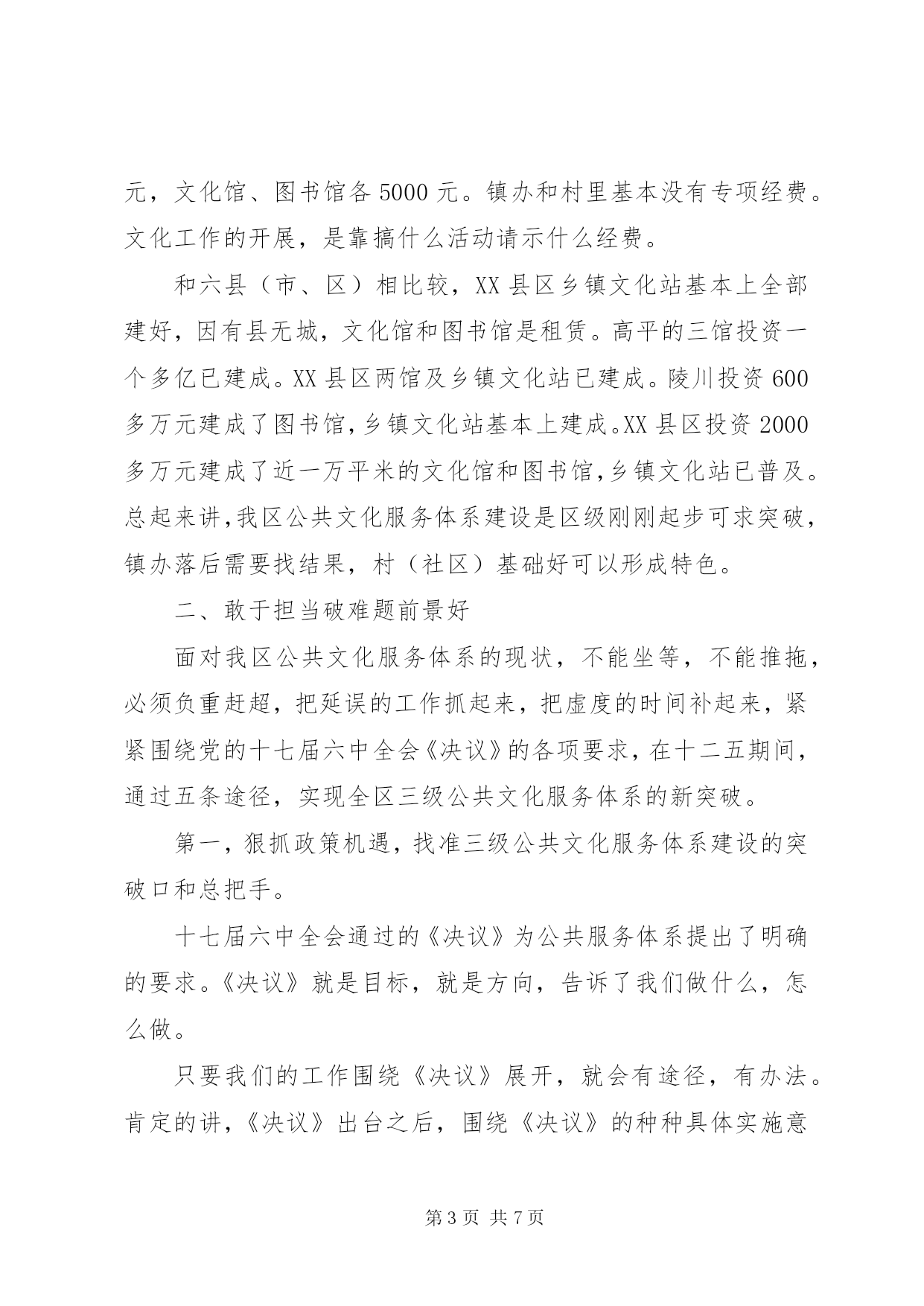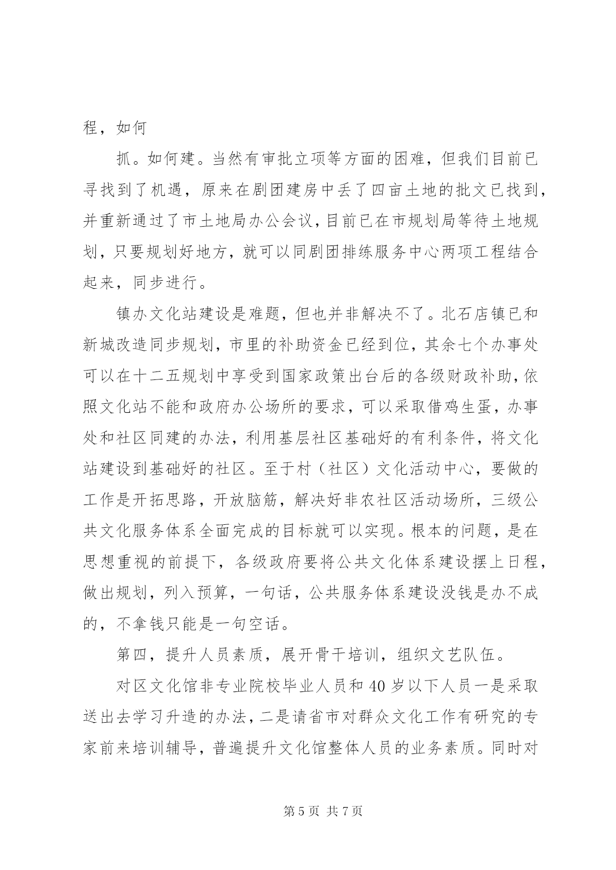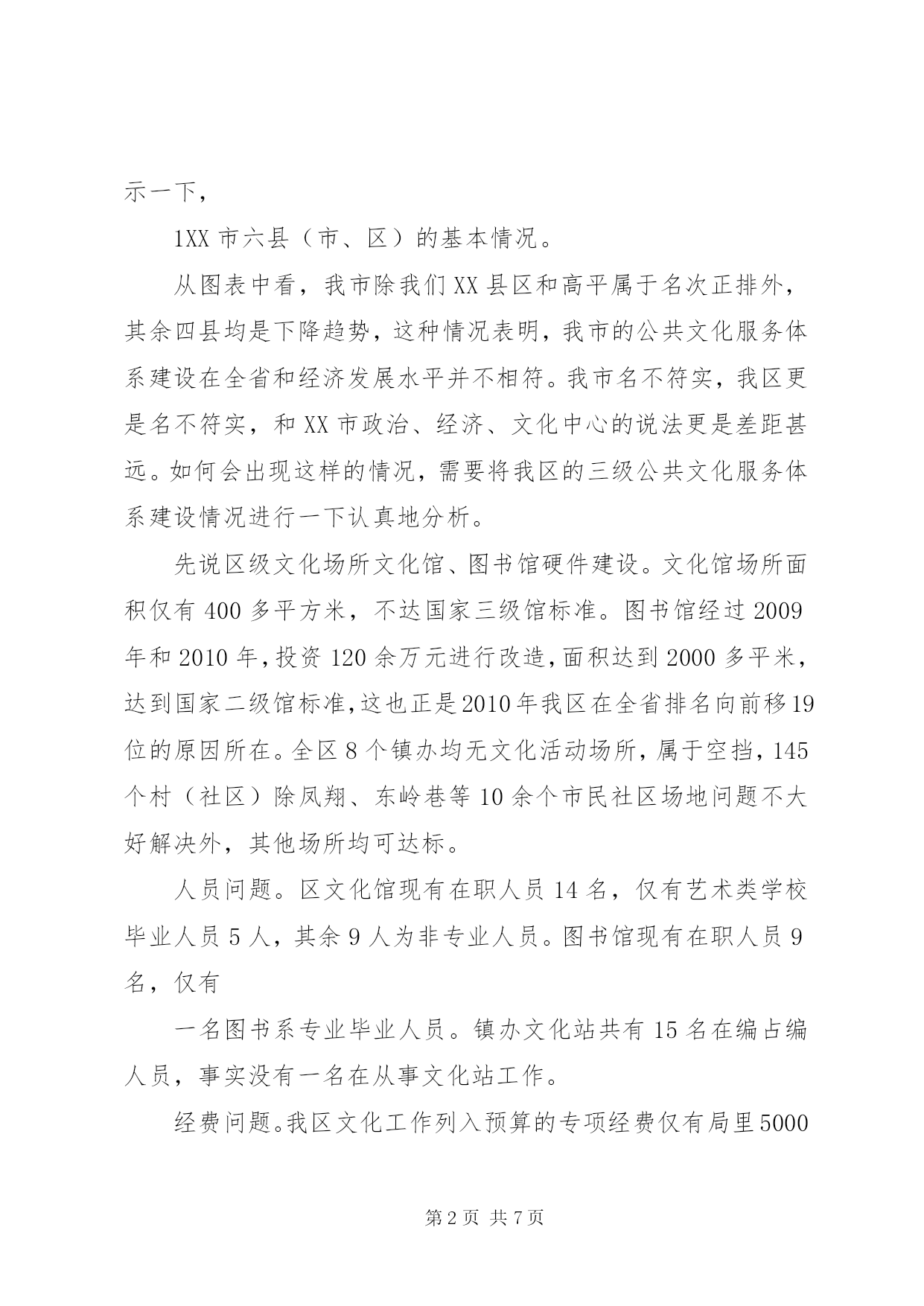 第PAGE\*Arabic\*MERGEFORMAT7页共NUMPAGES\*MERGEFORMAT7页政协的公共文化体系建设调研报告贯彻决议精神破解发展难题确保繁荣发展强化公共文化服务体系建设是各项文化建设的基础工程党的十七届六中全会通过的《中共中央关于深化文化体制改革推动社会主义大发展大繁荣若干问题的决定》指出:“加强公共文化服务是实现人民基本文化权益的主要途径……,加强文化馆、博物馆、图书馆……青少年宫等公共文化服务设施和爱国主义教育示范基地并完善向社会免费开放服务。”公共文化服务体系建设,在我区是指区级文化馆、图书馆、镇办文化站、村(社区)文化服务中(三室一中心)三级公共文化服务体系建设,只有真正把这三级公共文化服务体系建立起来,认认真真为人民群众提供场所免费开放、服务,业务骨干辅导服务,基本队伍培训服务等,才能让全区人民真正享受到新的文化生活和改革开放经济发展的巨大成果。结合我区公共文化服务体系建设实际,我从下面两个方面五条途径来讲述我去公共文化服务体系建设情况和全面落实十七届六中全会精神,强化文化服务体系建设的办法和途径。一、对照《决定》差距大问题多前些日子,省文化厅公布了全省各市及各县(市、区)公共文化服务体系建设2009年到2010年的排名,下面我以图表来展示一下,1XX市六县(市、区)的基本情况。从图表中看,我市除我们XX县区和高平属于名次正排外,其余四县均是下降趋势,这种情况表明,我市的公共文化服务体系建设在全省和经济发展水平并不相符。我市名不符实,我区更是名不符实,和XX市政治、经济、文化中心的说法更是差距甚远。如何会出现这样的情况,需要将我区的三级公共文化服务体系建设情况进行一下认真地分析。先说区级文化场所文化馆、图书馆硬件建设。文化馆场所面积仅有400多平方米,不达国家三级馆标准。图书馆经过2009年和2010年,投资120余万元进行改造,面积达到2000多平米,达到国家二级馆标准,这也正是2010年我区在全省排名向前移19位的原因所在。全区8个镇办均无文化活动场所,属于空挡,145个村(社区)除凤翔、东岭巷等10余个市民社区场地问题不大好解决外,其他场所均可达标。人员问题。区文化馆现有在职人员14名,仅有艺术类学校毕业人员5人,其余9人为非专业人员。图书馆现有在职人员9名,仅有一名图书系专业毕业人员。镇办文化站共有15名在编占编人员,事实没有一名在从事文化站工作。经费问题。我区文化工作列入预算的专项经费仅有局里5000元,文化馆、图书馆各5000元。镇办和村里基本没有专项经费。文化工作的开展,是靠搞什么活动请示什么经费。和六县(市、区)相比较,XX县区乡镇文化站基本上全部建好,因有县无城,文化馆和图书馆是租赁。高平的三馆投资一个多亿已建成。XX县区两馆及乡镇文化站已建成。陵川投资600多万元建成了图书馆,乡镇文化站基本上建成。XX县区投资2000多万元建成了近一万平米的文化馆和图书馆,乡镇文化站已普及。总起来讲,我区公共文化服务体系建设是区级刚刚起步可求突破,镇办落后需要找结果,村(社区)基础好可以形成特色。二、敢于担当破难题前景好面对我区公共文化服务体系的现状,不能坐等,不能推拖,必须负重赶超,把延误的工作抓起来,把虚度的时间补起来,紧紧围绕党的十七届六中全会《决议》的各项要求,在十二五期间,通过五条途径,实现全区三级公共文化服务体系的新突破。第一,狠抓政策机遇,找准三级公共文化服务体系建设的突破口和总把手。十七届六中全会通过的《决议》为公共服务体系提出了明确的要求。《决议》就是目标,就是方向,告诉了我们做什么,怎么做。只要我们的工作围绕《决议》展开,就会有途径,有办法。肯定的讲,《决议》出台之后,围绕《决议》的种种具体实施意见一定会相继出台。这种时候,我们就必须充分抓住,紧紧跟上,一项不拉,一个不丢的抓在手上,灵活掌握政策,多头争取投资,一句话,只要有利于我区公共文化服务体系的建设的政策和投资,都要用起来,争回来。第二,提高认识水平,把完善公共文化服务体系建设看成是各级党委和政府的事情。以党的一次全会来专项研究讨论文化工作并形成《决议》,应当说中国共党的历史上是唯一的一次。这说明了什么。是不言而喻的。那么,建设公共文化服务体系也就不是文化部门一家和文化工作部分人员的事情,也不是文化部一家和文化工作者能解决了的事情。“文化是民族的血脉,是人民的精神家园”,这就是《决议》提出的高度,必须达到这样的高度,认识水平才能提高。只有我们真正把认识高度和《决议》达成一致,只要我们各级党委和政府的领导把文化工作看成是主要工作,而不是可有可无的事情,把本辖区的文化场所建设、文化队伍、文化经费投入放在心上,抓在手上,落到实处,我区三级公共文化服务体系建设才能真正称为高度重视,狠抓落实,全面