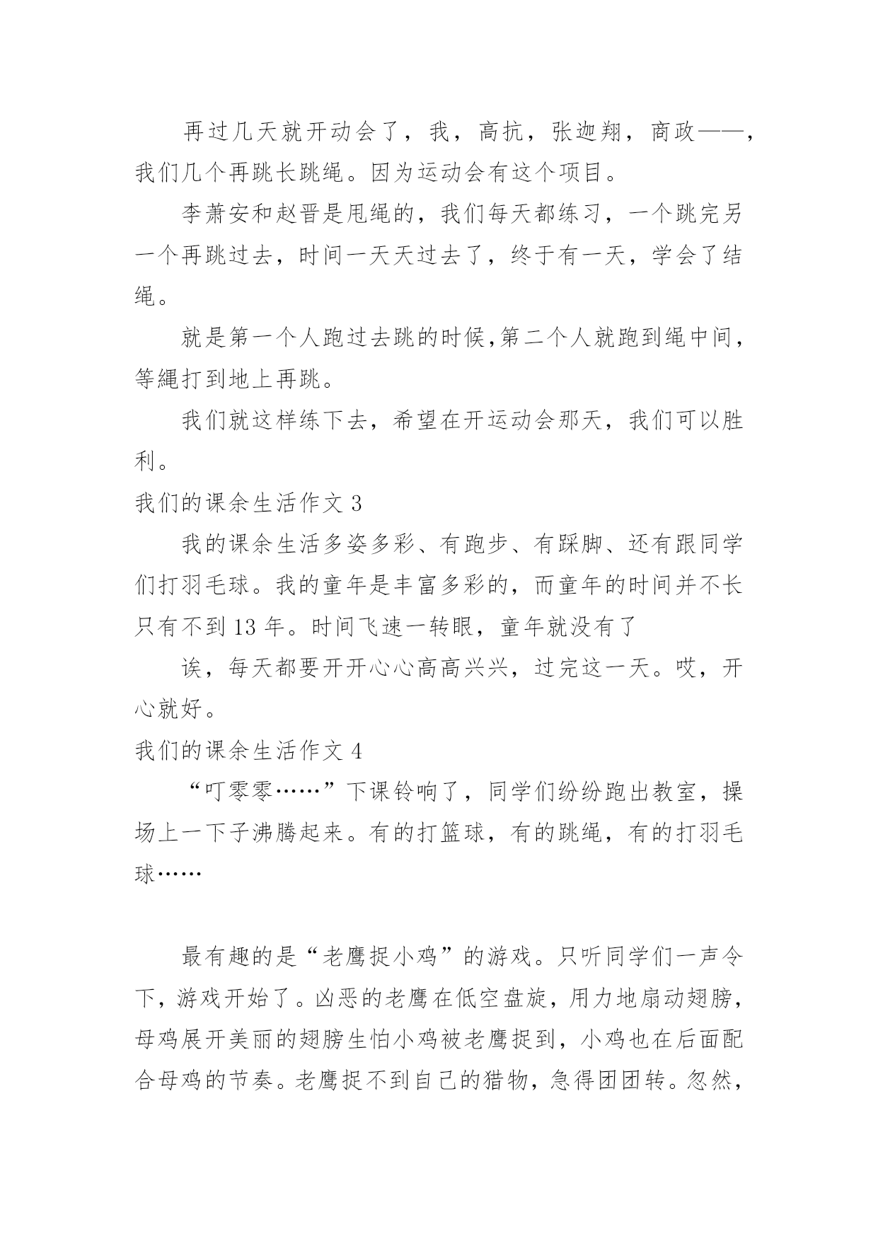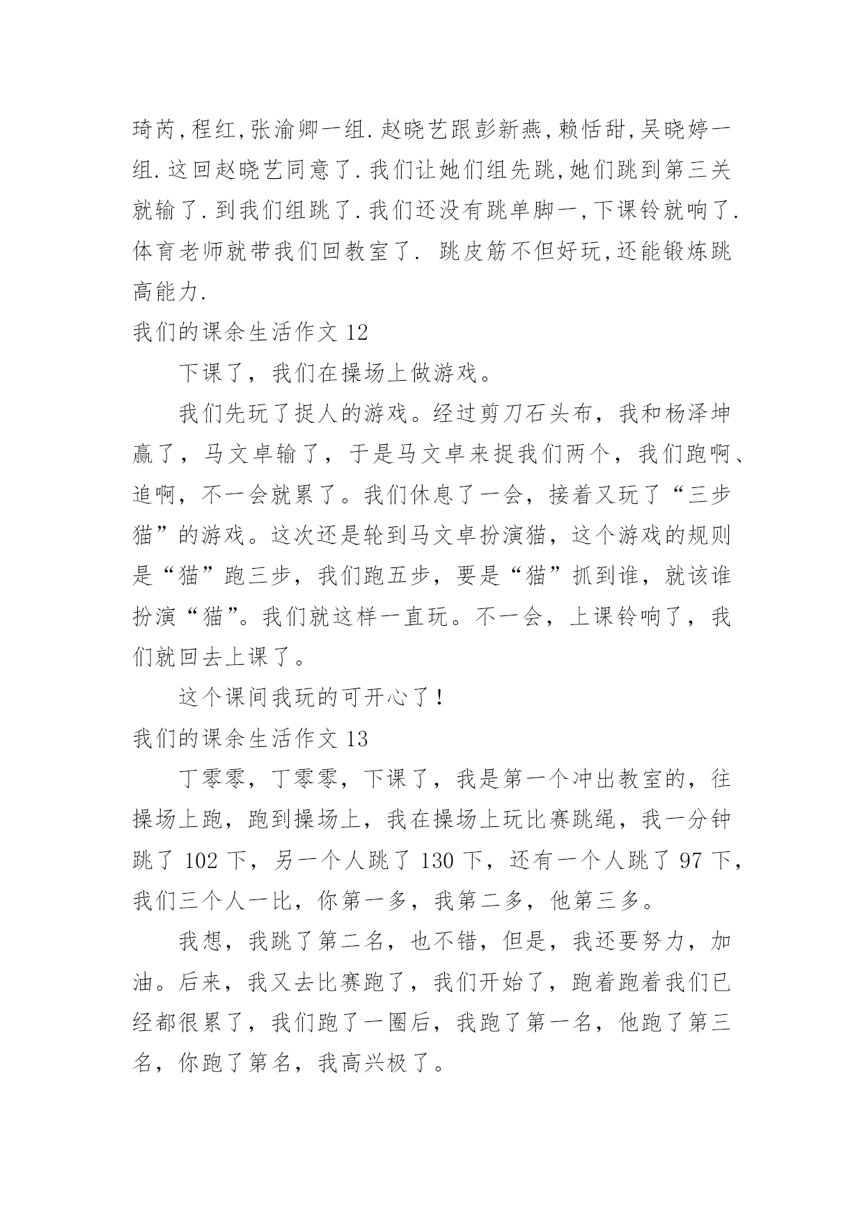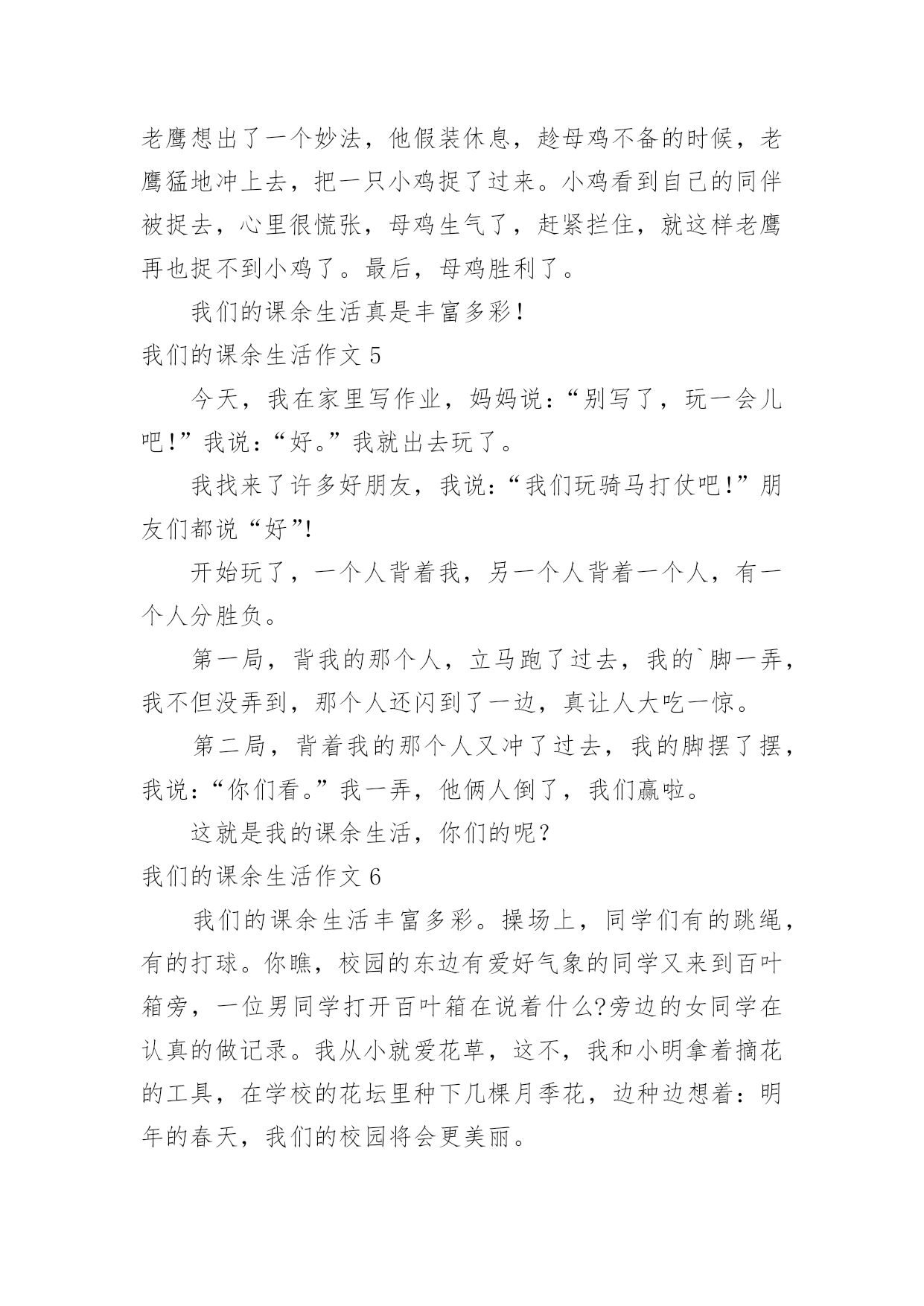 我们的课余生活作文【热】我们的课余生活作文在日常学习、工作或生活中,大家都经常看到作文的身影吧,写作文是培养人们的观察力、联想力、想象力、思考力和记忆力的重要手段。那么你有了解过作文吗?下面是小编帮大家整理的我们的课余生活作文,仅供参考,大家一起来看看吧。我们的课余生活作文1星期六的下午,我去看电影了。看的是下午一点钟的之魔剑公主。主人公是:小蓝、凌美琪、凌美雪和贝贝。主要是讲:凌到美琪、凌美雪和贝贝这三个魔法世界是爱奇那的忠实粉丝,可是却把波卡波卡魔法王国公主凯美莉看成了爱奇那。但是美琪、美雪和贝贝并不知道她波卡波卡魔法王国公主凯美莉,也不知道她会魔法。只有小蓝发现了他会魔法。可小蓝没有告诉,凌美琪、凌美雪和贝贝她会魔法。可是后来,因为在菜市场见了一面,就知道了,她是波卡波卡魔法王国的公主凯美莉。最后,王国有危险时,所有人都到了王国里。公主打败了他的坏蛋叔叔。这是我看过最好看的电影。我们的课余生活作文2再过几天就开动会了,我,高抗,张迦翔,商政——,我们几个再跳长跳绳。因为运动会有这个项目。李萧安和赵晋是甩绳的,我们每天都练习,一个跳完另一个再跳过去,时间一天天过去了,终于有一天,学会了结绳。就是第一个人跑过去跳的时候,第二个人就跑到绳中间,等縄打到地上再跳。我们就这样练下去,希望在开运动会那天,我们可以胜利。我们的课余生活作文3我的课余生活多姿多彩、有跑步、有踩脚、还有跟同学们打羽毛球。我的童年是丰富多彩的,而童年的时间并不长只有不到13年。时间飞速一转眼,童年就没有了诶,每天都要开开心心高高兴兴,过完这一天。哎,开心就好。我们的课余生活作文4“叮零零……”下课铃响了,同学们纷纷跑出教室,操场上一下子沸腾起来。有的打篮球,有的跳绳,有的打羽毛球……最有趣的是“老鹰捉小鸡”的游戏。只听同学们一声令下,游戏开始了。凶恶的老鹰在低空盘旋,用力地扇动翅膀,母鸡展开美丽的翅膀生怕小鸡被老鹰捉到,小鸡也在后面配合母鸡的节奏。老鹰捉不到自己的猎物,急得团团转。忽然,老鹰想出了一个妙法,他假装休息,趁母鸡不备的时候,老鹰猛地冲上去,把一只小鸡捉了过来。小鸡看到自己的同伴被捉去,心里很慌张,母鸡生气了,赶紧拦住,就这样老鹰再也捉不到小鸡了。最后,母鸡胜利了。我们的课余生活真是丰富多彩!我们的课余生活作文5今天,我在家里写作业,妈妈说:“别写了,玩一会儿吧!”我说:“好。”我就出去玩了。我找来了许多好朋友,我说:“我们玩骑马打仗吧!”朋友们都说“好”!开始玩了,一个人背着我,另一个人背着一个人,有一个人分胜负。第一局,背我的那个人,立马跑了过去,我的`脚一弄,我不但没弄到,那个人还闪到了一边,真让人大吃一惊。第二局,背着我的那个人又冲了过去,我的脚摆了摆,我说:“你们看。”我一弄,他俩人倒了,我们赢啦。这就是我的课余生活,你们的呢?我们的课余生活作文6我们的课余生活丰富多彩。操场上,同学们有的跳绳,有的打球。你瞧,校园的东边有爱好气象的同学又来到百叶箱旁,一位男同学打开百叶箱在说着什么?旁边的女同学在认真的做记录。我从小就爱花草,这不,我和小明拿着摘花的工具,在学校的花坛里种下几棵月季花,边种边想着:明年的春天,我们的校园将会更美丽。我们的课余生活作文7我的课余生活非常丰富,有看书,写字,画画等。我最喜欢看书。我叫妈妈给我买了一本格林童话,里面讲了丑小鸭的故事。一天鸭妈妈生出来的蛋都裂开了,里面的小鸭一个一个走了出来,鸭妈妈看见还有一个又大又圆的蛋还没有裂开。没过多久,蛋在慢慢地裂开,鸭妈妈非常高兴,小鸭子从蛋壳里走了出来,把鸭妈妈惊呆了,有一次,小鸭子蹦蹦跳跳的来到大街上,动物见了都叫它丑小鸭,眼睛大,头很小。丑小鸭听了很难过,丑小鸭走到河过上,哭了起来。几个月过去了,丑小鸭再次来到河边,发现自己变成了一只美丽的天鹅。丑小鸭自言自语的说:“原来我不是一只鸭子,是一只美丽的天鹅。”这一篇故事告诉了每一个人有都有自己美的地方。我们的课余生活作文8星期天,爸爸带我去广场打篮球,我站在球篮下,准备拦住爸爸,可是爸爸他一跳就把我的球给抢走了,爸爸把球投进篮框,第一局爸爸赢了。到了第二局,爸爸可没那么顺利了,我前后疯跑想拦住他,可是爸爸他高高跳起又把球给投到了球篮里。爸爸连赢两局,我输啦。所以我决定每天下午放学练习打篮球,一定要赢爸爸!我们的课余生活作文9我们的课余生活各种各样,比如有跳绳、转呼啦圈、踢毽子……其中,我最喜欢的就是转呼啦圈。呼啦圈在我的腰间转来转去,好长时间都不会掉下来,像是粘在我身上似的,小伙伴们都很羡慕我。其他同学们有的跳绳,有的打球,还有的踢毽子,大家玩得高高兴兴。上课铃声响了,我们只好回到了教室。今天我们玩得真高兴啊!我们的课余生活作文10同学们的课外生活真是丰富多彩!周日,小刚和小明约好了一起打篮球,他们到了篮球馆,不相上