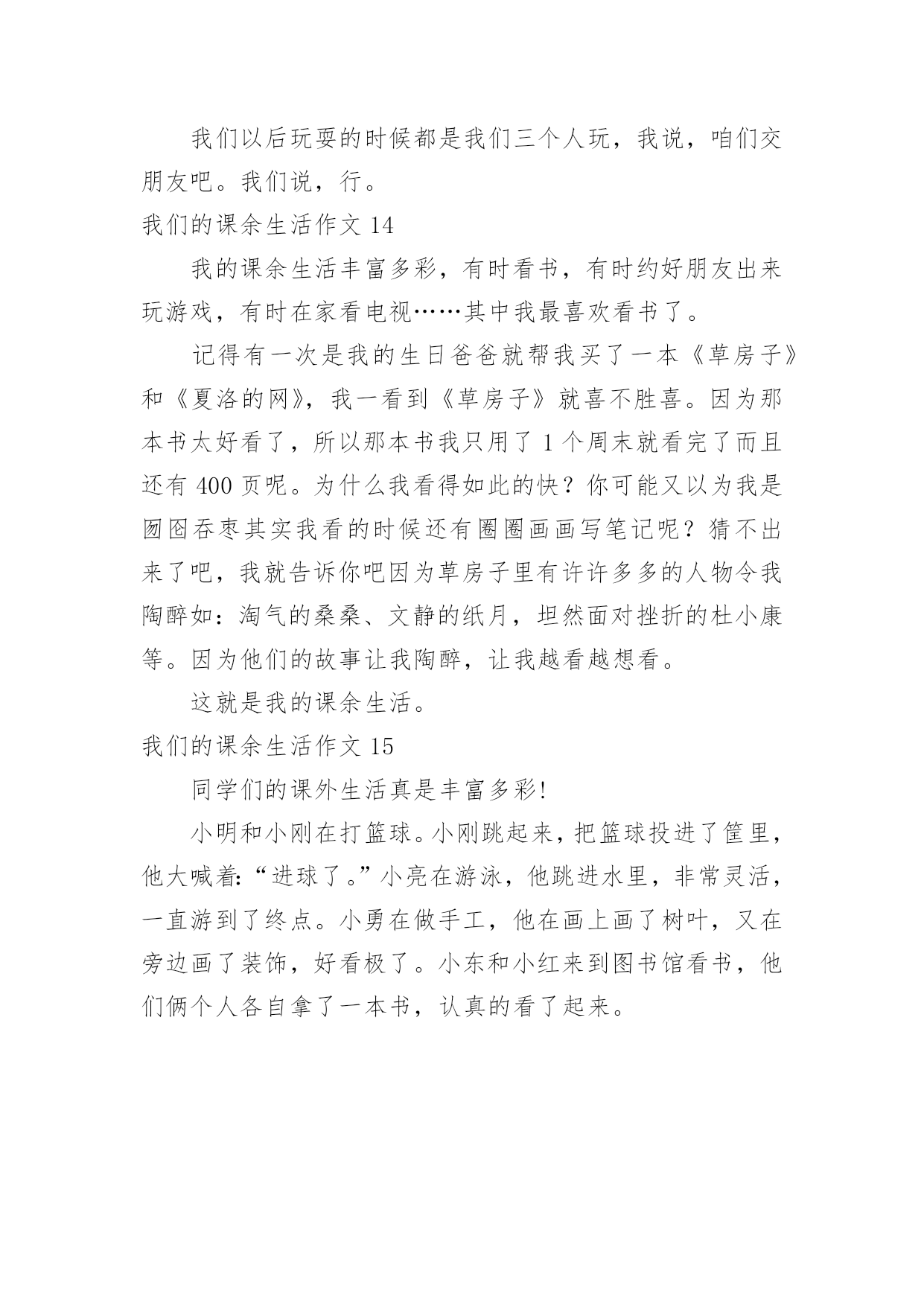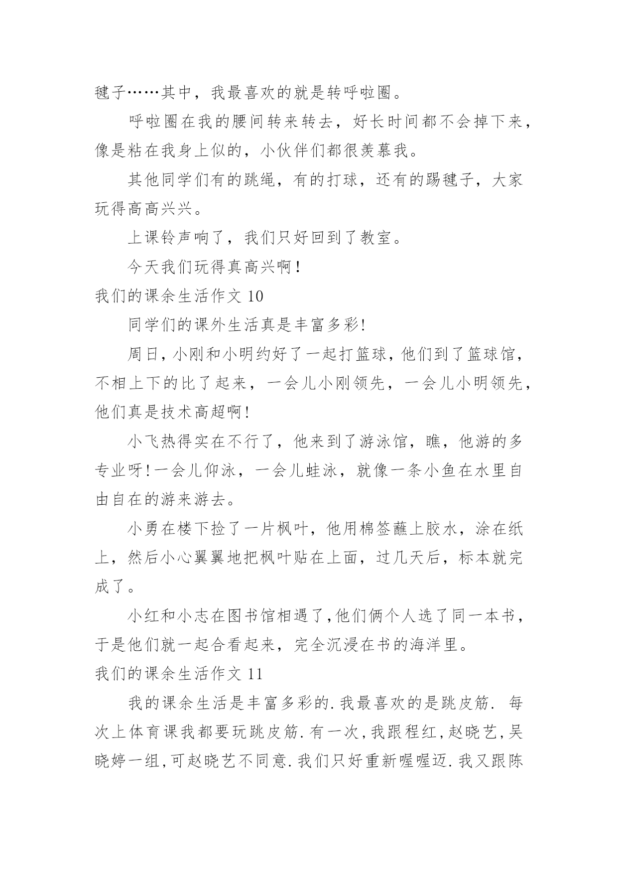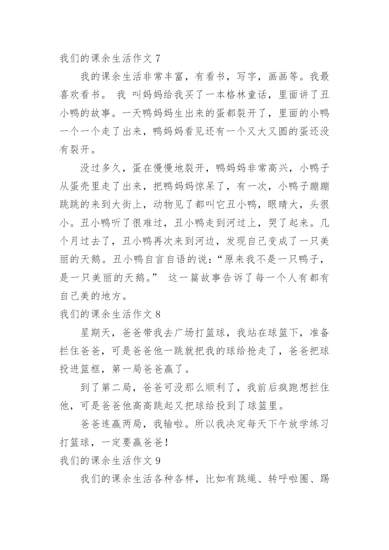我们的课余生活作文【热】我们的课余生活作文在日常学习、工作或生活中,大家都经常看到作文的身影吧,写作文是培养人们的观察力、联想力、想象力、思考力和记忆力的重要手段。那么你有了解过作文吗?下面是小编帮大家整理的我们的课余生活作文,仅供参考,大家一起来看看吧。我们的课余生活作文1星期六的下午,我去看电影了。看的是下午一点钟的之魔剑公主。主人公是:小蓝、凌美琪、凌美雪和贝贝。主要是讲:凌到美琪、凌美雪和贝贝这三个魔法世界是爱奇那的忠实粉丝,可是却把波卡波卡魔法王国公主凯美莉看成了爱奇那。但是美琪、美雪和贝贝并不知道她波卡波卡魔法王国公主凯美莉,也不知道她会魔法。只有小蓝发现了他会魔法。可小蓝没有告诉,凌美琪、凌美雪和贝贝她会魔法。可是后来,因为在菜市场见了一面,就知道了,她是波卡波卡魔法王国的公主凯美莉。最后,王国有危险时,所有人都到了王国里。公主打败了他的坏蛋叔叔。这是我看过最好看的电影。我们的课余生活作文2再过几天就开动会了,我,高抗,张迦翔,商政——,我们几个再跳长跳绳。因为运动会有这个项目。李萧安和赵晋是甩绳的,我们每天都练习,一个跳完另一个再跳过去,时间一天天过去了,终于有一天,学会了结绳。就是第一个人跑过去跳的时候,第二个人就跑到绳中间,等縄打到地上再跳。我们就这样练下去,希望在开运动会那天,我们可以胜利。我们的课余生活作文3我的课余生活多姿多彩、有跑步、有踩脚、还有跟同学们打羽毛球。我的童年是丰富多彩的,而童年的时间并不长只有不到13年。时间飞速一转眼,童年就没有了诶,每天都要开开心心高高兴兴,过完这一天。哎,开心就好。我们的课余生活作文4“叮零零……”下课铃响了,同学们纷纷跑出教室,操场上一下子沸腾起来。有的打篮球,有的跳绳,有的打羽毛球……最有趣的是“老鹰捉小鸡”的游戏。只听同学们一声令下,游戏开始了。凶恶的老鹰在低空盘旋,用力地扇动翅膀,母鸡展开美丽的翅膀生怕小鸡被老鹰捉到,小鸡也在后面配合母鸡的节奏。老鹰捉不到自己的猎物,急得团团转。忽然,老鹰想出了一个妙法,他假装休息,趁母鸡不备的时候,老鹰猛地冲上去,把一只小鸡捉了过来。小鸡看到自己的同伴被捉去,心里很慌张,母鸡生气了,赶紧拦住,就这样老鹰再也捉不到小鸡了。最后,母鸡胜利了。我们的课余生活真是丰富多彩!我们的课余生活作文5今天,我在家里写作业,妈妈说:“别写了,玩一会儿吧!”我说:“好。”我就出去玩了。我找来了许多好朋友,我说:“我们玩骑马打仗吧!”朋友们都说“好”!开始玩了,一个人背着我,另一个人背着一个人,有一个人分胜负。第一局,背我的那个人,立马跑了过去,我的`脚一弄,我不但没弄到,那个人还闪到了一边,真让人大吃一惊。第二局,背着我的那个人又冲了过去,我的脚摆了摆,我说:“你们看。”我一弄,他俩人倒了,我们赢啦。这就是我的课余生活,你们的呢?我们的课余生活作文6我们的课余生活丰富多彩。操场上,同学们有的跳绳,有的打球。你瞧,校园的东边有爱好气象的同学又来到百叶箱旁,一位男同学打开百叶箱在说着什么?旁边的女同学在认真的做记录。我从小就爱花草,这不,我和小明拿着摘花的工具,在学校的花坛里种下几棵月季花,边种边想着:明年的春天,我们的校园将会更美丽。我们的课余生活作文7我的课余生活非常丰富,有看书,写字,画画等。我最喜欢看书。我叫妈妈给我买了一本格林童话,里面讲了丑小鸭的故事。一天鸭妈妈生出来的蛋都裂开了,里面的小鸭一个一个走了出来,鸭妈妈看见还有一个又大又圆的蛋还没有裂开。没过多久,蛋在慢慢地裂开,鸭妈妈非常高兴,小鸭子从蛋壳里走了出来,把鸭妈妈惊呆了,有一次,小鸭子蹦蹦跳跳的来到大街上,动物见了都叫它丑小鸭,眼睛大,头很小。丑小鸭听了很难过,丑小鸭走到河过上,哭了起来。几个月过去了,丑小鸭再次来到河边,发现自己变成了一只美丽的天鹅。丑小鸭自言自语的说:“原来我不是一只鸭子,是一只美丽的天鹅。”这一篇故事告诉了每一个人有都有自己美的地方。我们的课余生活作文8星期天,爸爸带我去广场打篮球,我站在球篮下,准备拦住爸爸,可是爸爸他一跳就把我的球给抢走了,爸爸把球投进篮框,第一局爸爸赢了。到了第二局,爸爸可没那么顺利了,我前后疯跑想拦住他,可是爸爸他高高跳起又把球给投到了球篮里。爸爸连赢两局,我输啦。所以我决定每天下午放学练习打篮球,一定要赢爸爸!我们的课余生活作文9我们的课余生活各种各样,比如有跳绳、转呼啦圈、踢毽子……其中,我最喜欢的就是转呼啦圈。呼啦圈在我的腰间转来转去,好长时间都不会掉下来,像是粘在我身上似的,小伙伴们都很羡慕我。其他同学们有的跳绳,有的打球,还有的踢毽子,大家玩得高高兴兴。上课铃声响了,我们只好回到了教室。今天我们玩得真高兴啊!我们的课余生活作文10同学们的课外生活真是丰富多彩!周日,小刚和小明约好了一起打篮球,他们到了篮球馆,不相上