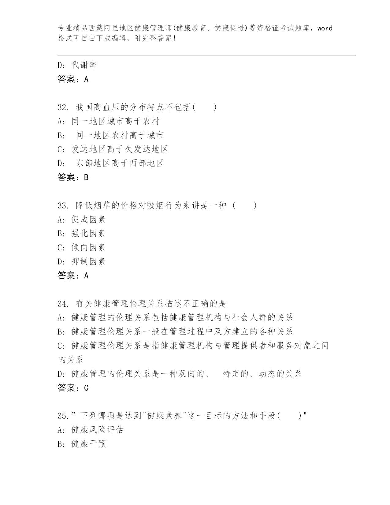 内部培训西藏阿里地区健康管理师(健康教育、健康促进)等资格证考试内部题库含答案(巩固).docx