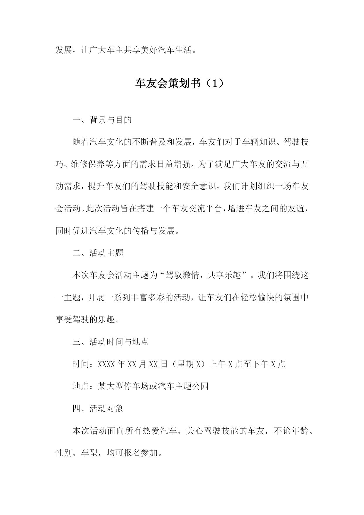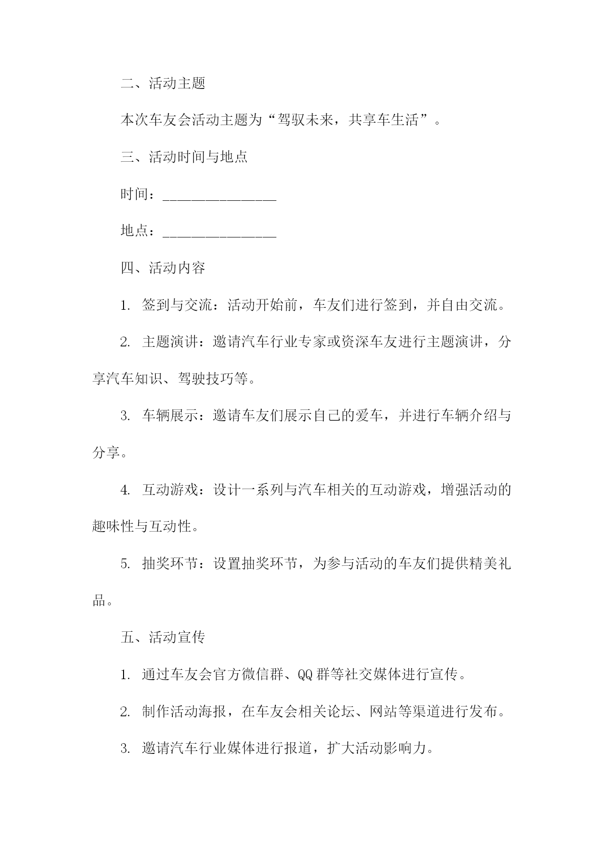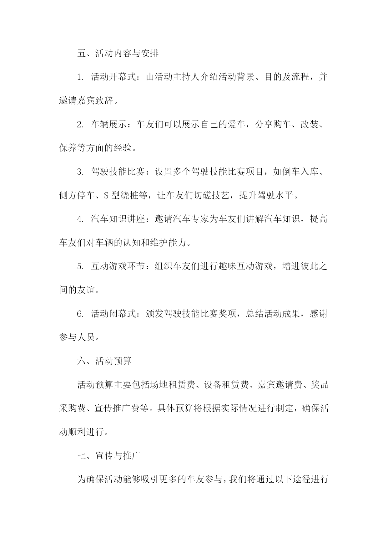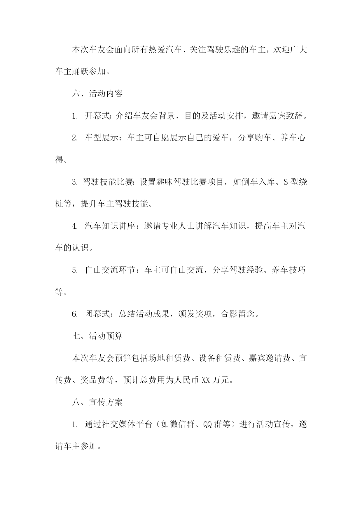 车友会策划书一、活动背景随着汽车文化的普及和人们对高品质生活的追求,车友会作为连接车主、分享驾驶乐趣、交流养车经验的重要平台,逐渐受到广大车主的青睐。本次车友会旨在打造一个车主之间互相交流、共同成长的平台,同时推广汽车文化,提升车主的驾驶技能和生活品质。二、活动目标1.增进车主之间的友谊,促进车友会成员间的交流与合作。2.分享驾驶经验、养车技巧,提高车主的驾驶技能和安全意识。3.推广汽车文化,提升车主对汽车的认识和欣赏水平。4.举办丰富多彩的活动,丰富车主的业余生活,提升生活品质。三、活动主题本次车友会主题为“驾驶乐趣生活品质”,旨在通过一系列活动,让车主们充分体验驾驶的乐趣,提升生活品质。四、活动时间与地点时间:XXXX年XX月XX日(周X)XX:XXXX:XX地点:XX市XX区XX路XX号XX公园停车场五、活动对象本次车友会面向所有热爱汽车、关注驾驶乐趣的车主,欢迎广大车主踊跃参加。六、活动内容1.开幕式:介绍车友会背景、目的及活动安排,邀请嘉宾致辞。2.车型展示:车主可自愿展示自己的爱车,分享购车、养车心得。3.驾驶技能比赛:设置趣味驾驶比赛项目,如倒车入库、S型绕桩等,提升车主驾驶技能。4.汽车知识讲座:邀请专业人士讲解汽车知识,提高车主对汽车的认识。5.自由交流环节:车主可自由交流,分享驾驶经验、养车技巧等。6.闭幕式:总结活动成果,颁发奖项,合影留念。七、活动预算本次车友会预算包括场地租赁费、设备租赁费、嘉宾邀请费、宣传费、奖品费等,预计总费用为人民币XX万元。八、宣传方案1.通过社交媒体平台(如微信群、QQ群等)进行活动宣传,邀请车主参加。2.制作活动海报,张贴于汽车相关场所(如汽车4S店、加油站等),吸引更多车主关注。3.利用汽车类网站、论坛等渠道进行线上宣传,扩大活动影响力。九、活动组织1.成立活动筹备小组,负责活动筹备、组织及执行工作。2.设立活动志愿者团队,协助筹备小组完成活动现场的布置、接待、引导等工作。3.邀请专业人士担任活动嘉宾,为车主提供有价值的分享和指导。十、注意事项1.活动期间,请车主遵守交通规则,确保行车安全。2.活动现场,请车主注意保管个人财物,避免遗失。3.请车主积极参与活动,遵守活动规则,共同营造和谐、友好的活动氛围。十一、总结与展望本次车友会旨在打造一个车主之间互相交流、共同成长的平台,通过丰富多彩的活动,增进车主之间的友谊,提升驾驶技能和生活品质。未来,我们将继续举办更多优质的车友会活动,推动汽车文化的发展,让广大车主共享美好汽车生活。车友会策划书(1)一、背景与目的随着汽车文化的不断普及和发展,车友们对于车辆知识、驾驶技巧、维修保养等方面的需求日益增强。为了满足广大车友的交流与互动需求,提升车友们的驾驶技能和安全意识,我们计划组织一场车友会活动。此次活动旨在搭建一个车友交流平台,增进车友之间的友谊,同时促进汽车文化的传播与发展。二、活动主题本次车友会活动主题为“驾驭激情,共享乐趣”。我们将围绕这一主题,开展一系列丰富多彩的活动,让车友们在轻松愉快的氛围中享受驾驶的乐趣。三、活动时间与地点时间:XXXX年XX月XX日(星期X)上午X点至下午X点地点:某大型停车场或汽车主题公园四、活动对象本次活动面向所有热爱汽车、关心驾驶技能的车友,不论年龄、性别、车型,均可报名参加。五、活动内容与安排1.活动开幕式:由活动主持人介绍活动背景、目的及流程,并邀请嘉宾致辞。2.车辆展示:车友们可以展示自己的爱车,分享购车、改装、保养等方面的经验。3.驾驶技能比赛:设置多个驾驶技能比赛项目,如倒车入库、侧方停车、S型绕桩等,让车友们切磋技艺,提升驾驶水平。4.汽车知识讲座:邀请汽车专家为车友们讲解汽车知识,提高车友们对车辆的认知和维护能力。5.互动游戏环节:组织车友们进行趣味互动游戏,增进彼此之间的友谊。6.活动闭幕式:颁发驾驶技能比赛奖项,总结活动成果,感谢参与人员。六、活动预算活动预算主要包括场地租赁费、设备租赁费、嘉宾邀请费、奖品采购费、宣传推广费等。具体预算将根据实际情况进行制定,确保活动顺利进行。七、宣传与推广为确保活动能够吸引更多的车友参与,我们将通过以下途径进行宣传与推广:1.在社交媒体平台上发布活动信息,邀请车友关注并转发。2.在汽车论坛、车友会群等线上社区发布活动公告,吸引车友报名。3.制作活动海报、传单等宣传材料,在公共场所、汽车4S店等地方进行张贴和发放。4.与汽车相关媒体合作,邀请媒体对活动进行报道,提高活动知名度。八、注意事项1.活动期间,需确保场地安全,遵守交通规则,避免发生意外事故。2.参赛车辆需符合相关规定,确保车辆安全性能良好。3.活动现场