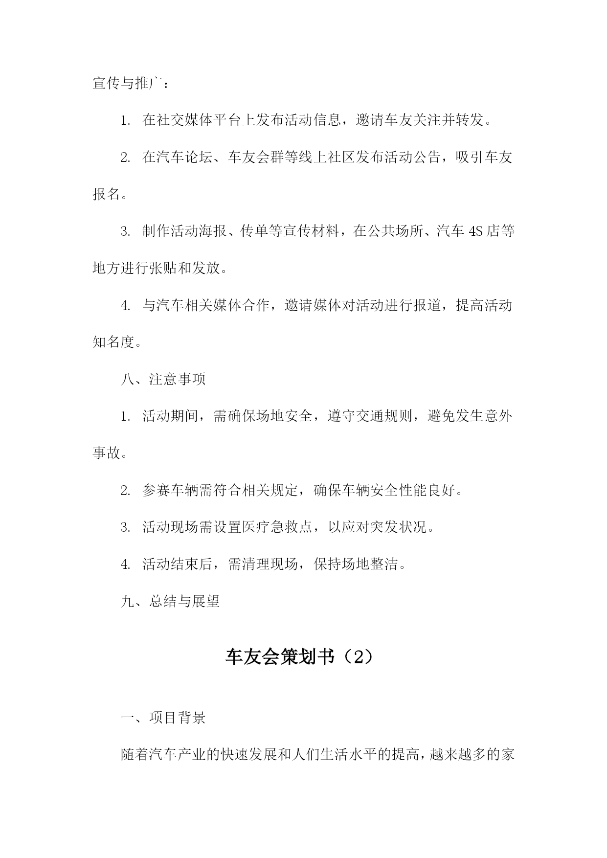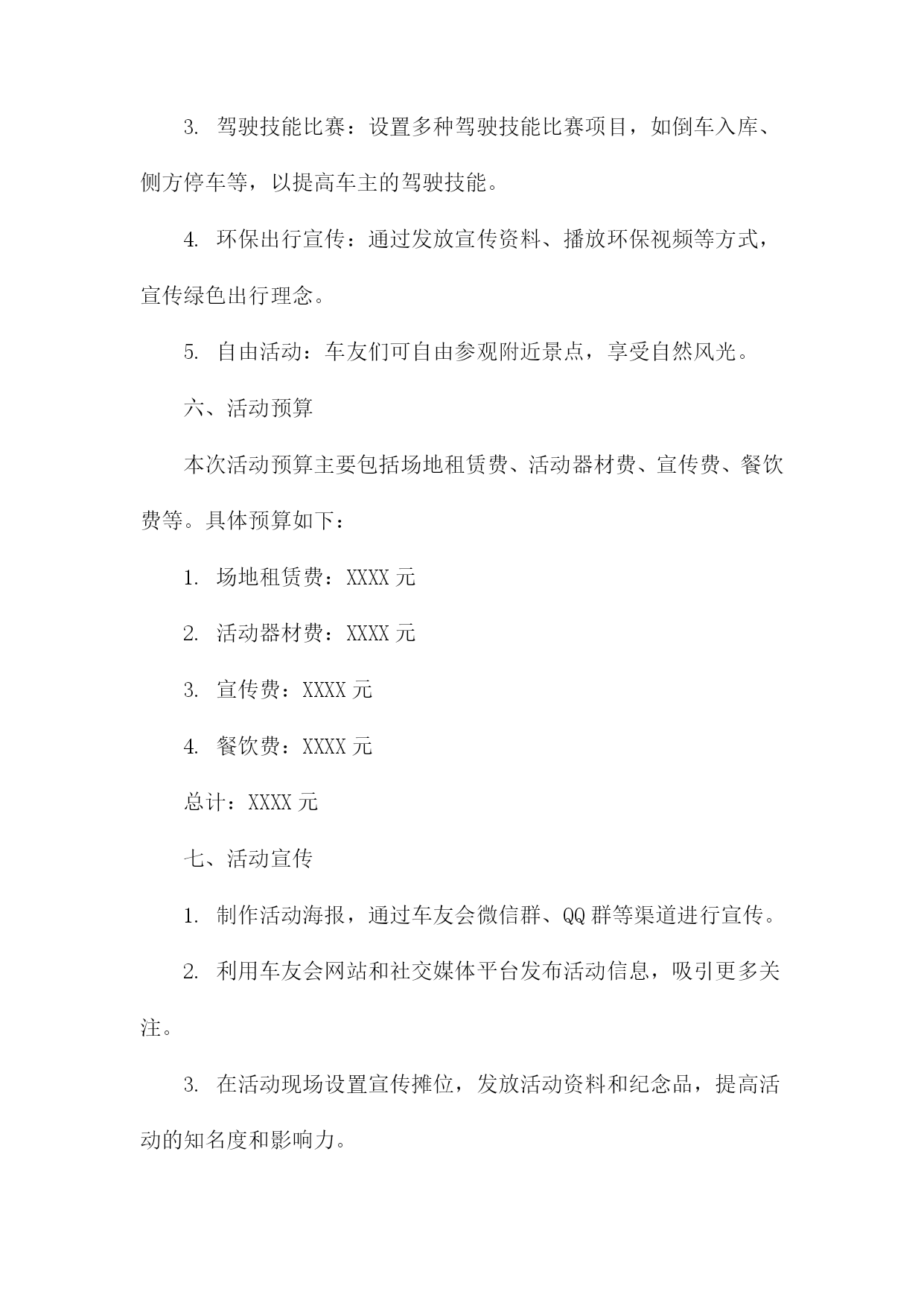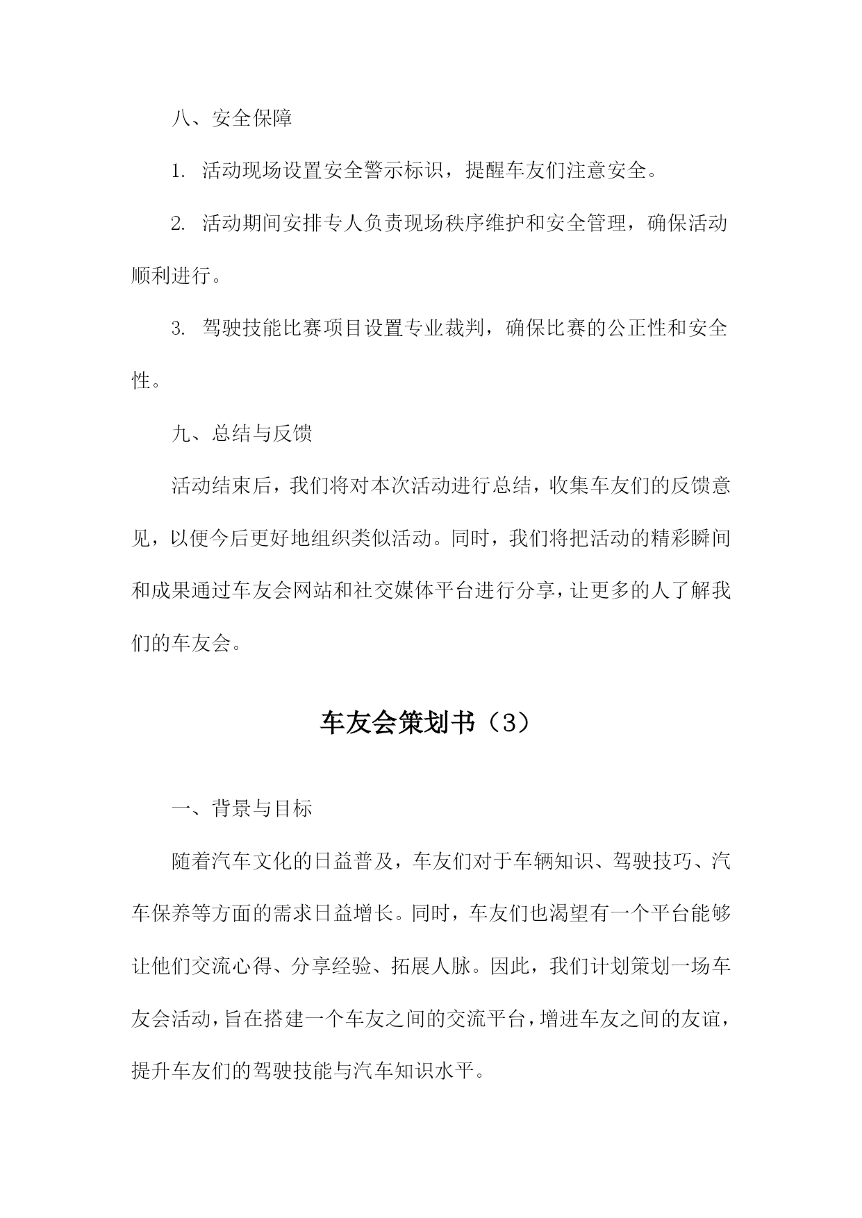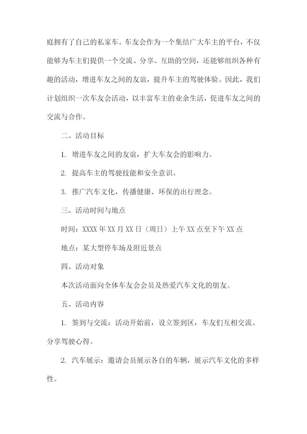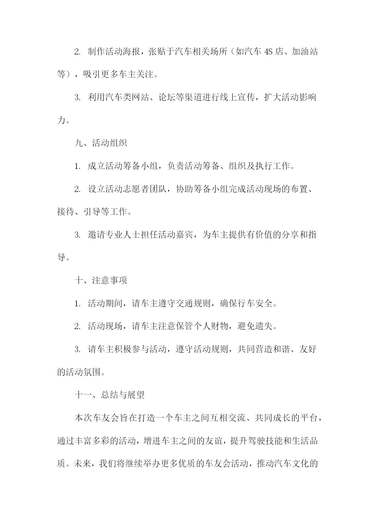 车友会策划书一、活动背景随着汽车文化的普及和人们对高品质生活的追求,车友会作为连接车主、分享驾驶乐趣、交流养车经验的重要平台,逐渐受到广大车主的青睐。本次车友会旨在打造一个车主之间互相交流、共同成长的平台,同时推广汽车文化,提升车主的驾驶技能和生活品质。二、活动目标1.增进车主之间的友谊,促进车友会成员间的交流与合作。2.分享驾驶经验、养车技巧,提高车主的驾驶技能和安全意识。3.推广汽车文化,提升车主对汽车的认识和欣赏水平。4.举办丰富多彩的活动,丰富车主的业余生活,提升生活品质。三、活动主题本次车友会主题为“驾驶乐趣生活品质”,旨在通过一系列活动,让车主们充分体验驾驶的乐趣,提升生活品质。四、活动时间与地点时间:XXXX年XX月XX日(周X)XX:XXXX:XX地点:XX市XX区XX路XX号XX公园停车场五、活动对象本次车友会面向所有热爱汽车、关注驾驶乐趣的车主,欢迎广大车主踊跃参加。六、活动内容1.开幕式:介绍车友会背景、目的及活动安排,邀请嘉宾致辞。2.车型展示:车主可自愿展示自己的爱车,分享购车、养车心得。3.驾驶技能比赛:设置趣味驾驶比赛项目,如倒车入库、S型绕桩等,提升车主驾驶技能。4.汽车知识讲座:邀请专业人士讲解汽车知识,提高车主对汽车的认识。5.自由交流环节:车主可自由交流,分享驾驶经验、养车技巧等。6.闭幕式:总结活动成果,颁发奖项,合影留念。七、活动预算本次车友会预算包括场地租赁费、设备租赁费、嘉宾邀请费、宣传费、奖品费等,预计总费用为人民币XX万元。八、宣传方案1.通过社交媒体平台(如微信群、QQ群等)进行活动宣传,邀请车主参加。2.制作活动海报,张贴于汽车相关场所(如汽车4S店、加油站等),吸引更多车主关注。3.利用汽车类网站、论坛等渠道进行线上宣传,扩大活动影响力。九、活动组织1.成立活动筹备小组,负责活动筹备、组织及执行工作。2.设立活动志愿者团队,协助筹备小组完成活动现场的布置、接待、引导等工作。3.邀请专业人士担任活动嘉宾,为车主提供有价值的分享和指导。十、注意事项1.活动期间,请车主遵守交通规则,确保行车安全。2.活动现场,请车主注意保管个人财物,避免遗失。3.请车主积极参与活动,遵守活动规则,共同营造和谐、友好的活动氛围。十一、总结与展望本次车友会旨在打造一个车主之间互相交流、共同成长的平台,通过丰富多彩的活动,增进车主之间的友谊,提升驾驶技能和生活品质。未来,我们将继续举办更多优质的车友会活动,推动汽车文化的发展,让广大车主共享美好汽车生活。车友会策划书(1)一、背景与目的随着汽车文化的不断普及和发展,车友们对于车辆知识、驾驶技巧、维修保养等方面的需求日益增强。为了满足广大车友的交流与互动需求,提升车友们的驾驶技能和安全意识,我们计划组织一场车友会活动。此次活动旨在搭建一个车友交流平台,增进车友之间的友谊,同时促进汽车文化的传播与发展。二、活动主题本次车友会活动主题为“驾驭激情,共享乐趣”。我们将围绕这一主题,开展一系列丰富多彩的活动,让车友们在轻松愉快的氛围中享受驾驶的乐趣。三、活动时间与地点时间:XXXX年XX月XX日(星期X)上午X点至下午X点地点:某大型停车场或汽车主题公园四、活动对象本次活动面向所有热爱汽车、关心驾驶技能的车友,不论年龄、性别、车型,均可报名参加。五、活动内容与安排1.活动开幕式:由活动主持人介绍活动背景、目的及流程,并邀请嘉宾致辞。2.车辆展示:车友们可以展示自己的爱车,分享购车、改装、保养等方面的经验。3.驾驶技能比赛:设置多个驾驶技能比赛项目,如倒车入库、侧方停车、S型绕桩等,让车友们切磋技艺,提升驾驶水平。4.汽车知识讲座:邀请汽车专家为车友们讲解汽车知识,提高车友们对车辆的认知和维护能力。5.互动游戏环节:组织车友们进行趣味互动游戏,增进彼此之间的友谊。6.活动闭幕式:颁发驾驶技能比赛奖项,总结活动成果,感谢参与人员。六、活动预算活动预算主要包括场地租赁费、设备租赁费、嘉宾邀请费、奖品采购费、宣传推广费等。具体预算将根据实际情况进行制定,确保活动顺利进行。七、宣传与推广为确保活动能够吸引更多的车友参与,我们将通过以下途径进行宣传与推广:1.在社交媒体平台上发布活动信息,邀请车友关注并转发。2.在汽车论坛、车友会群等线上社区发布活动公告,吸引车友报名。3.制作活动海报、传单等宣传材料,在公共场所、汽车4S店等地方进行张贴和发放。4.与汽车相关媒体合作,邀请媒体对活动进行报道,提高活动知名度。八、注意事项1.活动期间,需确保场地安全,遵守交通规则,避免发生意外事故。2.参赛车辆需符合相关规定,确保车辆安全性能良好。3.活动现场