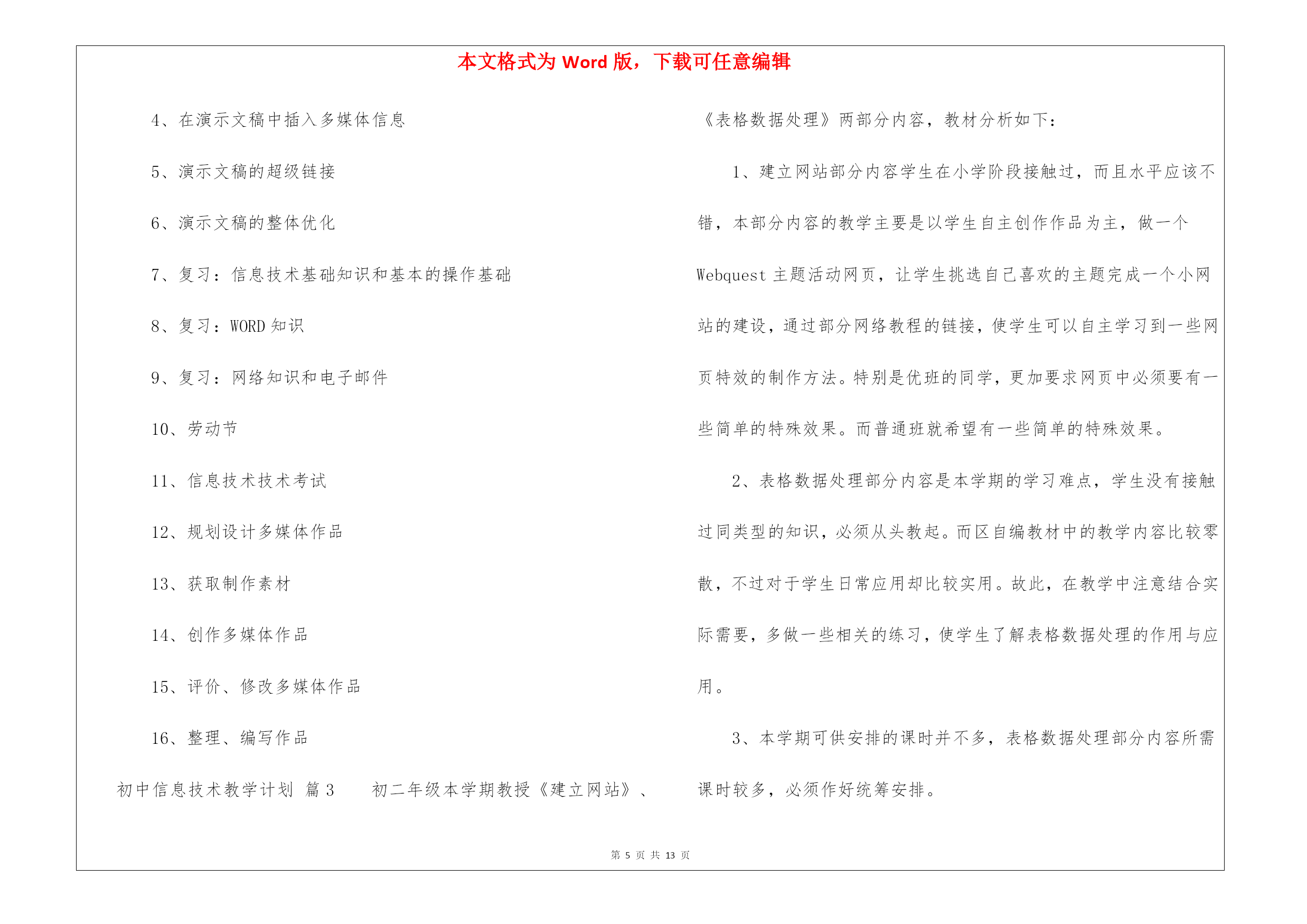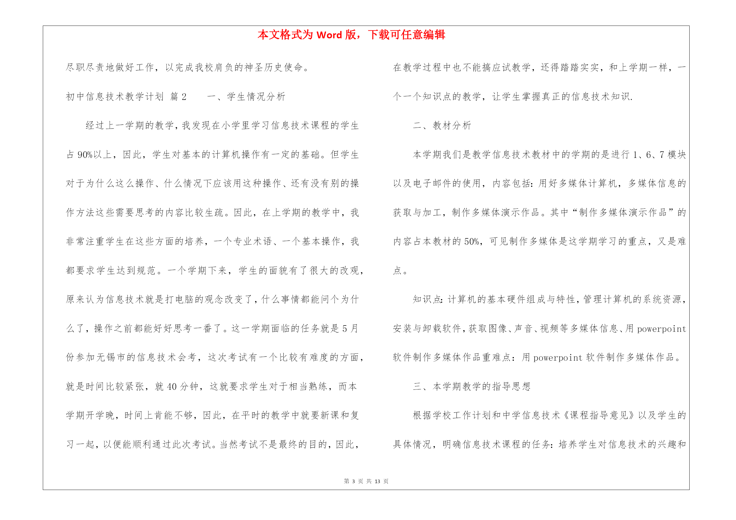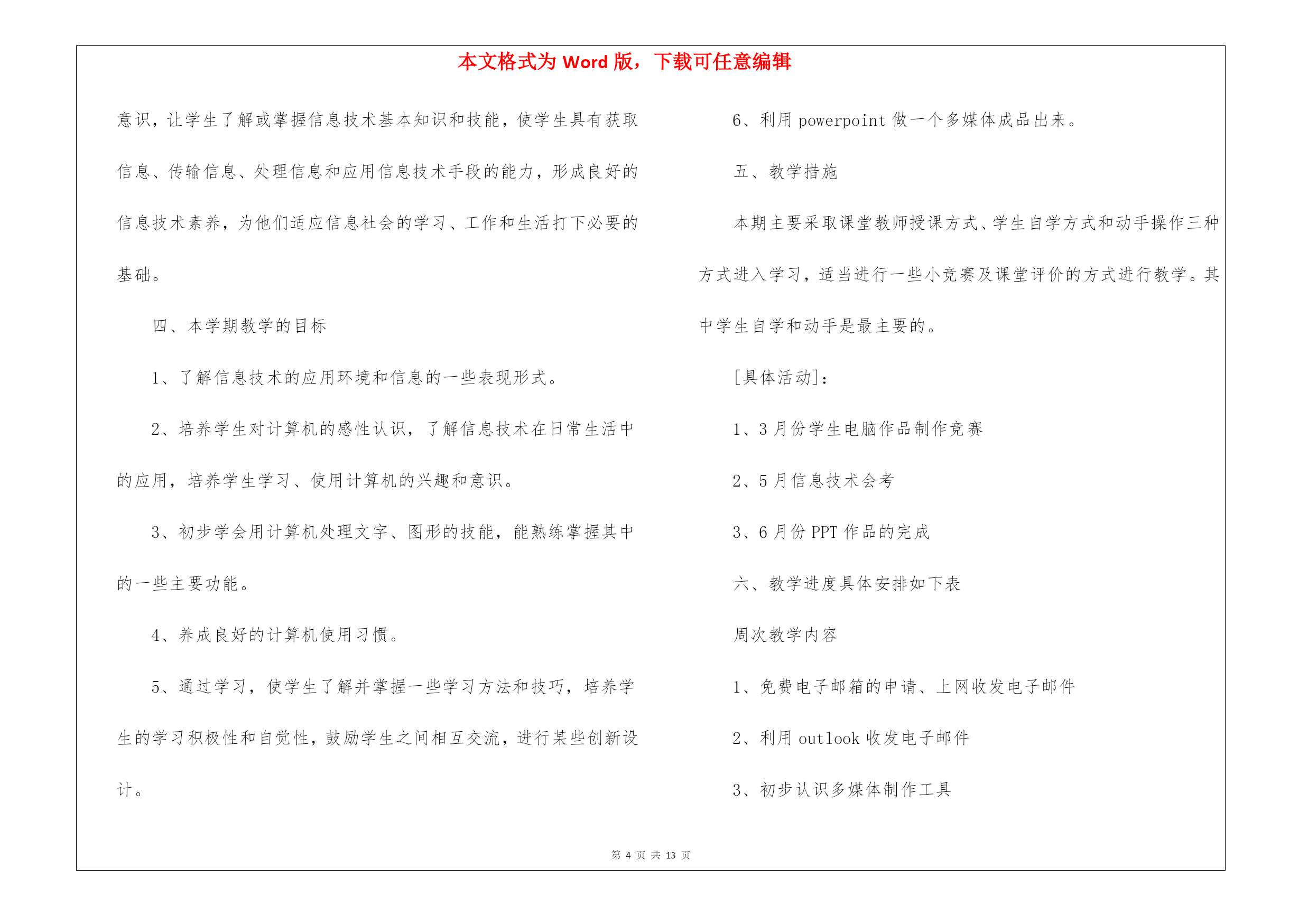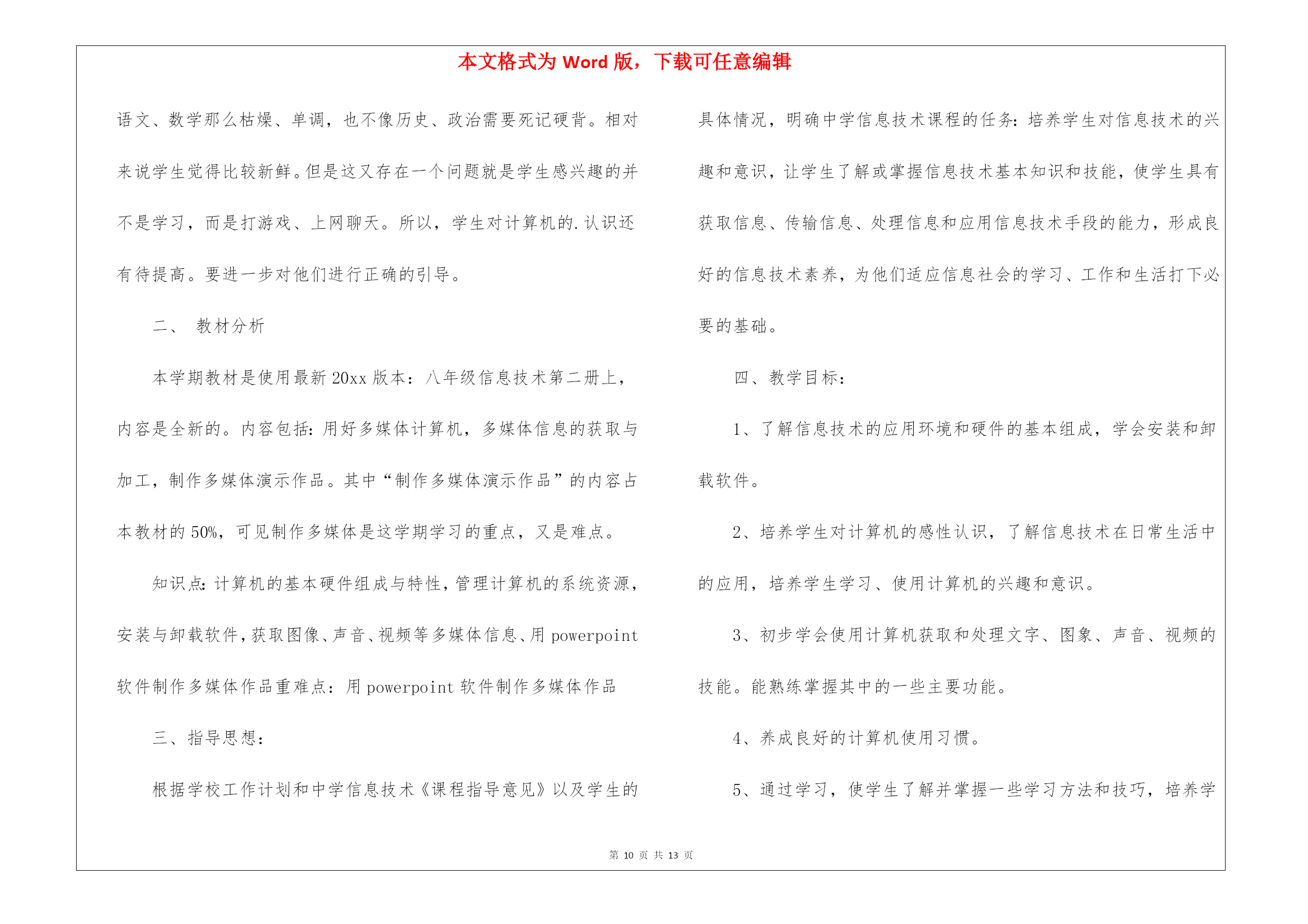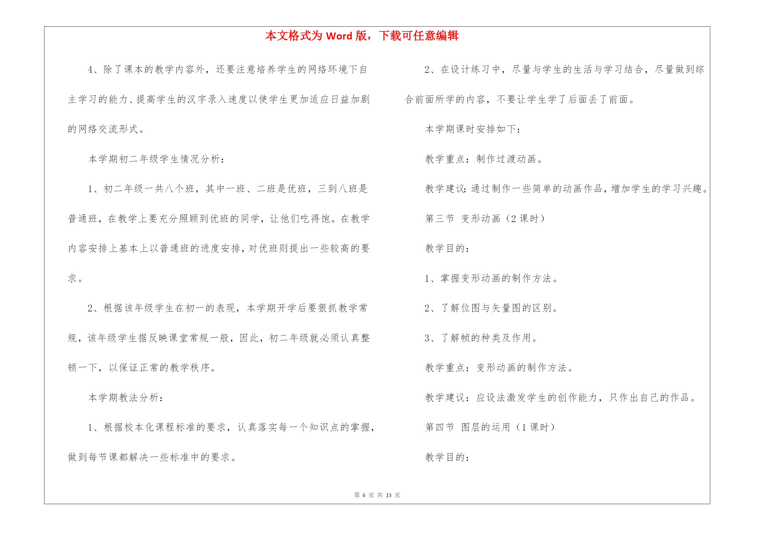 本文格式为Word版,下载可任意编辑第PAGE\*MERGEFORMAT13页共NUMPAGES\*MERGEFORMAT13页初中信息技术教学计划汇总六篇初中信息技术教学计划范文汇总六篇时间的脚步是无声的,它在不经意间流逝,我们的工作又将在忙碌中充实着,在喜悦中收获着,该为自己下阶段的学习制定一个计划了。想学习拟定计划却不知道该请教谁?以下是我整理的初中信息技术教学计划7篇,希望能够帮助到大家。初中信息技术教学计划篇1本学期,我担任七八年级两个班信息技术教学。我将以认真、严谨的治学态度,勤恳、坚持不懈的精神从事教学工作。由于教学经验尚浅。因此,我对教学工作认真学习,深入研究教法。以下是我在本学期的教学情况规划。一、思想认识。在这一个学期里,思想上严于律己,热爱党的教育事业。思想认识进步提高。二、教学工作。教学就是教与学,两者是相互联系,不可分割的,有教者就必然有学者。学生是被教的主体。因此,了解和分析学生情况,有针对地教对教学成功与否至关重要。最初接触教学的时候,我还不懂得了解学生对教学的重要性,只是专心研究书本,教材,想方设法令课堂生动,学生易接受。作为一名新的初中信息技术的老师,明白自己对教材的生疏,故在课前做要认真备课,多方面去搜集相关资料。为提高每节课的进行效果,教学质量,本人除注重研究教材,把握好基础、重点难点外,还采用多媒体多样形式教学。通过培养学生学习信息技术的兴趣,调动学生学习的积极性、主动性,提高课堂的教学质量,按时完成教学任务。认真制定计划,认真备课和教学,积极参加科组活动和备课组活动,上好汇报课,并能经常听各老师的课,从中吸取教学经验,取长补短,提高自己的教学的业务水平。每节课都以最佳的精神状态站在教坛,以热情、轻松、认真的形象去面对学生。让学生掌握好科学知识。还注意以德为本,结合现实生活中的现象层层善诱,多方面、多角度去培养现实良好的网络品德和高尚的人格。全面运用信息教学设施,实现教育教学信息化1、微机教学全面到位。本学期初,微机室40台学生机全部得到合理应用,让更多的学生在更好的环境里学习信息技术。2、多媒体教学工作有序开展本学期,我校继续白板教学的运用,利用网络给教育带来的便利,让教师接受更好的教育教学方法,使学生同步学到内地的新知与学习方法,使我校各科教学工作实现信息化教学更上一步台阶,即丰富了课堂内容又提高了学生学习积极性,开拓了学生求知范围。三、今后的努力方向:1、继续加强信息化教育教学,不断提高教师自身修养,紧跟时代发展步伐,与时俱进的进行多媒体教学工作。2、增加计算机课外活动,对差生多些关心,多点爱心,再多一些耐心,使他们在对计算机的认识上有更大进步。3、继续使各学科教师在多媒体课件制作上参加培训,提高教师在多媒体教学原有的基础上有更大的进步。4、利用各种方法,训练学生提高、集中注意力,将学生对计算机的兴趣尽量向学习上转移。5、在下一学期争取在现有的基础上有所提高,多组织一些计算机教学和培训活动,使教师和学生们在工作、学习上发展他们的特长,继续把信息技术有效利用。教育工作,是一项常做常新、永无止境的工作。社会在发展,时代在前进,学生的特点和问题也在发生着不断的变化。作为有责任感的教育基层,必须以高度的敏感性和自觉性,及时发现、研究和解决学生教育和管理工作中的新情况、新问题,掌握其特点、发现其规律,尽职尽责地做好工作,以完成我校肩负的神圣历史使命。初中信息技术教学计划篇2一、学生情况分析经过上一学期的教学,我发现在小学里学习信息技术课程的学生占90%以上,因此,学生对基本的计算机操作有一定的基础。但学生对于为什么这么操作、什么情况下应该用这种操作、还有没有别的操作方法这些需要思考的内容比较生疏。因此,在上学期的教学中,我非常注重学生在这些方面的培养,一个专业术语、一个基本操作,我都要求学生达到规范。一个学期下来,学生的面貌有了很大的改观,原来认为信息技术就是打电脑的观念改变了,什么事情都能问个为什么了,操作之前都能好好思考一番了。这一学期面临的任务就是5月份参加无锡市的信息技术会考,这次考试有一个比较有难度的方面,就是时间比较紧张,就40分钟,这就要求学生对于相当熟练,而本学期开学晚,时间上肯能不够,因此,在平时的教学中就要新课和复习一起,以便能顺利通过此次考试。当然考试不是最终的目的,因此,在教学过程中也不能搞应试教学,还得踏踏实实,和上学期一样,一个一个知识点的教学,让学生掌握真正的信息技术知识.二、教材分析本学期我们是教学信息技术教材中的学期的是进行1、6、7模块以及电子邮件的使用,内容包括:用好多媒体计算机,多媒体信息的获取与加工,制作多媒体演示作品。其中“制作多媒体演示作品”的内容占本教材的50%,可见制作多媒体是这学期学习的重点,又是难点。知识点:计算机的基