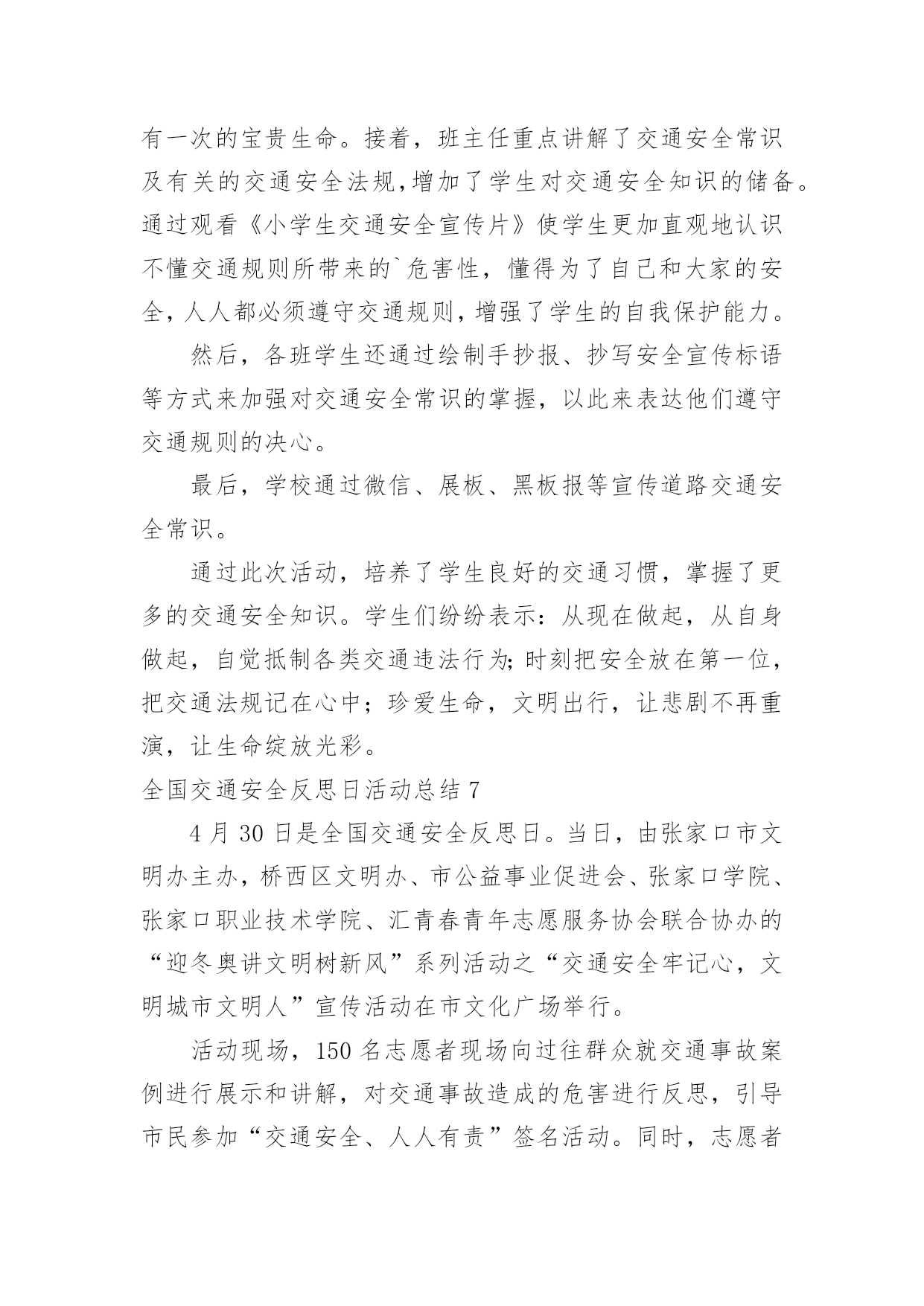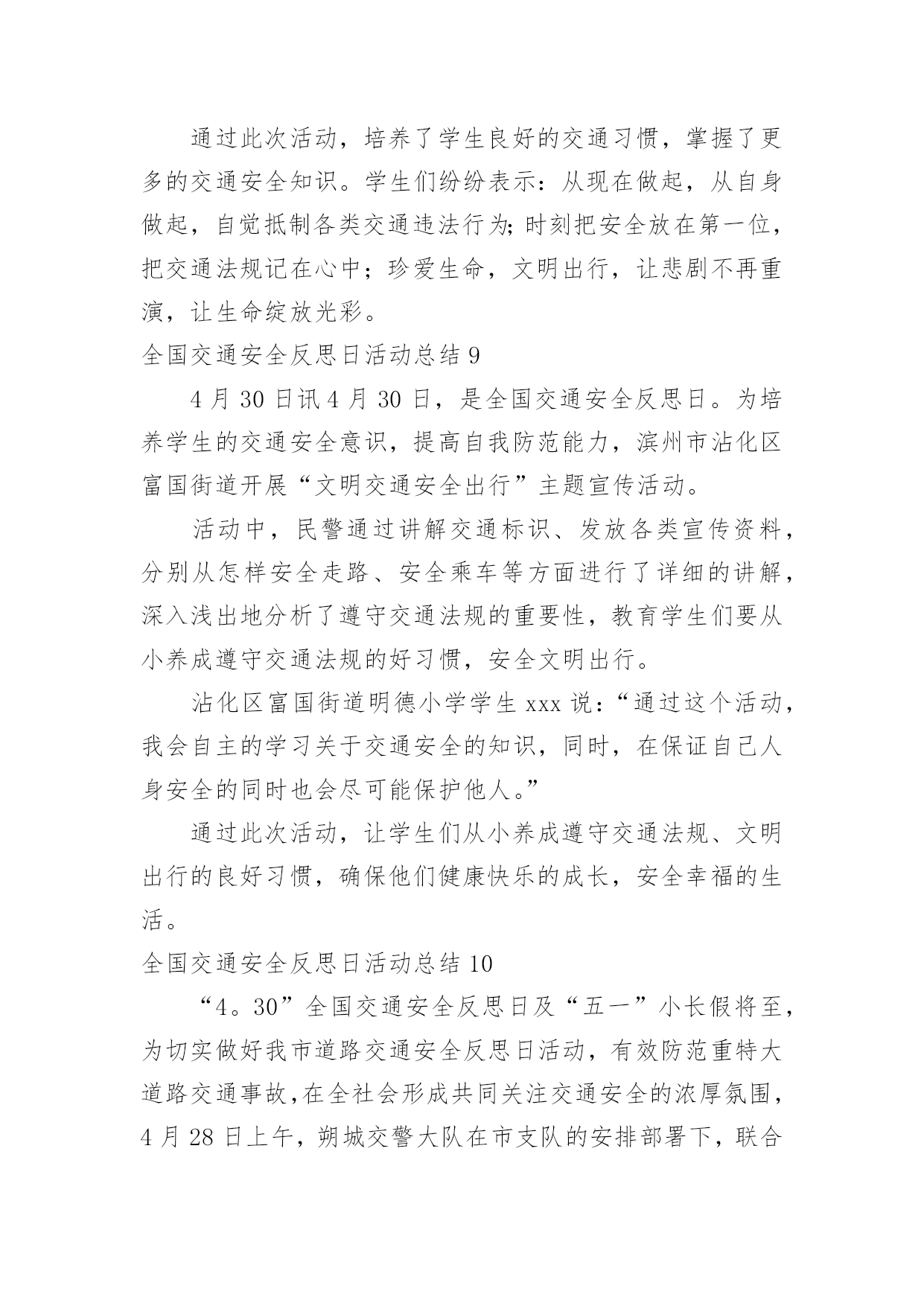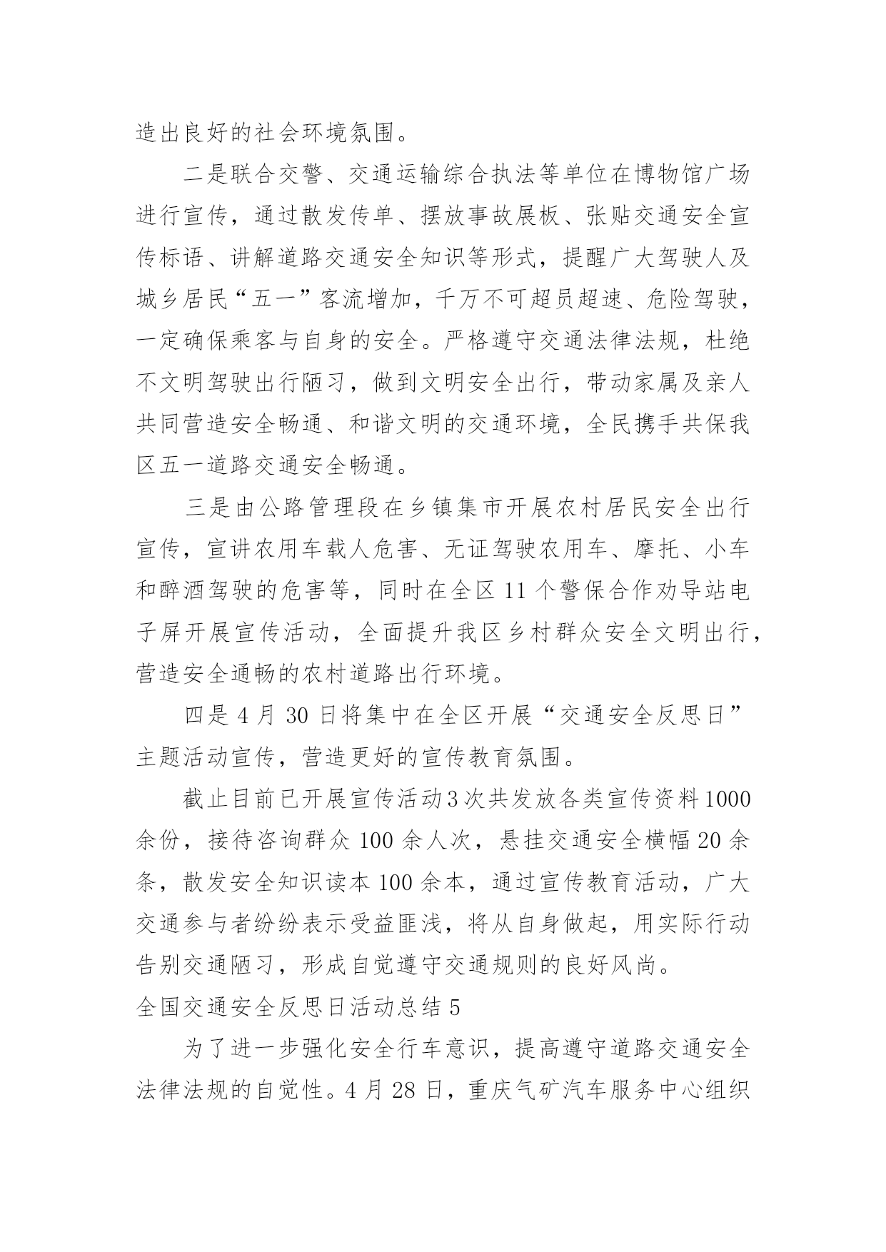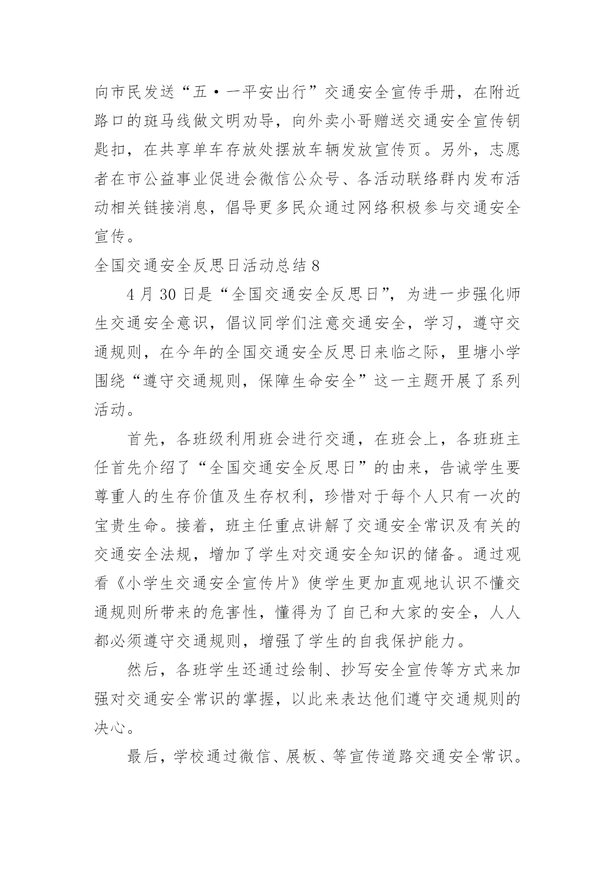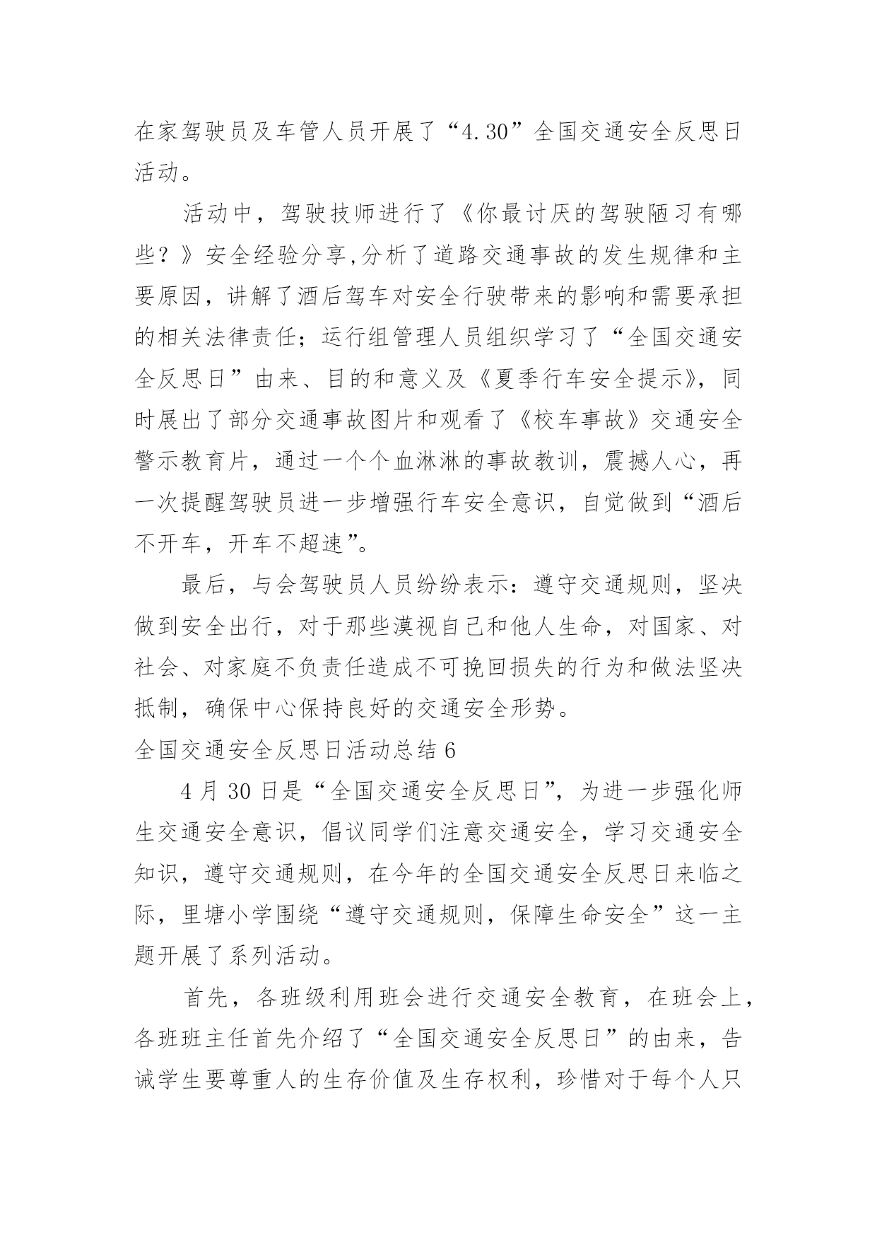 全国交通安全反思日活动总结全国交通安全反思日活动总结11篇总结就是把一个时段的学习、工作或其完成情况进行一次全面系统的总结,它能帮我们理顺知识结构,突出重点,突破难点,让我们来为自己写一份总结吧。我们该怎么去写总结呢?下面是小编收集整理的全国交通安全反思日活动总结,仅供参考,欢迎大家阅读。全国交通安全反思日活动总结14月30日是全国交通安全宣传日,xx中心小学抓住这一安全教育契机,利用升旗集会积极对学生进行交通安全教育。学校政教处孙兆唐主任向全体同学讲解了“全国交通安全反思日”的相关知识,号召全体同学增强交通守法意识、安全意识和公德意识,确保自己及家人的出行安全。本次主题教育活动的开展,增强了学生的交通安全意识,使学生逐步养成文明出行的良好习惯;强化了“小手拉大手”的带动方式,使学生不仅自己能够遵守交通法规,而且积极向家人宣传交通安全知识,达到通过一个孩子影响一个家庭、带动整个社会的宣传效果。在本周内,各班级将围绕这一主题举行交通安全教育主题班会,进一步加强对交通安全法规、常识的宣传教育,确实提高全校学生遵守交通法规的自觉性和自我保护能力,做到告别陋习,文明出行,安全抵达。全国交通安全反思日活动总结220__年12月2日是我国第__个“全国交通安全日”。为进一步提高广大师生的交通安全意识和交通文明意识,最大限度地预防和减少冬季道路交通事故发生,11月23—12月6日,__县__中心小学开展了“全国交通安全宣传日”宣传暨“交通安全周”活动。学校利用升旗仪式,宣传全国交通安全宣传日的意义;向学生讲解了常见的交通标志标线、交通安全常识、乘车安全知识和交通事故带来的危害,特别是针对冬季特点提出了很多注意事项。同时,学校还制作板报、宣传展板,刊出交通事故案例、图片,向师生宣传遵守交通规则的重要性;学校还下发《全国交通安全日文明交通》等宣传资料,悬挂安全警示横幅,班级利用队会课,播放《让生命无憾》(122国民交通安全系列公益宣传教育片)等方式,让学生更真实感受到交通安全交通安全的重要性。通过活动,让一个学生带动一个家庭,一个家庭带动一个社区,起到“小手拉大手”的效果,真正做到人人关注交通安全,人人遵守交通法规,高高兴兴上学,平平安安回家。全国交通安全反思日活动总结3根据上级关于开展全国交通安全反思日活动精神,我校开展了形式多样的教育活动,加大了交通安全的宣传力度,增强了全体学生的交通安全观念,在全体师生中进一步形成了“安全第一,人人有责”的意识。现将活动有关情况总结如下:一、广泛宣传开展学生交通安全知识宣传周活动。各中队利用中队会,向同学宣有关交通安全法规常识,把交通安全工作作为学校日常的重点工作,寓安全教育于活动中,加强安全教育,提高安全意识,养成安全习惯。二、开展以安全教育为主题的国旗下讲话。校长利用国旗下讲话,给全体师生上一堂交通安全教育课,使同学们时刻注意交通安全,做到知法守法,确保安全,避免事故发生。通过这次“全国交通安全反思日”活动,强化了广大师生的安全意识,增强了自我防范能力,提高了交通法制观念,今后,我校决心在搞好教育教学工作的同时,继续对师生进行安全教育,为创建平安校园而努力。全国交通安全反思日活动总结44月30日是“全国交通安全反思日”,近期xxx局联合xxxx执法支队,通过进客运、货运、危化品运输企业、进学校等方式,对客、货运、危化企业负责人、重点驾驶员和中小学学生开展交通安全反思日主题教育。一是通过观看“平安365”安全警示节目,从一个个活生生的事例,教育广大驾驶员、学生要珍惜生命,遵守交通规则,同时还针对“五一”假期,路上车辆增多的情况,开展五一交通安全警示教育,进行“一盔一带”主题交通安全培训,交通安全知识测试,发放安全宣传资料,全面提高驾驶员和中小学学生交通安全意识、法治意识、文明意识,从源头预防交通事故发生,为依法文明出行、依法有序通行营造出良好的社会环境氛围。二是联合交警、交通运输综合执法等单位在博物馆广场进行宣传,通过散发传单、摆放事故展板、张贴交通安全宣传标语、讲解道路交通安全知识等形式,提醒广大驾驶人及城乡居民“五一”客流增加,千万不可超员超速、危险驾驶,一定确保乘客与自身的安全。严格遵守交通法律法规,杜绝不文明驾驶出行陋习,做到文明安全出行,带动家属及亲人共同营造安全畅通、和谐文明的交通环境,全民携手共保我区五一道路交通安全畅通。三是由公路管理段在乡镇集市开展农村居民安全出行宣传,宣讲农用车载人危害、无证驾驶农用车、摩托、小车和醉酒驾驶的危害等,同时在全区11个警保合作劝导站电子屏开展宣传活动,全面提升我区乡村群众安全文明出行,营造安全通畅的农村道路出行环境。四是4月30日将集中在全区开展“交通安全反思日”主题活动宣传,营造更好的宣传教育氛围。截止目前已开展宣传活动3次共发放各类宣传资料100