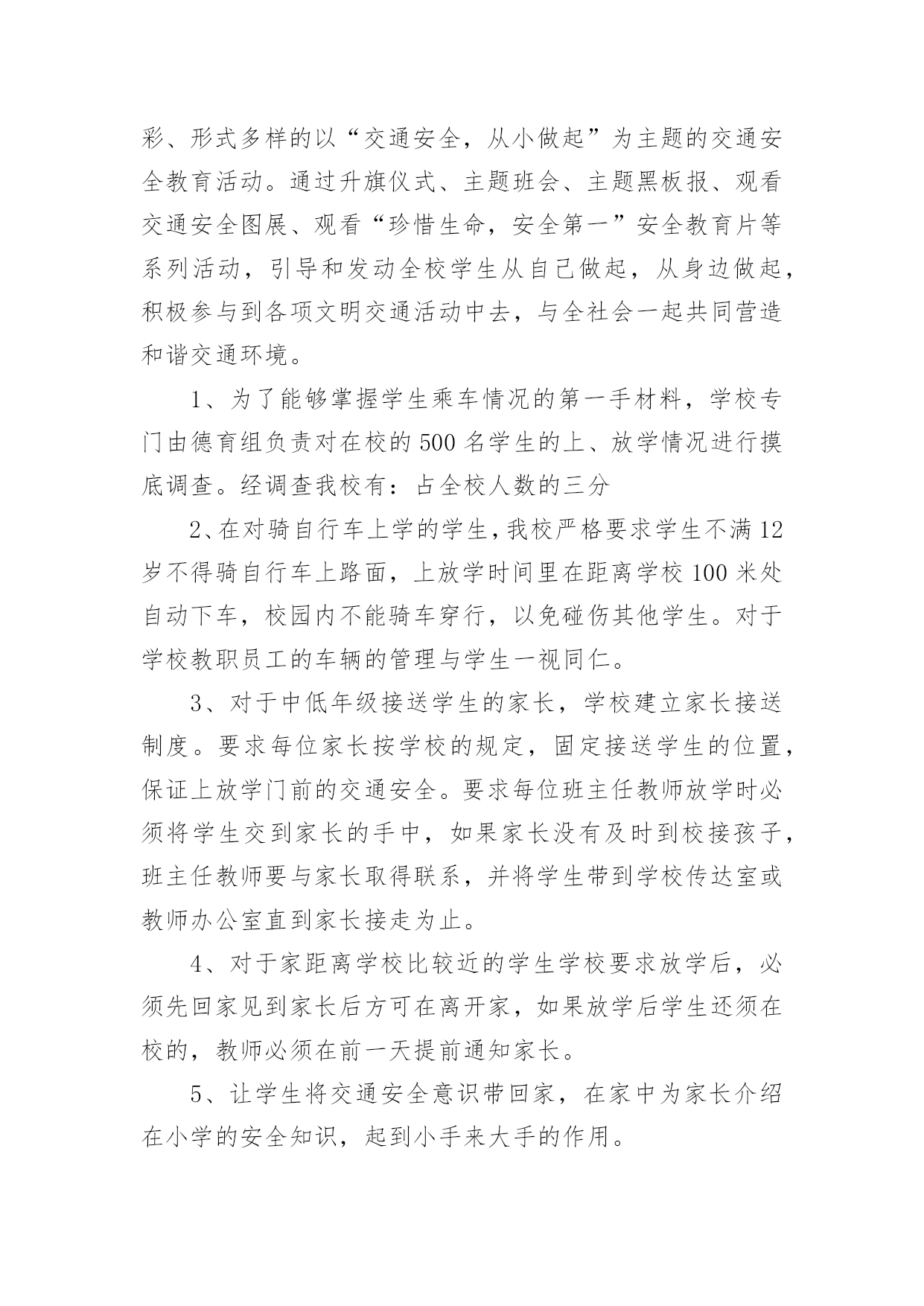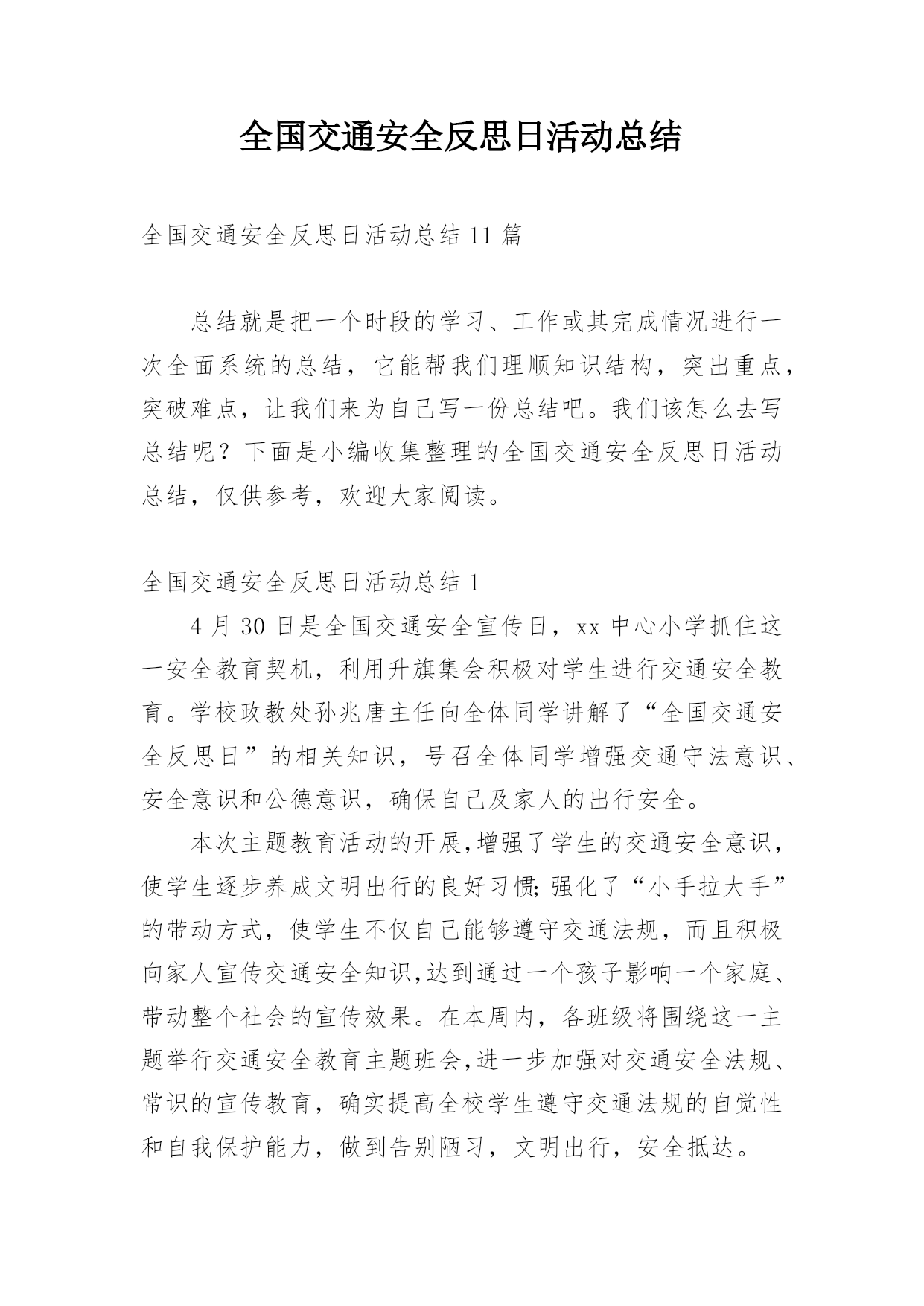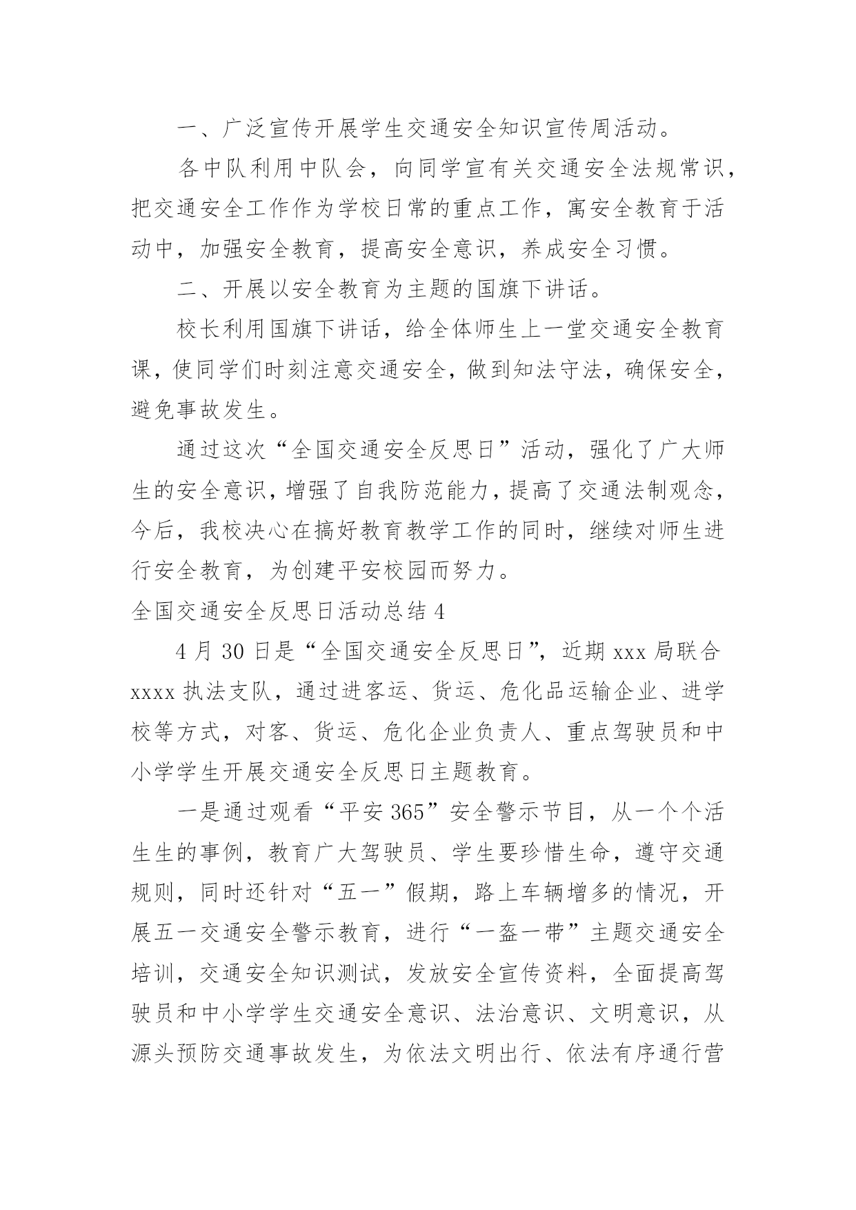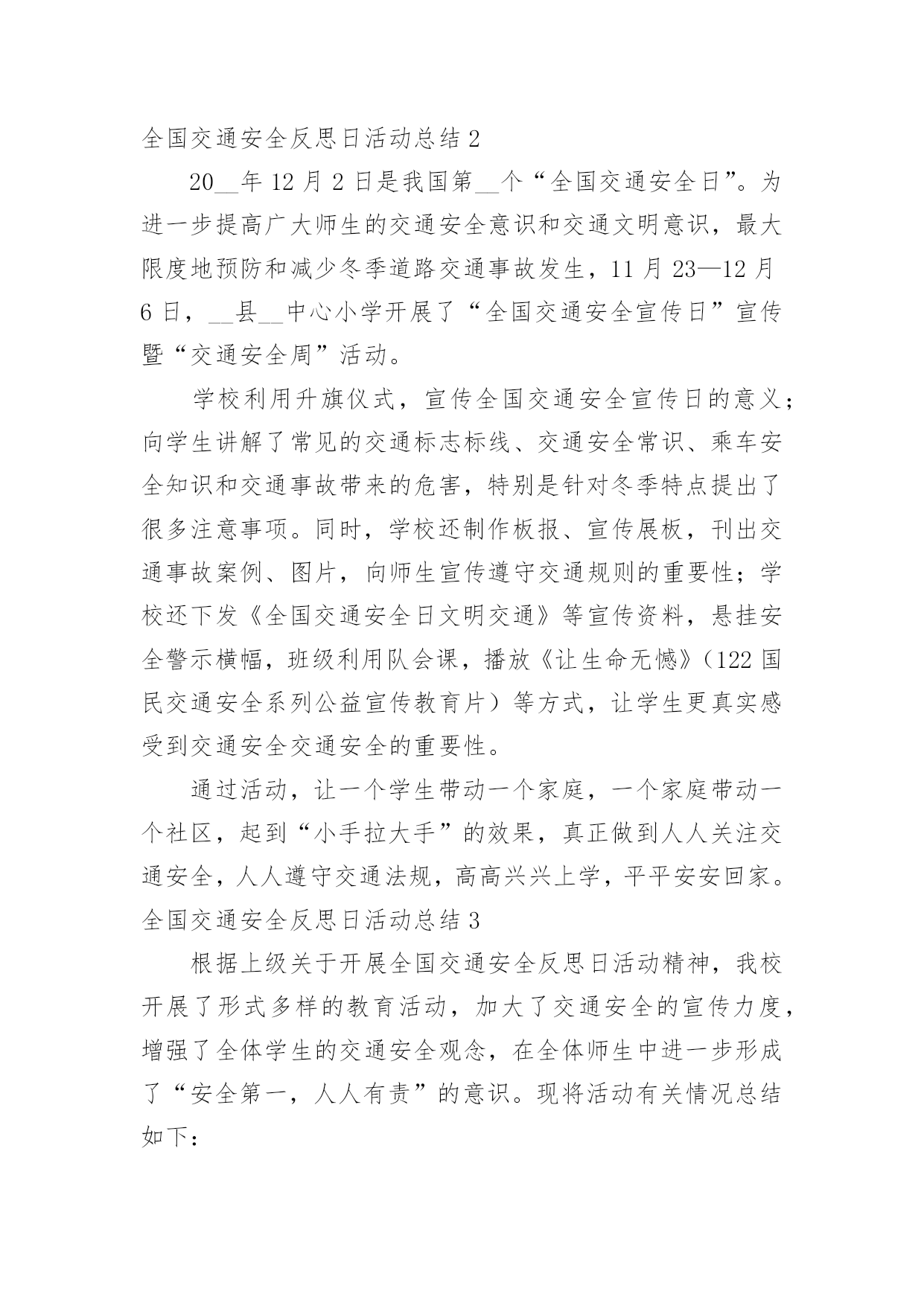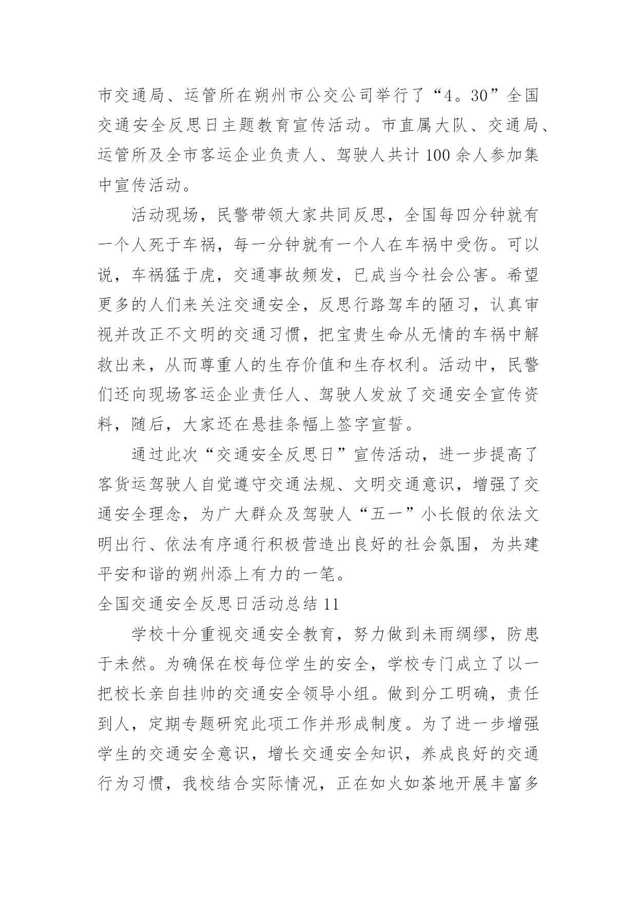 全国交通安全反思日活动总结全国交通安全反思日活动总结11篇总结就是把一个时段的学习、工作或其完成情况进行一次全面系统的总结,它能帮我们理顺知识结构,突出重点,突破难点,让我们来为自己写一份总结吧。我们该怎么去写总结呢?下面是小编收集整理的全国交通安全反思日活动总结,仅供参考,欢迎大家阅读。全国交通安全反思日活动总结14月30日是全国交通安全宣传日,xx中心小学抓住这一安全教育契机,利用升旗集会积极对学生进行交通安全教育。学校政教处孙兆唐主任向全体同学讲解了“全国交通安全反思日”的相关知识,号召全体同学增强交通守法意识、安全意识和公德意识,确保自己及家人的出行安全。本次主题教育活动的开展,增强了学生的交通安全意识,使学生逐步养成文明出行的良好习惯;强化了“小手拉大手”的带动方式,使学生不仅自己能够遵守交通法规,而且积极向家人宣传交通安全知识,达到通过一个孩子影响一个家庭、带动整个社会的宣传效果。在本周内,各班级将围绕这一主题举行交通安全教育主题班会,进一步加强对交通安全法规、常识的宣传教育,确实提高全校学生遵守交通法规的自觉性和自我保护能力,做到告别陋习,文明出行,安全抵达。全国交通安全反思日活动总结220__年12月2日是我国第__个“全国交通安全日”。为进一步提高广大师生的交通安全意识和交通文明意识,最大限度地预防和减少冬季道路交通事故发生,11月23—12月6日,__县__中心小学开展了“全国交通安全宣传日”宣传暨“交通安全周”活动。学校利用升旗仪式,宣传全国交通安全宣传日的意义;向学生讲解了常见的交通标志标线、交通安全常识、乘车安全知识和交通事故带来的危害,特别是针对冬季特点提出了很多注意事项。同时,学校还制作板报、宣传展板,刊出交通事故案例、图片,向师生宣传遵守交通规则的重要性;学校还下发《全国交通安全日文明交通》等宣传资料,悬挂安全警示横幅,班级利用队会课,播放《让生命无憾》(122国民交通安全系列公益宣传教育片)等方式,让学生更真实感受到交通安全交通安全的重要性。通过活动,让一个学生带动一个家庭,一个家庭带动一个社区,起到“小手拉大手”的效果,真正做到人人关注交通安全,人人遵守交通法规,高高兴兴上学,平平安安回家。全国交通安全反思日活动总结3根据上级关于开展全国交通安全反思日活动精神,我校开展了形式多样的教育活动,加大了交通安全的宣传力度,增强了全体学生的交通安全观念,在全体师生中进一步形成了“安全第一,人人有责”的意识。现将活动有关情况总结如下:一、广泛宣传开展学生交通安全知识宣传周活动。各中队利用中队会,向同学宣有关交通安全法规常识,把交通安全工作作为学校日常的重点工作,寓安全教育于活动中,加强安全教育,提高安全意识,养成安全习惯。二、开展以安全教育为主题的国旗下讲话。校长利用国旗下讲话,给全体师生上一堂交通安全教育课,使同学们时刻注意交通安全,做到知法守法,确保安全,避免事故发生。通过这次“全国交通安全反思日”活动,强化了广大师生的安全意识,增强了自我防范能力,提高了交通法制观念,今后,我校决心在搞好教育教学工作的同时,继续对师生进行安全教育,为创建平安校园而努力。全国交通安全反思日活动总结44月30日是“全国交通安全反思日”,近期xxx局联合xxxx执法支队,通过进客运、货运、危化品运输企业、进学校等方式,对客、货运、危化企业负责人、重点驾驶员和中小学学生开展交通安全反思日主题教育。一是通过观看“平安365”安全警示节目,从一个个活生生的事例,教育广大驾驶员、学生要珍惜生命,遵守交通规则,同时还针对“五一”假期,路上车辆增多的情况,开展五一交通安全警示教育,进行“一盔一带”主题交通安全培训,交通安全知识测试,发放安全宣传资料,全面提高驾驶员和中小学学生交通安全意识、法治意识、文明意识,从源头预防交通事故发生,为依法文明出行、依法有序通行营造出良好的社会环境氛围。二是联合交警、交通运输综合执法等单位在博物馆广场进行宣传,通过散发传单、摆放事故展板、张贴交通安全宣传标语、讲解道路交通安全知识等形式,提醒广大驾驶人及城乡居民“五一”客流增加,千万不可超员超速、危险驾驶,一定确保乘客与自身的安全。严格遵守交通法律法规,杜绝不文明驾驶出行陋习,做到文明安全出行,带动家属及亲人共同营造安全畅通、和谐文明的交通环境,全民携手共保我区五一道路交通安全畅通。三是由公路管理段在乡镇集市开展农村居民安全出行宣传,宣讲农用车载人危害、无证驾驶农用车、摩托、小车和醉酒驾驶的危害等,同时在全区11个警保合作劝导站电子屏开展宣传活动,全面提升我区乡村群众安全文明出行,营造安全通畅的农村道路出行环境。四是4月30日将集中在全区开展“交通安全反思日”主题活动宣传,营造更好的宣传教育氛围。截止目前已开展宣传活动3次共发放各类宣传资料100
