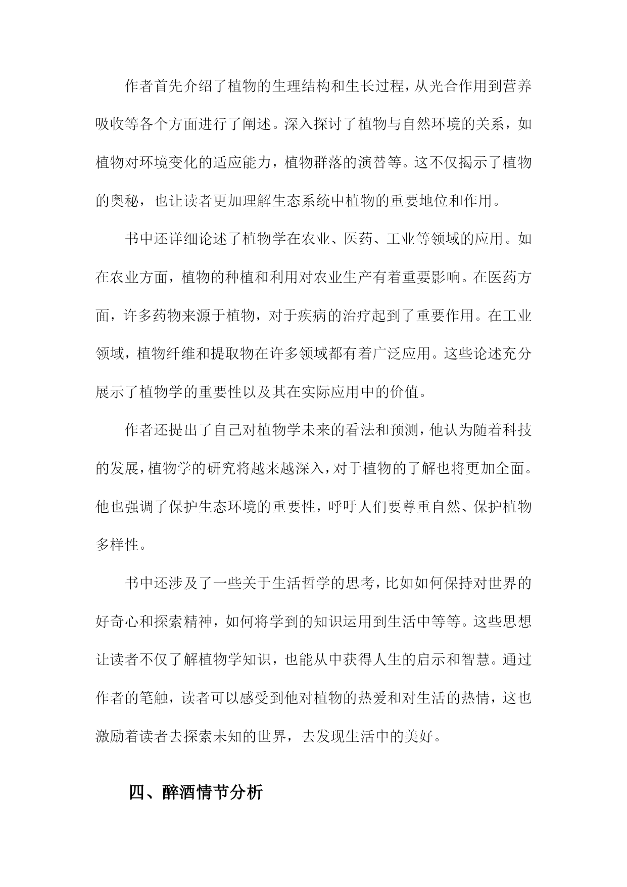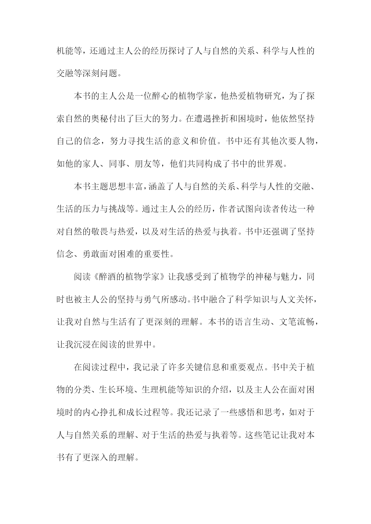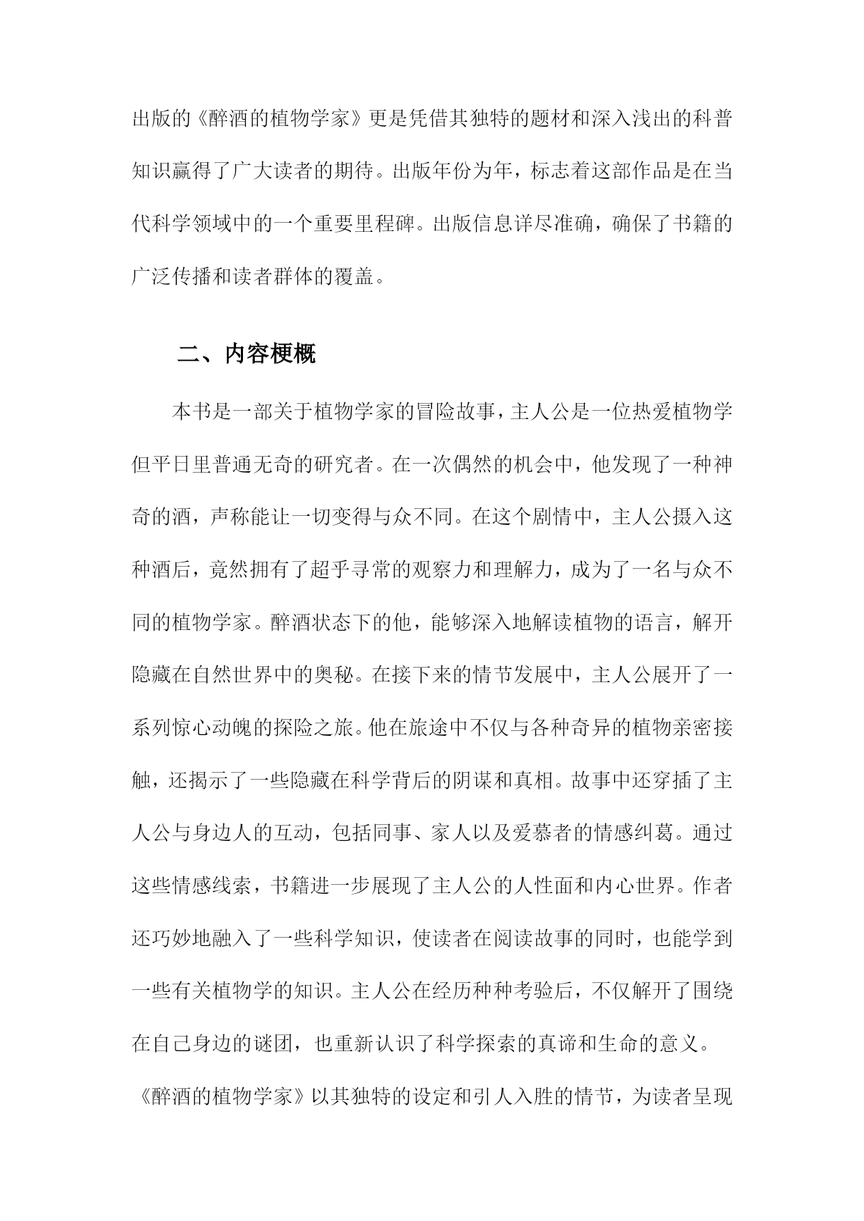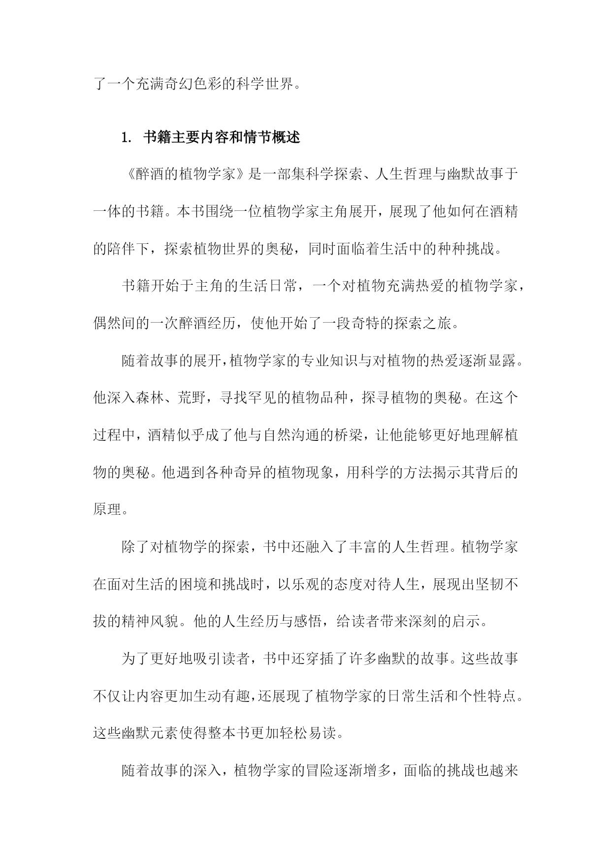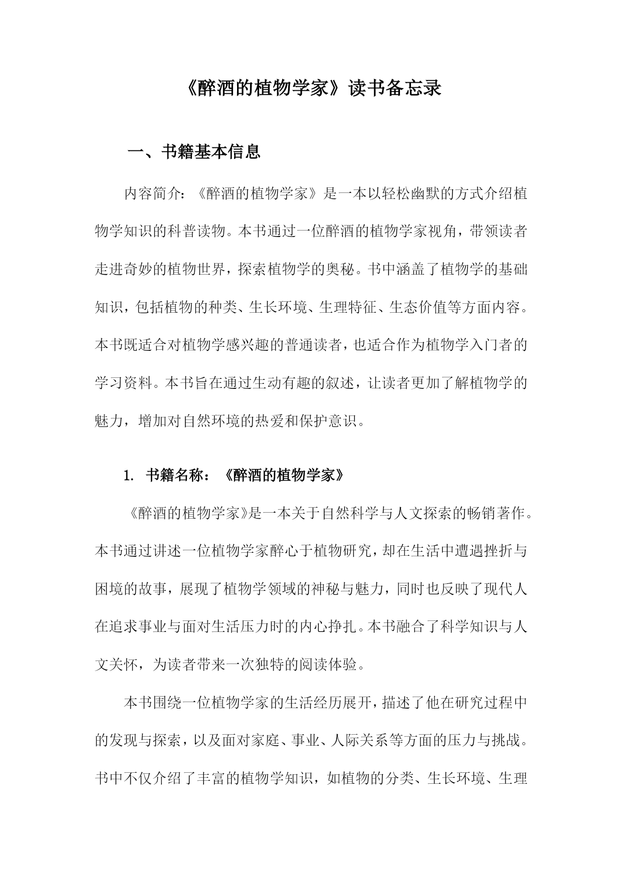 《醉酒的植物学家》读书备忘录一、书籍基本信息内容简介:《醉酒的植物学家》是一本以轻松幽默的方式介绍植物学知识的科普读物。本书通过一位醉酒的植物学家视角,带领读者走进奇妙的植物世界,探索植物学的奥秘。书中涵盖了植物学的基础知识,包括植物的种类、生长环境、生理特征、生态价值等方面内容。本书既适合对植物学感兴趣的普通读者,也适合作为植物学入门者的学习资料。本书旨在通过生动有趣的叙述,让读者更加了解植物学的魅力,增加对自然环境的热爱和保护意识。1.书籍名称:《醉酒的植物学家》《醉酒的植物学家》是一本关于自然科学与人文探索的畅销著作。本书通过讲述一位植物学家醉心于植物研究,却在生活中遭遇挫折与困境的故事,展现了植物学领域的神秘与魅力,同时也反映了现代人在追求事业与面对生活压力时的内心挣扎。本书融合了科学知识与人文关怀,为读者带来一次独特的阅读体验。本书围绕一位植物学家的生活经历展开,描述了他在研究过程中的发现与探索,以及面对家庭、事业、人际关系等方面的压力与挑战。书中不仅介绍了丰富的植物学知识,如植物的分类、生长环境、生理机能等,还通过主人公的经历探讨了人与自然的关系、科学与人性的交融等深刻问题。本书的主人公是一位醉心的植物学家,他热爱植物研究,为了探索自然的奥秘付出了巨大的努力。在遭遇挫折和困境时,他依然坚持自己的信念,努力寻找生活的意义和价值。书中还有其他次要人物,如他的家人、同事、朋友等,他们共同构成了书中的世界观。本书主题思想丰富,涵盖了人与自然的关系、科学与人性的交融、生活的压力与挑战等。通过主人公的经历,作者试图向读者传达一种对自然的敬畏与热爱,以及对生活的热爱与执着。书中还强调了坚持信念、勇敢面对困难的重要性。阅读《醉酒的植物学家》让我感受到了植物学的神秘与魅力,同时也被主人公的坚持与勇气所感动。书中融合了科学知识与人文关怀,让我对自然与生活有了更深刻的理解。本书的语言生动、文笔流畅,让我沉浸在阅读的世界中。在阅读过程中,我记录了许多关键信息和重要观点。书中关于植物的分类、生长环境、生理机能等知识的介绍,以及主人公在面对困境时的内心挣扎和成长过程等。我还记录了一些感悟和思考,如对于人与自然关系的理解、对于生活的热爱与执着等。这些笔记让我对本书有了更深入的理解。2.作者信息:包括作者姓名、生平简介及创作背景等生平简介:该作者是一位具有深厚自然科学背景和文学才华的学者。他她在植物学领域有着深入的研究和丰富的实践经验,同时热爱文学创作,善于将科学与文学相结合,创作出富有想象力和人文关怀的作品。作者还涉猎广泛,对哲学、历史等领域也有所研究。创作背景:本书的创作背景源于作者对植物学的热爱以及对人类与自然关系的深入思考。他她在深入研究植物学的过程中,深受大自然的启发,以独特的视角观察世界,将科学知识与文学想象相结合,创作出这部充满魅力的作品《醉酒的植物学家》。在创作过程中,作者也融入了自己对人生、社会的观察和感悟,使得作品内涵丰富,引人深思。时代背景:本书的创作正值当代社会快速发展,科技进步的同时,人们逐渐开始关注自然、环境和人类与自然的关系。在此背景下,作者通过本书传达出对自然的敬畏和对人类文明的反思,呼唤人们关注自然、珍惜自然,寻求人与自然的和谐共生。通过对植物学家的生动描绘,展现出对科学的热爱和对科学探索精神的赞美。3.出版信息:包括出版社、出版年份等该书籍由知名出版社——自然探索出版社于年发行出版。自然探索出版社以其对自然科学领域的深度挖掘和高质量出版而闻名,此次出版的《醉酒的植物学家》更是凭借其独特的题材和深入浅出的科普知识赢得了广大读者的期待。出版年份为年,标志着这部作品是在当代科学领域中的一个重要里程碑。出版信息详尽准确,确保了书籍的广泛传播和读者群体的覆盖。二、内容梗概本书是一部关于植物学家的冒险故事,主人公是一位热爱植物学但平日里普通无奇的研究者。在一次偶然的机会中,他发现了一种神奇的酒,声称能让一切变得与众不同。在这个剧情中,主人公摄入这种酒后,竟然拥有了超乎寻常的观察力和理解力,成为了一名与众不同的植物学家。醉酒状态下的他,能够深入地解读植物的语言,解开隐藏在自然世界中的奥秘。在接下来的情节发展中,主人公展开了一系列惊心动魄的探险之旅。他在旅途中不仅与各种奇异的植物亲密接触,还揭示了一些隐藏在科学背后的阴谋和真相。故事中还穿插了主人公与身边人的互动,包括同事、家人以及爱慕者的情感纠葛。通过这些情感线索,书籍进一步展现了主人公的人性面和内心世界。作者还巧妙地融入了一些科学知识,使读者在阅读故事的同时,也能学到一些有关植物学的知识。主人公在经历种种考验后,不仅解开了围绕在自己身边的谜团,也重新认识了科学探索的真谛和生命的意义。《醉酒的植物学家》以其独特的设定和引人入胜的情节,为读者呈
