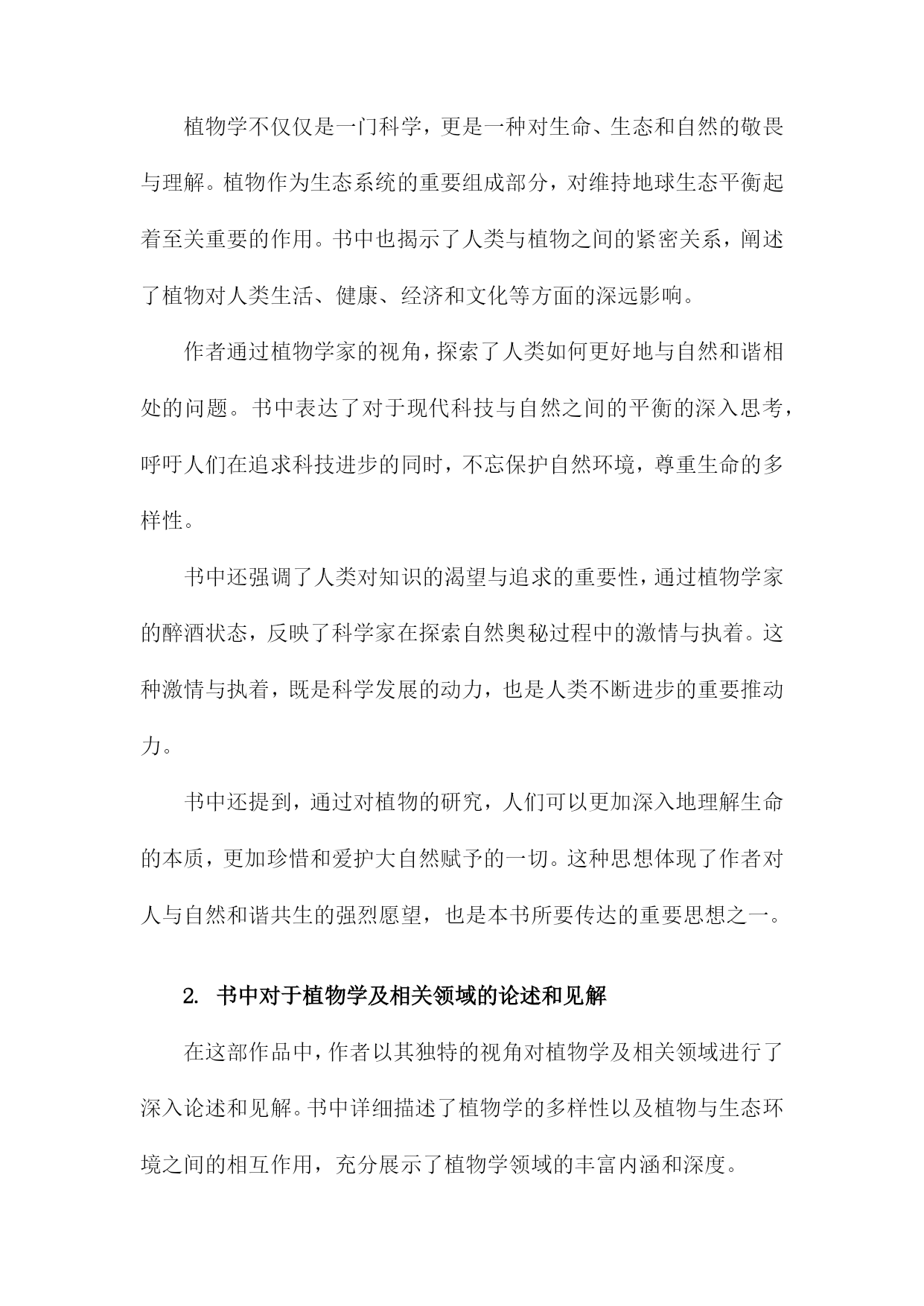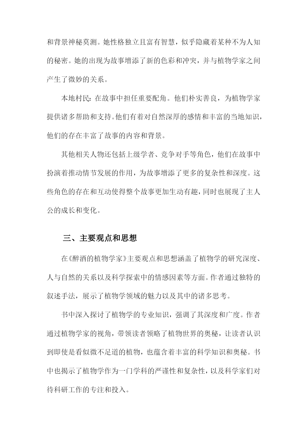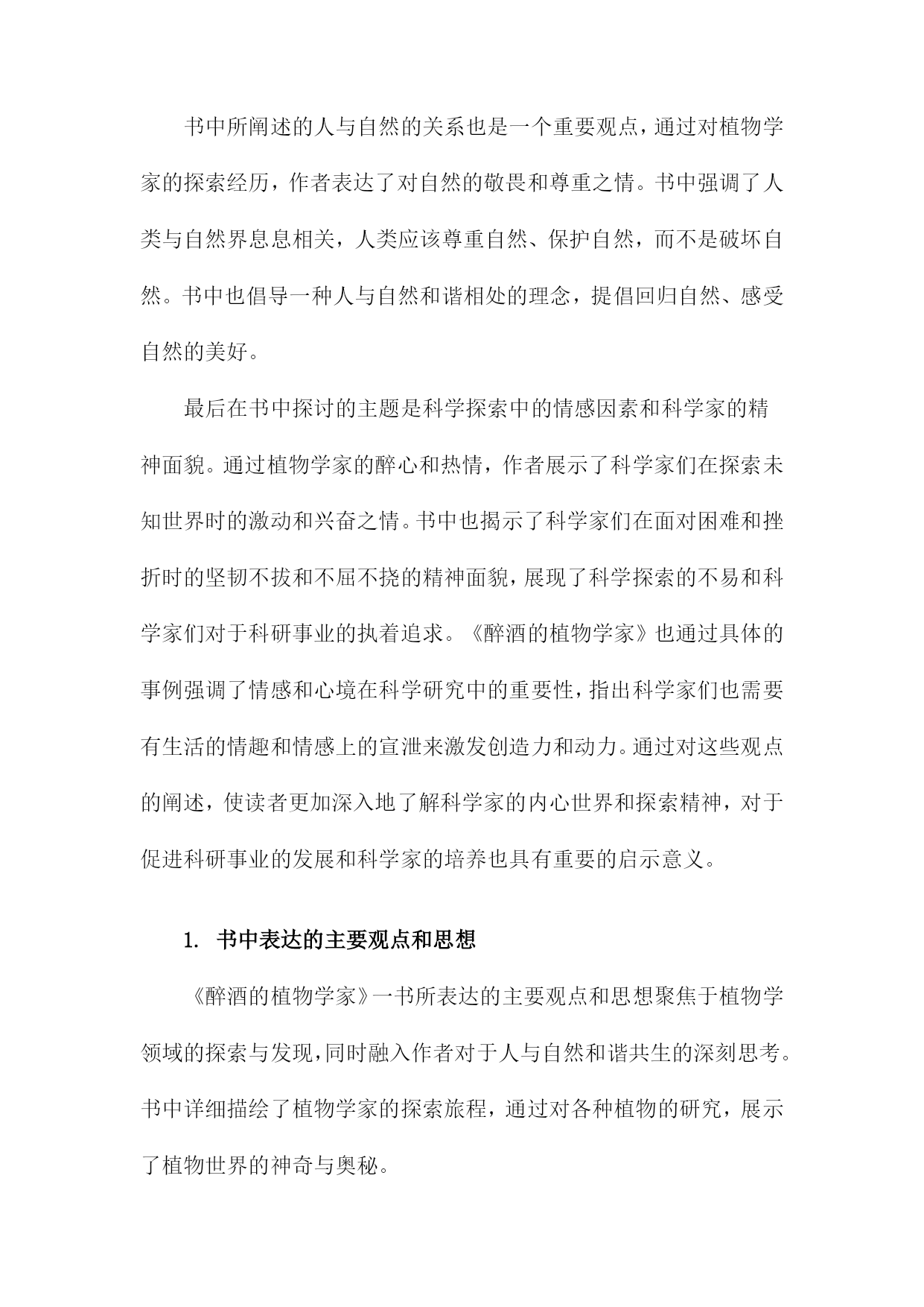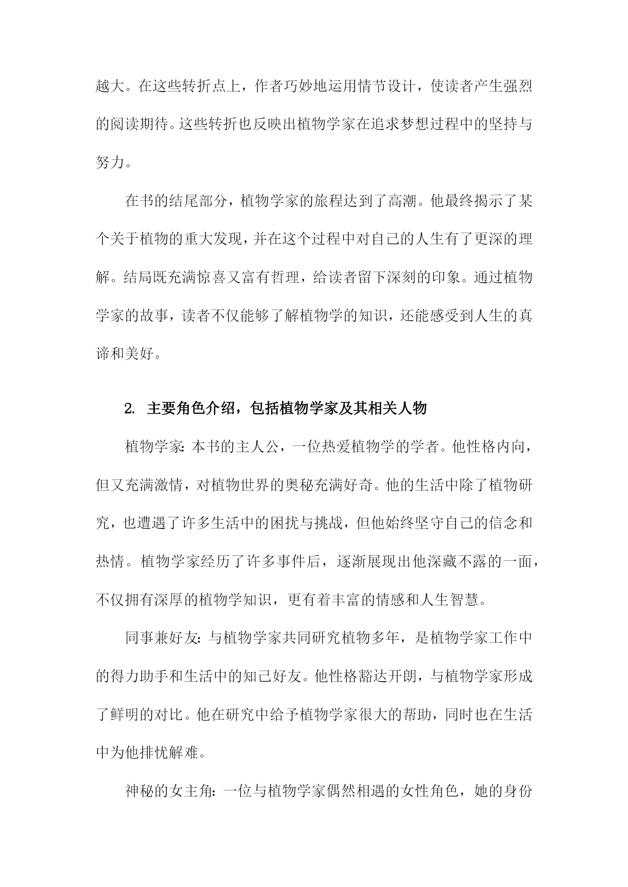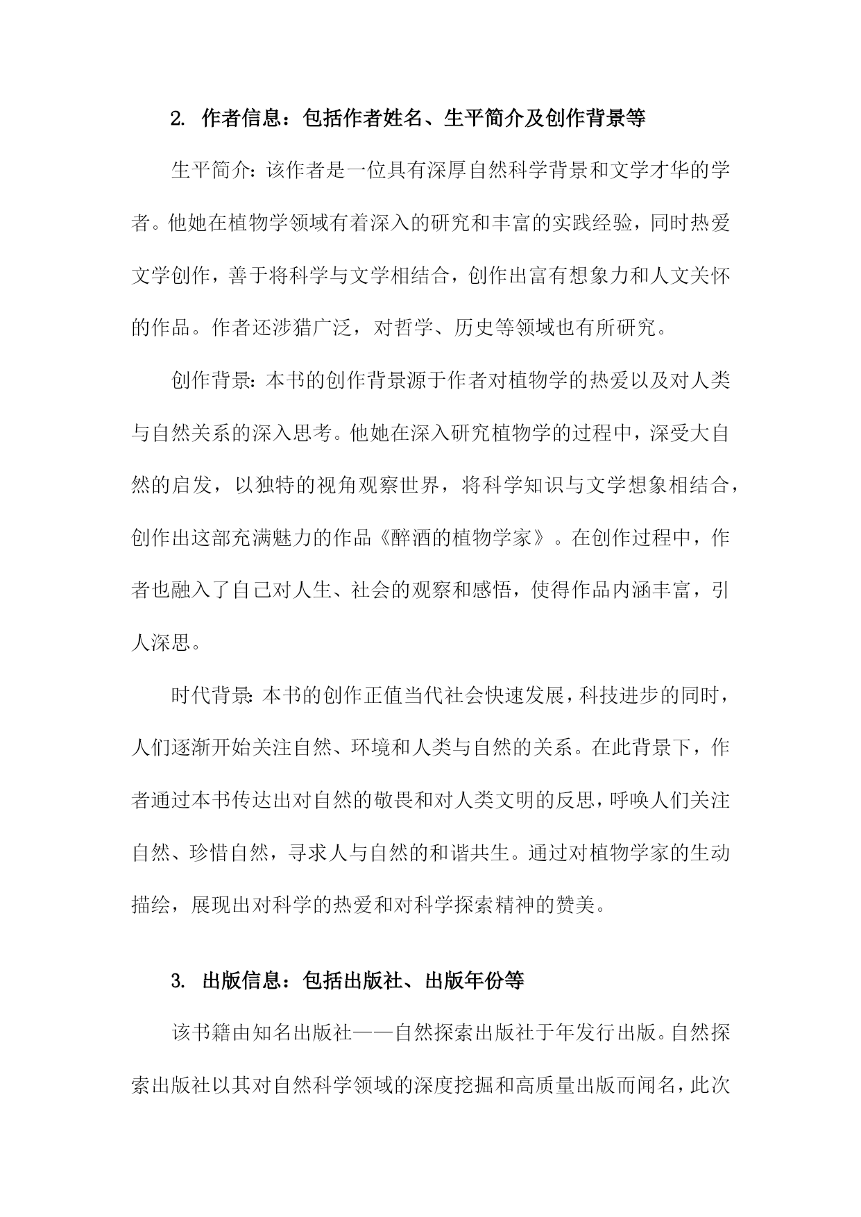 《醉酒的植物学家》读书备忘录一、书籍基本信息内容简介:《醉酒的植物学家》是一本以轻松幽默的方式介绍植物学知识的科普读物。本书通过一位醉酒的植物学家视角,带领读者走进奇妙的植物世界,探索植物学的奥秘。书中涵盖了植物学的基础知识,包括植物的种类、生长环境、生理特征、生态价值等方面内容。本书既适合对植物学感兴趣的普通读者,也适合作为植物学入门者的学习资料。本书旨在通过生动有趣的叙述,让读者更加了解植物学的魅力,增加对自然环境的热爱和保护意识。1.书籍名称:《醉酒的植物学家》《醉酒的植物学家》是一本关于自然科学与人文探索的畅销著作。本书通过讲述一位植物学家醉心于植物研究,却在生活中遭遇挫折与困境的故事,展现了植物学领域的神秘与魅力,同时也反映了现代人在追求事业与面对生活压力时的内心挣扎。本书融合了科学知识与人文关怀,为读者带来一次独特的阅读体验。本书围绕一位植物学家的生活经历展开,描述了他在研究过程中的发现与探索,以及面对家庭、事业、人际关系等方面的压力与挑战。书中不仅介绍了丰富的植物学知识,如植物的分类、生长环境、生理机能等,还通过主人公的经历探讨了人与自然的关系、科学与人性的交融等深刻问题。本书的主人公是一位醉心的植物学家,他热爱植物研究,为了探索自然的奥秘付出了巨大的努力。在遭遇挫折和困境时,他依然坚持自己的信念,努力寻找生活的意义和价值。书中还有其他次要人物,如他的家人、同事、朋友等,他们共同构成了书中的世界观。本书主题思想丰富,涵盖了人与自然的关系、科学与人性的交融、生活的压力与挑战等。通过主人公的经历,作者试图向读者传达一种对自然的敬畏与热爱,以及对生活的热爱与执着。书中还强调了坚持信念、勇敢面对困难的重要性。阅读《醉酒的植物学家》让我感受到了植物学的神秘与魅力,同时也被主人公的坚持与勇气所感动。书中融合了科学知识与人文关怀,让我对自然与生活有了更深刻的理解。本书的语言生动、文笔流畅,让我沉浸在阅读的世界中。在阅读过程中,我记录了许多关键信息和重要观点。书中关于植物的分类、生长环境、生理机能等知识的介绍,以及主人公在面对困境时的内心挣扎和成长过程等。我还记录了一些感悟和思考,如对于人与自然关系的理解、对于生活的热爱与执着等。这些笔记让我对本书有了更深入的理解。2.作者信息:包括作者姓名、生平简介及创作背景等生平简介:该作者是一位具有深厚自然科学背景和文学才华的学者。他她在植物学领域有着深入的研究和丰富的实践经验,同时热爱文学创作,善于将科学与文学相结合,创作出富有想象力和人文关怀的作品。作者还涉猎广泛,对哲学、历史等领域也有所研究。创作背景:本书的创作背景源于作者对植物学的热爱以及对人类与自然关系的深入思考。他她在深入研究植物学的过程中,深受大自然的启发,以独特的视角观察世界,将科学知识与文学想象相结合,创作出这部充满魅力的作品《醉酒的植物学家》。在创作过程中,作者也融入了自己对人生、社会的观察和感悟,使得作品内涵丰富,引人深思。时代背景:本书的创作正值当代社会快速发展,科技进步的同时,人们逐渐开始关注自然、环境和人类与自然的关系。在此背景下,作者通过本书传达出对自然的敬畏和对人类文明的反思,呼唤人们关注自然、珍惜自然,寻求人与自然的和谐共生。通过对植物学家的生动描绘,展现出对科学的热爱和对科学探索精神的赞美。3.出版信息:包括出版社、出版年份等该书籍由知名出版社——自然探索出版社于年发行出版。自然探索出版社以其对自然科学领域的深度挖掘和高质量出版而闻名,此次出版的《醉酒的植物学家》更是凭借其独特的题材和深入浅出的科普知识赢得了广大读者的期待。出版年份为年,标志着这部作品是在当代科学领域中的一个重要里程碑。出版信息详尽准确,确保了书籍的广泛传播和读者群体的覆盖。二、内容梗概本书是一部关于植物学家的冒险故事,主人公是一位热爱植物学但平日里普通无奇的研究者。在一次偶然的机会中,他发现了一种神奇的酒,声称能让一切变得与众不同。在这个剧情中,主人公摄入这种酒后,竟然拥有了超乎寻常的观察力和理解力,成为了一名与众不同的植物学家。醉酒状态下的他,能够深入地解读植物的语言,解开隐藏在自然世界中的奥秘。在接下来的情节发展中,主人公展开了一系列惊心动魄的探险之旅。他在旅途中不仅与各种奇异的植物亲密接触,还揭示了一些隐藏在科学背后的阴谋和真相。故事中还穿插了主人公与身边人的互动,包括同事、家人以及爱慕者的情感纠葛。通过这些情感线索,书籍进一步展现了主人公的人性面和内心世界。作者还巧妙地融入了一些科学知识,使读者在阅读故事的同时,也能学到一些有关植物学的知识。主人公在经历种种考验后,不仅解开了围绕在自己身边的谜团,也重新认识了科学探索的真谛和生命的意义。《醉酒的植物学家》以其独特的设定和引人入胜的情节,为读者呈