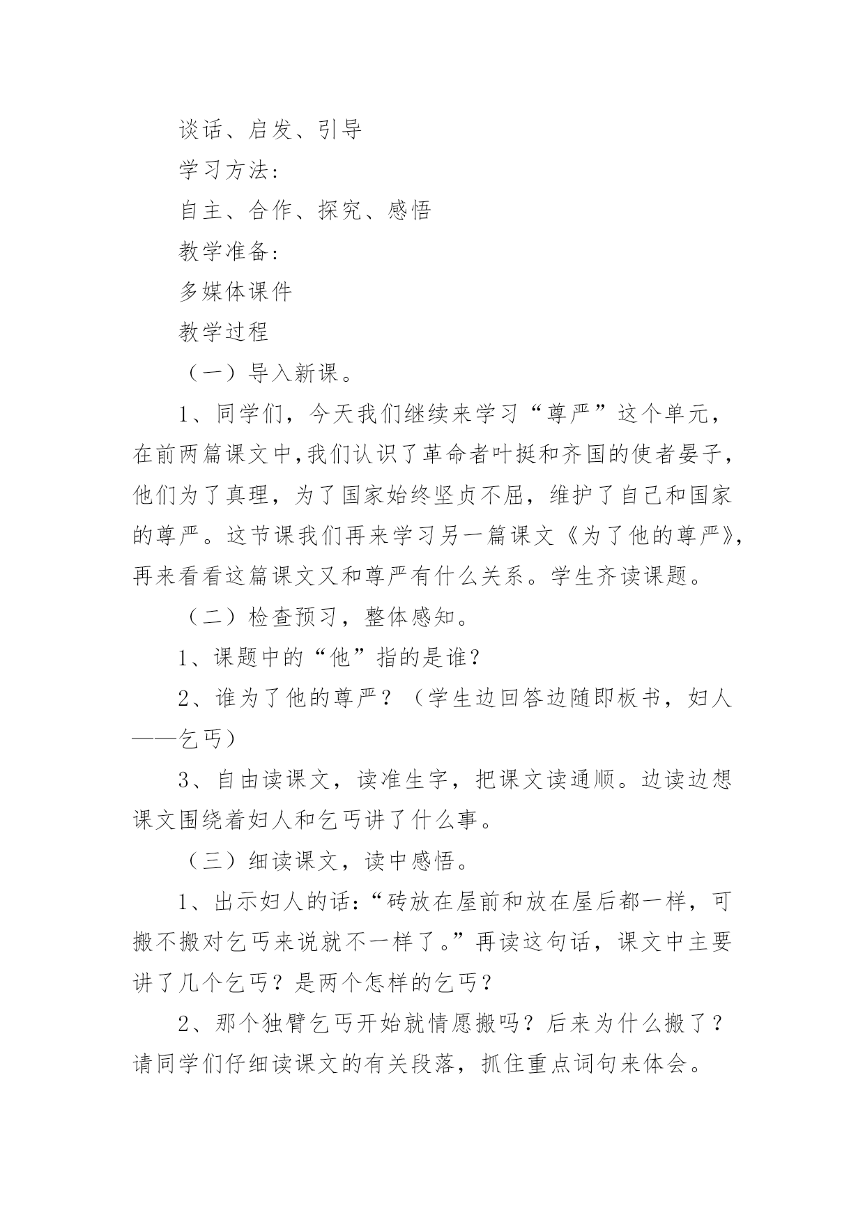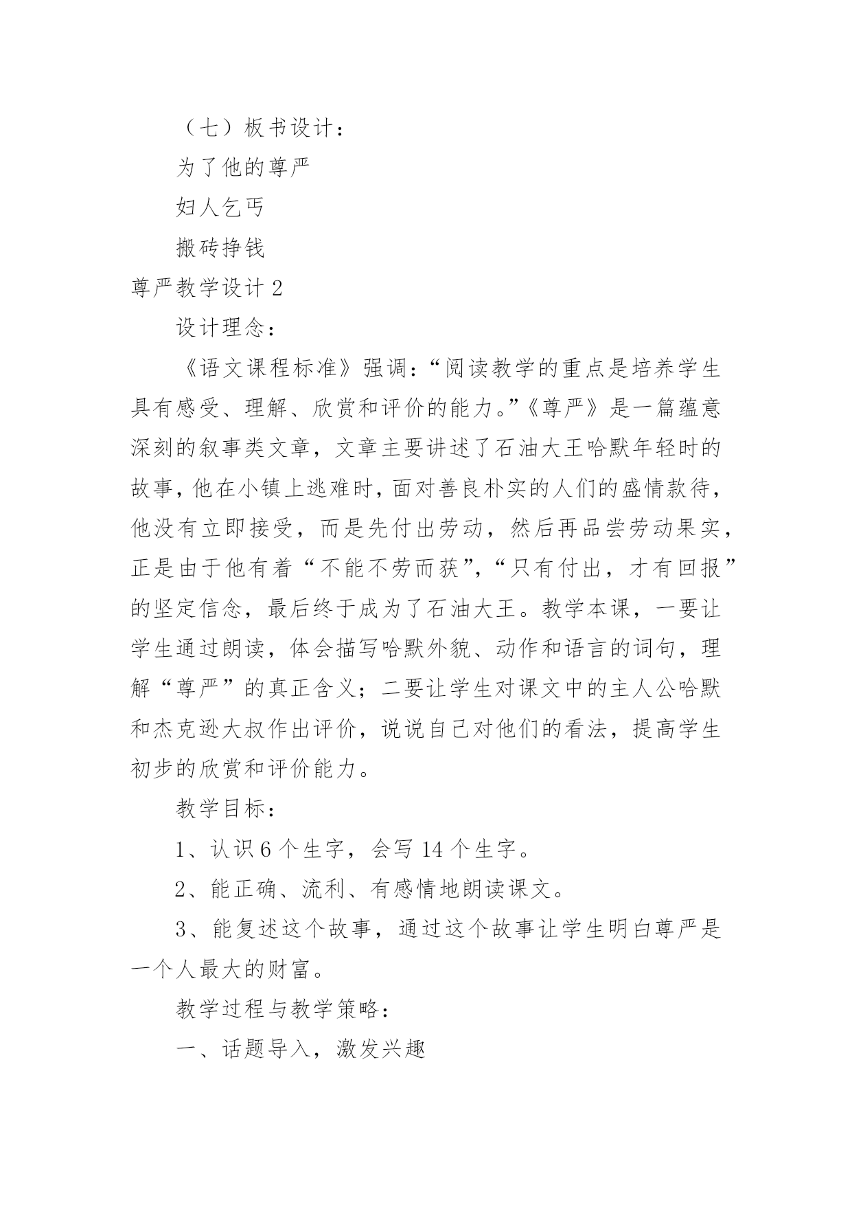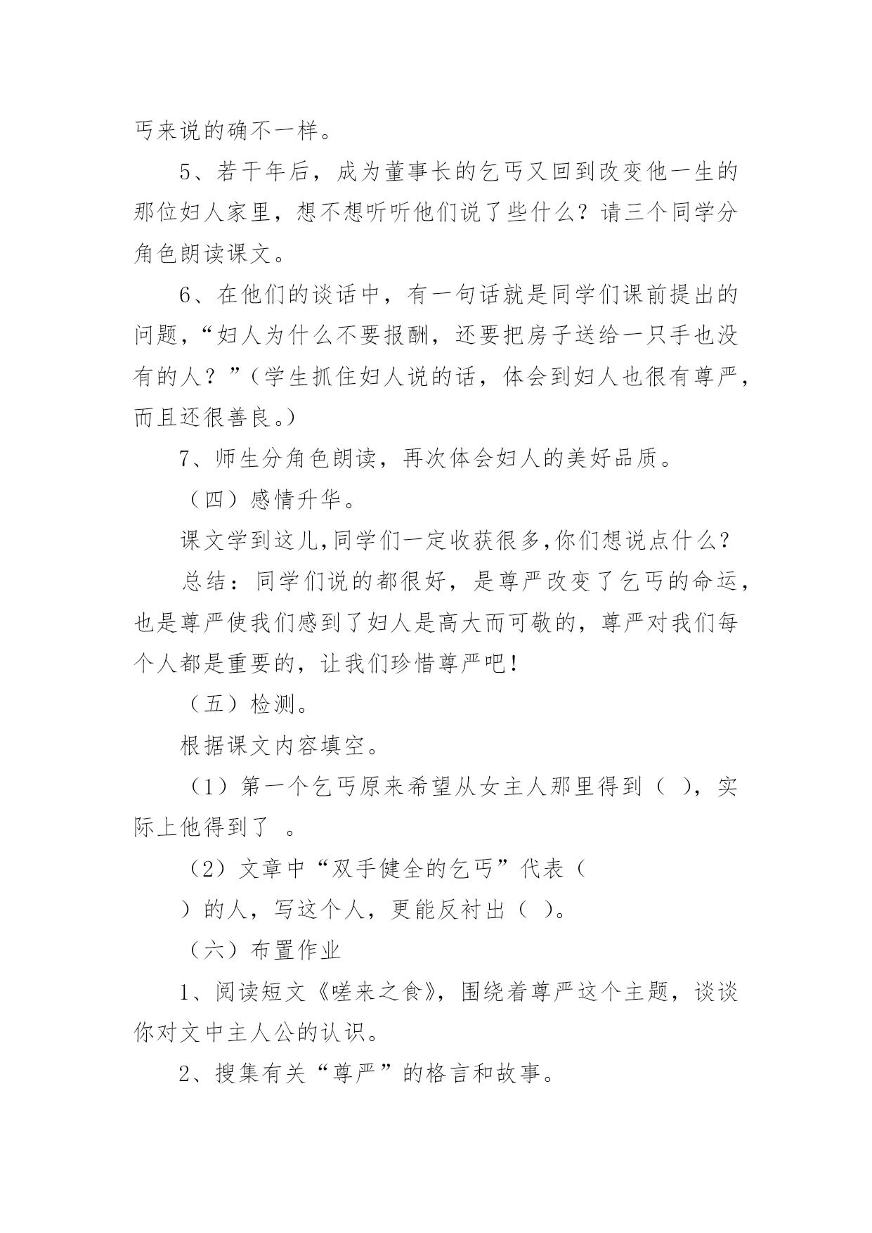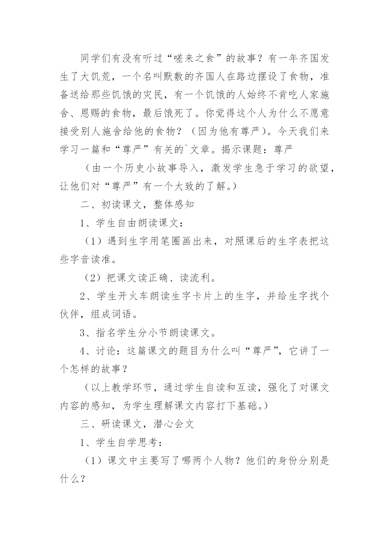 尊严教学设计尊严教学设计作为一名优秀的教育工作者,有必要进行细致的教学设计准备工作,借助教学设计可以促进我们快速成长,使教学工作更加科学化。我们该怎么去写教学设计呢?以下是小编收集整理的尊严教学设计,欢迎阅读与收藏。尊严教学设计1学习目标1、流利地朗读课文,理解课文内容,抓住重点词句体会独臂乞丐由不情愿搬砖到搬砖的复杂心理变化,从而从女主人那儿获得做人的尊严,懂得了自尊。2、感情朗读课文,在自读自悟中体会两个乞丐的不同,从而感悟到只有依靠劳动才能创造幸福。学习重点:抓住重点词句体会独臂乞丐由不情愿搬砖到搬砖的复杂心理变化,从而从女主人那儿获得做人的尊严,懂得了自尊。教学难点:在自读自悟中体会两个乞丐的不同,从而感悟到只有依靠劳动才能创造幸福。教学方法:谈话、启发、引导学习方法:自主、合作、探究、感悟教学准备:多媒体课件教学过程(一)导入新课。1、同学们,今天我们继续来学习“尊严”这个单元,在前两篇课文中,我们认识了革命者叶挺和齐国的使者晏子,他们为了真理,为了国家始终坚贞不屈,维护了自己和国家的尊严。这节课我们再来学习另一篇课文《为了他的尊严》,再来看看这篇课文又和尊严有什么关系。学生齐读课题。(二)检查预习,整体感知。1、课题中的“他”指的是谁?2、谁为了他的尊严?(学生边回答边随即板书,妇人——乞丐)3、自由读课文,读准生字,把课文读通顺。边读边想课文围绕着妇人和乞丐讲了什么事。(三)细读课文,读中感悟。1、出示妇人的话:“砖放在屋前和放在屋后都一样,可搬不搬对乞丐来说就不一样了。”再读这句话,课文中主要讲了几个乞丐?是两个怎样的乞丐?2、那个独臂乞丐开始就情愿搬吗?后来为什么搬了?请同学们仔细读课文的有关段落,抓住重点词句来体会。(1)集体交流:学生抓住句子体会,独臂乞丐觉得自己是一个残疾人,已经非常可怜,妇人却让他搬砖,他很生气很不情愿。(2)谁来读读这位乞丐的样子?体会“慷慨”的意思,并指导“慷慨”两个字的写法。(3)出示句子“乞丐怔住了,他用异样的目光看着妇人,尖突的喉结像一枚橄榄上下滑动了两下。”让学生抓住乞丐表情的变化来体会他内心的变化,原来一只手也能干活,也有尊严。(4)谁能带着乞丐恍然大悟的表情把他内心的变化读出来。(5)学生读乞丐干活时的.样子,说一说看到这一切感受到什么?(学生抓住“整整……才……”、“气喘如牛”、“布满灰尘”、“汗水濡湿”等词语体会这搬砖的活对独臂乞丐来说很不容易,而且又累又脏。)小结:他感激的不仅仅是妇人给他的20元钱,更重要的是妇人的做法唤起了他的尊严。上路后的他结果怎样呢?(成了董事长)3、再来看看那位双手健全的乞丐,他为什么不搬砖?请同学们默读有关的段落,抓住句子体会。想象他的结果会怎样?4、再读这句话“砖放在屋前和放在屋后都一样,可搬不搬对乞丐来说就不一样了。”学生进一步体会搬不搬对乞丐来说的确不一样。5、若干年后,成为董事长的乞丐又回到改变他一生的那位妇人家里,想不想听听他们说了些什么?请三个同学分角色朗读课文。6、在他们的谈话中,有一句话就是同学们课前提出的问题,“妇人为什么不要报酬,还要把房子送给一只手也没有的人?”(学生抓住妇人说的话,体会到妇人也很有尊严,而且还很善良。)7、师生分角色朗读,再次体会妇人的美好品质。(四)感情升华。课文学到这儿,同学们一定收获很多,你们想说点什么?总结:同学们说的都很好,是尊严改变了乞丐的命运,也是尊严使我们感到了妇人是高大而可敬的,尊严对我们每个人都是重要的,让我们珍惜尊严吧!(五)检测。根据课文内容填空。(1)第一个乞丐原来希望从女主人那里得到(),实际上他得到了。(2)文章中“双手健全的乞丐”代表()的人,写这个人,更能反衬出()。(六)布置作业1、阅读短文《嗟来之食》,围绕着尊严这个主题,谈谈你对文中主人公的认识。2、搜集有关“尊严”的格言和故事。(七)板书设计:为了他的尊严妇人乞丐搬砖挣钱尊严教学设计2设计理念:《语文课程标准》强调:“阅读教学的重点是培养学生具有感受、理解、欣赏和评价的能力。”《尊严》是一篇蕴意深刻的叙事类文章,文章主要讲述了石油大王哈默年轻时的故事,他在小镇上逃难时,面对善良朴实的人们的盛情款待,他没有立即接受,而是先付出劳动,然后再品尝劳动果实,正是由于他有着“不能不劳而获”,“只有付出,才有回报”的坚定信念,最后终于成为了石油大王。教学本课,一要让学生通过朗读,体会描写哈默外貌、动作和语言的词句,理解“尊严”的真正含义;二要让学生对课文中的主人公哈默和杰克逊大叔作出评价,说说自己对他们的看法,提高学生初步的欣赏和评价能力。教学目标:1、认识6个生字,会写14个生字。2、能正确、流利、有感情地朗读课文。3、能复述这个故事,通过这个故事让学生明白尊严是一个人最大的财富。教学过程与教学策略:一、话题导入