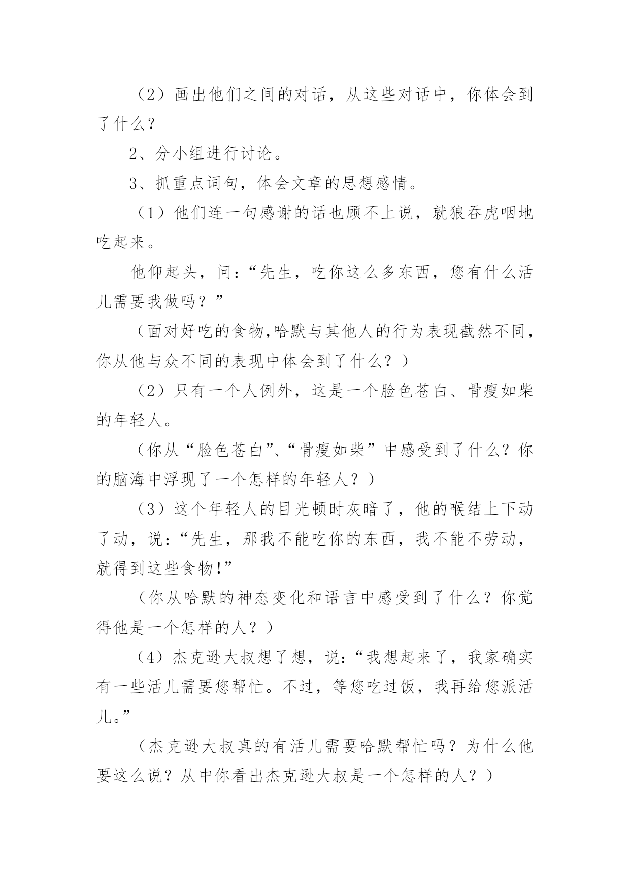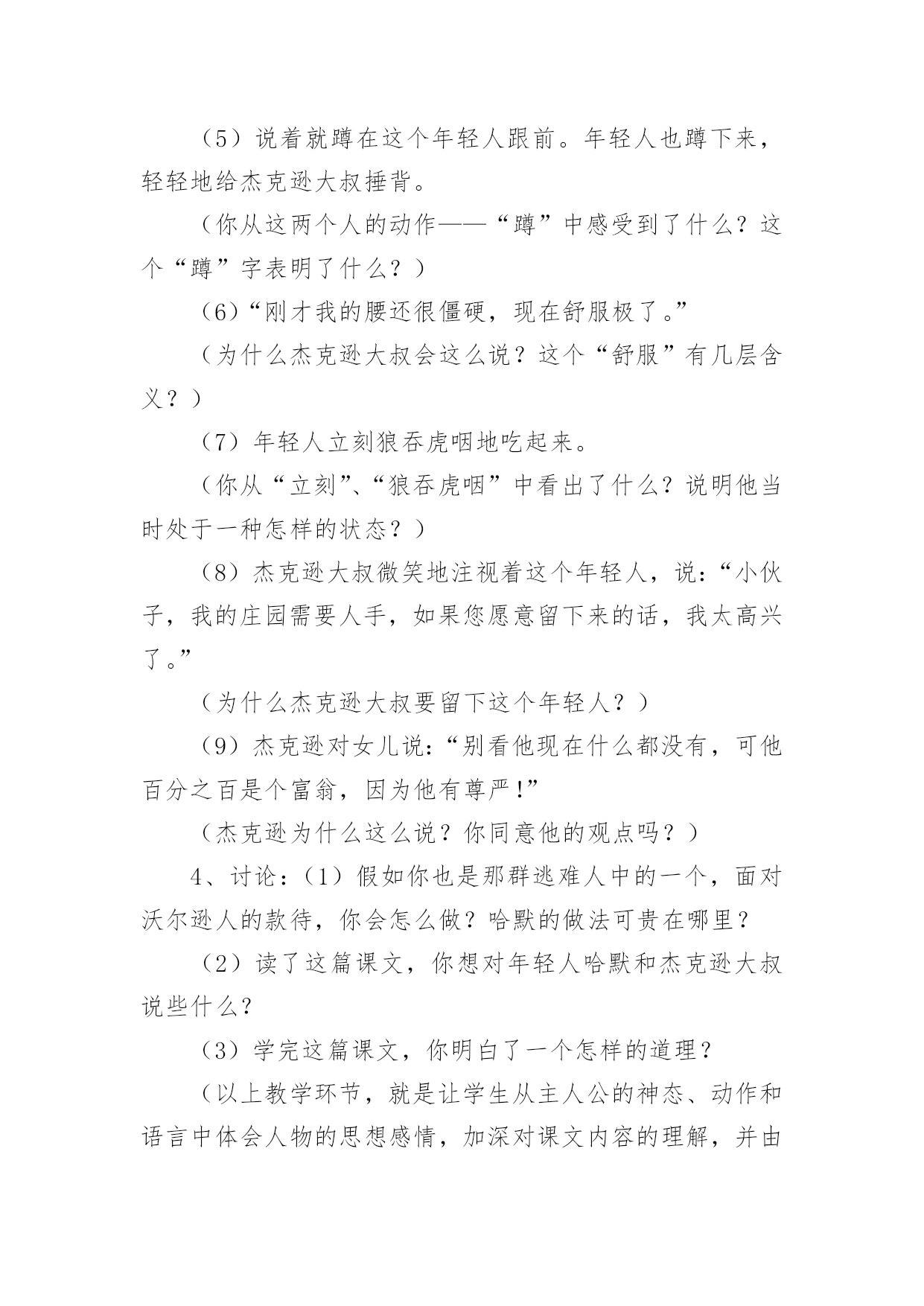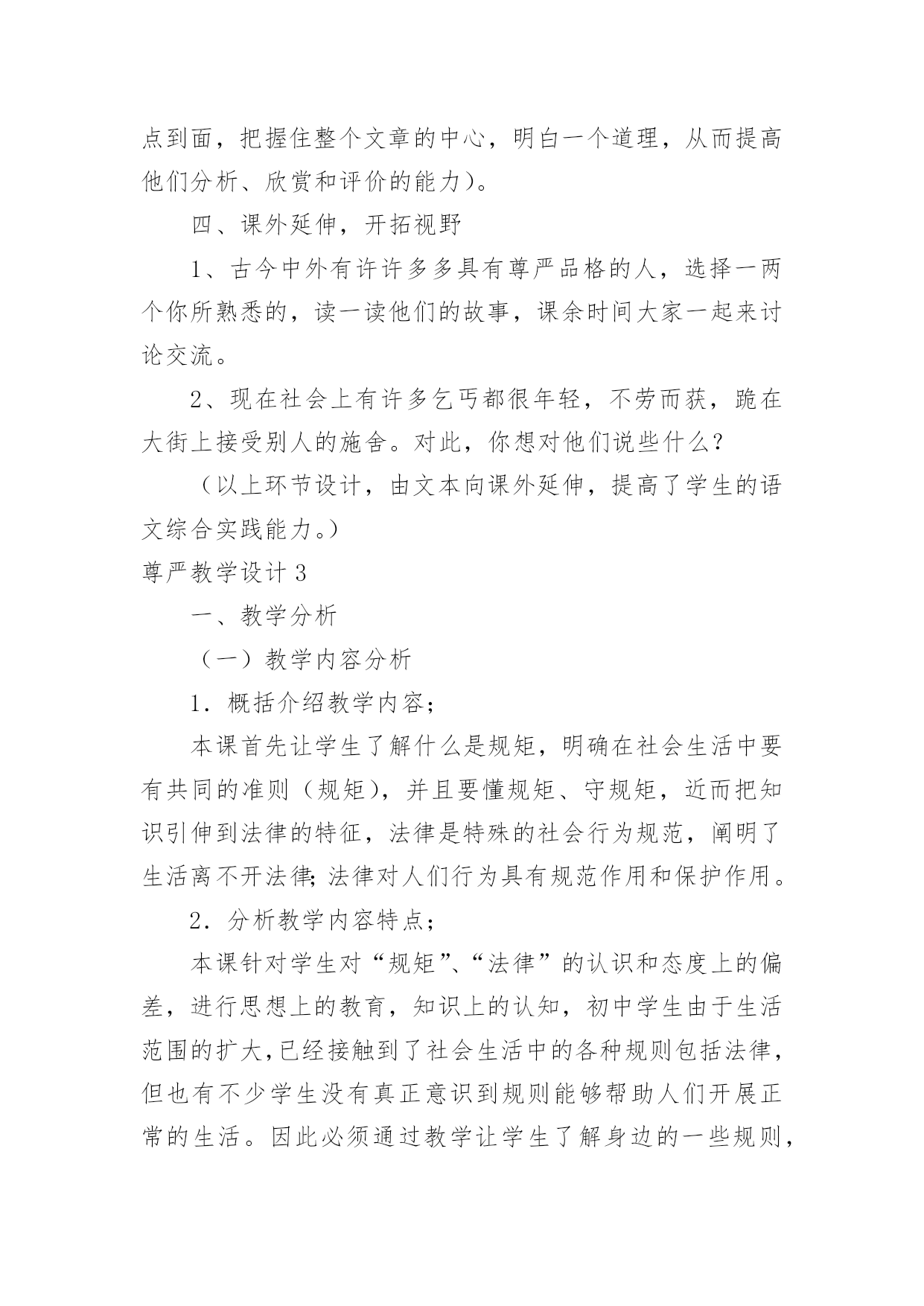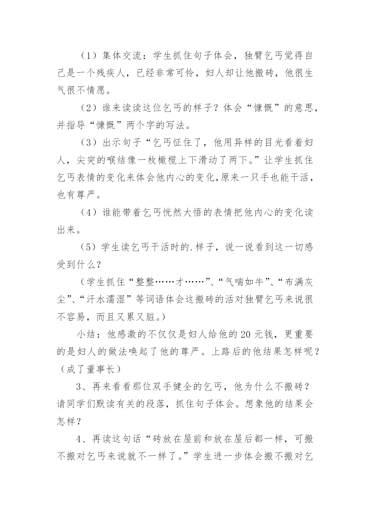 尊严教学设计尊严教学设计作为一名优秀的教育工作者,有必要进行细致的教学设计准备工作,借助教学设计可以促进我们快速成长,使教学工作更加科学化。我们该怎么去写教学设计呢?以下是小编收集整理的尊严教学设计,欢迎阅读与收藏。尊严教学设计1学习目标1、流利地朗读课文,理解课文内容,抓住重点词句体会独臂乞丐由不情愿搬砖到搬砖的复杂心理变化,从而从女主人那儿获得做人的尊严,懂得了自尊。2、感情朗读课文,在自读自悟中体会两个乞丐的不同,从而感悟到只有依靠劳动才能创造幸福。学习重点:抓住重点词句体会独臂乞丐由不情愿搬砖到搬砖的复杂心理变化,从而从女主人那儿获得做人的尊严,懂得了自尊。教学难点:在自读自悟中体会两个乞丐的不同,从而感悟到只有依靠劳动才能创造幸福。教学方法:谈话、启发、引导学习方法:自主、合作、探究、感悟教学准备:多媒体课件教学过程(一)导入新课。1、同学们,今天我们继续来学习“尊严”这个单元,在前两篇课文中,我们认识了革命者叶挺和齐国的使者晏子,他们为了真理,为了国家始终坚贞不屈,维护了自己和国家的尊严。这节课我们再来学习另一篇课文《为了他的尊严》,再来看看这篇课文又和尊严有什么关系。学生齐读课题。(二)检查预习,整体感知。1、课题中的“他”指的是谁?2、谁为了他的尊严?(学生边回答边随即板书,妇人——乞丐)3、自由读课文,读准生字,把课文读通顺。边读边想课文围绕着妇人和乞丐讲了什么事。(三)细读课文,读中感悟。1、出示妇人的话:“砖放在屋前和放在屋后都一样,可搬不搬对乞丐来说就不一样了。”再读这句话,课文中主要讲了几个乞丐?是两个怎样的乞丐?2、那个独臂乞丐开始就情愿搬吗?后来为什么搬了?请同学们仔细读课文的有关段落,抓住重点词句来体会。(1)集体交流:学生抓住句子体会,独臂乞丐觉得自己是一个残疾人,已经非常可怜,妇人却让他搬砖,他很生气很不情愿。(2)谁来读读这位乞丐的样子?体会“慷慨”的意思,并指导“慷慨”两个字的写法。(3)出示句子“乞丐怔住了,他用异样的目光看着妇人,尖突的喉结像一枚橄榄上下滑动了两下。”让学生抓住乞丐表情的变化来体会他内心的变化,原来一只手也能干活,也有尊严。(4)谁能带着乞丐恍然大悟的表情把他内心的变化读出来。(5)学生读乞丐干活时的.样子,说一说看到这一切感受到什么?(学生抓住“整整……才……”、“气喘如牛”、“布满灰尘”、“汗水濡湿”等词语体会这搬砖的活对独臂乞丐来说很不容易,而且又累又脏。)小结:他感激的不仅仅是妇人给他的20元钱,更重要的是妇人的做法唤起了他的尊严。上路后的他结果怎样呢?(成了董事长)3、再来看看那位双手健全的乞丐,他为什么不搬砖?请同学们默读有关的段落,抓住句子体会。想象他的结果会怎样?4、再读这句话“砖放在屋前和放在屋后都一样,可搬不搬对乞丐来说就不一样了。”学生进一步体会搬不搬对乞丐来说的确不一样。5、若干年后,成为董事长的乞丐又回到改变他一生的那位妇人家里,想不想听听他们说了些什么?请三个同学分角色朗读课文。6、在他们的谈话中,有一句话就是同学们课前提出的问题,“妇人为什么不要报酬,还要把房子送给一只手也没有的人?”(学生抓住妇人说的话,体会到妇人也很有尊严,而且还很善良。)7、师生分角色朗读,再次体会妇人的美好品质。(四)感情升华。课文学到这儿,同学们一定收获很多,你们想说点什么?总结:同学们说的都很好,是尊严改变了乞丐的命运,也是尊严使我们感到了妇人是高大而可敬的,尊严对我们每个人都是重要的,让我们珍惜尊严吧!(五)检测。根据课文内容填空。(1)第一个乞丐原来希望从女主人那里得到(),实际上他得到了。(2)文章中“双手健全的乞丐”代表()的人,写这个人,更能反衬出()。(六)布置作业1、阅读短文《嗟来之食》,围绕着尊严这个主题,谈谈你对文中主人公的认识。2、搜集有关“尊严”的格言和故事。(七)板书设计:为了他的尊严妇人乞丐搬砖挣钱尊严教学设计2设计理念:《语文课程标准》强调:“阅读教学的重点是培养学生具有感受、理解、欣赏和评价的能力。”《尊严》是一篇蕴意深刻的叙事类文章,文章主要讲述了石油大王哈默年轻时的故事,他在小镇上逃难时,面对善良朴实的人们的盛情款待,他没有立即接受,而是先付出劳动,然后再品尝劳动果实,正是由于他有着“不能不劳而获”,“只有付出,才有回报”的坚定信念,最后终于成为了石油大王。教学本课,一要让学生通过朗读,体会描写哈默外貌、动作和语言的词句,理解“尊严”的真正含义;二要让学生对课文中的主人公哈默和杰克逊大叔作出评价,说说自己对他们的看法,提高学生初步的欣赏和评价能力。教学目标:1、认识6个生字,会写14个生字。2、能正确、流利、有感情地朗读课文。3、能复述这个故事,通过这个故事让学生明白尊严是一个人最大的财富。教学过程与教学策略:一、话题导入