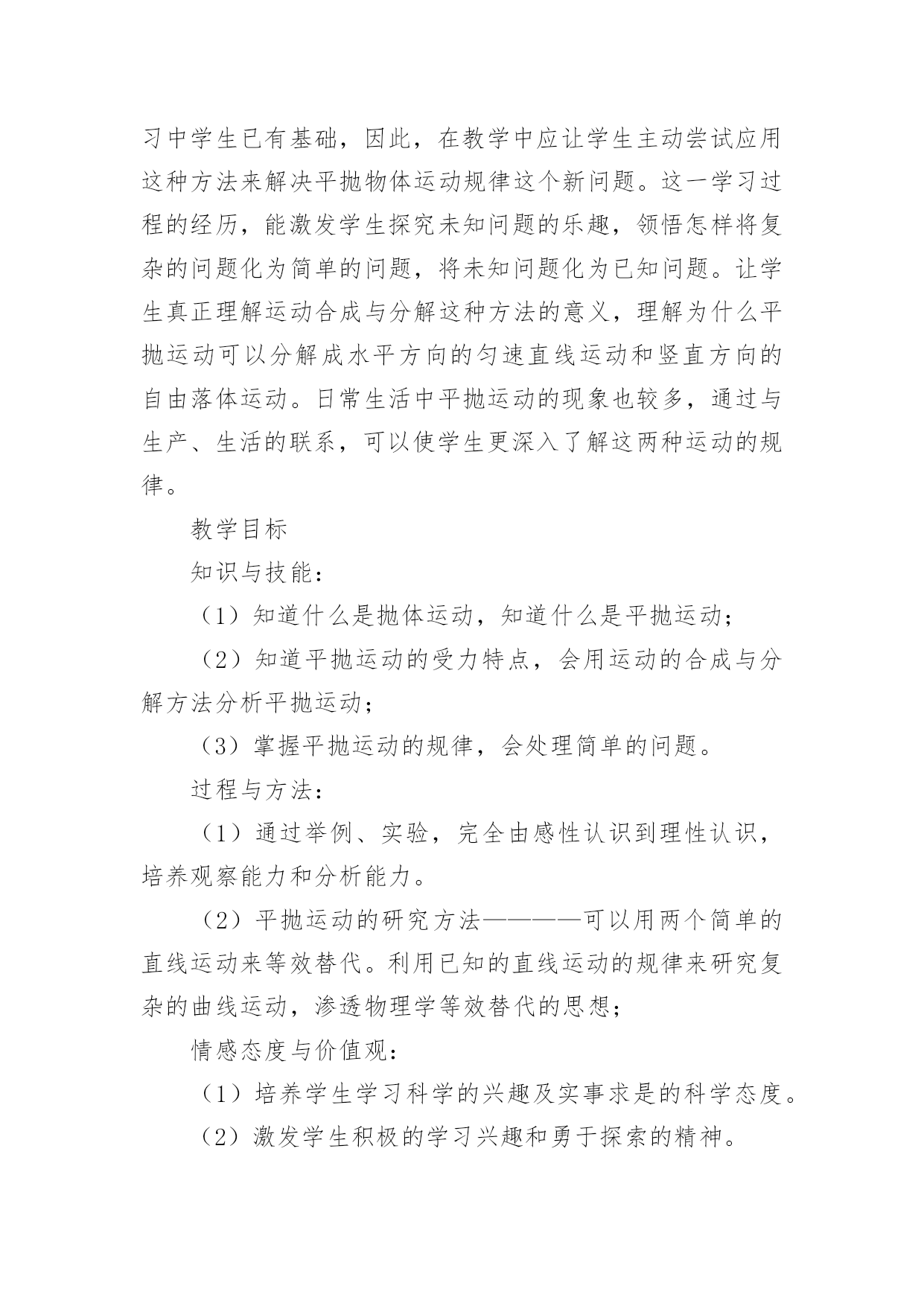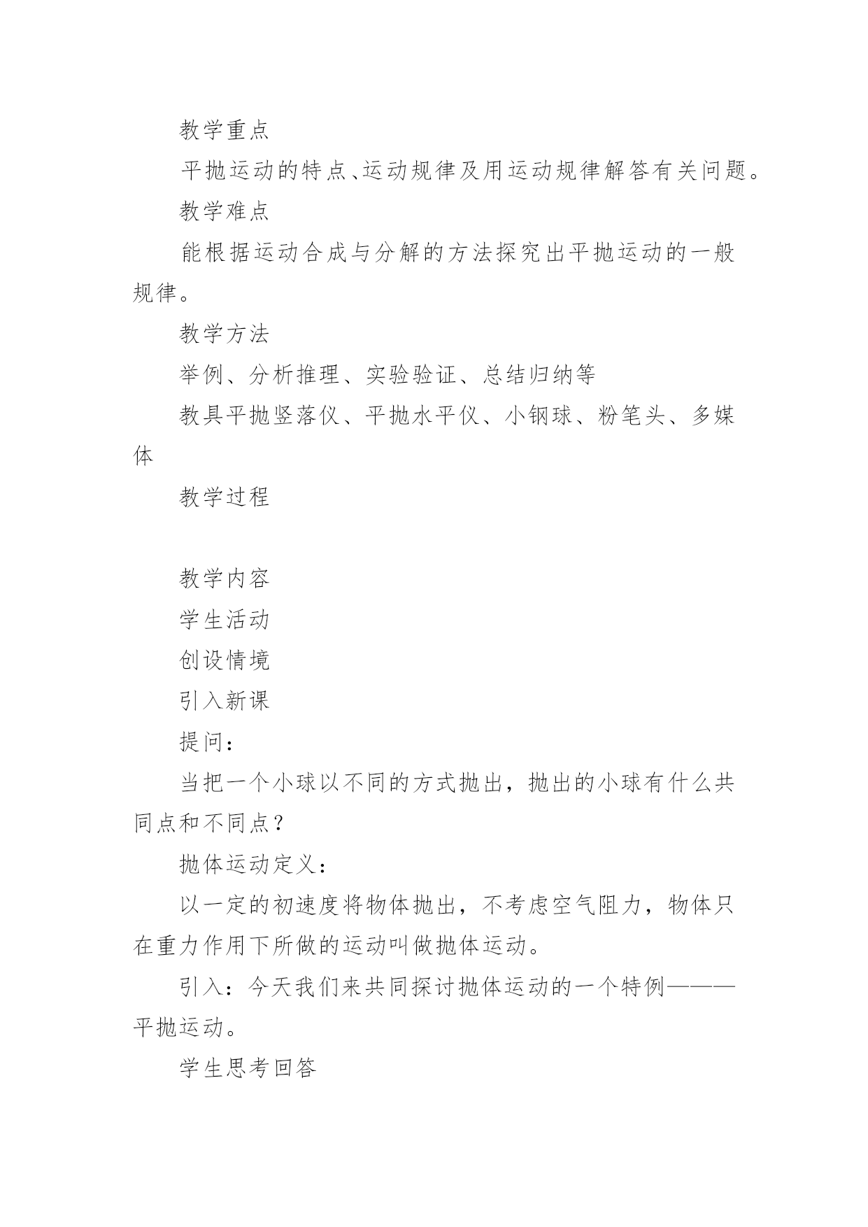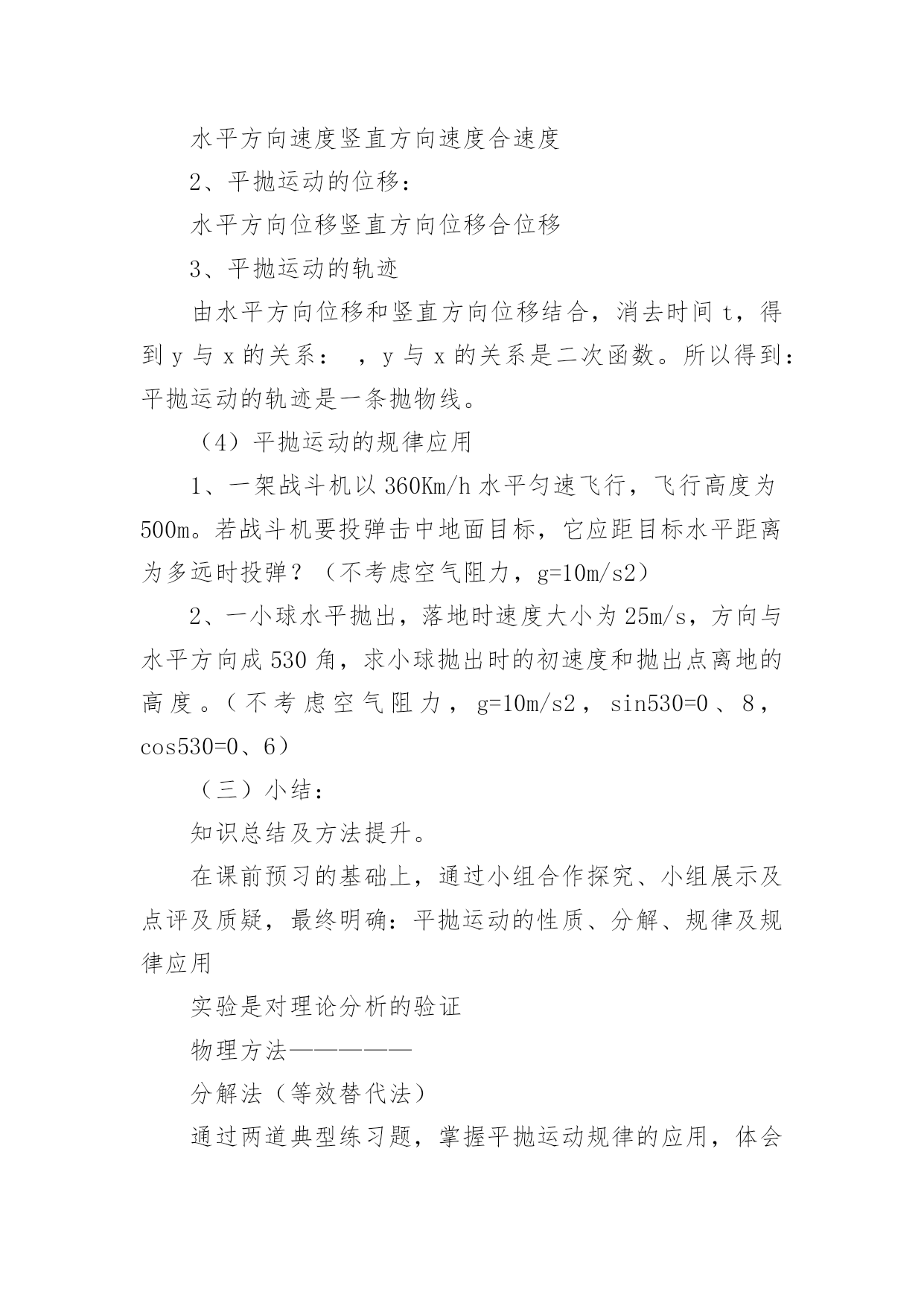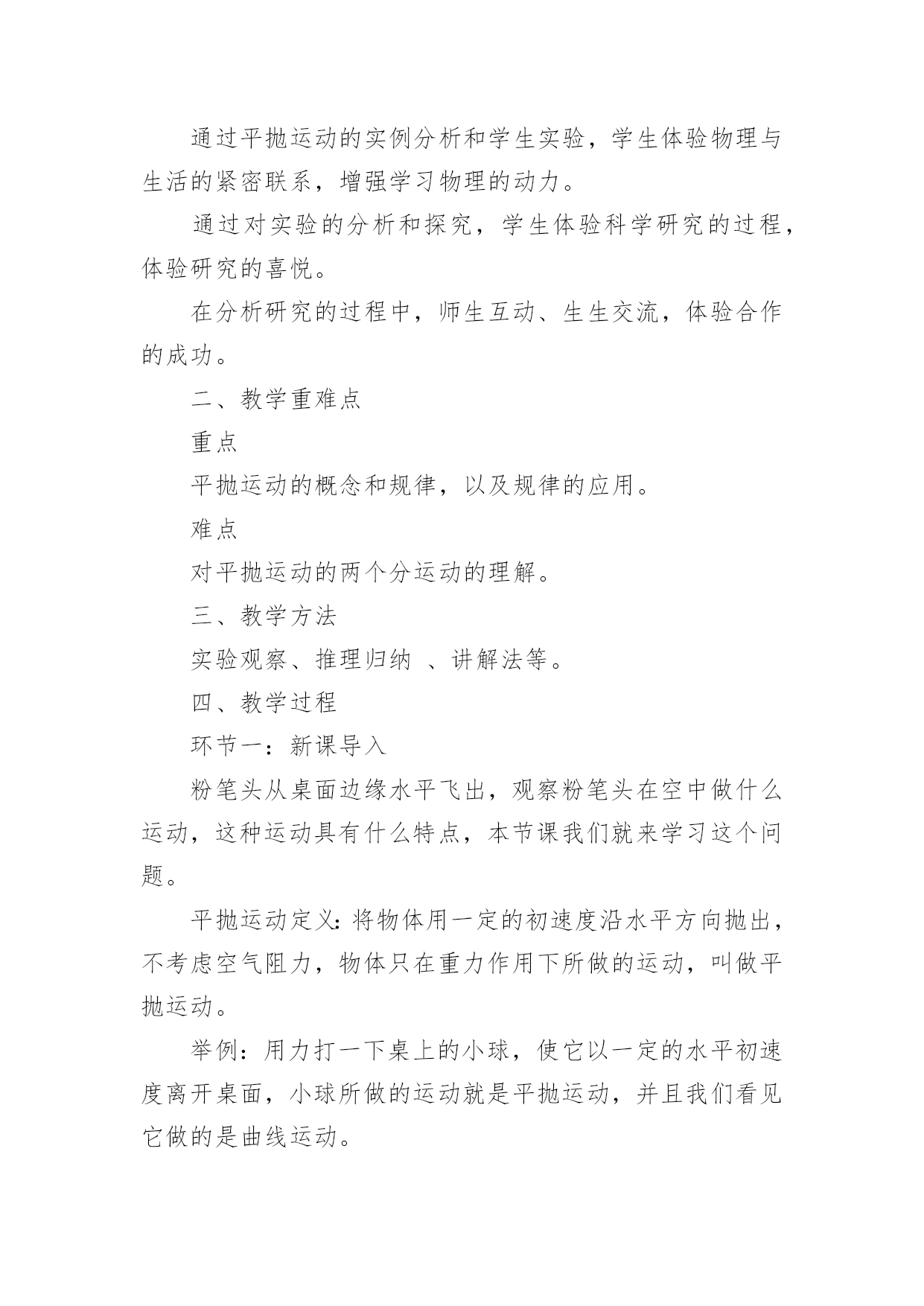 《平抛运动》优秀教学设计《平抛运动》优秀教学设计平抛物体的运动是一种典型的匀变速曲线运动,它体现了处理复杂的曲线运动的基本方法。下面我们一起来学习一下《平抛运动》优秀教学设计,希望对大家有所帮助。《平抛运动》优秀教学设计篇1授课课题平抛运动教材分析平抛物体的运动是曲线运动一章的重点,是一种最基本、最重要的曲线运动,是运动的合成和分解知识的第一次应用,是理解和掌握其它曲线运动的基础。平抛物体的运动是一种典型的匀变速曲线运动,它体现了处理复杂的曲线运动的基本方法——先分解成几个简单的直线运动——再进行合成,从而理解运动的独立性原理和叠加原理,并且会利用这种方法解决问题。本节的内容较简单,得出结论也并不难,但是用运动的合成和分解分析问题的方法,是运动学中常用的一种重要的研究问题的方法,本节的重点是掌握平抛运动的研究方法,使学生学会用运动的分解和合成来研究复杂的曲线运动,并通过实验探索分析、归纳出其运动规律是本节的难点。学情分析认识平抛运动采用的是运动的合成与分解的方法,它是一种研究问题的方法,这种方法在“力的合成与分解”的学习中学生已有基础,因此,在教学中应让学生主动尝试应用这种方法来解决平抛物体运动规律这个新问题。这一学习过程的经历,能激发学生探究未知问题的乐趣,领悟怎样将复杂的问题化为简单的问题,将未知问题化为已知问题。让学生真正理解运动合成与分解这种方法的意义,理解为什么平抛运动可以分解成水平方向的匀速直线运动和竖直方向的自由落体运动。日常生活中平抛运动的现象也较多,通过与生产、生活的联系,可以使学生更深入了解这两种运动的规律。教学目标知识与技能:(1)知道什么是抛体运动,知道什么是平抛运动;(2)知道平抛运动的受力特点,会用运动的合成与分解方法分析平抛运动;(3)掌握平抛运动的规律,会处理简单的问题。过程与方法:(1)通过举例、实验,完全由感性认识到理性认识,培养观察能力和分析能力。(2)平抛运动的研究方法————可以用两个简单的直线运动来等效替代。利用已知的直线运动的规律来研究复杂的曲线运动,渗透物理学等效替代的思想;情感态度与价值观:(1)培养学生学习科学的兴趣及实事求是的科学态度。(2)激发学生积极的学习兴趣和勇于探索的精神。教学重点平抛运动的特点、运动规律及用运动规律解答有关问题。教学难点能根据运动合成与分解的方法探究出平抛运动的一般规律。教学方法举例、分析推理、实验验证、总结归纳等教具平抛竖落仪、平抛水平仪、小钢球、粉笔头、多媒体教学过程教学内容学生活动创设情境引入新课提问:当把一个小球以不同的方式抛出,抛出的小球有什么共同点和不同点?抛体运动定义:以一定的初速度将物体抛出,不考虑空气阻力,物体只在重力作用下所做的运动叫做抛体运动。引入:今天我们来共同探讨抛体运动的一个特例———平抛运动。学生思考回答举例(生活中的抛体运动)新课教学(一)平抛运动的定义:将物体以一定的初速度沿水平方向抛出,不考虑空气阻力,物体只在重力作用下所做的运动叫做平抛运动。(二)合作探究—————(1)平抛运动的性质:根据平抛物体的初速度以及受力特点,分析可知,平抛运动是匀变速曲线运动。(2)平抛运动的分解:根据运动的合成与分解,对于一个复杂的曲线运动,可以将它简化为两个直线运动来研究。建立平面直角坐标系,分析平抛运动物体的初速度及受力特点,分析其分运动:①水平方向:物体做匀速直线运动;②竖直方向:物体做自由落体运动;实验验证:利用平抛竖落仪和平抛水平仪验证:平抛运动可分解为水平方向的匀速直线运动和竖直方向的自由落体运动。(3)平抛运动的规律1、平抛运动的速度:水平方向速度竖直方向速度合速度2、平抛运动的位移:水平方向位移竖直方向位移合位移3、平抛运动的轨迹由水平方向位移和竖直方向位移结合,消去时间t,得到y与x的关系:,y与x的关系是二次函数。所以得到:平抛运动的轨迹是一条抛物线。(4)平抛运动的规律应用1、一架战斗机以360Km/h水平匀速飞行,飞行高度为500m。若战斗机要投弹击中地面目标,它应距目标水平距离为多远时投弹?(不考虑空气阻力,g=10m/s2)2、一小球水平抛出,落地时速度大小为25m/s,方向与水平方向成530角,求小球抛出时的初速度和抛出点离地的高度。(不考虑空气阻力,g=10m/s2,sin530=0、8,cos530=0、6)(三)小结:知识总结及方法提升。在课前预习的基础上,通过小组合作探究、小组展示及点评及质疑,最终明确:平抛运动的性质、分解、规律及规律应用实验是对理论分析的验证物理方法—————分解法(等效替代法)通过两道典型练习题,掌握平抛运动规律的应用,体会解决平抛运动以及曲线运动的方法————分解法板书设计一、运动的定义二、运动的性质三、运动的分解四、运动的规律五、运动的规律应用《平抛运动》优秀教学