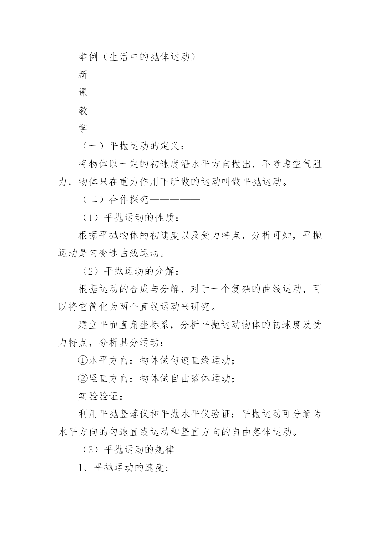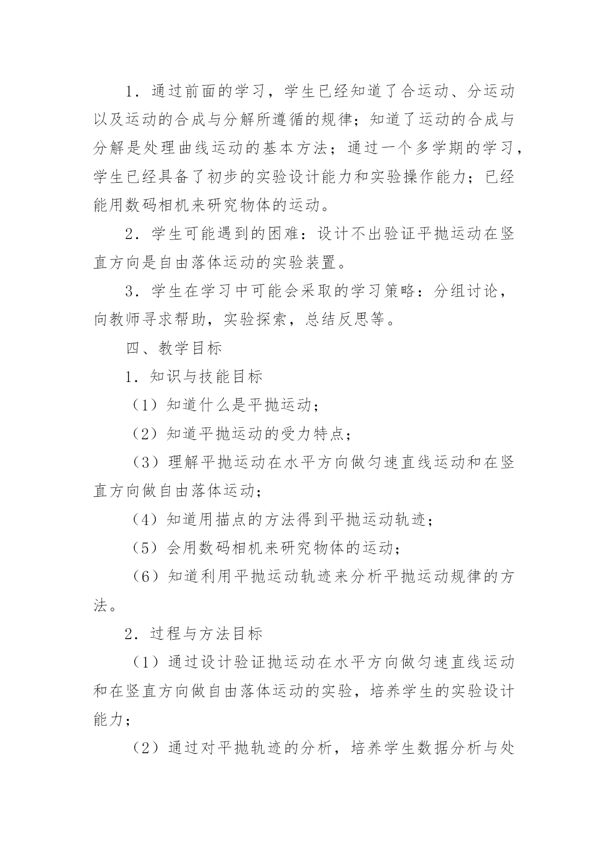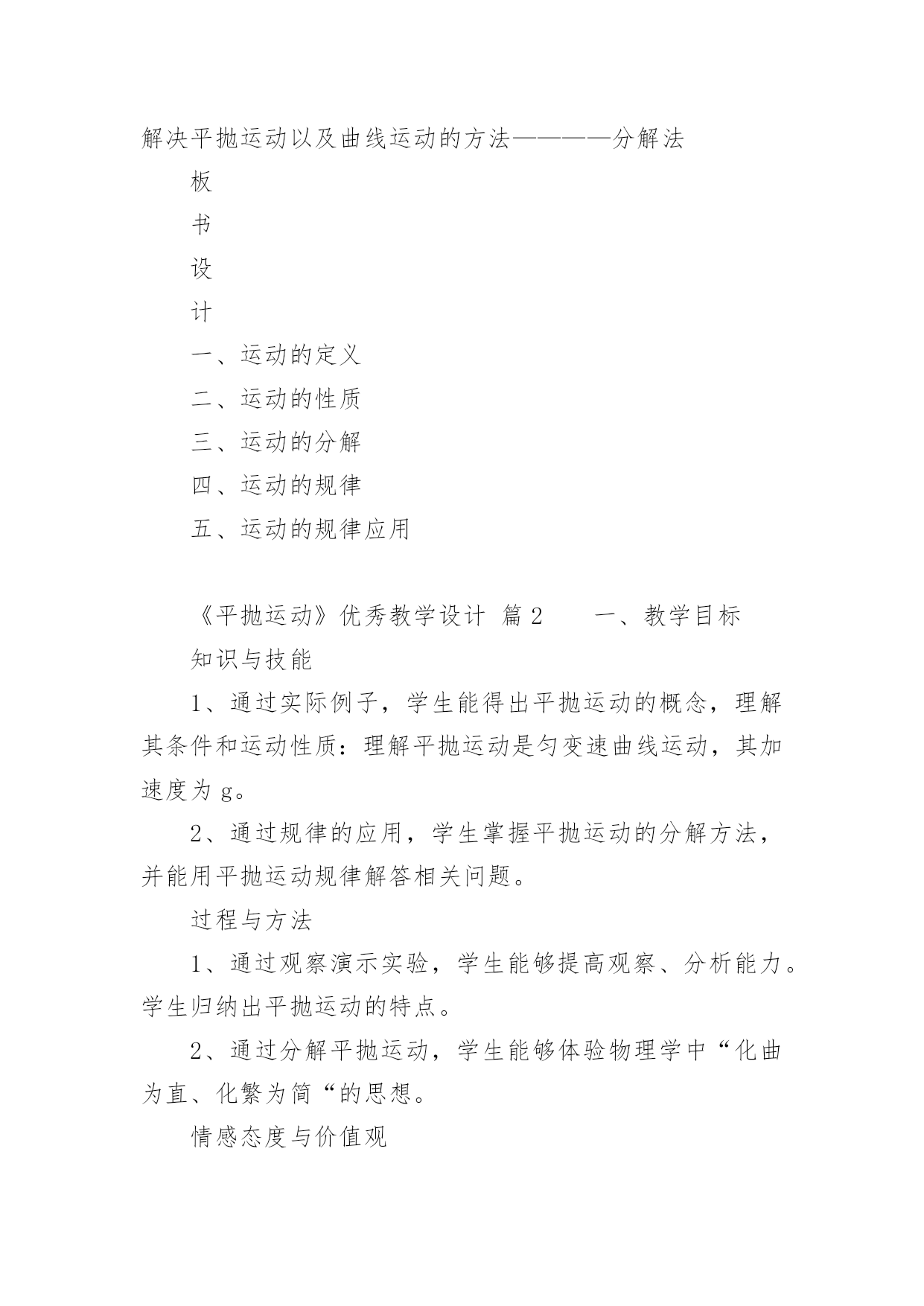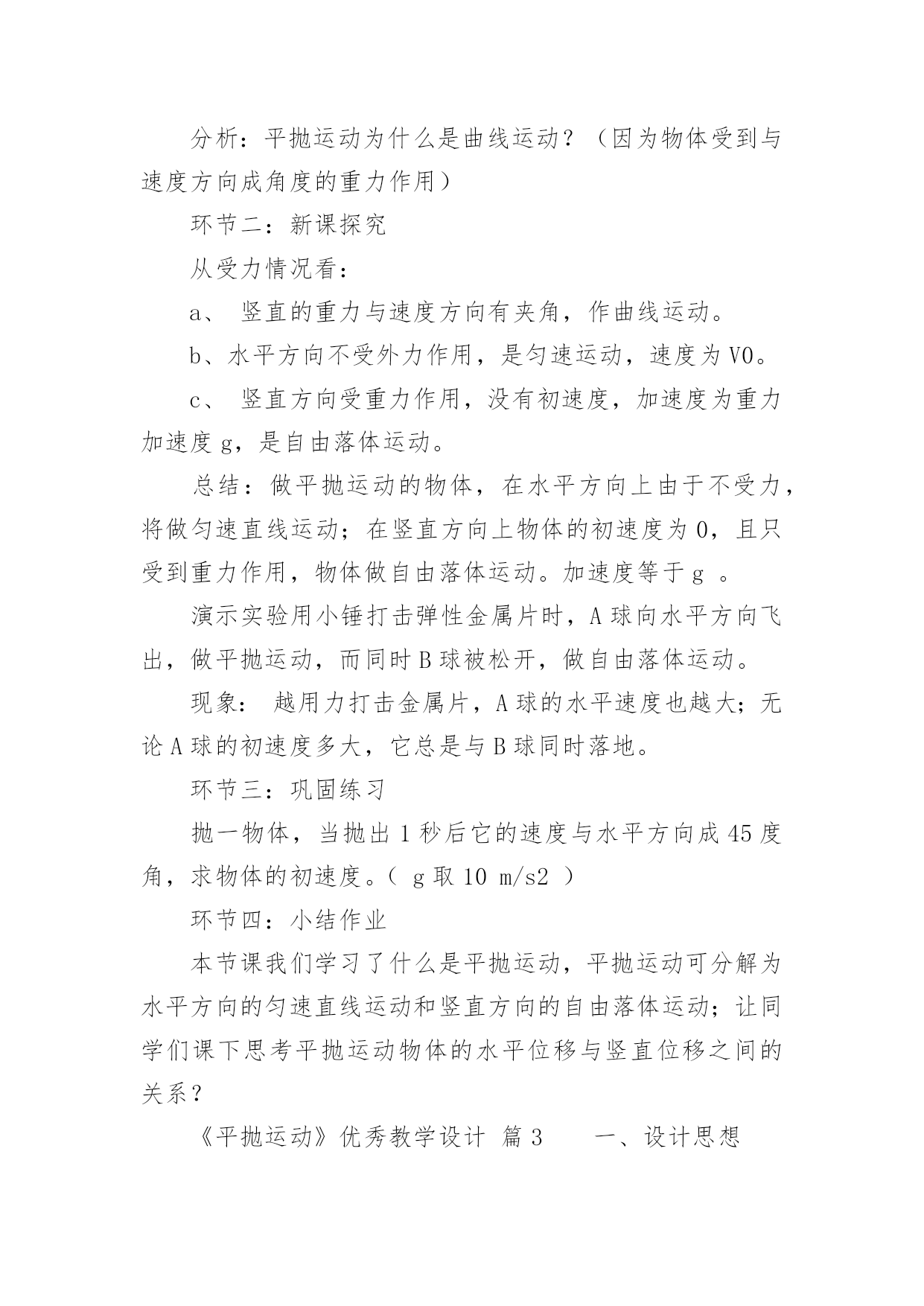 《平抛运动》优秀教学设计《平抛运动》优秀教学设计平抛物体的运动是一种典型的匀变速曲线运动,它体现了处理复杂的曲线运动的基本方法。下面我们一起来学习一下《平抛运动》优秀教学设计,希望对大家有所帮助。《平抛运动》优秀教学设计篇1授课课题平抛运动教材分析平抛物体的运动是曲线运动一章的重点,是一种最基本、最重要的曲线运动,是运动的合成和分解知识的第一次应用,是理解和掌握其它曲线运动的基础。平抛物体的运动是一种典型的匀变速曲线运动,它体现了处理复杂的曲线运动的基本方法——先分解成几个简单的直线运动——再进行合成,从而理解运动的独立性原理和叠加原理,并且会利用这种方法解决问题。本节的内容较简单,得出结论也并不难,但是用运动的合成和分解分析问题的方法,是运动学中常用的一种重要的研究问题的方法,本节的重点是掌握平抛运动的研究方法,使学生学会用运动的分解和合成来研究复杂的曲线运动,并通过实验探索分析、归纳出其运动规律是本节的难点。学情分析认识平抛运动采用的是运动的合成与分解的方法,它是一种研究问题的方法,这种方法在“力的合成与分解”的学习中学生已有基础,因此,在教学中应让学生主动尝试应用这种方法来解决平抛物体运动规律这个新问题。这一学习过程的经历,能激发学生探究未知问题的乐趣,领悟怎样将复杂的问题化为简单的问题,将未知问题化为已知问题。让学生真正理解运动合成与分解这种方法的意义,理解为什么平抛运动可以分解成水平方向的匀速直线运动和竖直方向的自由落体运动。日常生活中平抛运动的现象也较多,通过与生产、生活的联系,可以使学生更深入了解这两种运动的规律。教学目标知识与技能:(1)知道什么是抛体运动,知道什么是平抛运动;(2)知道平抛运动的受力特点,会用运动的合成与分解方法分析平抛运动;(3)掌握平抛运动的规律,会处理简单的问题。过程与方法:(1)通过举例、实验,完全由感性认识到理性认识,培养观察能力和分析能力。(2)平抛运动的研究方法————可以用两个简单的直线运动来等效替代。利用已知的直线运动的规律来研究复杂的曲线运动,渗透物理学等效替代的思想;情感态度与价值观:(1)培养学生学习科学的兴趣及实事求是的科学态度。(2)激发学生积极的学习兴趣和勇于探索的精神。教学重点平抛运动的特点、运动规律及用运动规律解答有关问题。教学难点能根据运动合成与分解的方法探究出平抛运动的一般规律。教学方法举例、分析推理、实验验证、总结归纳等教具平抛竖落仪、平抛水平仪、小钢球、粉笔头、多媒体教学过程教学内容学生活动创设情境引入新课提问:当把一个小球以不同的方式抛出,抛出的小球有什么共同点和不同点?抛体运动定义:以一定的初速度将物体抛出,不考虑空气阻力,物体只在重力作用下所做的运动叫做抛体运动。引入:今天我们来共同探讨抛体运动的一个特例———平抛运动。学生思考回答举例(生活中的抛体运动)新课教学(一)平抛运动的定义:将物体以一定的初速度沿水平方向抛出,不考虑空气阻力,物体只在重力作用下所做的运动叫做平抛运动。(二)合作探究—————(1)平抛运动的性质:根据平抛物体的初速度以及受力特点,分析可知,平抛运动是匀变速曲线运动。(2)平抛运动的分解:根据运动的合成与分解,对于一个复杂的曲线运动,可以将它简化为两个直线运动来研究。建立平面直角坐标系,分析平抛运动物体的初速度及受力特点,分析其分运动:①水平方向:物体做匀速直线运动;②竖直方向:物体做自由落体运动;实验验证:利用平抛竖落仪和平抛水平仪验证:平抛运动可分解为水平方向的匀速直线运动和竖直方向的自由落体运动。(3)平抛运动的规律1、平抛运动的速度:水平方向速度竖直方向速度合速度2、平抛运动的位移:水平方向位移竖直方向位移合位移3、平抛运动的轨迹由水平方向位移和竖直方向位移结合,消去时间t,得到y与x的关系:,y与x的关系是二次函数。所以得到:平抛运动的轨迹是一条抛物线。(4)平抛运动的规律应用1、一架战斗机以360Km/h水平匀速飞行,飞行高度为500m。若战斗机要投弹击中地面目标,它应距目标水平距离为多远时投弹?(不考虑空气阻力,g=10m/s2)2、一小球水平抛出,落地时速度大小为25m/s,方向与水平方向成530角,求小球抛出时的初速度和抛出点离地的高度。(不考虑空气阻力,g=10m/s2,sin530=0、8,cos530=0、6)(三)小结:知识总结及方法提升。在课前预习的基础上,通过小组合作探究、小组展示及点评及质疑,最终明确:平抛运动的性质、分解、规律及规律应用实验是对理论分析的验证物理方法—————分解法(等效替代法)通过两道典型练习题,掌握平抛运动规律的应用,体会解决平抛运动以及曲线运动的方法————分解法板书设计一、运动的定义二、运动的性质三、运动的分解四、运动的规律五、运动的规律应用《平抛运动》优秀教学