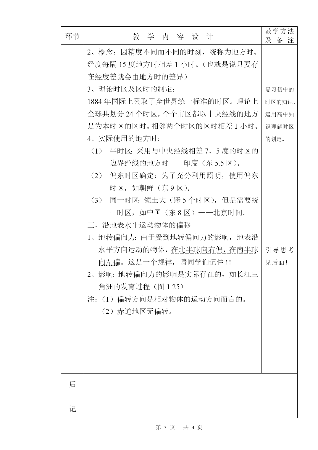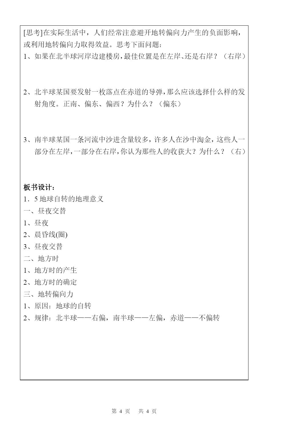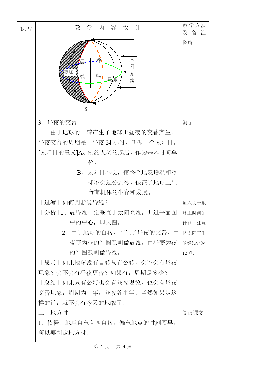 PAGE第PAGE4页共NUMPAGES4页教案时间检印月日课题1.5地球运动的地理意义(一)课型新课教学目的或目标理解由于地球自转运动造成的昼夜交替、地方时、地转偏向力。能够正确绘制昼半球和夜半球示意图,正确判断晨昏线;根据地理经度和地方时的关系,掌握计算地方时的计算方法。树立科学的宇宙观,培养学生热爱科学和勇于探索的精神。重点晨昏线的判断,地方时的计算,地转偏向力对地理环境的影响难点晨昏线的判断,地方时的计算关键地球的自转规律教具环节教学内容设计教学方法及备注复习导入讲授新课叙述黄赤交角引起的太阳直射点的回归运动的规律,写出四个特殊点的时间,直射点的位置和节气。地球处于不停的运动状态之中,地球的运动产生了许多地理效应,对人类的各种活动有着重要的影响。本节课我们学习地球运动的地理意义(一)——自转的地理意义。1.5地球自转的地理意义一、昼夜交替1、昼夜的产生:由于地球是一个不发光、不透明的球体,因此产生了昼夜。2、晨昏线(圈):太阳照亮的半球称为昼半球,背着太阳的半球称为夜半球,昼半球与夜半球的分界线(圈)叫做晨昏线(圈)。平行太阳光线照射地球,与球体相切,将切点连接起来就成为晨昏线(圈)。太阳高度表示太让光线对当地地平面的倾角,晨昏线上太阳高度为零。提问讲述阅读本部分内容环节S太阳光线晨线昏线线夜弧线昼弧线教学内容设计教学方法及备注3、昼夜的交替由于地球的自转产生了地球上昼夜的交替产生。昼夜交替的周期是一昼夜24小时,叫做一个太阳日。[太阳日的意义]A、制约人类的起居,作为基本时间单位。B、太阳日不长,使整个地表增温和冷却不会过分剧烈,保证了地球上生命有机体的生存和发展。[过渡]如何判断晨昏线?[分析]1、晨昏线一定垂直于太阳光线,并过平面图中的中心,即大圆。2、由于地球的自转,产生了昼夜的交替,由夜变为昼的半圆弧叫做晨线,由昼变为夜的半圆弧叫做昏线。[思考]如果地球没有自转只有公转,会不会有昼夜现象?会不会有昼夜更替?如果有,周期是多少?[总结]如果只有公转也会有昼夜现象,也会有昼夜交替现象,周期为一年,昼夜各半年。当然如果是这样的话,就不会有今天的地貌了。二、地方时1、依据:地球自东向西自转,偏东地点的时刻要早,所以要制定地方时。图解演示加入关于地球上时间的计算,注意将太阳直射的经线定为12点。阅读课文环节教学内容设计教学方法及备注2、概念:因精度不同而不同的时刻,统称为地方时。经度每隔15度地方时相差1小时。(也就是说只要存在经度差就会由地方时的差异)3、理论时区及区时的制定:1884年国际上采取了全世界统一标准的时区。理论上全球共划分24个时区,个个市区都以中央经线的地方是为本时区的区时。相邻两个时区的区时相差1小时。4、实际使用的地方时:半时区:采用与中央经线相差7、5度的时区的边界经线的地方时——印度(东5.5区)。偏东时区确定:为了充分利用照明,使用偏东时区,如朝鲜(东9区)。同一时区:领土大(跨5个时区),但是需要统一时区,如中国(东8区)——北京时间。三、沿地表水平运动物体的偏移地转偏向力:由于受到地转偏向力的影响,地表沿水平方向运动的物体,在北半球向右偏,在南半球向左偏。这是一个规律,请同学们记住!!影响:地转偏向力的影响是实际存在的,如长江三角洲的发育过程(图1.25)注:(1)偏转方向是相对物体的运动方向而言的。(2)赤道地区无偏转。复习初中的时区的知识,运用高中知识理解时区的划定。引导思考见后面!后记[思考]在实际生活中,人们经常注意避开地转偏向力产生的负面影响,或利用地转偏向力取得效益。思考下面问题:如果在北半球河岸边建楼房,最佳位置是在左岸、还是右岸?(右岸)北半球某国要发射一枚落点在赤道的导弹,那么应该选择什么样的发射角度。正南、偏东、偏西?为什么?(偏东)南半球某国一条河流中沙进含量较多,许多人在沙中淘金,这些人一部分在左岸,一部分在右岸,你认为那些人的收获大?为什么?(右)板书设计:1.5地球自转的地理意义一、昼夜交替昼夜晨昏线(圈)昼夜交替二、地方时地方时的产生地方时的确定三、地转偏向力原因:地球的自转规律:北半球——右偏,南半球——左偏,赤道——不偏转