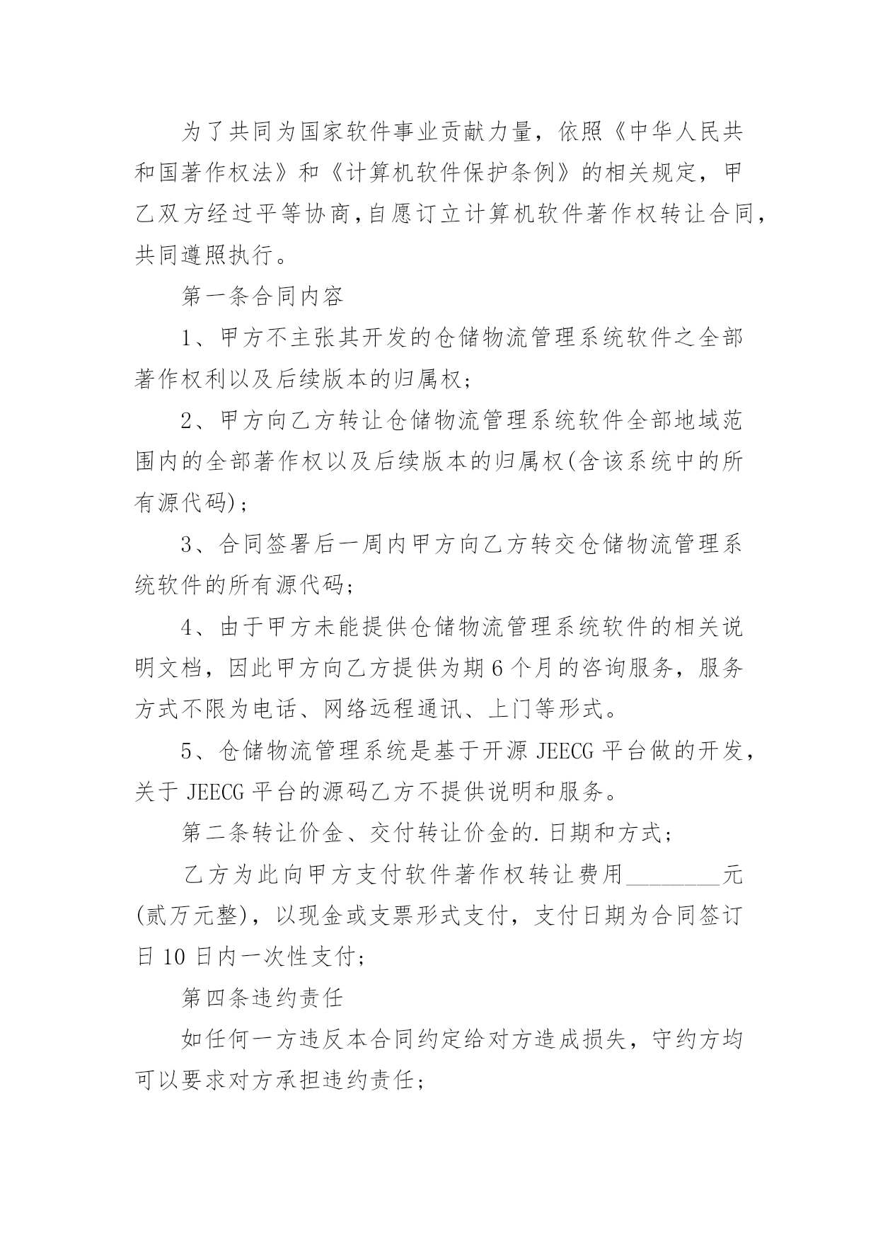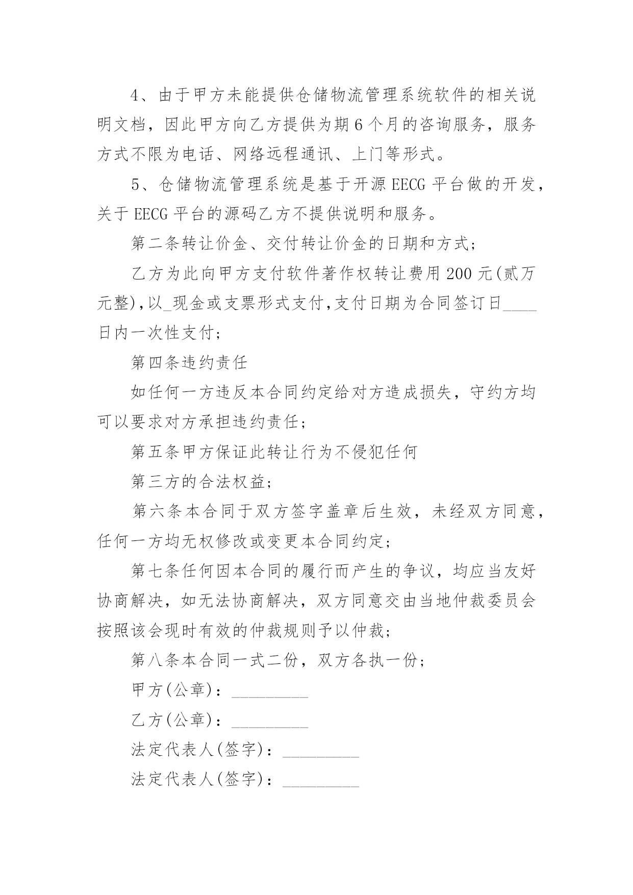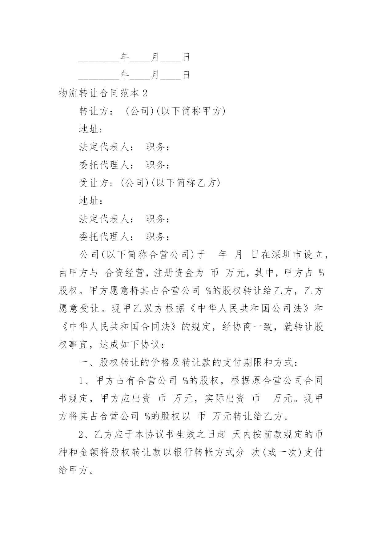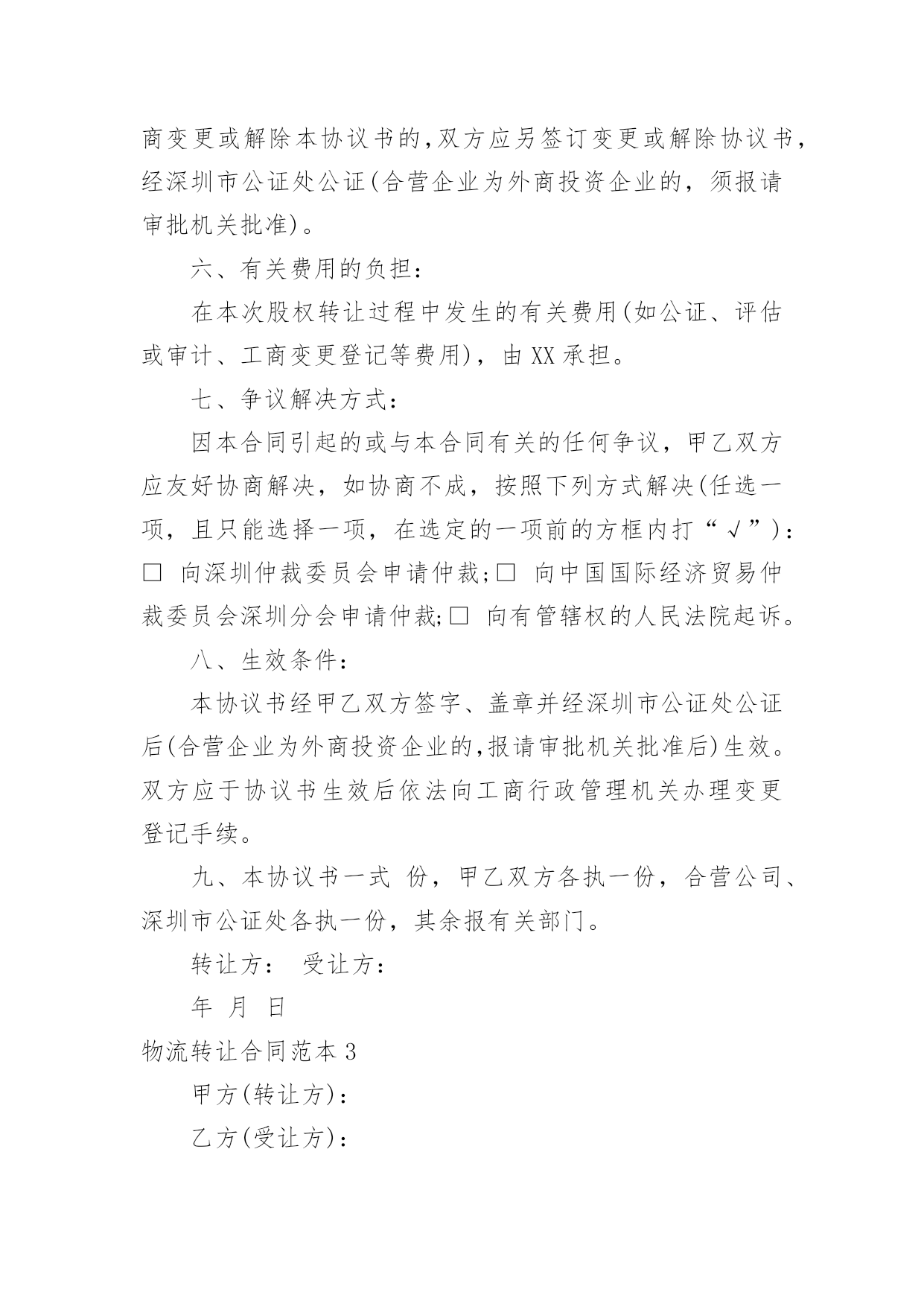 物流转让合同物流转让合同随着人们法律意识的加强,很多场合都离不了合同,合同是企业发展中一个非常重要的因素。那么大家知道正规的合同书怎么写吗?下面是小编为大家整理的物流转让合同范本,仅供参考,欢迎大家阅读。物流转让合同范本1甲方(转让方):乙方(受让方):为了共同为国家软件事业贡献力量,依照《中华人民共和国著作权法》和《计算机软件保护条例》的相关规定,甲乙双方经过平等协商,自愿订立计算机软件著作权转让合同,共同遵照执行。第一条合同内容1、甲方不主张其开发的仓储物流管理系统软件之全部著作权利以及后续版本的归属权;2、甲方向乙方转让仓储物流管理系统软件全部地域范围内的全部著作权以及后续版本的.归属权(含该系统中的所有源代码);3、合同签署后一周内甲方向乙方转交仓储物流管理系统软件的所有源代码;4、由于甲方未能提供仓储物流管理系统软件的相关说明文档,因此甲方向乙方提供为期6个月的咨询服务,服务方式不限为电话、网络远程通讯、上门等形式。5、仓储物流管理系统是基于开源EECG平台做的开发,关于EECG平台的源码乙方不提供说明和服务。第二条转让价金、交付转让价金的日期和方式;乙方为此向甲方支付软件著作权转让费用200元(贰万元整),以_现金或支票形式支付,支付日期为合同签订日____日内一次性支付;第四条违约责任如任何一方违反本合同约定给对方造成损失,守约方均可以要求对方承担违约责任;第五条甲方保证此转让行为不侵犯任何第三方的合法权益;第六条本合同于双方签字盖章后生效,未经双方同意,任何一方均无权修改或变更本合同约定;第七条任何因本合同的履行而产生的争议,均应当友好协商解决,如无法协商解决,双方同意交由当地仲裁委员会按照该会现时有效的仲裁规则予以仲裁;第八条本合同一式二份,双方各执一份;甲方(公章):_________乙方(公章):_________法定代表人(签字):_________法定代表人(签字):_________________年____月____日________年____月____日物流转让合同范本2转让方:(公司)(以下简称甲方)地址:法定代表人:职务:委托代理人:职务:受让方:(公司)(以下简称乙方)地址:法定代表人:职务:委托代理人:职务:公司(以下简称合营公司)于年月日在深圳市设立,由甲方与合资经营,注册资金为币万元,其中,甲方占%股权。甲方愿意将其占合营公司%的股权转让给乙方,乙方愿意受让。现甲乙双方根据《中华人民共和国公司法》和《中华人民共和国合同法》的规定,经协商一致,就转让股权事宜,达成如下协议:一、股权转让的价格及转让款的支付期限和方式:1、甲方占有合营公司%的股权,根据原合营公司合同书规定,甲方应出资币万元,实际出资币万元。现甲方将其占合营公司%的股权以币万元转让给乙方。2、乙方应于本协议书生效之日起天内按前款规定的币种和金额将股权转让款以银行转帐方式分次(或一次)支付给甲方。二、甲方保证对其拟转让给乙方的股权拥有完全处分权,保证该股权没有设定质押,保证股权未被查封,并免遭第三人追索,否则甲方应当承担由此引起一切经济和法律责任。三、有关合营公司盈亏(含债权债务)的分担:1、本协议书生效后,乙方按受让股权的比例分享合营公司的利润,分担相应的风险及亏损。2、如因甲方在签订本协议书时,未如实告知乙方有关合营公司在股权转让前所负债务,致使乙方在成为合营公司的股东后遭受损失的,乙方有权向甲方追偿。四、违约责任:1、本协议书一经生效,双方必须自觉履行,任何一方未按协议书的规定全面履行义务,应当依照法律和本协议书的规定承担责任。2、如乙方不能按期支付股权转让款,每逾期一天,应向甲方支付逾期部分转让款的万分之的违约金。如因乙方违约给甲方造成损失,乙方支付的违约金金额低于实际损失的,乙方必须另予以补偿。3、如由于甲方的原因,致使乙方不能如期办理变更登记,或者严重影响乙方实现订立本协议书的目的.,甲方应按照乙方已经支付的转让款的万分之向乙方支付违约金。如因甲方违约给乙方造成损失,甲方支付的违约金金额低于实际损失的,甲方必须另予以补偿。五、协议书的变更或解除:甲乙双方经协商一致,可以变更或解除本协议书。经协商变更或解除本协议书的,双方应另签订变更或解除协议书,经深圳市公证处公证(合营企业为外商投资企业的,须报请审批机关批准)。六、有关费用的负担:在本次股权转让过程中发生的有关费用(如公证、评估或审计、工商变更登记等费用),由XX承担。七、争议解决方式:因本合同引起的或与本合同有关的任何争议,甲乙双方应友好协商解决,如协商不成,按照下列方式解决(任选一项,且只能选择一项,在选定的一项前的方框内打“√”):□向深圳仲裁委员会申请仲裁;□向中国国际经济贸易仲裁委员会深圳分会申请仲裁;□向有管辖权的人民法院起诉。八、生效条件:本协
