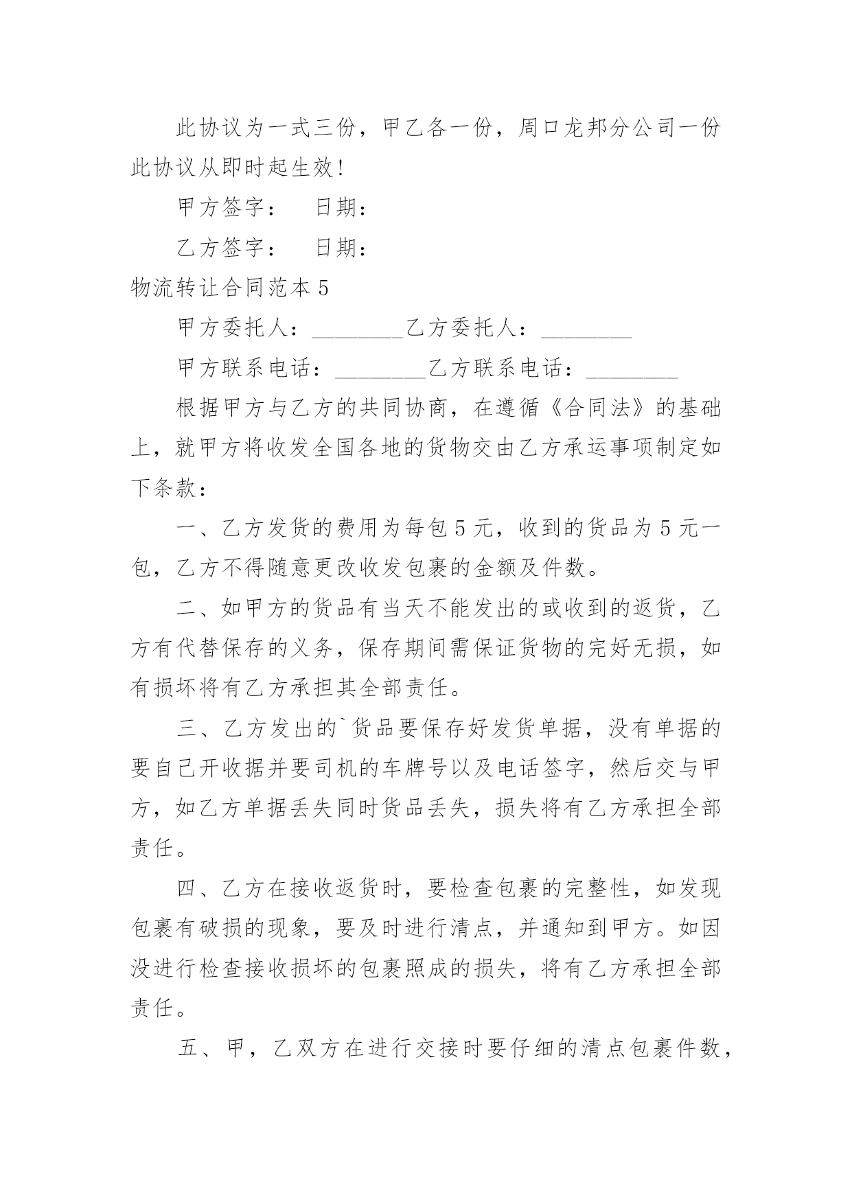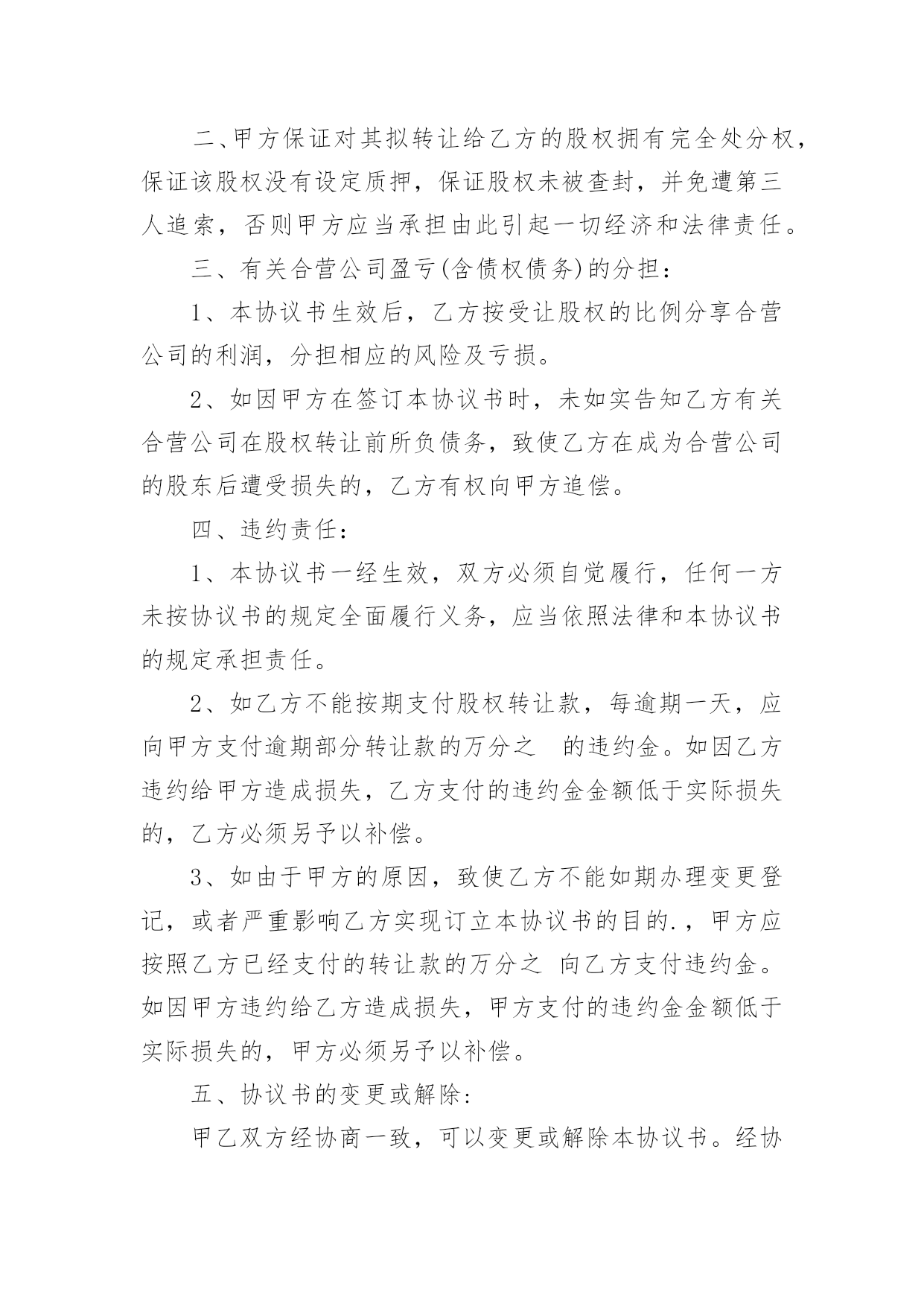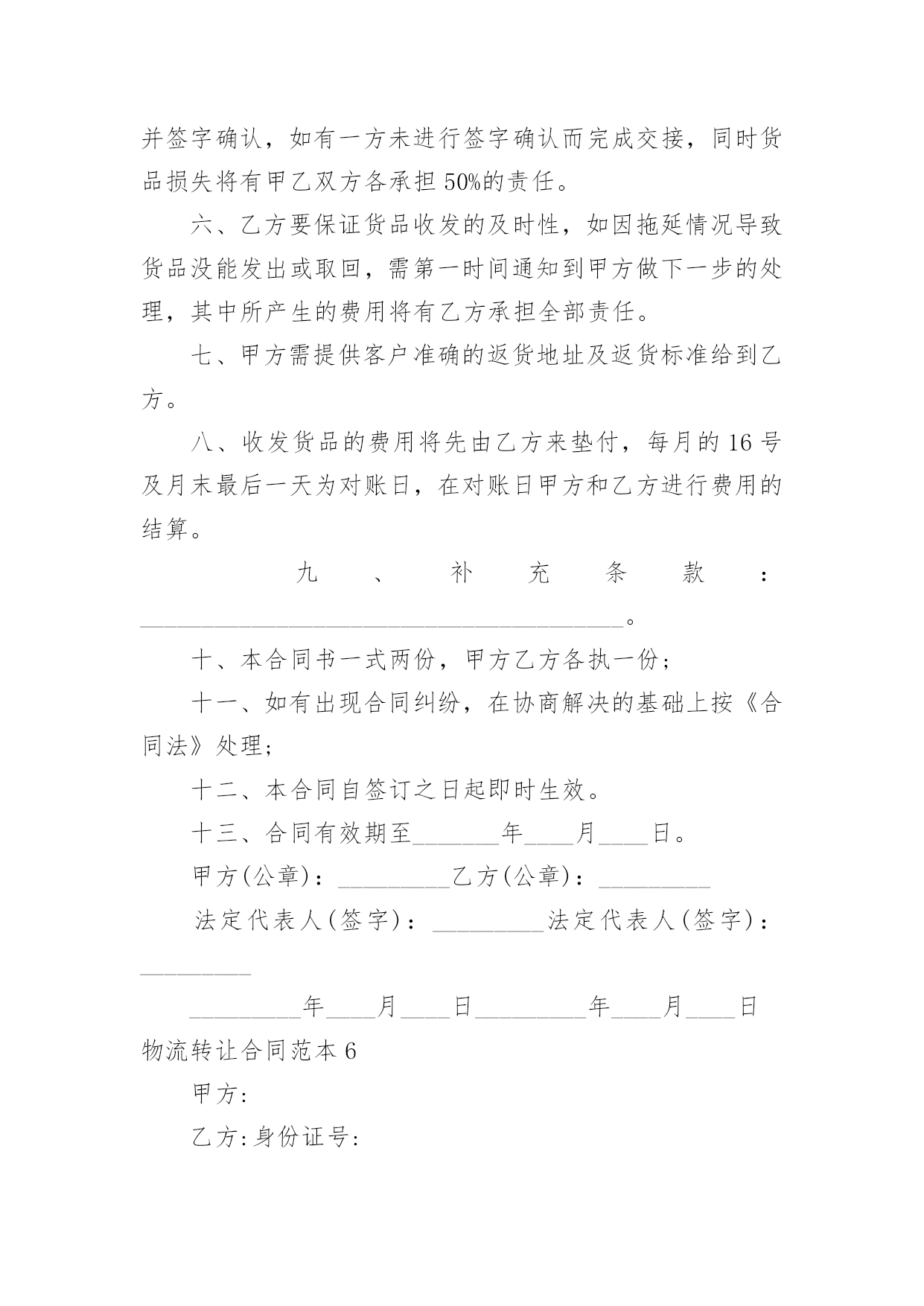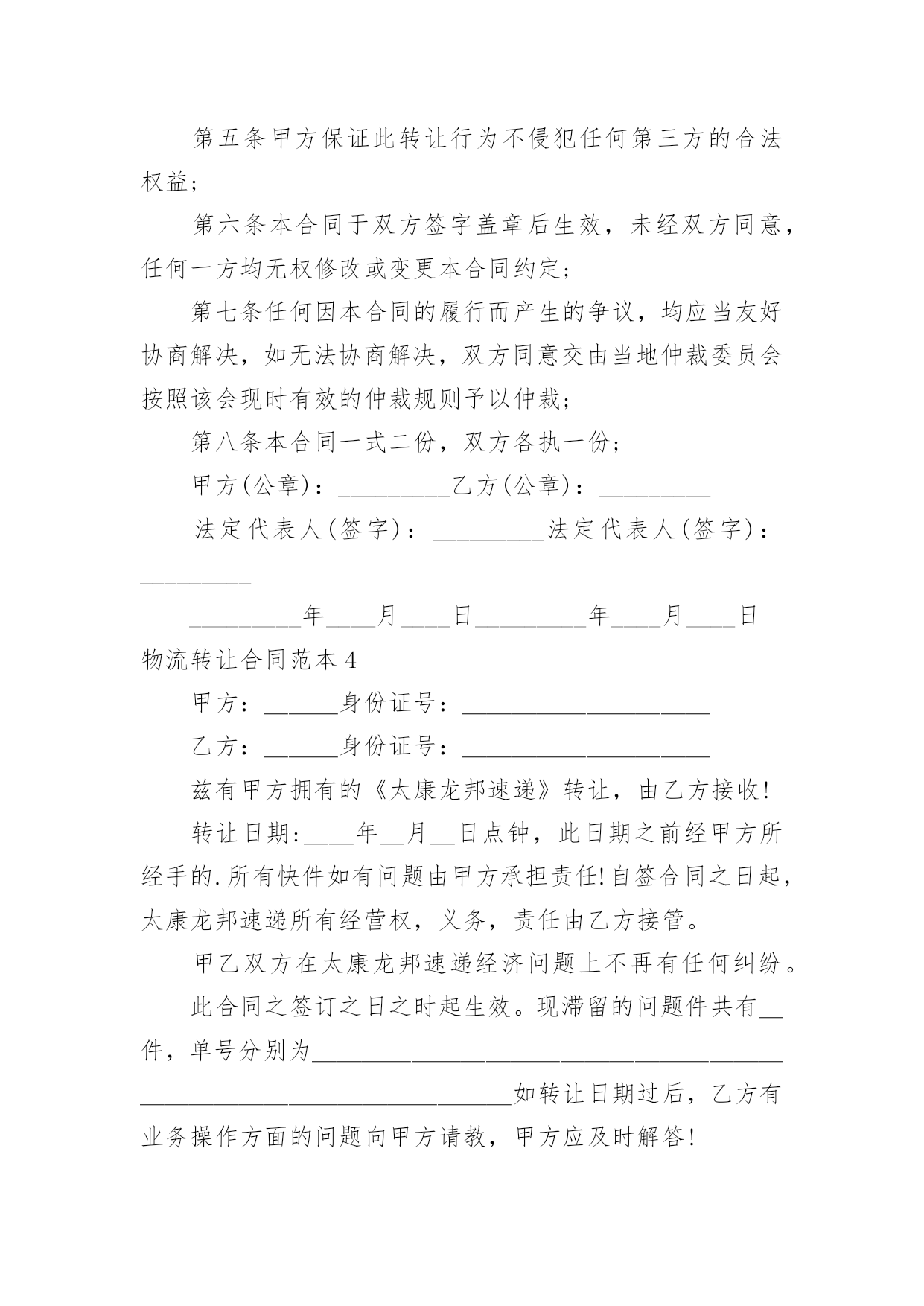 物流转让合同物流转让合同随着人们法律意识的加强,很多场合都离不了合同,合同是企业发展中一个非常重要的因素。那么大家知道正规的合同书怎么写吗?下面是小编为大家整理的物流转让合同范本,仅供参考,欢迎大家阅读。物流转让合同范本1甲方(转让方):乙方(受让方):为了共同为国家软件事业贡献力量,依照《中华人民共和国著作权法》和《计算机软件保护条例》的相关规定,甲乙双方经过平等协商,自愿订立计算机软件著作权转让合同,共同遵照执行。第一条合同内容1、甲方不主张其开发的仓储物流管理系统软件之全部著作权利以及后续版本的归属权;2、甲方向乙方转让仓储物流管理系统软件全部地域范围内的全部著作权以及后续版本的.归属权(含该系统中的所有源代码);3、合同签署后一周内甲方向乙方转交仓储物流管理系统软件的所有源代码;4、由于甲方未能提供仓储物流管理系统软件的相关说明文档,因此甲方向乙方提供为期6个月的咨询服务,服务方式不限为电话、网络远程通讯、上门等形式。5、仓储物流管理系统是基于开源EECG平台做的开发,关于EECG平台的源码乙方不提供说明和服务。第二条转让价金、交付转让价金的日期和方式;乙方为此向甲方支付软件著作权转让费用200元(贰万元整),以_现金或支票形式支付,支付日期为合同签订日____日内一次性支付;第四条违约责任如任何一方违反本合同约定给对方造成损失,守约方均可以要求对方承担违约责任;第五条甲方保证此转让行为不侵犯任何第三方的合法权益;第六条本合同于双方签字盖章后生效,未经双方同意,任何一方均无权修改或变更本合同约定;第七条任何因本合同的履行而产生的争议,均应当友好协商解决,如无法协商解决,双方同意交由当地仲裁委员会按照该会现时有效的仲裁规则予以仲裁;第八条本合同一式二份,双方各执一份;甲方(公章):_________乙方(公章):_________法定代表人(签字):_________法定代表人(签字):_________________年____月____日________年____月____日物流转让合同范本2转让方:(公司)(以下简称甲方)地址:法定代表人:职务:委托代理人:职务:受让方:(公司)(以下简称乙方)地址:法定代表人:职务:委托代理人:职务:公司(以下简称合营公司)于年月日在深圳市设立,由甲方与合资经营,注册资金为币万元,其中,甲方占%股权。甲方愿意将其占合营公司%的股权转让给乙方,乙方愿意受让。现甲乙双方根据《中华人民共和国公司法》和《中华人民共和国合同法》的规定,经协商一致,就转让股权事宜,达成如下协议:一、股权转让的价格及转让款的支付期限和方式:1、甲方占有合营公司%的股权,根据原合营公司合同书规定,甲方应出资币万元,实际出资币万元。现甲方将其占合营公司%的股权以币万元转让给乙方。2、乙方应于本协议书生效之日起天内按前款规定的币种和金额将股权转让款以银行转帐方式分次(或一次)支付给甲方。二、甲方保证对其拟转让给乙方的股权拥有完全处分权,保证该股权没有设定质押,保证股权未被查封,并免遭第三人追索,否则甲方应当承担由此引起一切经济和法律责任。三、有关合营公司盈亏(含债权债务)的分担:1、本协议书生效后,乙方按受让股权的比例分享合营公司的利润,分担相应的风险及亏损。2、如因甲方在签订本协议书时,未如实告知乙方有关合营公司在股权转让前所负债务,致使乙方在成为合营公司的股东后遭受损失的,乙方有权向甲方追偿。四、违约责任:1、本协议书一经生效,双方必须自觉履行,任何一方未按协议书的规定全面履行义务,应当依照法律和本协议书的规定承担责任。2、如乙方不能按期支付股权转让款,每逾期一天,应向甲方支付逾期部分转让款的万分之的违约金。如因乙方违约给甲方造成损失,乙方支付的违约金金额低于实际损失的,乙方必须另予以补偿。3、如由于甲方的原因,致使乙方不能如期办理变更登记,或者严重影响乙方实现订立本协议书的目的.,甲方应按照乙方已经支付的转让款的万分之向乙方支付违约金。如因甲方违约给乙方造成损失,甲方支付的违约金金额低于实际损失的,甲方必须另予以补偿。五、协议书的变更或解除:甲乙双方经协商一致,可以变更或解除本协议书。经协商变更或解除本协议书的,双方应另签订变更或解除协议书,经深圳市公证处公证(合营企业为外商投资企业的,须报请审批机关批准)。六、有关费用的负担:在本次股权转让过程中发生的有关费用(如公证、评估或审计、工商变更登记等费用),由XX承担。七、争议解决方式:因本合同引起的或与本合同有关的任何争议,甲乙双方应友好协商解决,如协商不成,按照下列方式解决(任选一项,且只能选择一项,在选定的一项前的方框内打“√”):□向深圳仲裁委员会申请仲裁;□向中国国际经济贸易仲裁委员会深圳分会申请仲裁;□向有管辖权的人民法院起诉。八、生效条件:本协
