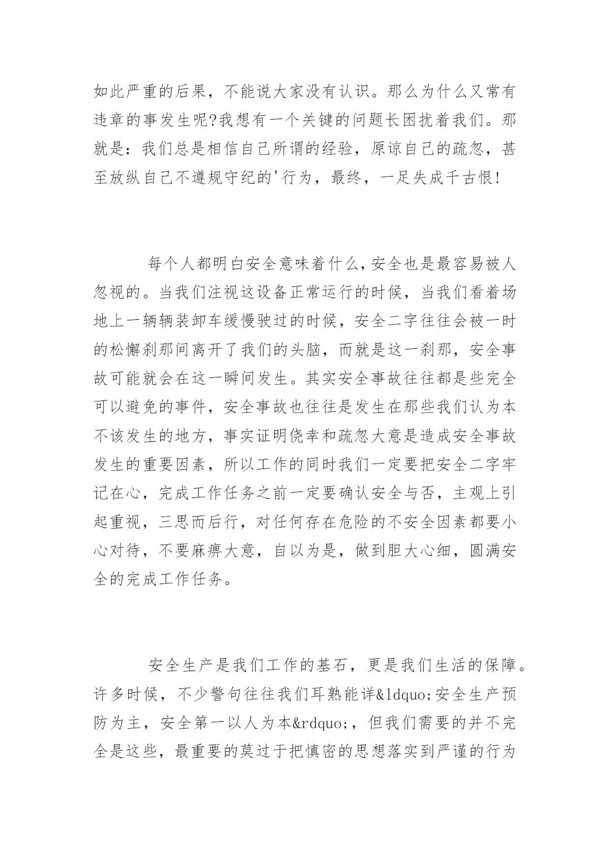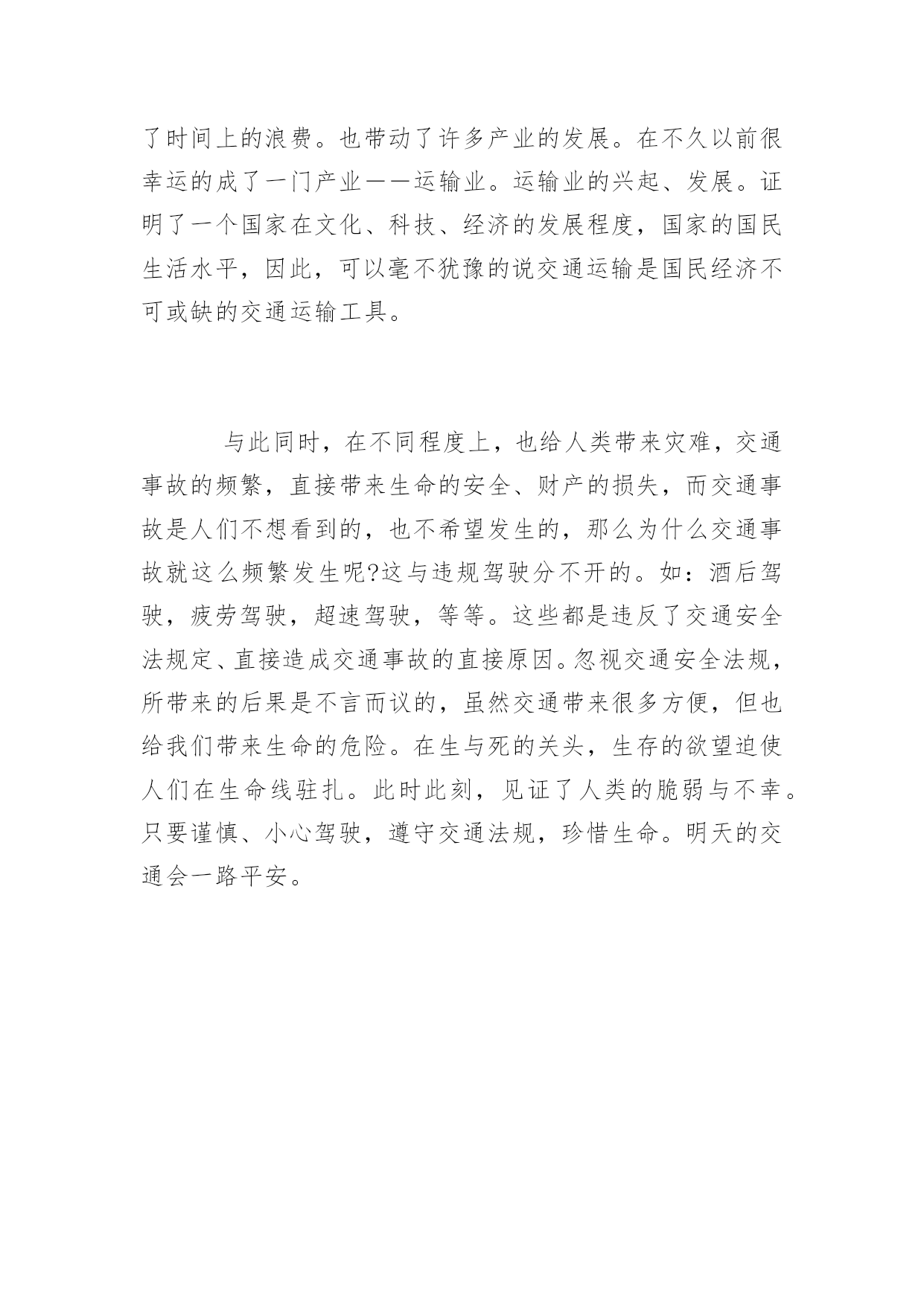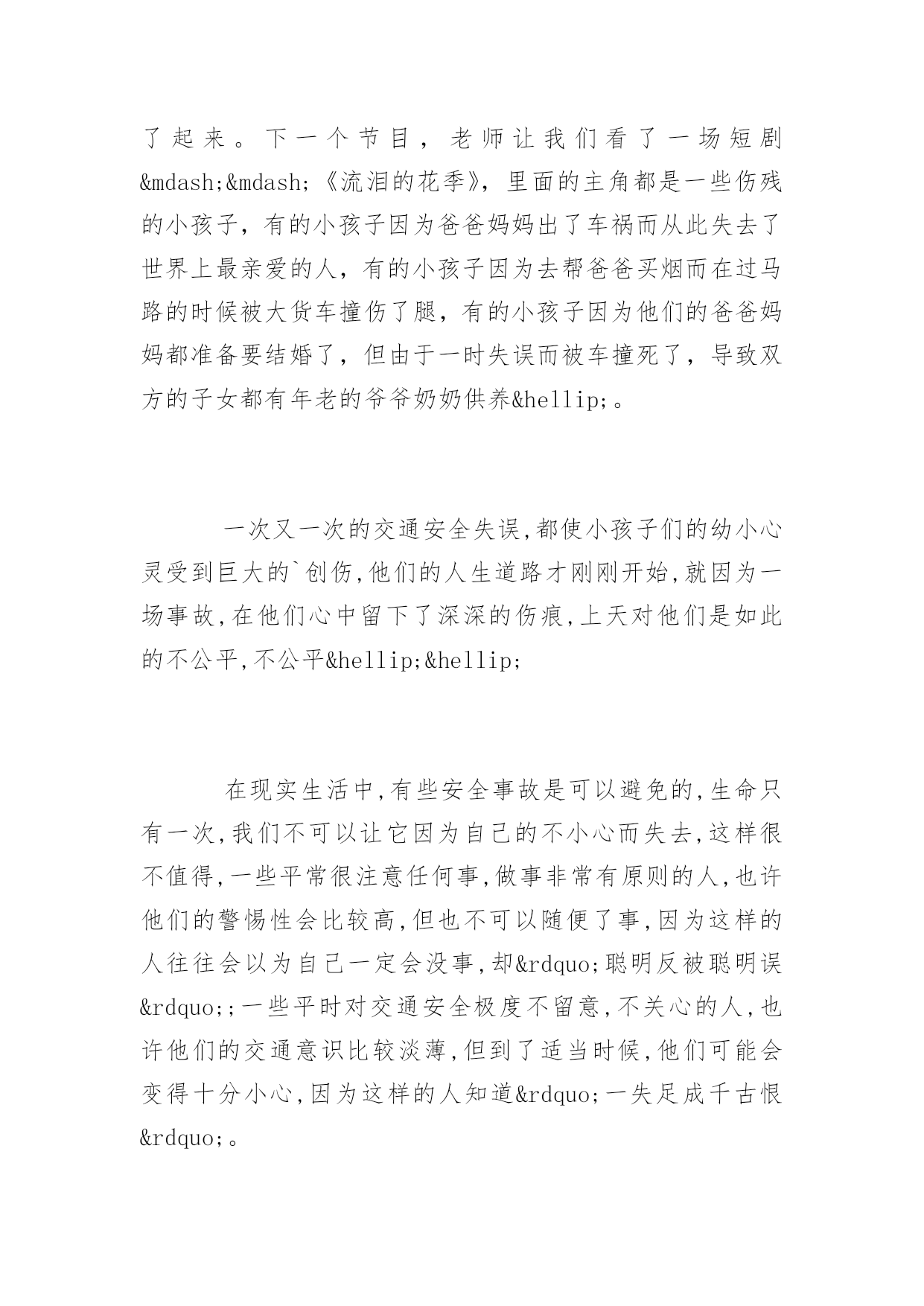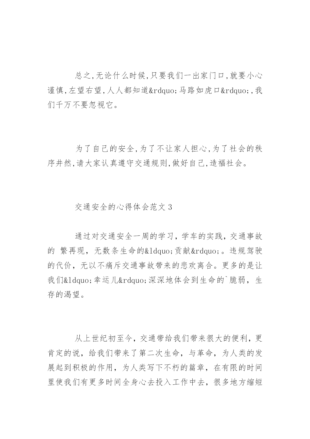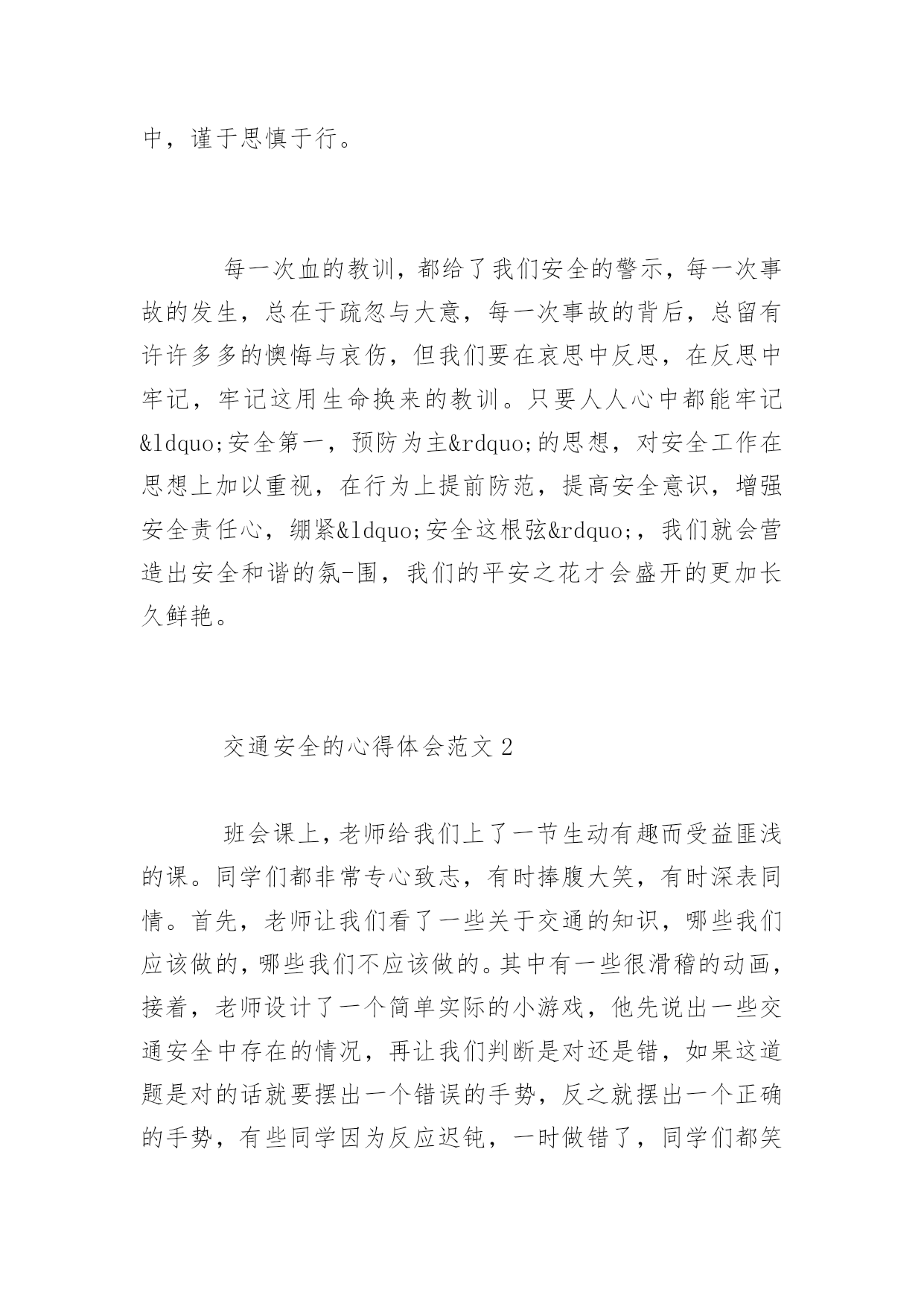 交通安全的心得体会交通安全的心得体会范文学校应该加强交通安全教育以进一步增强学生的安全意识,提高他们的自防自护能力,遏制交通事故的发生。下面是百分网小编为大家整理的交通安全的心得体会范文的相关资料,希望大家喜欢。交通安全的心得体会范文1如果说企业的存在是为了追求效益,那么安全生产就是企业最大的效益,所以安全生产是立业之本。对于广大企业职工来说,对安全生产的重视是我们的责任和义务,保证自己在正常生产的同时不受到伤害,是对企业负责,更是对自己和家庭负责。从进入企业的第一天起我们接触的第一堂课就是安全教育,企业对员工进行公司、车间、班组三级安全教育,层层把关,可见安全生产对于企业的重要性。安全生产是每一个企业员工的护身符。谁违反了,就等于飞蛾扑火。安全也是一把双刃剑,遵守它的规则它就会保护你,违反他的规则他就会让你付出血的代价。违章导致如此严重的后果,不能说大家没有认识。那么为什么又常有违章的事发生呢?我想有一个关键的问题长困扰着我们。那就是:我们总是相信自己所谓的经验,原谅自己的疏忽,甚至放纵自己不遵规守纪的'行为,最终,一足失成千古恨!每个人都明白安全意味着什么,安全也是最容易被人忽视的。当我们注视这设备正常运行的时候,当我们看着场地上一辆辆装卸车缓慢驶过的时候,安全二字往往会被一时的松懈刹那间离开了我们的头脑,而就是这一刹那,安全事故可能就会在这一瞬间发生。其实安全事故往往都是些完全可以避免的事件,安全事故也往往是发生在那些我们认为本不该发生的地方,事实证明侥幸和疏忽大意是造成安全事故发生的重要因素,所以工作的同时我们一定要把安全二字牢记在心,完成工作任务之前一定要确认安全与否,主观上引起重视,三思而后行,对任何存在危险的不安全因素都要小心对待,不要麻痹大意,自以为是,做到胆大心细,圆满安全的完成工作任务。安全生产是我们工作的基石,更是我们生活的保障。许多时候,不少警句往往我们耳熟能详“安全生产预防为主,安全第一以人为本”,但我们需要的并不完全是这些,最重要的莫过于把慎密的思想落实到严谨的行为中,谨于思慎于行。每一次血的教训,都给了我们安全的警示,每一次事故的发生,总在于疏忽与大意,每一次事故的背后,总留有许许多多的懊悔与哀伤,但我们要在哀思中反思,在反思中牢记,牢记这用生命换来的教训。只要人人心中都能牢记“安全第一,预防为主”的思想,对安全工作在思想上加以重视,在行为上提前防范,提高安全意识,增强安全责任心,绷紧“安全这根弦”,我们就会营造出安全和谐的氛-围,我们的平安之花才会盛开的更加长久鲜艳。交通安全的心得体会范文2班会课上,老师给我们上了一节生动有趣而受益匪浅的课。同学们都非常专心致志,有时捧腹大笑,有时深表同情。首先,老师让我们看了一些关于交通的知识,哪些我们应该做的,哪些我们不应该做的。其中有一些很滑稽的动画,接着,老师设计了一个简单实际的小游戏,他先说出一些交通安全中存在的情况,再让我们判断是对还是错,如果这道题是对的话就要摆出一个错误的手势,反之就摆出一个正确的手势,有些同学因为反应迟钝,一时做错了,同学们都笑了起来。下一个节目,老师让我们看了一场短剧——《流泪的花季》,里面的主角都是一些伤残的小孩子,有的小孩子因为爸爸妈妈出了车祸而从此失去了世界上最亲爱的人,有的小孩子因为去帮爸爸买烟而在过马路的时候被大货车撞伤了腿,有的小孩子因为他们的爸爸妈妈都准备要结婚了,但由于一时失误而被车撞死了,导致双方的子女都有年老的爷爷奶奶供养…。一次又一次的交通安全失误,都使小孩子们的幼小心灵受到巨大的`创伤,他们的人生道路才刚刚开始,就因为一场事故,在他们心中留下了深深的伤痕,上天对他们是如此的不公平,不公平……在现实生活中,有些安全事故是可以避免的,生命只有一次,我们不可以让它因为自己的不小心而失去,这样很不值得,一些平常很注意任何事,做事非常有原则的人,也许他们的警惕性会比较高,但也不可以随便了事,因为这样的人往往会以为自己一定会没事,却”聪明反被聪明误”;一些平时对交通安全极度不留意,不关心的人,也许他们的交通意识比较淡薄,但到了适当时候,他们可能会变得十分小心,因为这样的人知道”一失足成千古恨”。总之,无论什么时候,只要我们一出家门口,就要小心谨慎,左望右望,人人都知道”马路如虎口”,我们千万不要忽视它。为了自己的安全,为了不让家人担心,为了社会的秩序井然,请大家认真遵守交通规则,做好自己,造福社会。交通安全的心得体会范文3通过对交通安全一周的学习,学车的实践,交通事故的繁再现