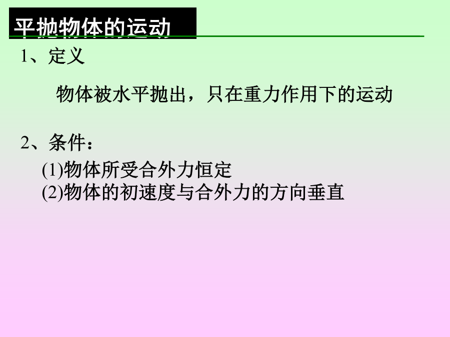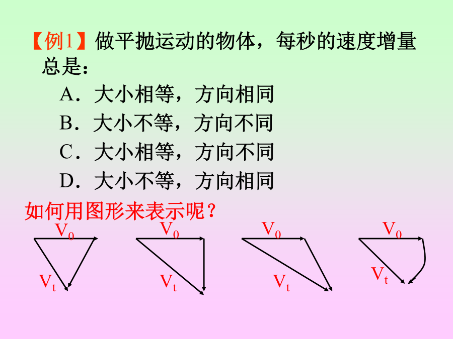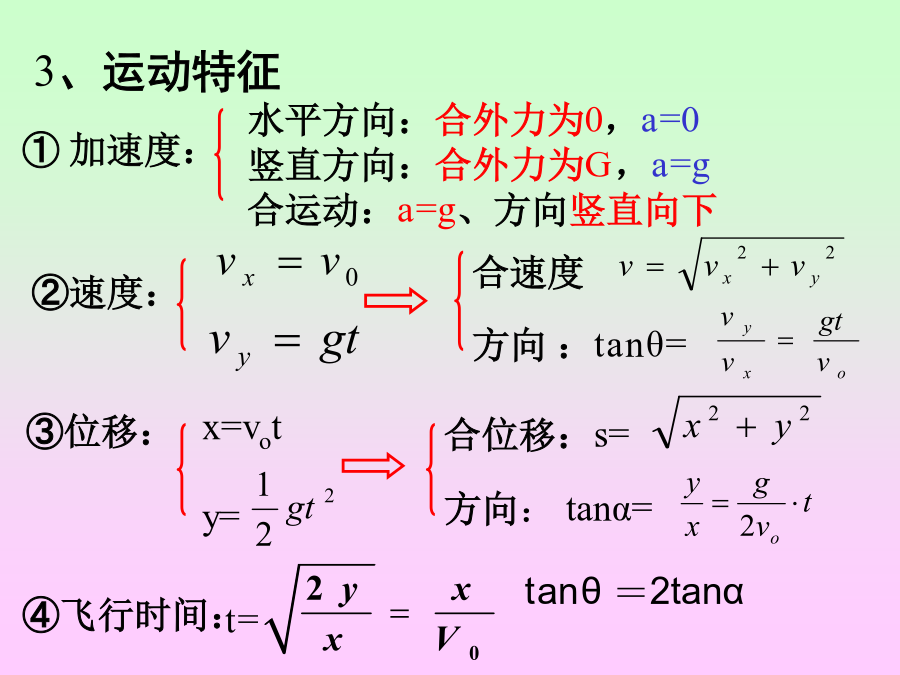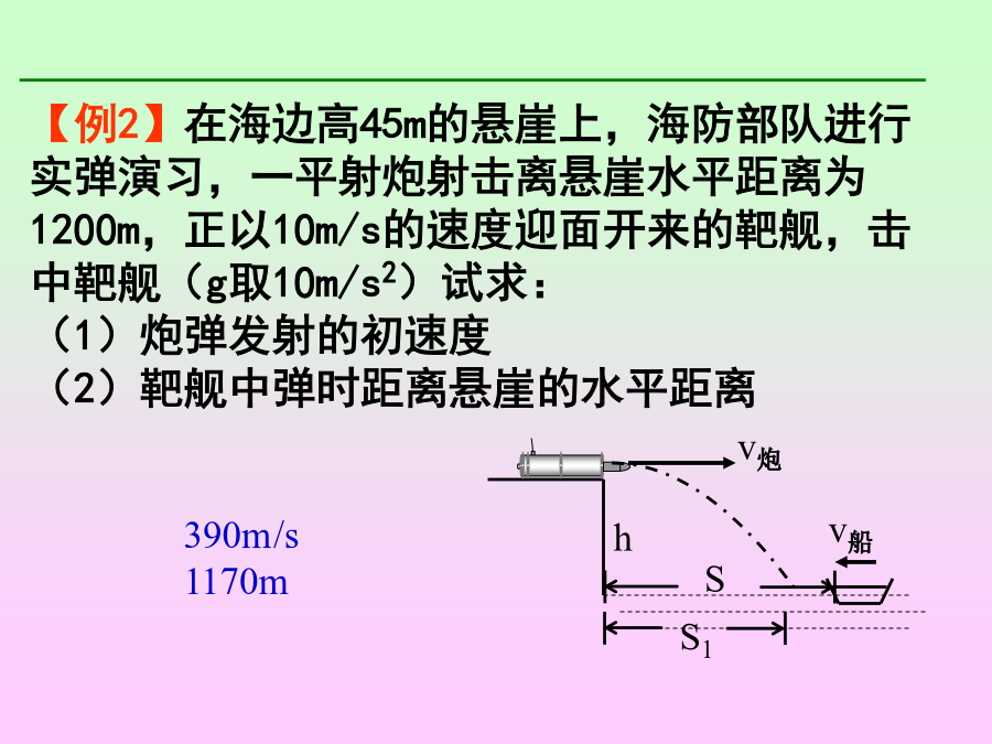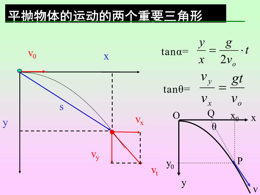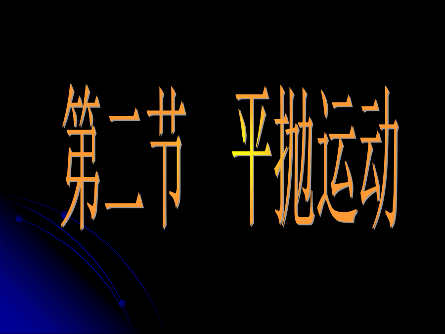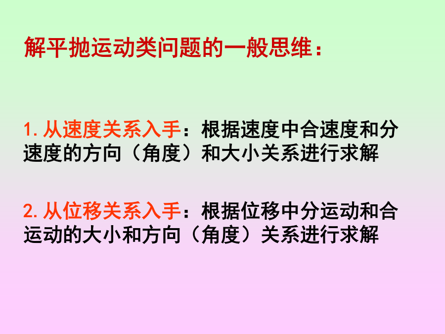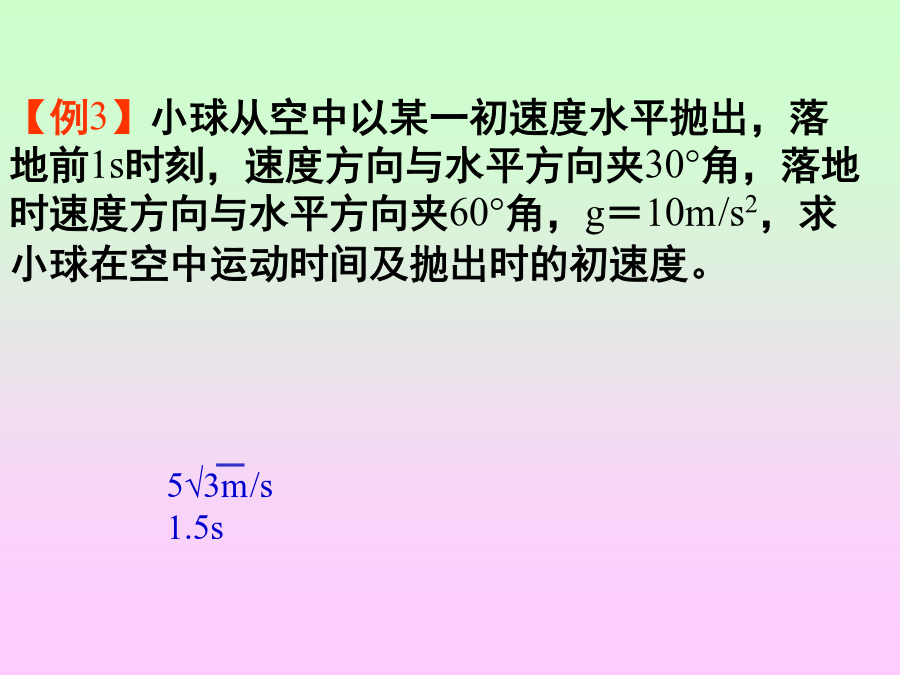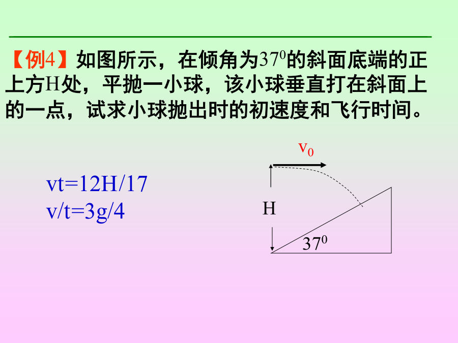 第四单元曲线运动、万有引力定律及其应用平抛物体的运动3、运动特征【例1】做平抛运动的物体,每秒的速度增量总是:A.大小相等,方向相同B.大小不等,方向不同C.大小相等,方向不同D.大小不等,方向相同如何用图形来表示呢?【例2】在海边高45m的悬崖上,海防部队进行实弹演习,一平射炮射击离悬崖水平距离为1200m,正以10m/s的速度迎面开来的靶舰,击中靶舰(g取10m/s2)试求:(1)炮弹发射的初速度(2)靶舰中弹时距离悬崖的水平距离平抛物体的运动的两个重要三角形解平抛运动类问题的一般思维:【例3】小球从空中以某一初速度水平抛出,落地前1s时刻,速度方向与水平方向夹30°角,落地时速度方向与水平方向夹60°角,g=10m/s2,求小球在空中运动时间及抛出时的初速度。【例4】如图所示,在倾角为370的斜面底端的正上方H处,平抛一小球,该小球垂直打在斜面上的一点,试求小球抛出时的初速度和飞行时间。【例5】如图所示,从倾角为θ的斜面上的A点以速度V0平抛一个小球,小球落在斜面上的B点.则小球从A到B的运动时间为.【例6】如图为某小球做平抛运动时,用闪光照相的方法获得的相片的一部分,图中背景方格的边长为5cm,g=10m/s2,则(1)小球平抛的初速度vo=m/s(2)闪光频率f=Hz(3)小球过A点的速率vA=m/sC