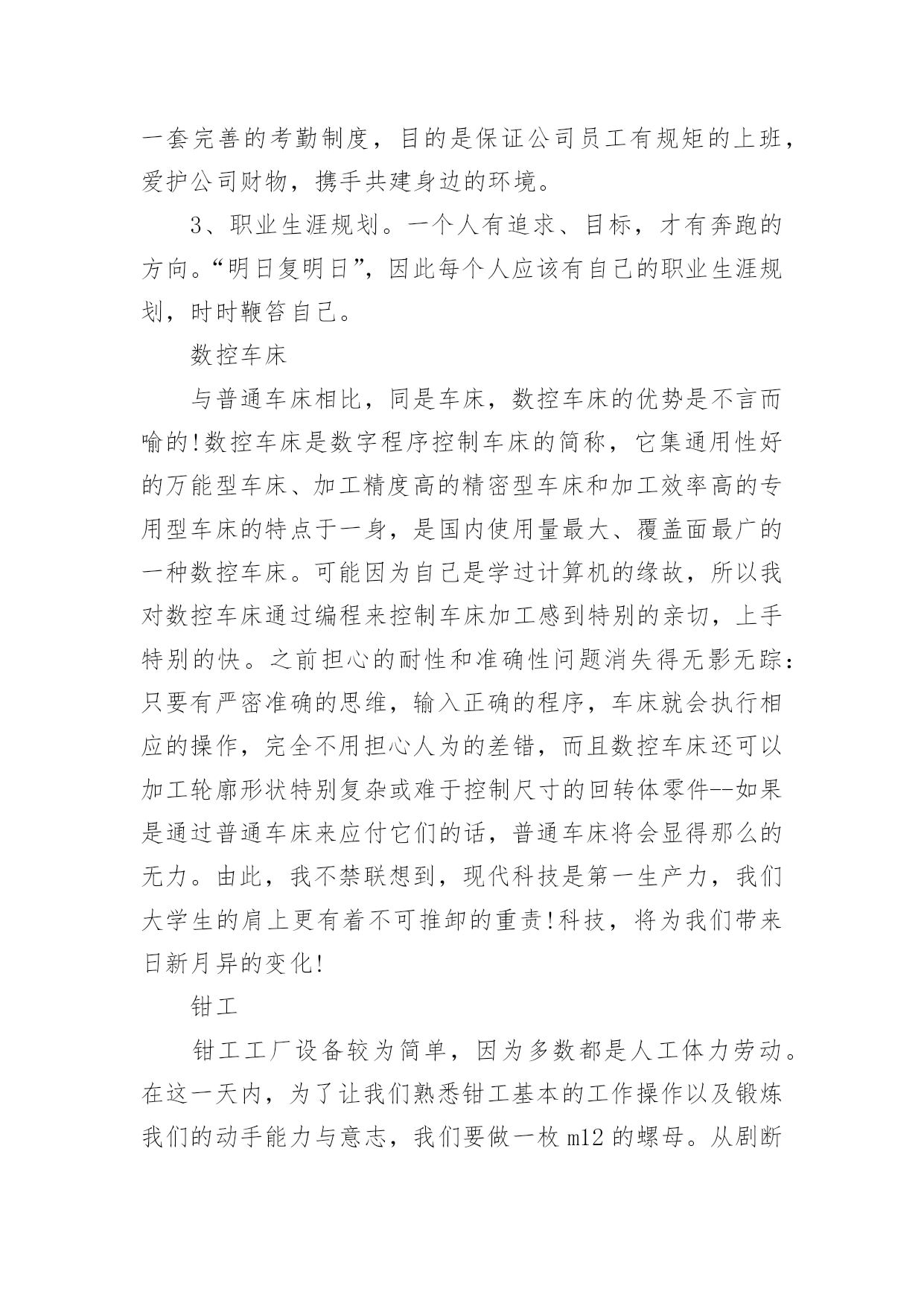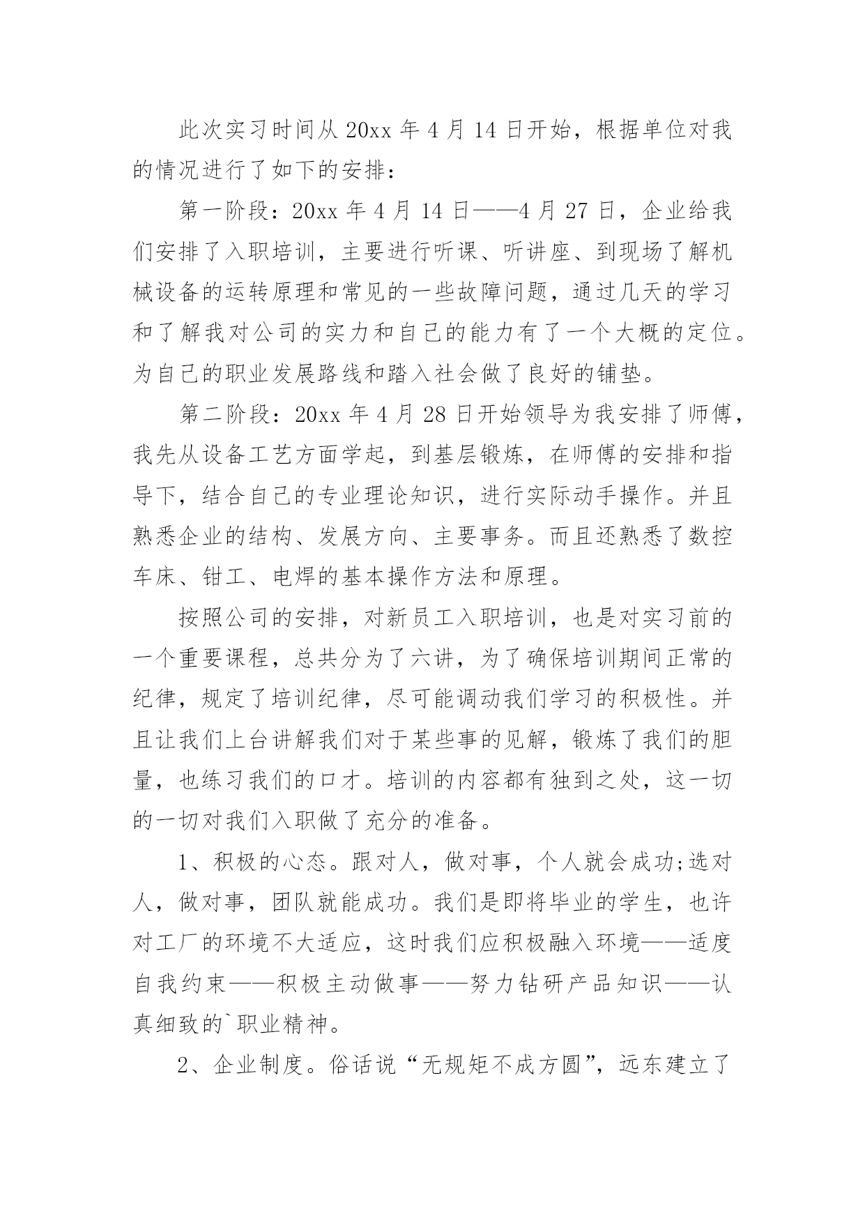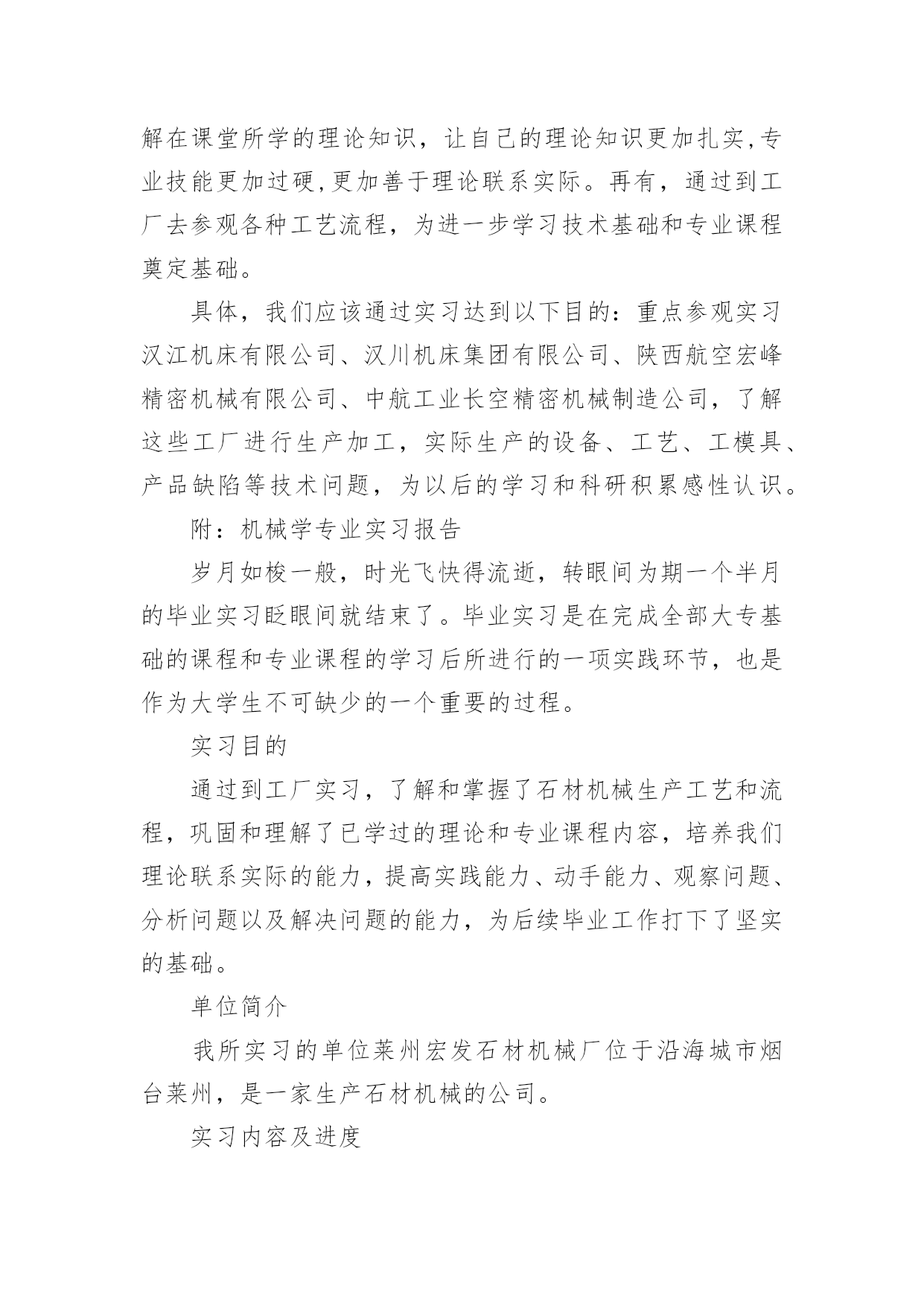 机械专业实习报告机械专业实习报告14篇在日常生活和工作中,报告十分的重要,报告中涉及到专业性术语要解释清楚。那么一般报告是怎么写的呢?下面是小编为大家整理的机械专业实习报告,仅供参考,大家一起来看看吧。机械专业实习报告篇1认识实习是教学计划主要部分,它是培养学生的实践等解决实际问题的第二课堂,它是专业知识培养的摇篮,也是对工业生产流水线的直接认识与认知。实习中应该深入实际,认真观察,获取直接经验知识,巩固所学基本理论,保质保量的完成指导老师所布置任务。学习工人师傅和工程技术人员的勤劳刻苦的优秀品质和敬业奉献的良好作风,培养我们的实践能力和创新能力,开拓我们的视野,培养生产实际中研究、观察、分析、解决问题的能力。认识实习是我们工科学生的一门必修课,通过认知实习,我们要对材料科学与工程专业建立感性认识,并进一步了解本专业的学习实践环节。通过接触实际生产过程,一方面,达到对所学专业的性质、内容及其在工程技术领域中的地位有一定的认识,为了解和巩固专业思想创造条件,在实践中了解专业、熟悉专业、热爱专业。另一方面,巩固和加深理解在课堂所学的理论知识,让自己的理论知识更加扎实,专业技能更加过硬,更加善于理论联系实际。再有,通过到工厂去参观各种工艺流程,为进一步学习技术基础和专业课程奠定基础。具体,我们应该通过实习达到以下目的:重点参观实习汉江机床有限公司、汉川机床集团有限公司、陕西航空宏峰精密机械有限公司、中航工业长空精密机械制造公司,了解这些工厂进行生产加工,实际生产的设备、工艺、工模具、产品缺陷等技术问题,为以后的学习和科研积累感性认识。附:机械学专业实习报告岁月如梭一般,时光飞快得流逝,转眼间为期一个半月的毕业实习眨眼间就结束了。毕业实习是在完成全部大专基础的课程和专业课程的学习后所进行的一项实践环节,也是作为大学生不可缺少的一个重要的过程。实习目的通过到工厂实习,了解和掌握了石材机械生产工艺和流程,巩固和理解了已学过的理论和专业课程内容,培养我们理论联系实际的能力,提高实践能力、动手能力、观察问题、分析问题以及解决问题的能力,为后续毕业工作打下了坚实的基础。单位简介我所实习的单位莱州宏发石材机械厂位于沿海城市烟台莱州,是一家生产石材机械的公司。实习内容及进度此次实习时间从20xx年4月14日开始,根据单位对我的情况进行了如下的安排:第一阶段:20xx年4月14日——4月27日,企业给我们安排了入职培训,主要进行听课、听讲座、到现场了解机械设备的运转原理和常见的一些故障问题,通过几天的学习和了解我对公司的实力和自己的能力有了一个大概的定位。为自己的职业发展路线和踏入社会做了良好的铺垫。第二阶段:20xx年4月28日开始领导为我安排了师傅,我先从设备工艺方面学起,到基层锻炼,在师傅的安排和指导下,结合自己的专业理论知识,进行实际动手操作。并且熟悉企业的结构、发展方向、主要事务。而且还熟悉了数控车床、钳工、电焊的基本操作方法和原理。按照公司的安排,对新员工入职培训,也是对实习前的一个重要课程,总共分为了六讲,为了确保培训期间正常的纪律,规定了培训纪律,尽可能调动我们学习的积极性。并且让我们上台讲解我们对于某些事的见解,锻炼了我们的胆量,也练习我们的口才。培训的内容都有独到之处,这一切的一切对我们入职做了充分的准备。1、积极的心态。跟对人,做对事,个人就会成功;选对人,做对事,团队就能成功。我们是即将毕业的学生,也许对工厂的环境不大适应,这时我们应积极融入环境——适度自我约束——积极主动做事——努力钻研产品知识——认真细致的`职业精神。2、企业制度。俗话说“无规矩不成方圆”,远东建立了一套完善的考勤制度,目的是保证公司员工有规矩的上班,爱护公司财物,携手共建身边的环境。3、职业生涯规划。一个人有追求、目标,才有奔跑的方向。“明日复明日”,因此每个人应该有自己的职业生涯规划,时时鞭笞自己。数控车床与普通车床相比,同是车床,数控车床的优势是不言而喻的!数控车床是数字程序控制车床的简称,它集通用性好的万能型车床、加工精度高的精密型车床和加工效率高的专用型车床的特点于一身,是国内使用量最大、覆盖面最广的一种数控车床。可能因为自己是学过计算机的缘故,所以我对数控车床通过编程来控制车床加工感到特别的亲切,上手特别的快。之前担心的耐性和准确性问题消失得无影无踪:只要有严密准确的思维,输入正确的程序,车床就会执行相应的操作,完全不用担心人为的差错,而且数控车床还可以加工轮廓形状特别复杂或难于控制尺寸的回转体零件--如果是通过普通车床来应付它们的话,普通车床将会显得那么的无力。由此,我不禁联想到,现代科技是第一生产力,我们大学生的肩上更有着不可推卸的重责!科技,将为我们带来日新月异的变化!钳工钳工工厂设备较为简单,因为多数都是人工体力劳动。在这一天内,为