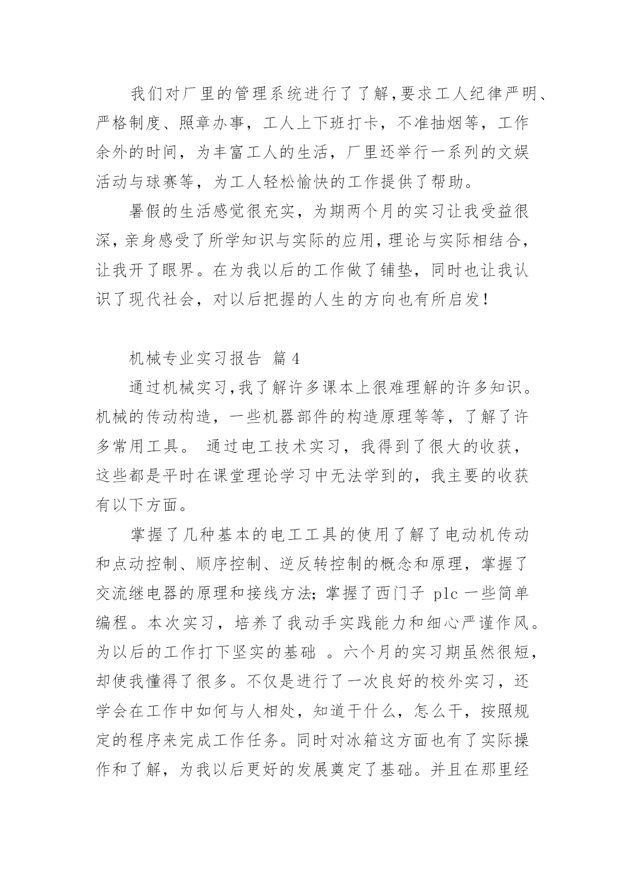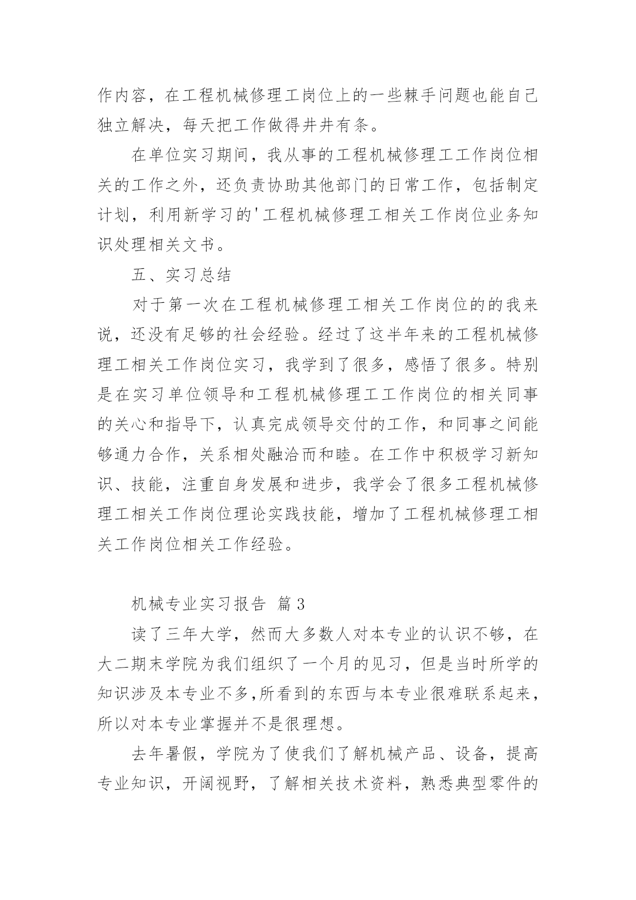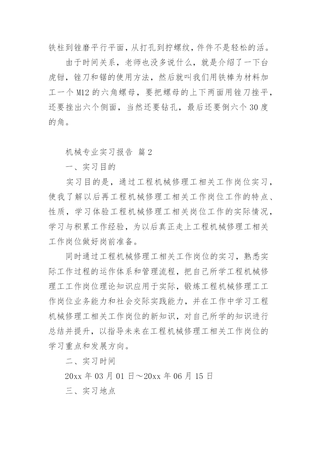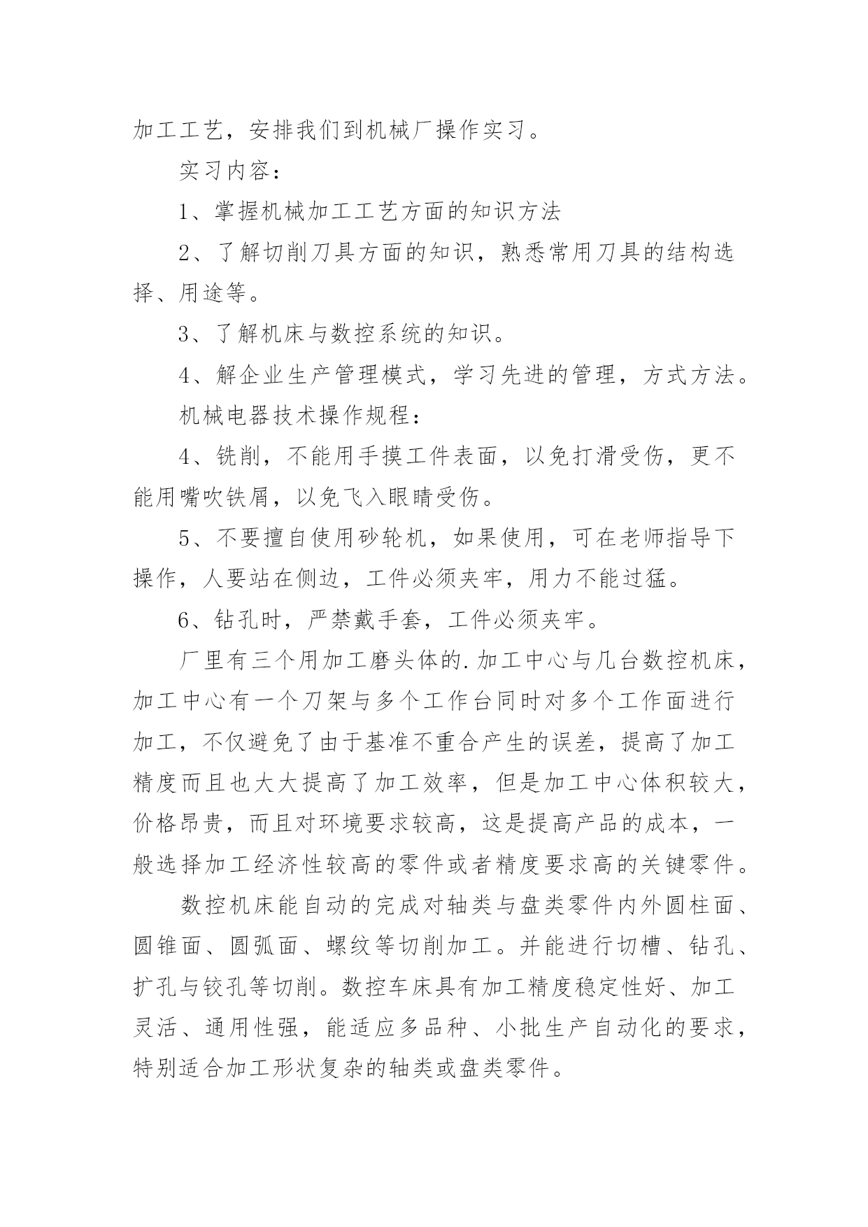 机械专业实习报告机械专业实习报告14篇在日常生活和工作中,报告十分的重要,报告中涉及到专业性术语要解释清楚。那么一般报告是怎么写的呢?下面是小编为大家整理的机械专业实习报告,仅供参考,大家一起来看看吧。机械专业实习报告篇1认识实习是教学计划主要部分,它是培养学生的实践等解决实际问题的第二课堂,它是专业知识培养的摇篮,也是对工业生产流水线的直接认识与认知。实习中应该深入实际,认真观察,获取直接经验知识,巩固所学基本理论,保质保量的完成指导老师所布置任务。学习工人师傅和工程技术人员的勤劳刻苦的优秀品质和敬业奉献的良好作风,培养我们的实践能力和创新能力,开拓我们的视野,培养生产实际中研究、观察、分析、解决问题的能力。认识实习是我们工科学生的一门必修课,通过认知实习,我们要对材料科学与工程专业建立感性认识,并进一步了解本专业的学习实践环节。通过接触实际生产过程,一方面,达到对所学专业的性质、内容及其在工程技术领域中的地位有一定的认识,为了解和巩固专业思想创造条件,在实践中了解专业、熟悉专业、热爱专业。另一方面,巩固和加深理解在课堂所学的理论知识,让自己的理论知识更加扎实,专业技能更加过硬,更加善于理论联系实际。再有,通过到工厂去参观各种工艺流程,为进一步学习技术基础和专业课程奠定基础。具体,我们应该通过实习达到以下目的:重点参观实习汉江机床有限公司、汉川机床集团有限公司、陕西航空宏峰精密机械有限公司、中航工业长空精密机械制造公司,了解这些工厂进行生产加工,实际生产的设备、工艺、工模具、产品缺陷等技术问题,为以后的学习和科研积累感性认识。附:机械学专业实习报告岁月如梭一般,时光飞快得流逝,转眼间为期一个半月的毕业实习眨眼间就结束了。毕业实习是在完成全部大专基础的课程和专业课程的学习后所进行的一项实践环节,也是作为大学生不可缺少的一个重要的过程。实习目的通过到工厂实习,了解和掌握了石材机械生产工艺和流程,巩固和理解了已学过的理论和专业课程内容,培养我们理论联系实际的能力,提高实践能力、动手能力、观察问题、分析问题以及解决问题的能力,为后续毕业工作打下了坚实的基础。单位简介我所实习的单位莱州宏发石材机械厂位于沿海城市烟台莱州,是一家生产石材机械的公司。实习内容及进度此次实习时间从20xx年4月14日开始,根据单位对我的情况进行了如下的安排:第一阶段:20xx年4月14日——4月27日,企业给我们安排了入职培训,主要进行听课、听讲座、到现场了解机械设备的运转原理和常见的一些故障问题,通过几天的学习和了解我对公司的实力和自己的能力有了一个大概的定位。为自己的职业发展路线和踏入社会做了良好的铺垫。第二阶段:20xx年4月28日开始领导为我安排了师傅,我先从设备工艺方面学起,到基层锻炼,在师傅的安排和指导下,结合自己的专业理论知识,进行实际动手操作。并且熟悉企业的结构、发展方向、主要事务。而且还熟悉了数控车床、钳工、电焊的基本操作方法和原理。按照公司的安排,对新员工入职培训,也是对实习前的一个重要课程,总共分为了六讲,为了确保培训期间正常的纪律,规定了培训纪律,尽可能调动我们学习的积极性。并且让我们上台讲解我们对于某些事的见解,锻炼了我们的胆量,也练习我们的口才。培训的内容都有独到之处,这一切的一切对我们入职做了充分的准备。1、积极的心态。跟对人,做对事,个人就会成功;选对人,做对事,团队就能成功。我们是即将毕业的学生,也许对工厂的环境不大适应,这时我们应积极融入环境——适度自我约束——积极主动做事——努力钻研产品知识——认真细致的`职业精神。2、企业制度。俗话说“无规矩不成方圆”,远东建立了一套完善的考勤制度,目的是保证公司员工有规矩的上班,爱护公司财物,携手共建身边的环境。3、职业生涯规划。一个人有追求、目标,才有奔跑的方向。“明日复明日”,因此每个人应该有自己的职业生涯规划,时时鞭笞自己。数控车床与普通车床相比,同是车床,数控车床的优势是不言而喻的!数控车床是数字程序控制车床的简称,它集通用性好的万能型车床、加工精度高的精密型车床和加工效率高的专用型车床的特点于一身,是国内使用量最大、覆盖面最广的一种数控车床。可能因为自己是学过计算机的缘故,所以我对数控车床通过编程来控制车床加工感到特别的亲切,上手特别的快。之前担心的耐性和准确性问题消失得无影无踪:只要有严密准确的思维,输入正确的程序,车床就会执行相应的操作,完全不用担心人为的差错,而且数控车床还可以加工轮廓形状特别复杂或难于控制尺寸的回转体零件--如果是通过普通车床来应付它们的话,普通车床将会显得那么的无力。由此,我不禁联想到,现代科技是第一生产力,我们大学生的肩上更有着不可推卸的重责!科技,将为我们带来日新月异的变化!钳工钳工工厂设备较为简单,因为多数都是人工体力劳动。在这一天内,为