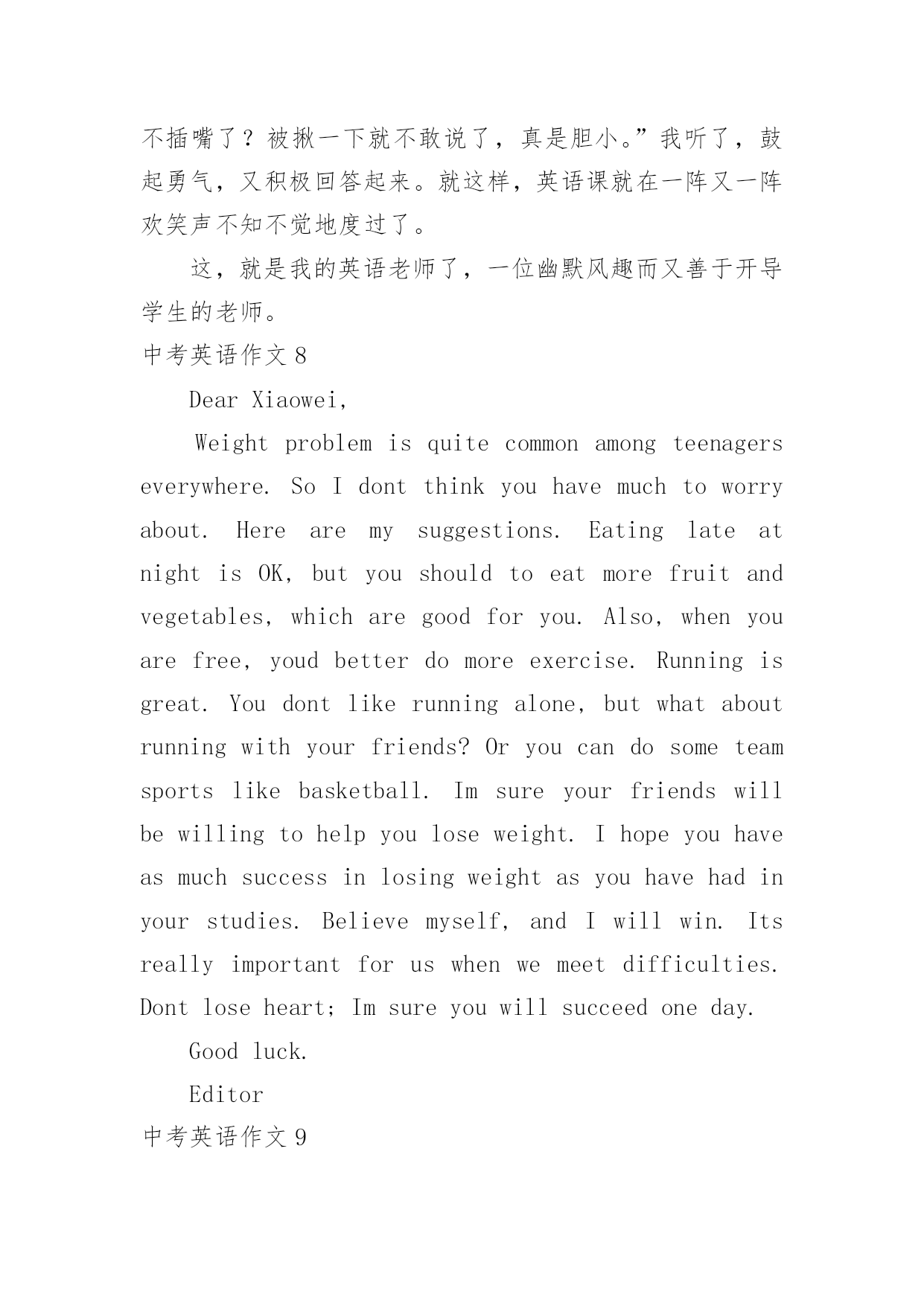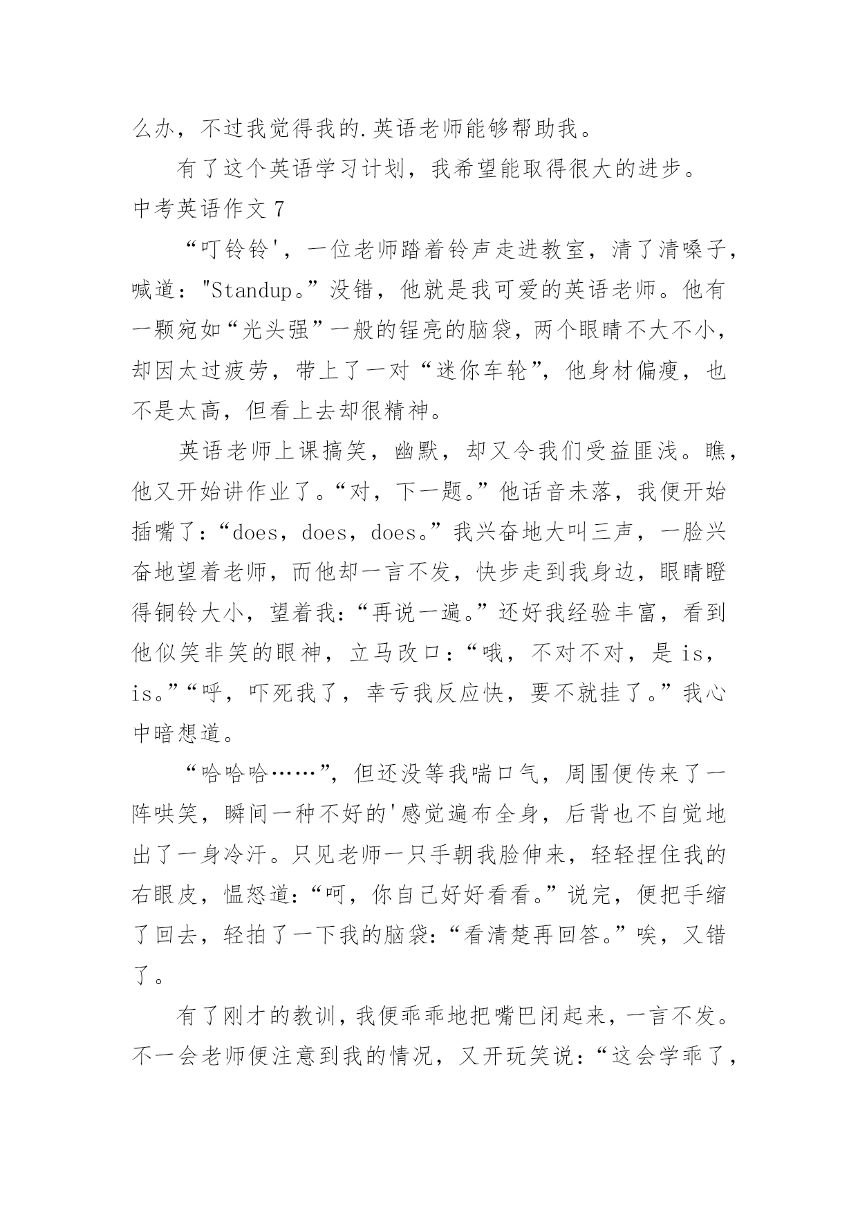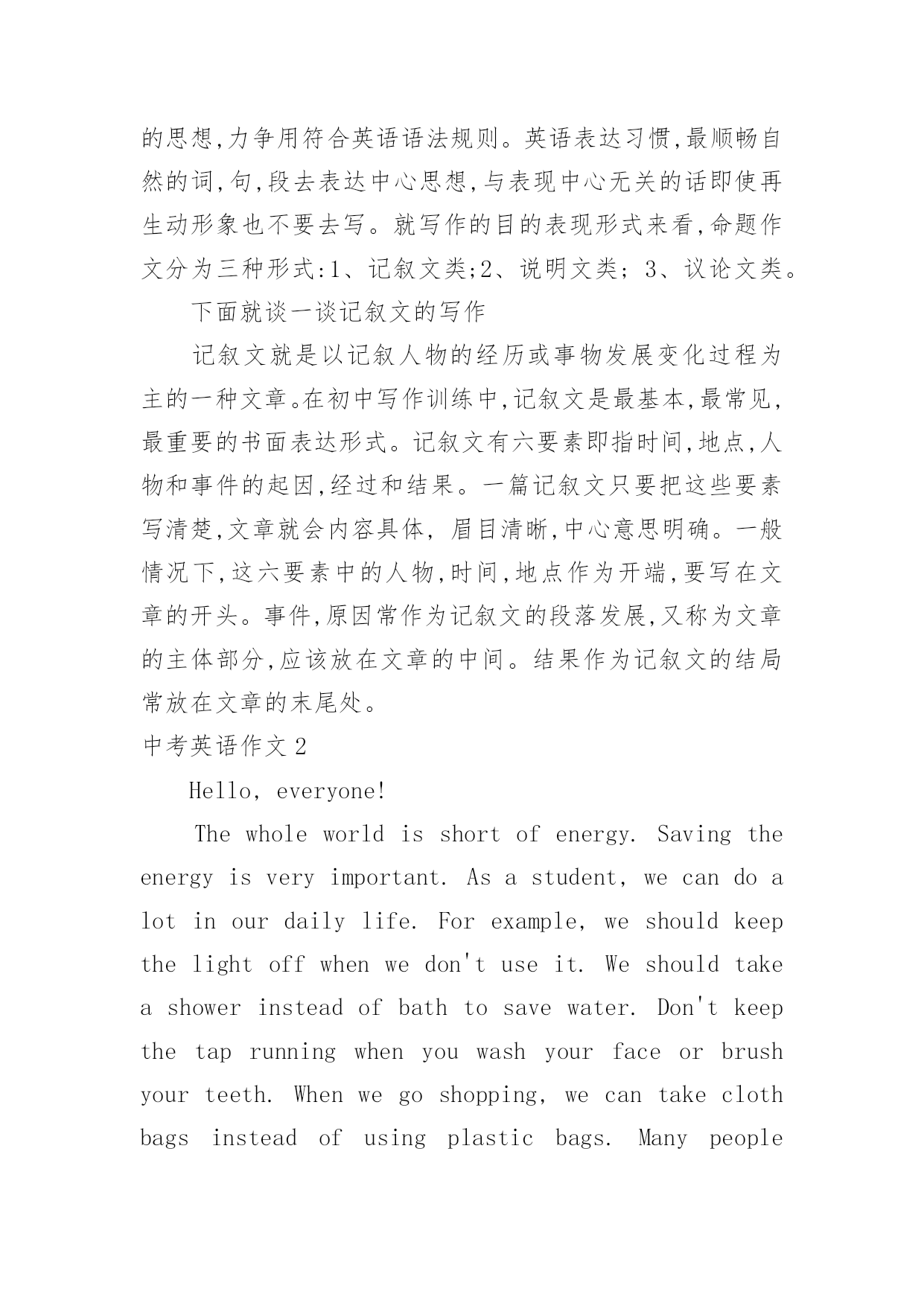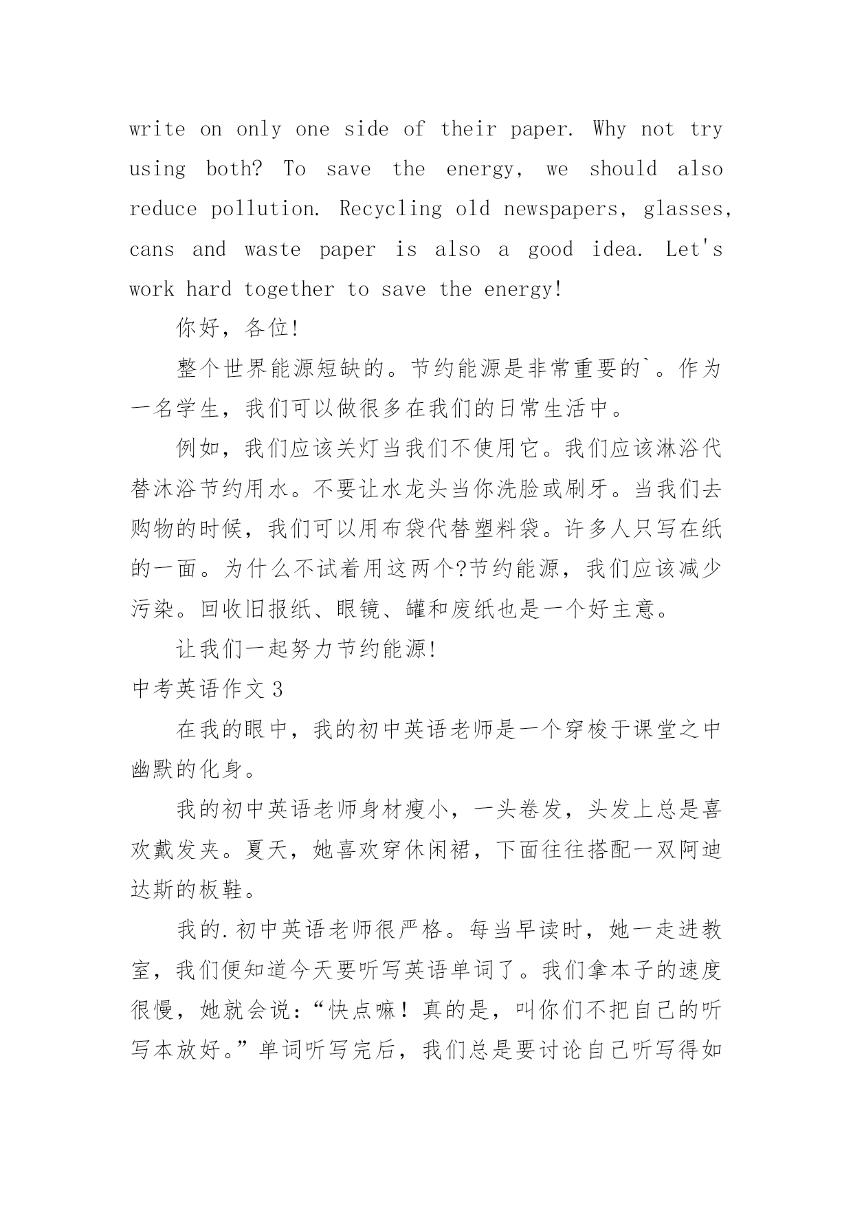 中考英语作文中考英语作文在学习、工作、生活中,大家都尝试过写作文吧,借助作文人们可以实现文化交流的目的。你写作文时总是无从下笔?下面是小编为大家收集的中考英语作文,仅供参考,希望能够帮助到大家。中考英语作文1命题作文就是我们依据所给题目,确定中心,选择材料,写出符合题意,内容表达具体、充分的文章。写命题作文通常要注意以下几点:一、审准题目:文章的中心要对题目的分析来确定,一定要弄清主题的内涵,确立与文章联系的主题思想,表达不能游离于主题,否则即使内容再精彩,也是跑题作文,得分将会大打折扣,因此,写命题作文最重要的是先审清题目,确立要表现的中心。二、构思结构:就是开放思路,启动联想,构想表现形式,勾勒出文章的结构层次,依次写出引言段,主题句,发展段和结尾句,努力使之新颖,别致。三、选择材料:这一点很重要,一定要围绕想表现的`中心去选择组织材料,所选的材料必须典型精要。四、表达:就是用最确切明了的语言贯穿材料,表达自己的思想,力争用符合英语语法规则。英语表达习惯,最顺畅自然的词,句,段去表达中心思想,与表现中心无关的话即使再生动形象也不要去写。就写作的目的表现形式来看,命题作文分为三种形式:1、记叙文类;2、说明文类;3、议论文类。下面就谈一谈记叙文的写作记叙文就是以记叙人物的经历或事物发展变化过程为主的一种文章。在初中写作训练中,记叙文是最基本,最常见,最重要的书面表达形式。记叙文有六要素即指时间,地点,人物和事件的起因,经过和结果。一篇记叙文只要把这些要素写清楚,文章就会内容具体,眉目清晰,中心意思明确。一般情况下,这六要素中的人物,时间,地点作为开端,要写在文章的开头。事件,原因常作为记叙文的段落发展,又称为文章的主体部分,应该放在文章的中间。结果作为记叙文的结局常放在文章的末尾处。中考英语作文2Hello,everyone!Thewholeworldisshortofenergy.Savingtheenergyisveryimportant.Asastudent,wecandoalotinourdailylife.Forexample,weshouldkeepthelightoffwhenwedon'tuseit.Weshouldtakeashowerinsteadofbathtosavewater.Don'tkeepthetaprunningwhenyouwashyourfaceorbrushyourteeth.Whenwegoshopping,wecantakeclothbagsinsteadofusingplasticbags.Manypeoplewriteononlyonesideoftheirpaper.Whynottryusingboth?Tosavetheenergy,weshouldalsoreducepollution.Recyclingoldnewspapers,glasses,cansandwastepaperisalsoagoodidea.Let'sworkhardtogethertosavetheenergy!你好,各位!整个世界能源短缺的。节约能源是非常重要的`。作为一名学生,我们可以做很多在我们的日常生活中。例如,我们应该关灯当我们不使用它。我们应该淋浴代替沐浴节约用水。不要让水龙头当你洗脸或刷牙。当我们去购物的时候,我们可以用布袋代替塑料袋。许多人只写在纸的一面。为什么不试着用这两个?节约能源,我们应该减少污染。回收旧报纸、眼镜、罐和废纸也是一个好主意。让我们一起努力节约能源!中考英语作文3在我的眼中,我的初中英语老师是一个穿梭于课堂之中幽默的化身。我的初中英语老师身材瘦小,一头卷发,头发上总是喜欢戴发夹。夏天,她喜欢穿休闲裙,下面往往搭配一双阿迪达斯的板鞋。我的.初中英语老师很严格。每当早读时,她一走进教室,我们便知道今天要听写英语单词了。我们拿本子的速度很慢,她就会说:“快点嘛!真的是,叫你们不把自己的听写本放好。”单词听写完后,我们总是要讨论自己听写得如何。这时她就会说:“你们能不能安静一点,再不安静的人,我就扣操行分了!”但是每次说完话后,总是会有同学还要说话,只不过把音量调小了很多。可是老师的耳朵尖,每次都能听见,便生气地说:“A和B,我用语言告诉你们不要说话,你们偏不听,你们是不是需要我付出行动?”A和B同学就使劲摇头,老师看见后会说“你们话多,上课时就多回答问题吧!”上课时,每当有同学太活泼,老师就会十分严厉地说:“X同学禁言十分钟!”我的初中英语老师很幽默。记得有一次,老师教我们读“沙滩”的英语单词,老师教的很认真,说:“记住,要读长音。”我当时并没有搞懂长音和短音的区别,老师请我起来朗读时,班上许多同学都在笑,我十分茫然。老师说:“你读错了。”还告诉我,如果读成了短音,